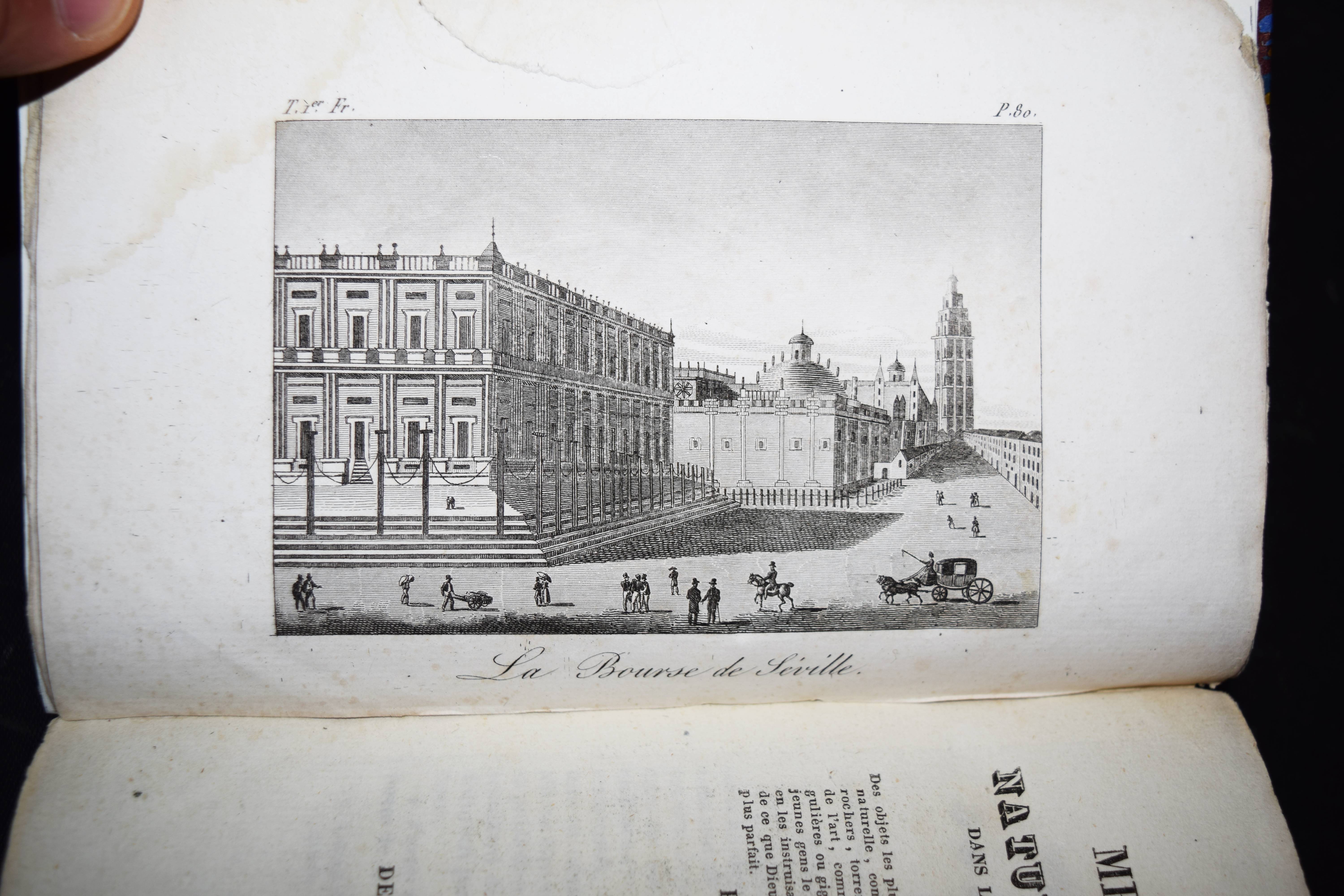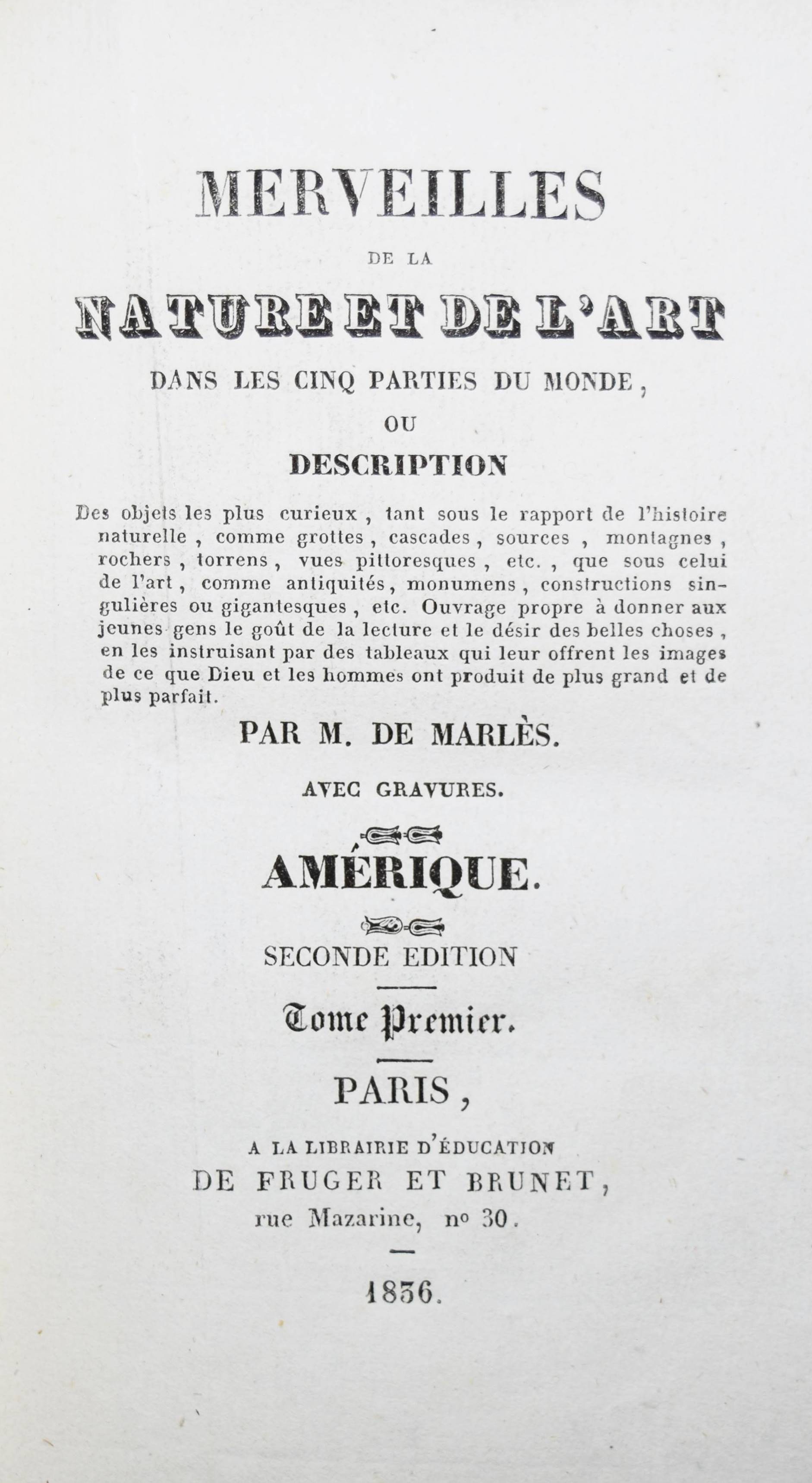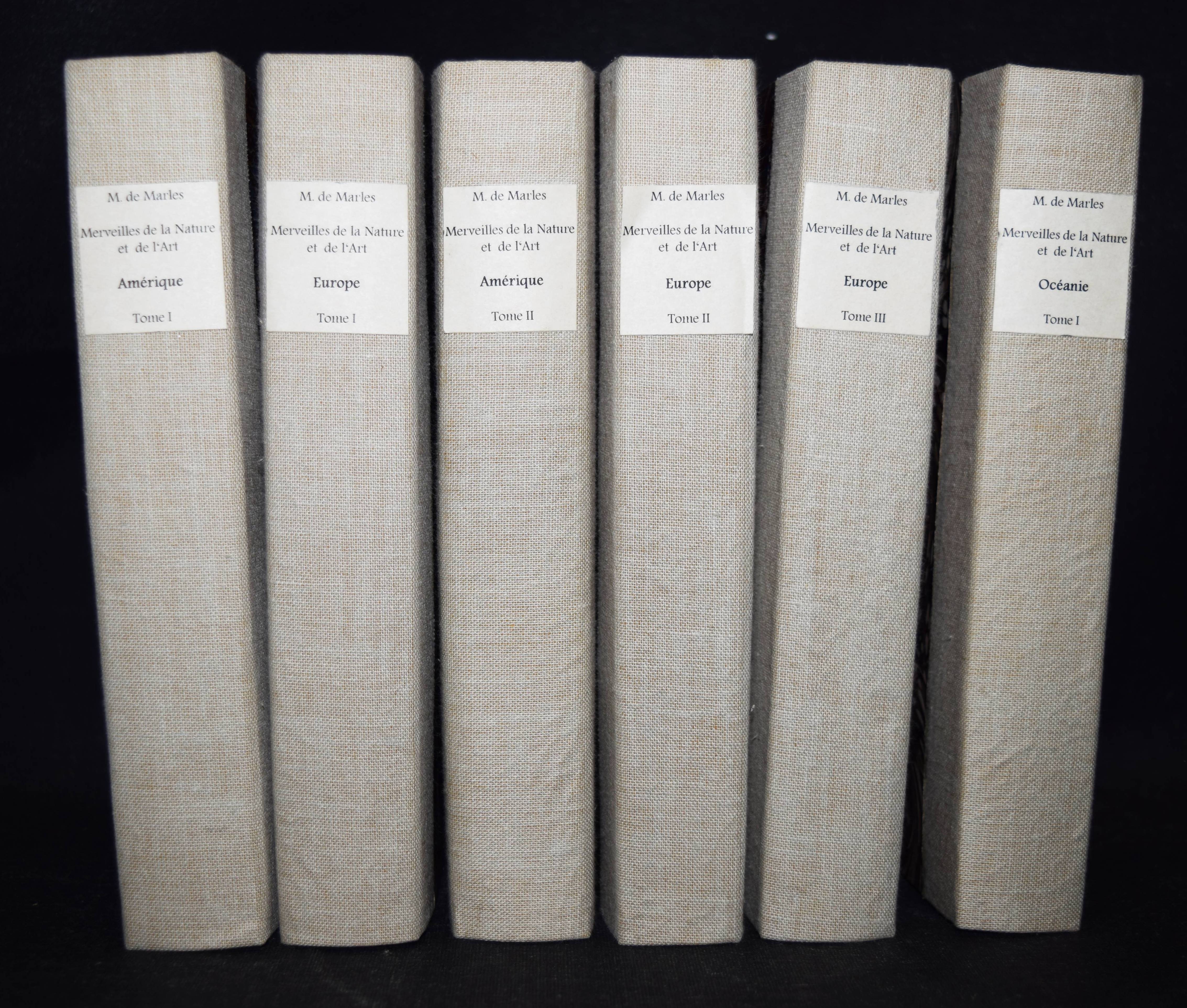 Marlès, (Jules Lacroix) de. Merveilles de la nature et de l’art dans les cinq parties du monde, ou, description des objets les plus curieux … Amérique. Tome premier (et) seconde; Europe. Tome premier, seconde et trois; Océanie (et Supplement à l’Asie). Seconde édition. Zus. 6 Bände. Paris, Fruger et Brunet 1836-1837. 8°. Mit zus. 24 Kupfer-Tafeln. Moderne Hln. mit Rückensch. Gumuchian 3961. – Seltene Sammlung mit Reise-Beschreibungen für die Jugend. – Es erschienen noch 2 Bände „Asie“. – Die Tafeln mit Ansichten und Sehenswürdigkeiten. – Gutes breitrandiges Exemplar.