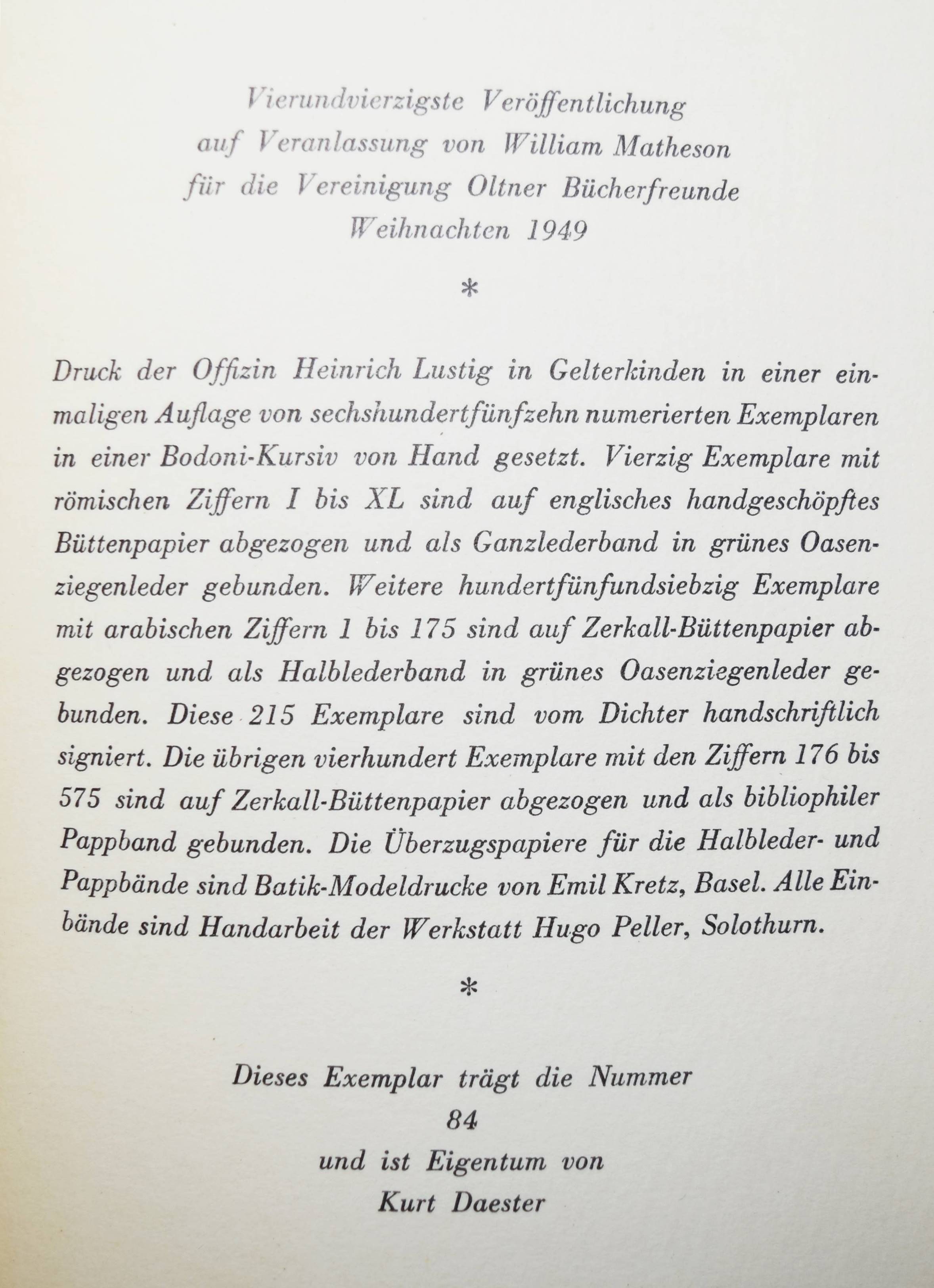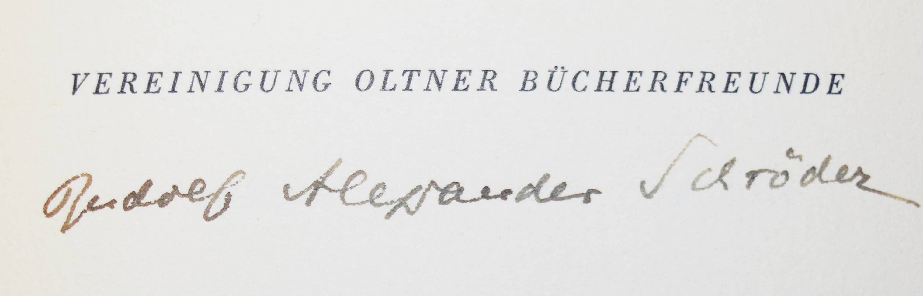Schröder, Rudolf Alexander. Neue Gedichte. Olten, Vereinigung Oltner Bücherfreunde 1949. 8°. 63, (1) S. Grüner Oasenziegen-Halbledereinband mit goldgepr. Rückentitel, floraler Rückenverg. u. Kopfgoldschnitt in Orig.-Pappschuber (von Hugo Peller, Solothurn). (Veröffentlichung der Vereinigung Oltner Bücherfreunde, Band 44). W.-G.² 134 . – Erste Ausgabe. – Eines von 175 Exemplaren der Vorzugsausgabe auf englischem Büttenpapier (GA 615 Ex.). – Von R. A. Schröder signiert. – Rücken etwas aufgehellt, schönes Exemplar.