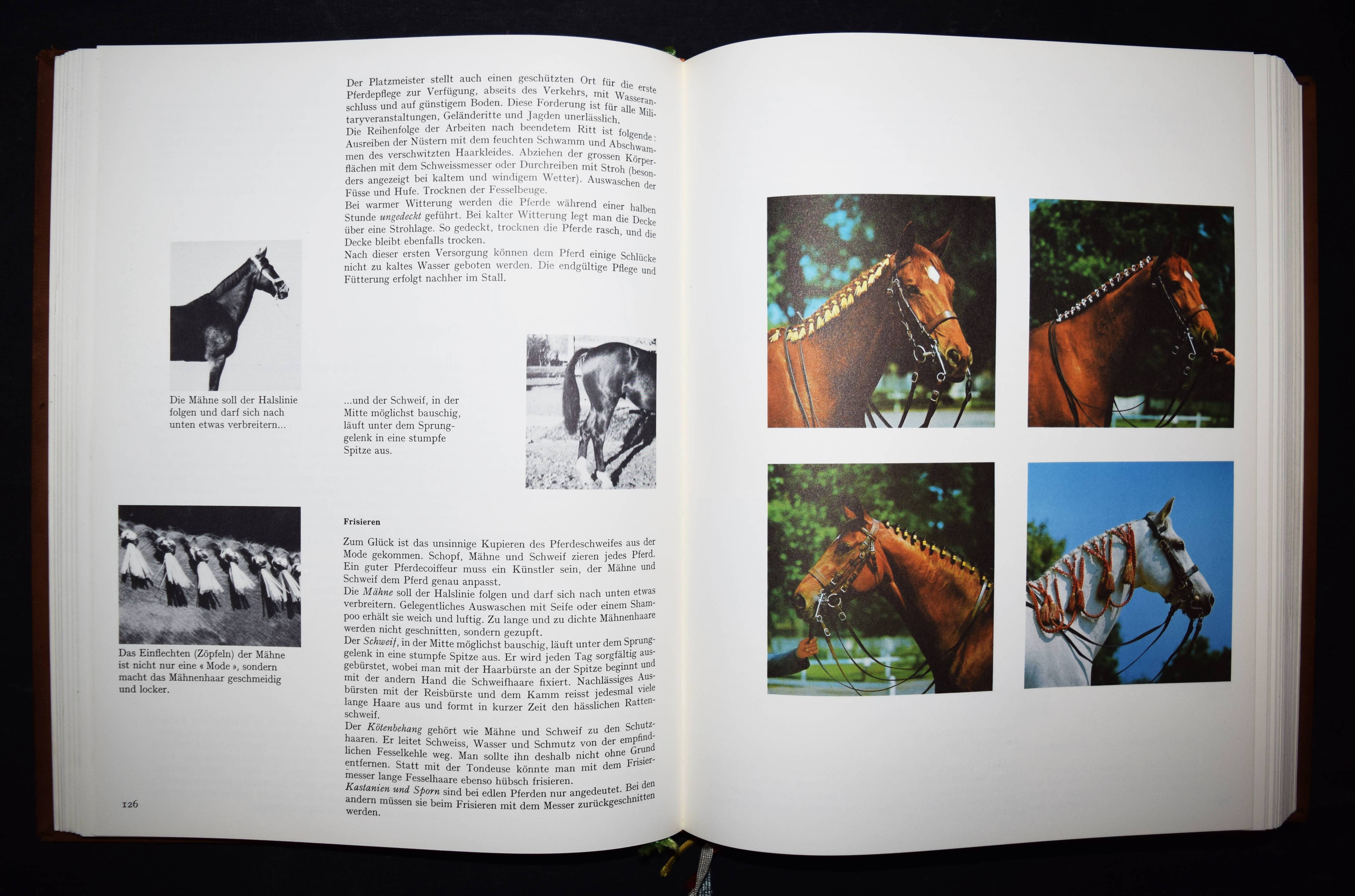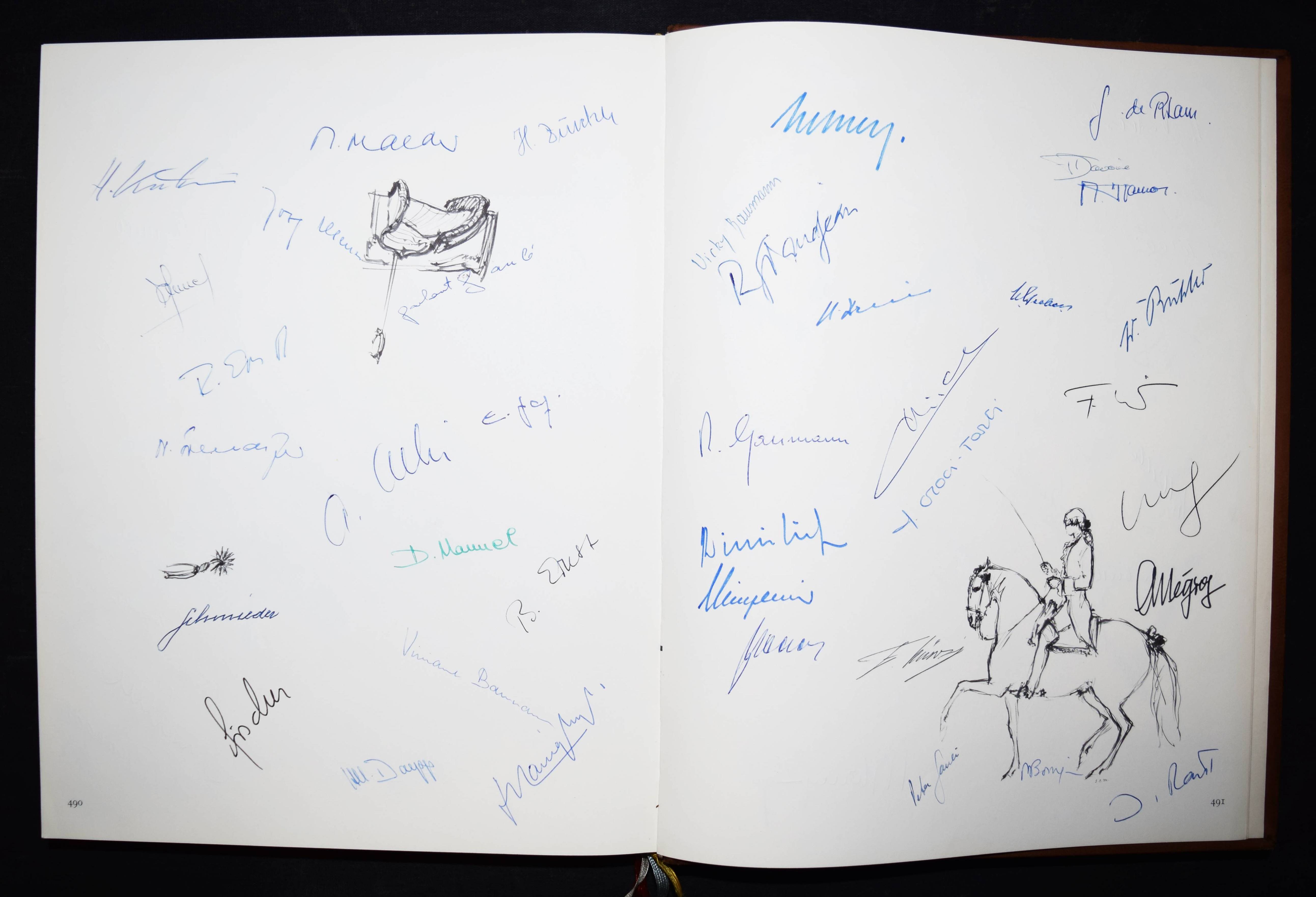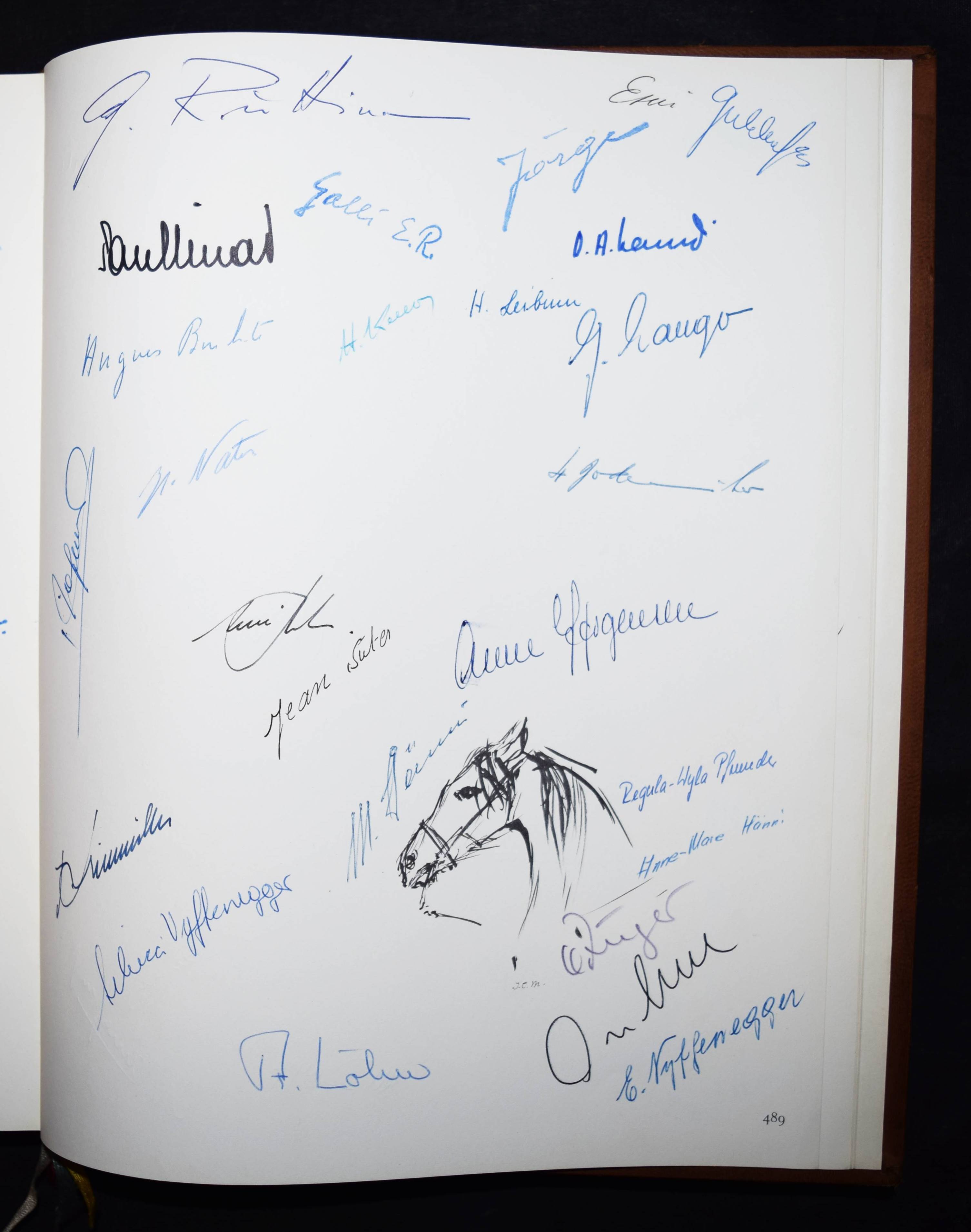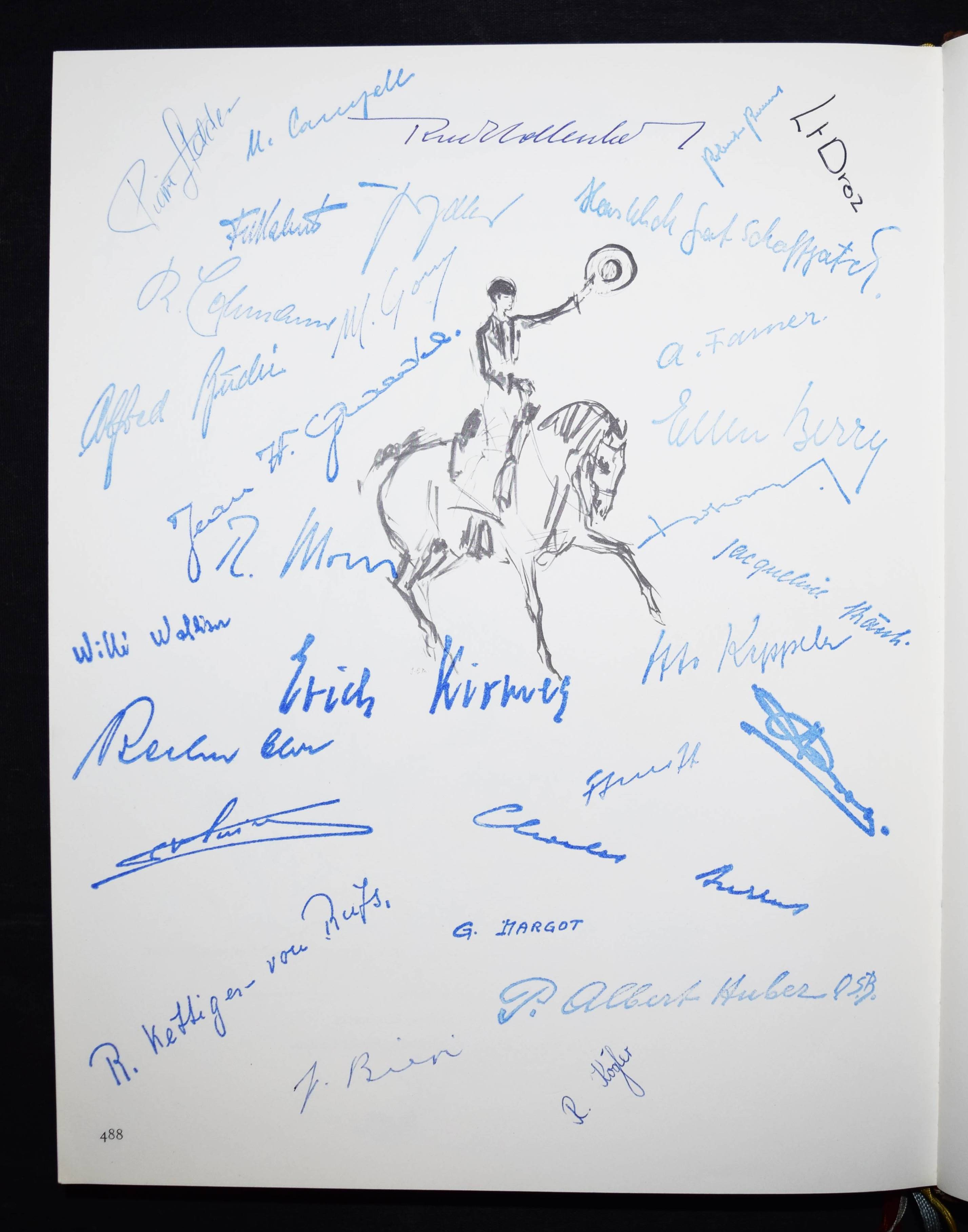 Weck, Roland de (Ed.). Messieurs à vos chevaux. (Deutsche Ausgabe). Bern, Selbstverlag (1969). Gr.-4°. 496 S. mit zahlr. Abb. OLdr. mit goldgepr. Rückentitel, Rückenverg. u. Deckelvignette (von E. Brun, Neuenburg). Eines von 363 Exemplaren der Luxusausgabe. – Mit eigenhändiger Widmung von R. de Weck und über 100 Orig.-Signaturen der Mtarbeiter des Buchs, Schweizer Kommunal-Politiker und Kirchenvertreter, Militärs, Reitsport-Vereinigungen, Veterinären und bedeutender internationaler Reitsportler (Kardinal Benno Gut, Oberst Pierre Mange, Oberst Louis Dégallier, Ernest Morf, Victor Morf, Fredy Knie (Zirkus-Direktor), Hans Handler (Kommandant der spanischen Hofreitschule, Wien), Oberst Georges Margot, Peter Hebeisen, Jean Suter, Gaf Hans-Ulrich Schaffgotsch u.v.a.). Außerdem mit zahlr. Stempel-Signaturen, darunter Prinz Philip, Herzog von Edinburg, Prinz Bernhard der Niederlande, Bundespräsident Ludwig v. Moos und Josef Neckermann. – Aufwendiger Druck auf elfenbeinfarb. Velours-Luxus-Papier der Züricher Papierfabrik an der Sihl. – Buchgestaltung von Kurt Altermatt (mit dessen Signatur auf S. 15). – Rücken und Vorderdeckel an der unteren Kante etwas berieben, gutes Exemplar aus der Bibliothek des Schweizer Dressurreiters und Offiziers Karl Ilg (Zollikon, Gewinner der Coupe Baumgartner 1951).