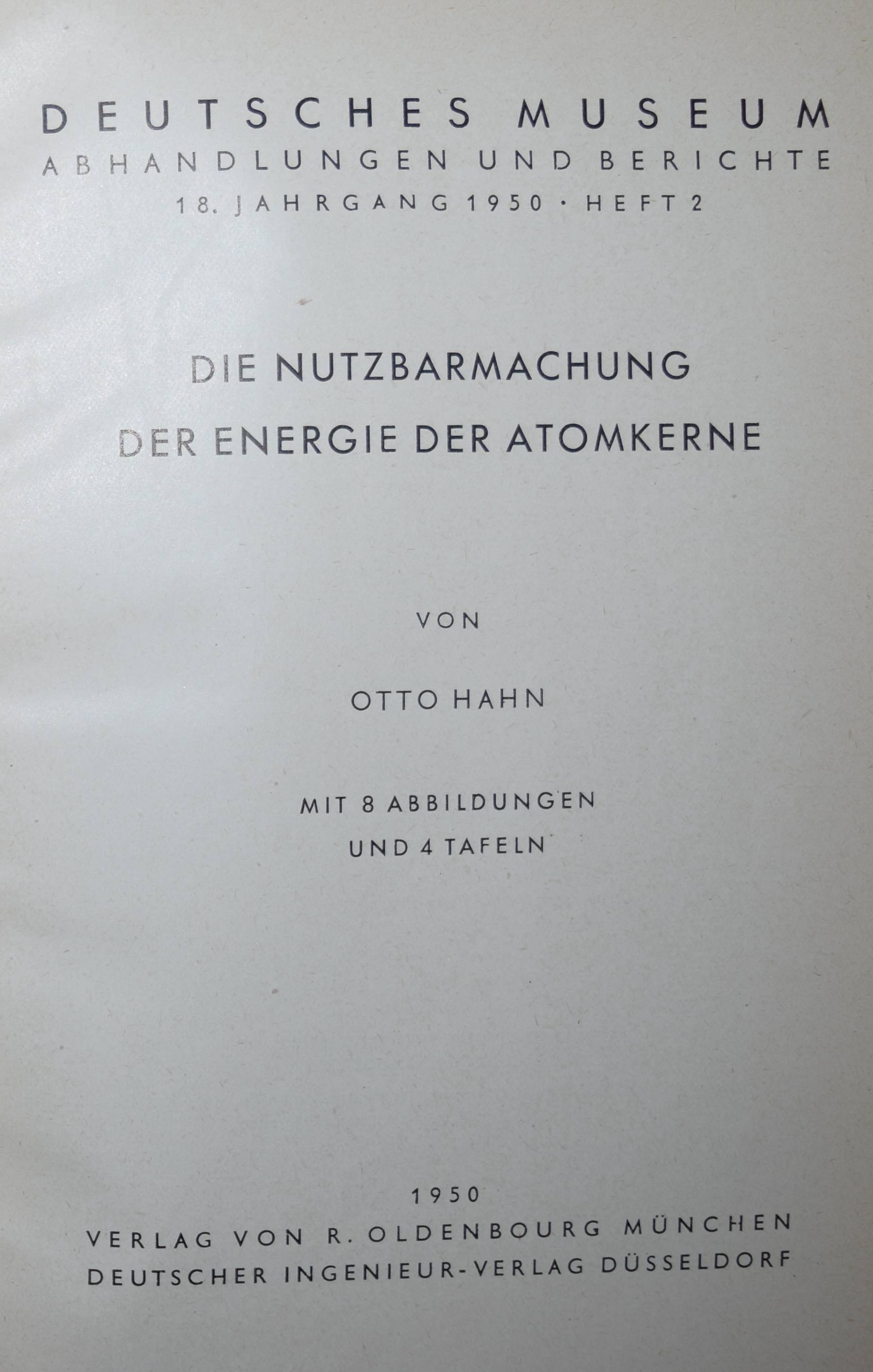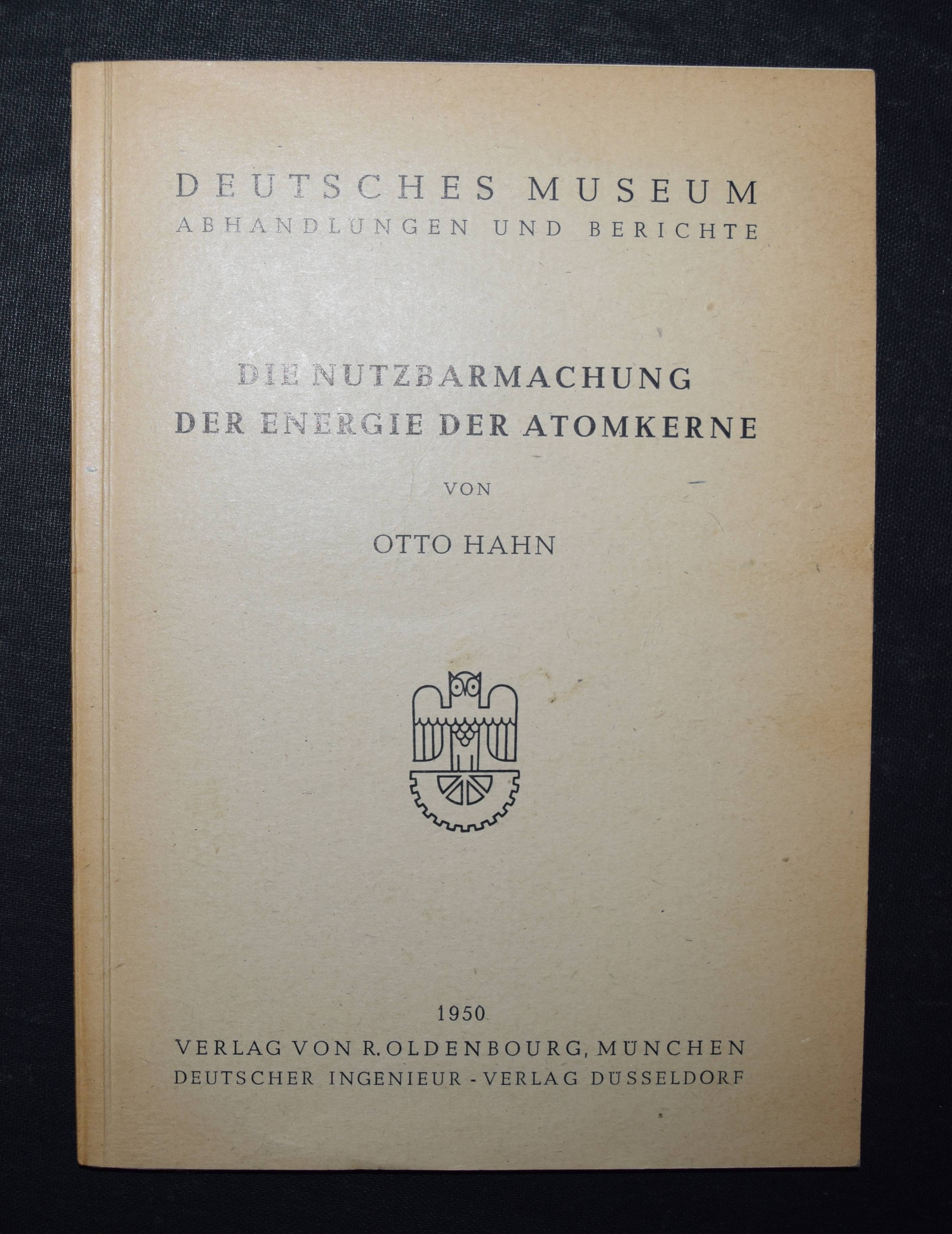 Hahn, Otto. Die Nutzbarmachung der Energie der Atomkerne. München, Oldenbourg 1950. 8°. 37 S. mit 4 Tafeln u. 8 Abb. OKart. (Abhandlungen und Berichte / Deutsches Museum, 18. Jahrgang, Heft 2). Erste Ausgabe. – Beiliegt: eigenhändige Unterschrift von O. Hahn, dat. 1958, auf Portät (Zeitungsausschnitt). – Der Autograph gefaltet und verso mit Filmoplast verstärkt.