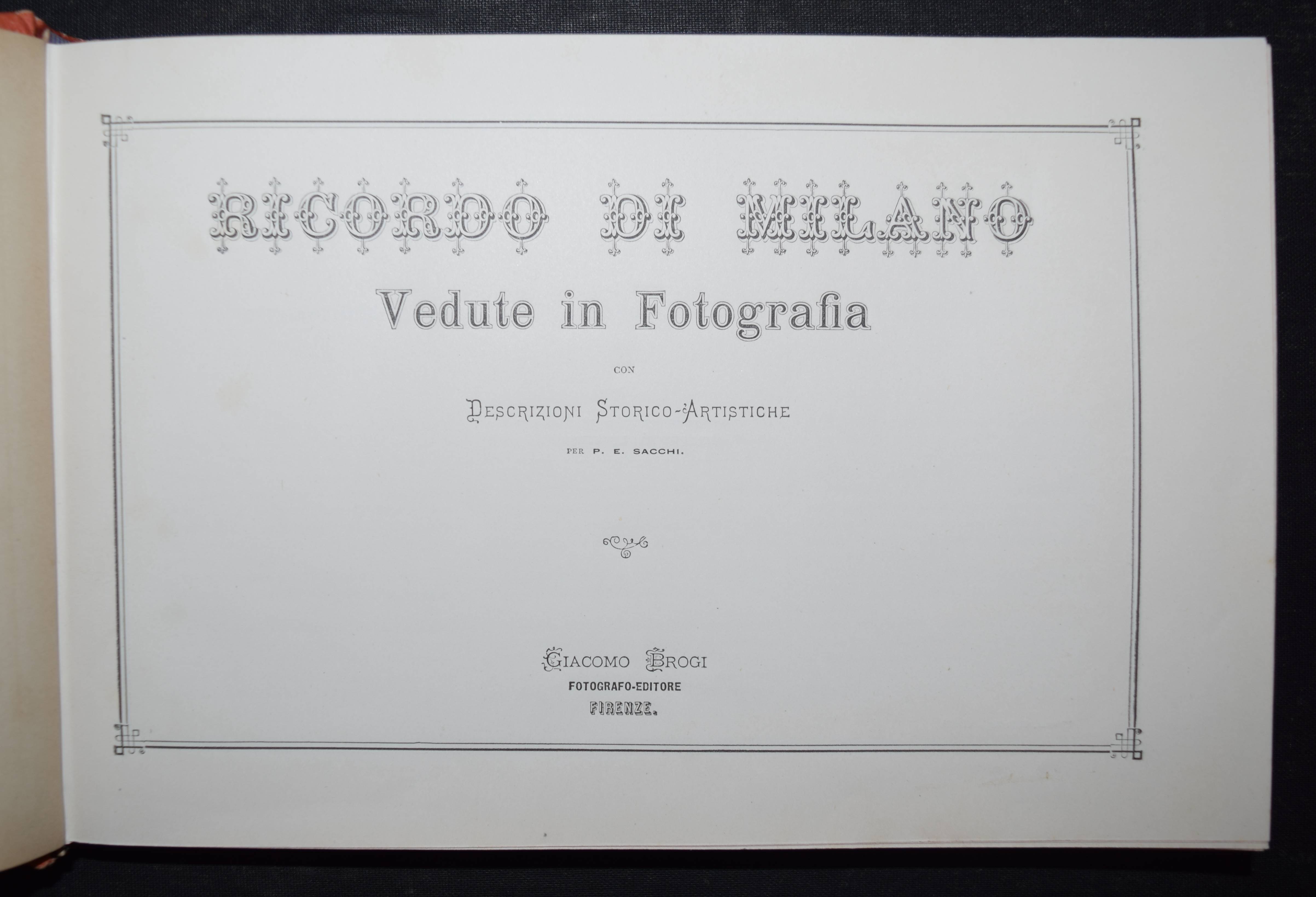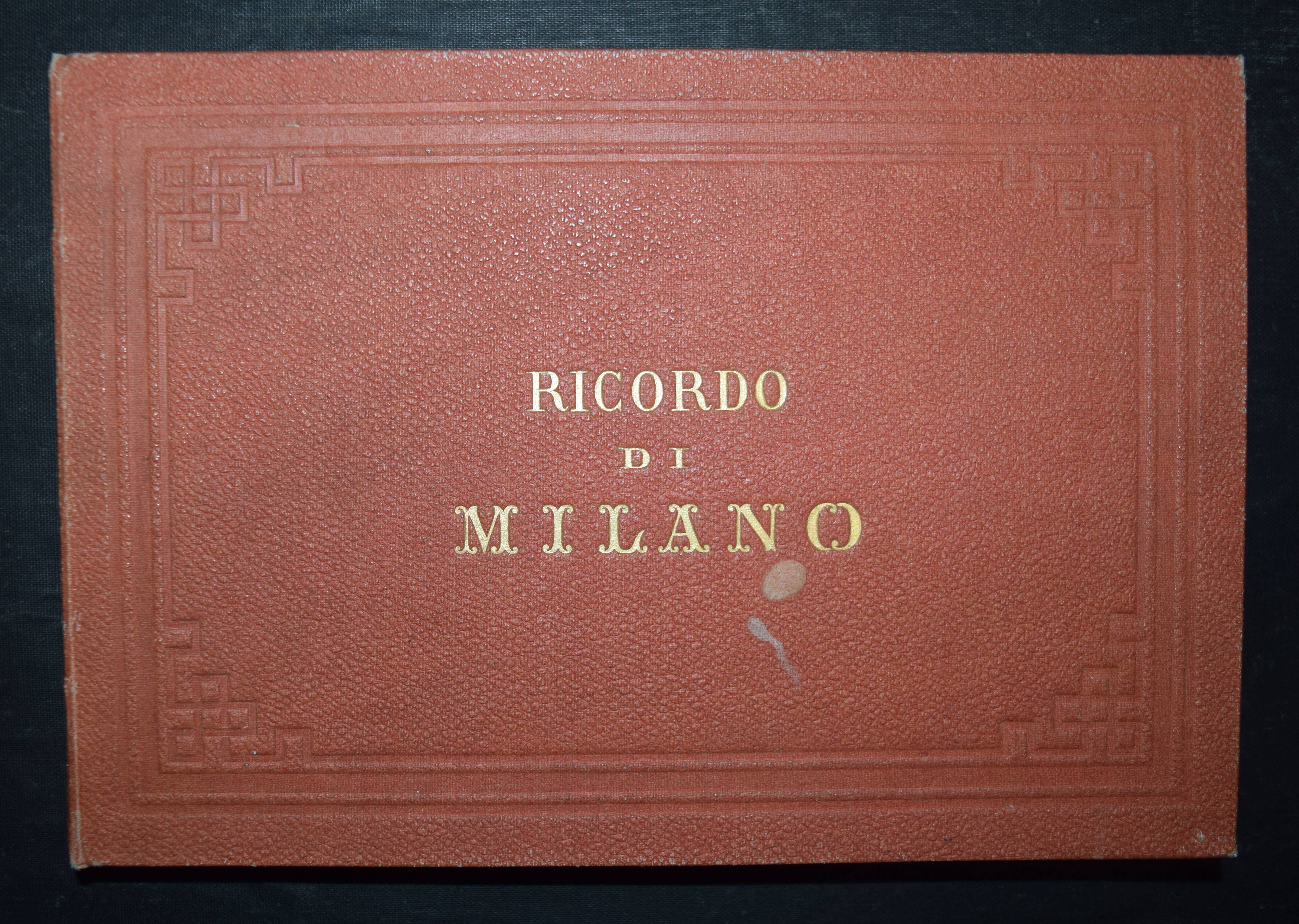 Mailand – Sacchi, P. E. Ricordo di Milano. Vedute in fotografia con descrizioni storico- artistiche. Florenz, Giacomo Brogi 1873. Quer-8°. VIII S., 1 lithogr. Stadtplan u. 26 Orig.-Photographien (Albuminabzüge) auf Karton aufgezogen. OLn. mit goldgepr. Deckeltitel. Texte in Italienisch, Französisch und Englisch. – Der bedeutende ital. Fotograf G. Brogi (1822-1881) gründete 1864 sein Photo-Atelier in Florenz. Später hatte er auch Niederlassungen in Rom und Neapel. Er bereiste ganz Italien und 1868 auch den Nahen Osten (Palästina, Ägypten und Syrien). Brogi war Mitglied der Photographischen Gesellschaft Italiens und publizierte Ansichten zahlr. bedeutenden ital. Städte und Regionen. Außerdem porträtierte er bedeutende Persönlichkeiten, wie G. Verdi, E. Zola und W. v. Siemens. Sein Sohn Carlo führte das Atelier nach seinem Tod fort. – Trägerkartons teils etwas fleckig, sonst sehr gutes sauberes Exemplar.