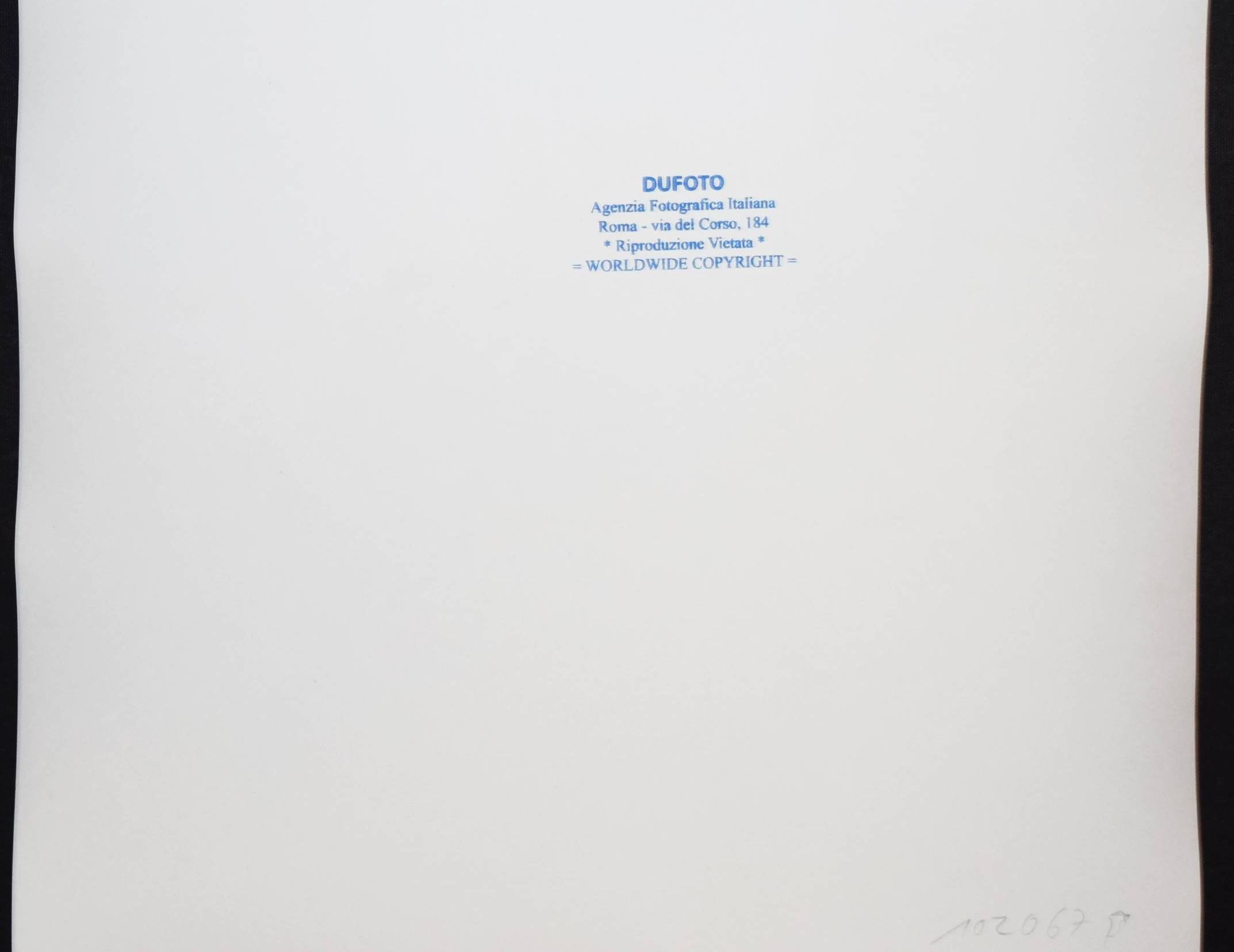 | Dali, Salvador Felipe Jacinto (1904-1989, span. Maler) u. Gala Éluard Dali (1894-1982, bekannte Muse). Orig.-Photographie von Aldo Durazzi (1925-1990), Rom. Rom 1954. Format: 40 x 30 cm. (Hochformat). Der berühmte Surrealist und seine Frau vor dem berühmten Gemälde „Kreuzigung oder Hyperkubus Körper“ bei einer Ausstellung im Palazzo Pallavicini in Rom. Wohl vom Künstler selbst inszenierte Aufnahme, während der Dali in Richtung der Kamera blickt ist Gala im Profil dargestellt. – Rückseitig mit dem Stempel der ital. Foto-Agentur DUFOTO, späterer Abzug.