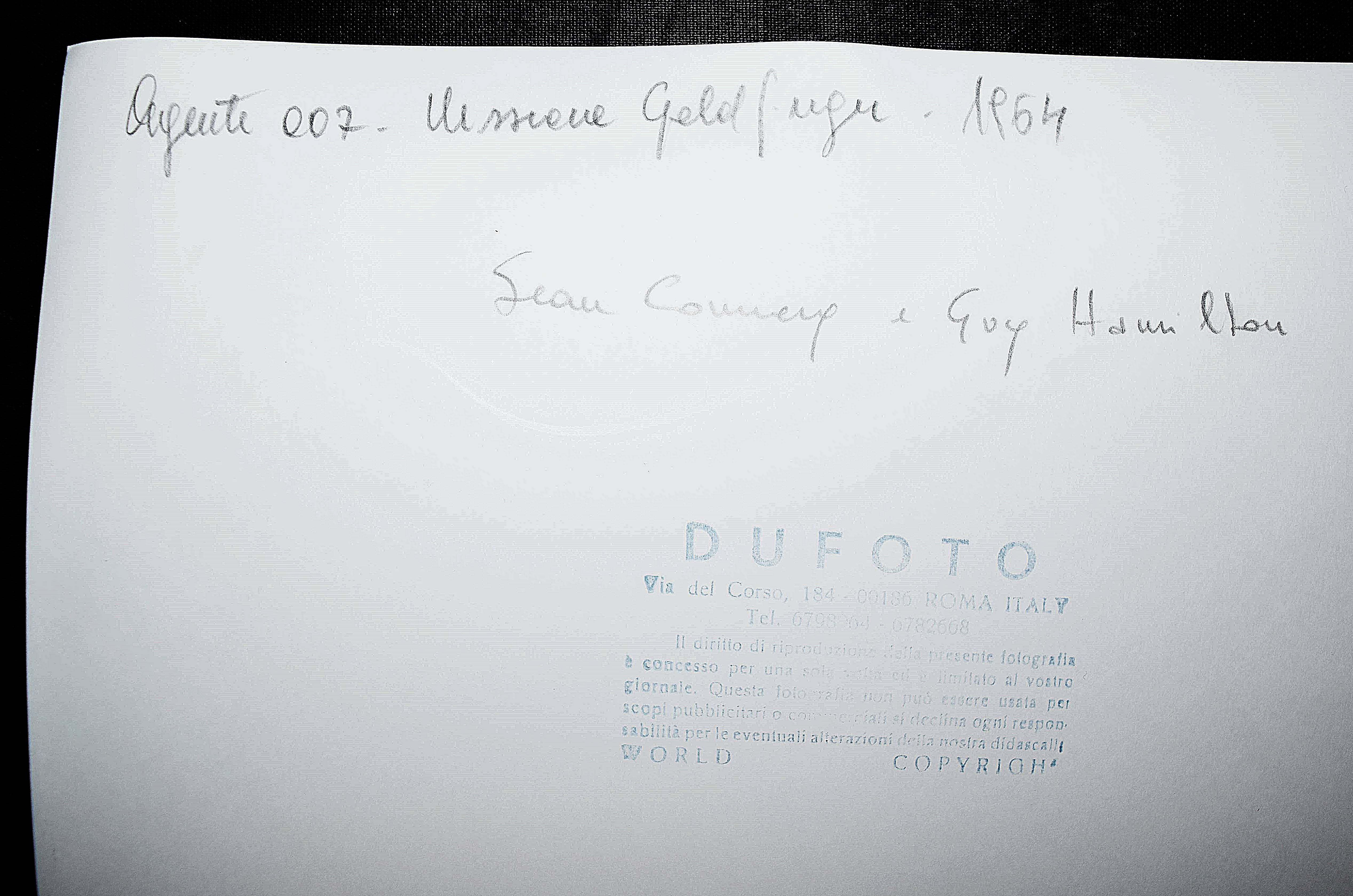Connery, Thomas Sean, Sir (1930-2020, britischer Schauspieler, Filmproduzent und Oscar-Preisträger) und Guy Hamilton (1922-2016, britischer Regisseur). Orig.-Photographie. London 1964. Format: 30 x 24 cm. Der berühmte Bond-Darsteller mit freiem Oberkörper während der Dreharbeiten zu „James Bond 007 – Goldfinger“ in den Pinewood Studios im Frühjahr 1964. – Hamilton hatte die Regie zu „James Bond jagt Dr. No“ (1962) noch abgelehnt. Nachdem er Mitte der 60er Jahre bei mehreren Spionage-Filmen Regie geführt hatte, began seine Arbeit für die Serie mit dem äußerst erfolgreichen Bond-Klassiker James Bond 007 – Goldfinger. Hamilton führte auch Regie bei den Bond-Filmen „Diamanten-Fieber“ (1971), „Leben und Sterben lassen“ (1973) und „Der Mann mit dem goldenen Colt“ (1974). – Rückseitig mit Stempel der ital. Film-Agentur DUFOTO. – Vintage.