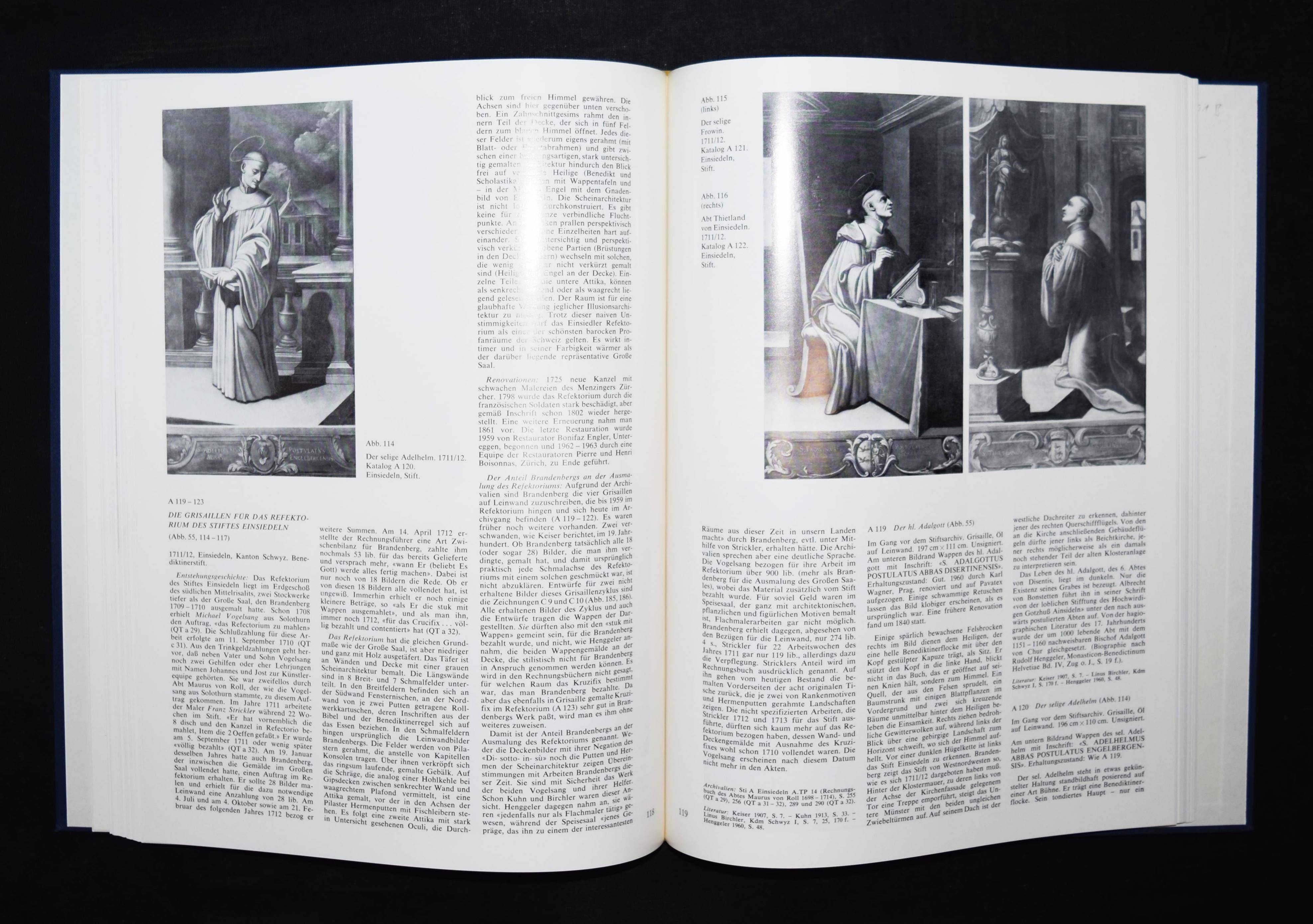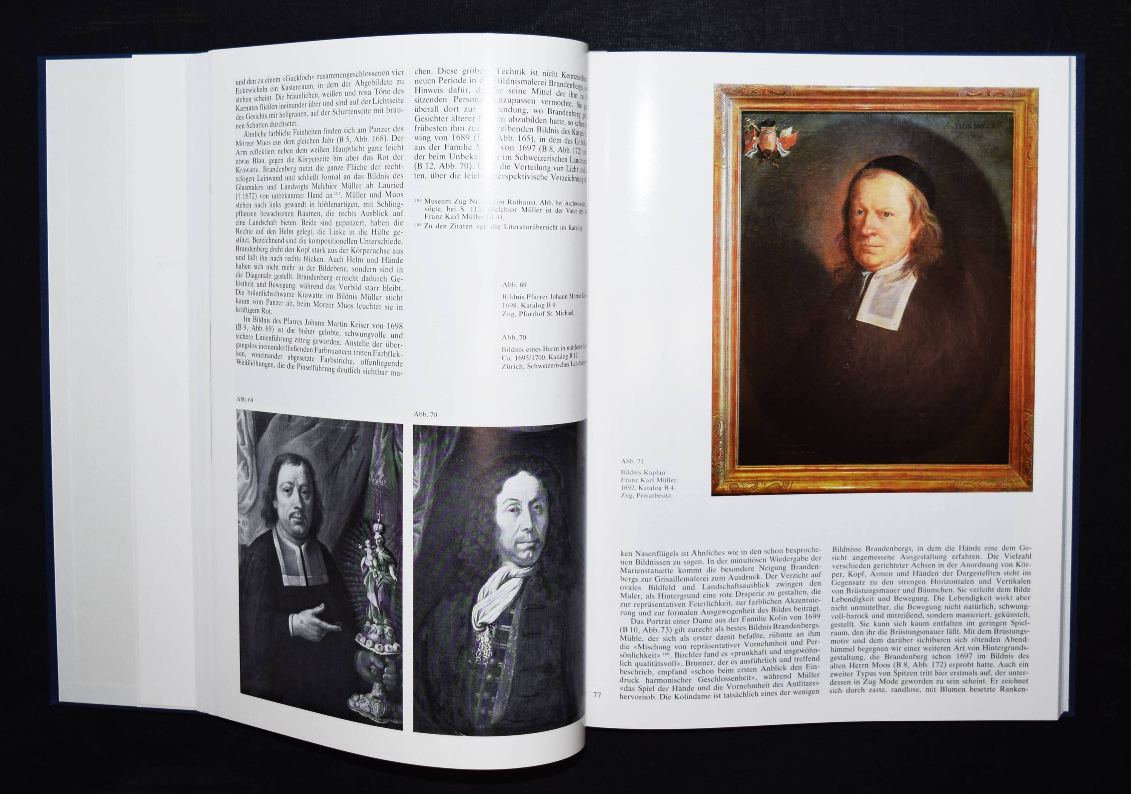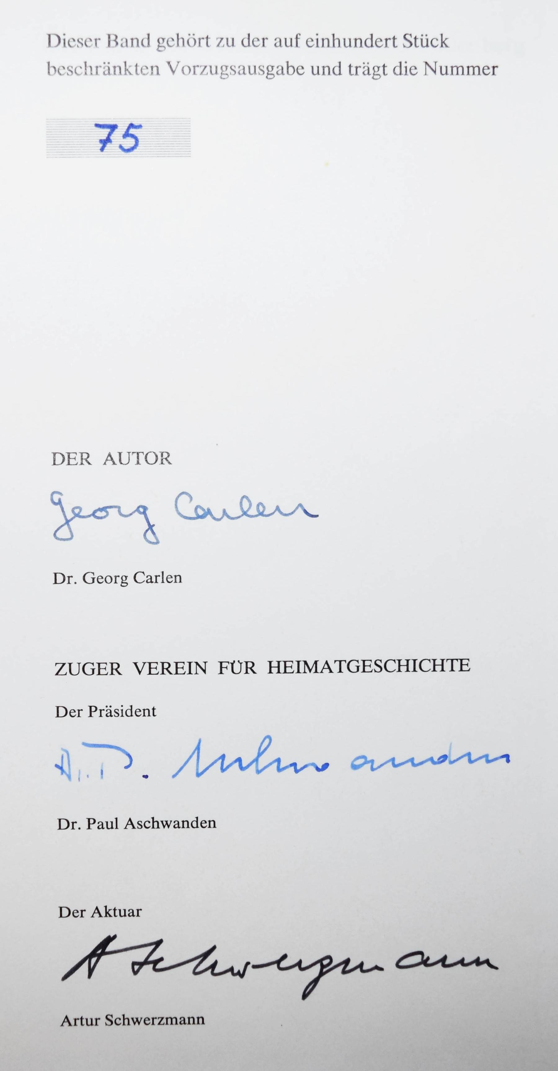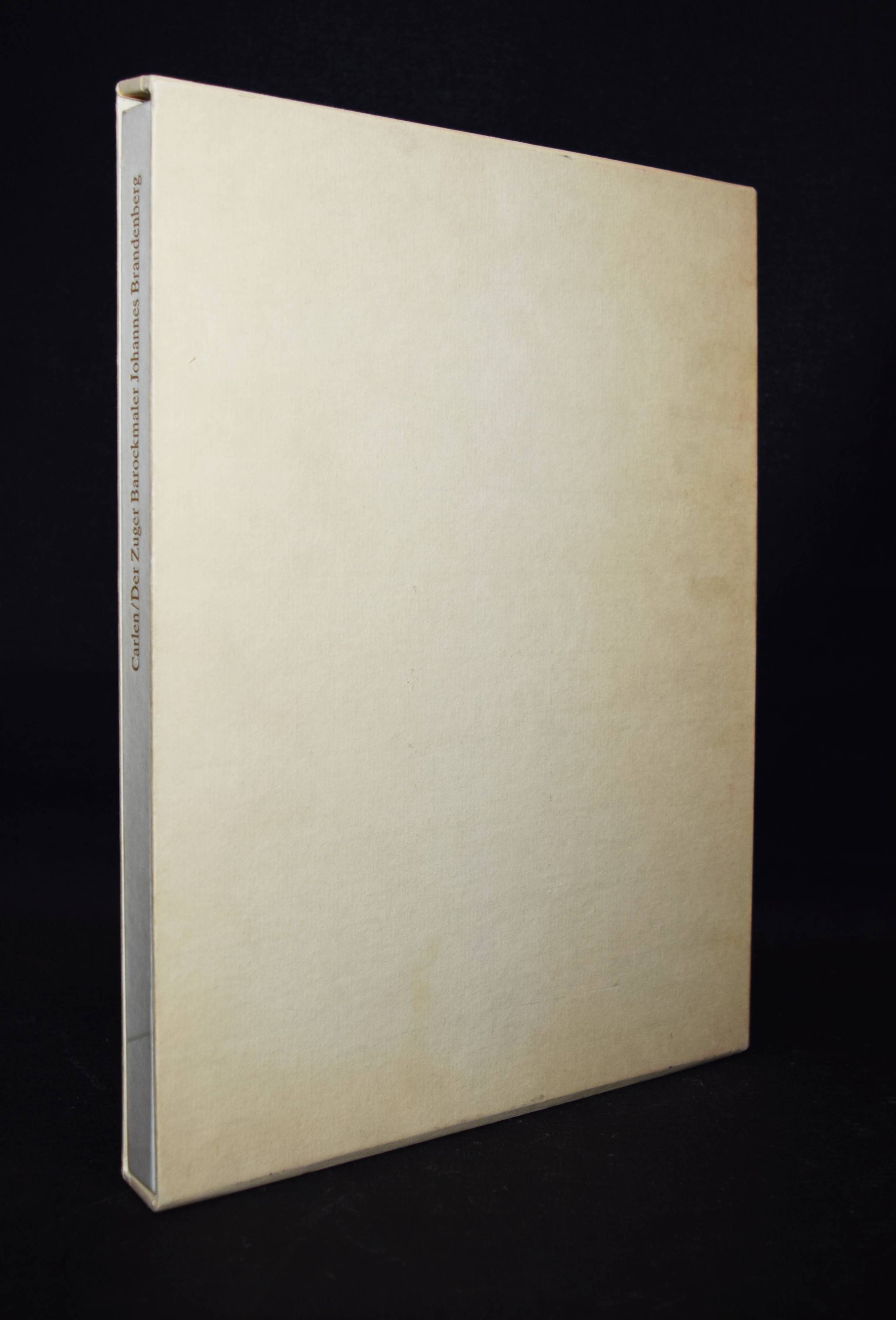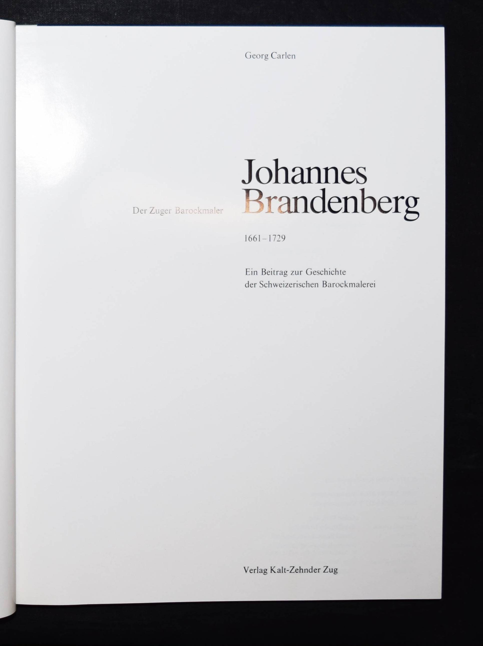 Brandenberg – Carlen, Georg. Der Zuger Barockmaler Johannes Brandenberg 1661-1729. Ein Beitrag zur Geschichte der Schweizerischen Barockmalerei. Zug, Kalt-Zehnder 1977. 4°. 208 S. mit zahlr. teils farb. Abb. OHprgt. mit goldgepr. Rückentitel in Orig.-Pappschuber. Erste Ausgabe. – Eines von 100 num. Exemplaren der Vorzugsausgabe. – Von G. Carlen, sowie P. Aschwanden und A. Schwerzmann (Präsident und Aktuar des Zuger Vereins für Heimatgeschichte) signiert. – Tadellos.
