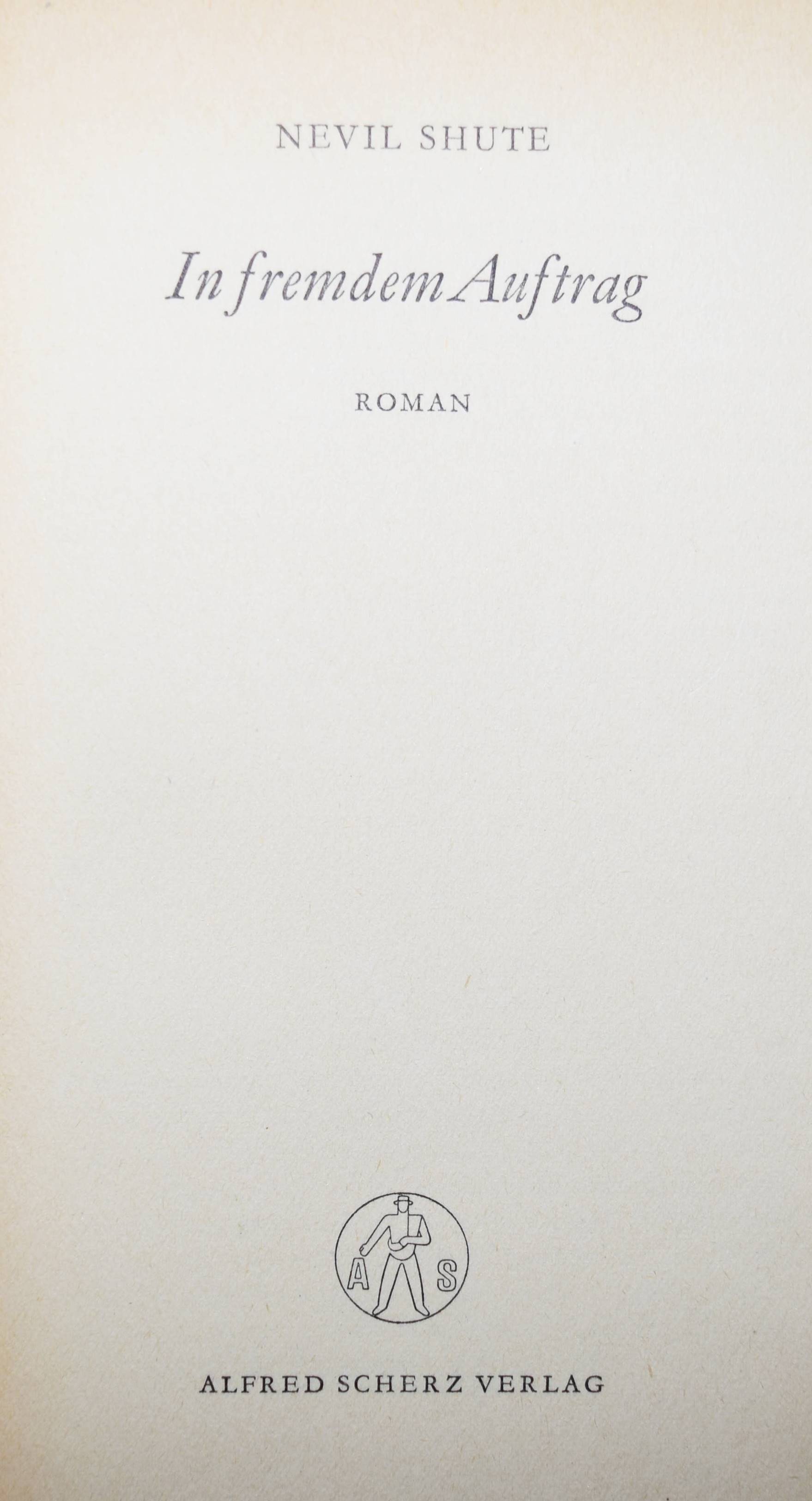 Shute, Nevil. In fremdem Auftrag. Roman. Bern, Scherz (1954). 8°. 192 S. OPbd. mit farbig illustr. OU. Erste deutsche Ausgabe. – Die engl. Originalausgabe erschien im selben Jahr mit dem Titel „So disdaint“. – Schutzumschlag mit geringf. Randläsuren, gutes Exemplar.