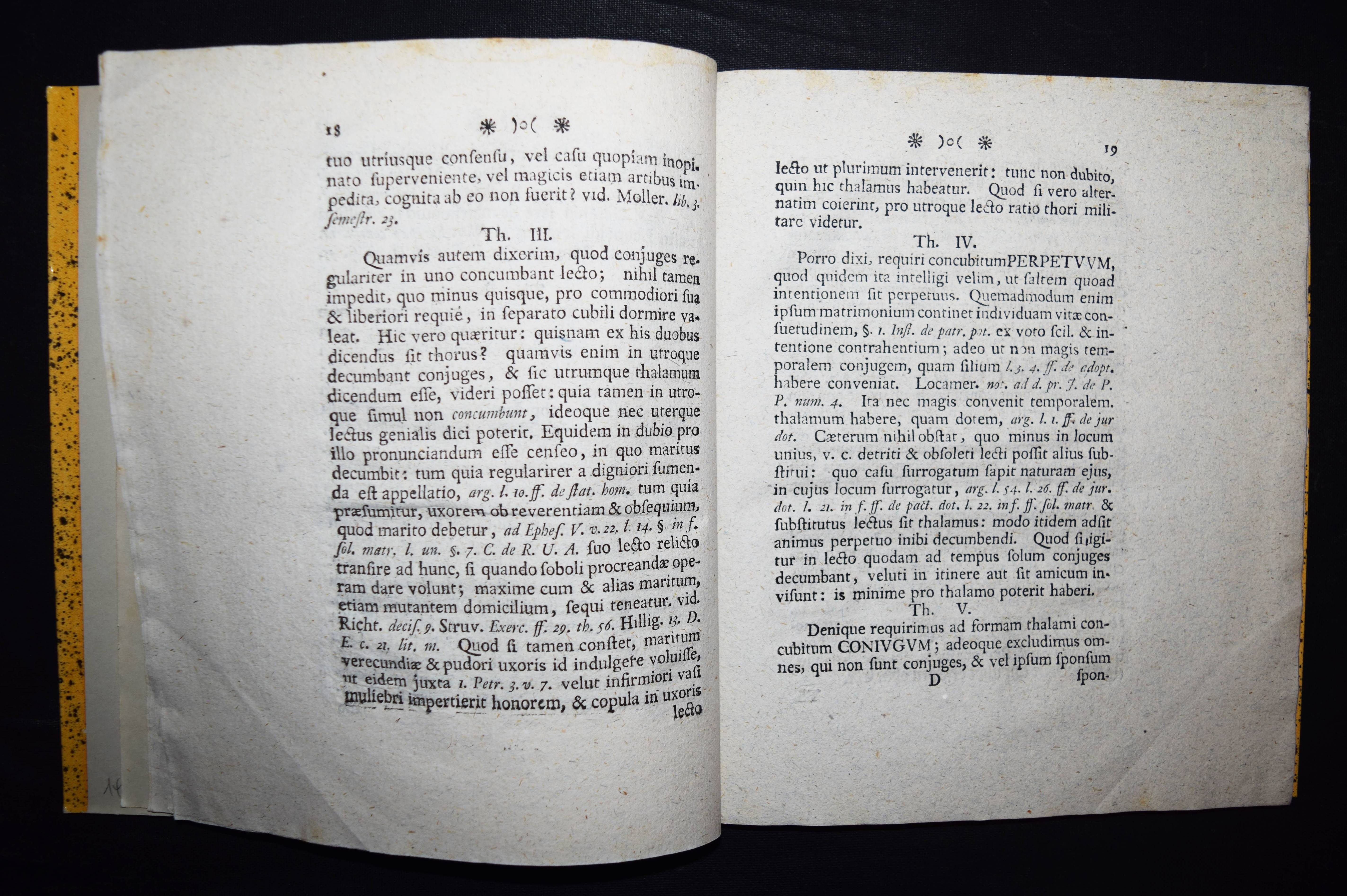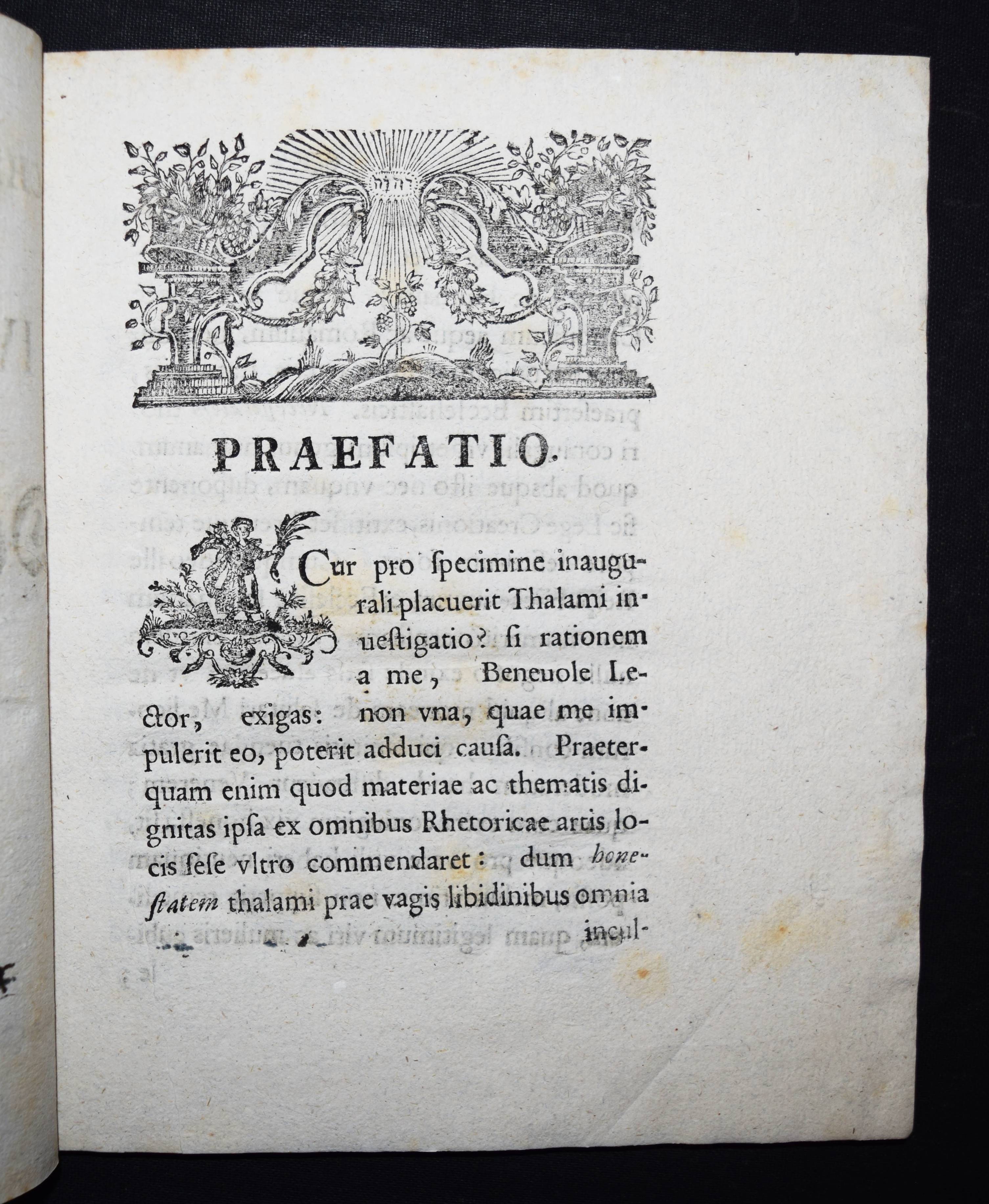 Wildvogel, Christian. Dissertatio juridica de jure thalami. Vom Rechte des Ehe-Bettes. O. O. u. Druck (Jena ?) 1757. 8°. [3] Bl., 54 S. mit 3 Schmuck-Vignetten in Holzschnitt. Pbd. im Stil der Zeit. VD18 15199924. – Späte (letzte ?) Ausgabe der bereits 1703 zuerst erschienenen Dissertation. – C. Wildvogel (1644-1728) wurde 1678 von Herzog Johann Ernst von Sachsen-Weimar zum Hofrat in Weimar ernannt und war seit 1690 Professor an der Akademie in Jena und später Vizekanzler. Wildvogel hat 143 Dissertationen und 56 Programme verfaßt, fast ausschließlich zu zivilrechtlichen Fragen. Zu Wildvogel vgl. auch ADB XL, 515. – St. verso Titel, sehr gutes Exemplar.