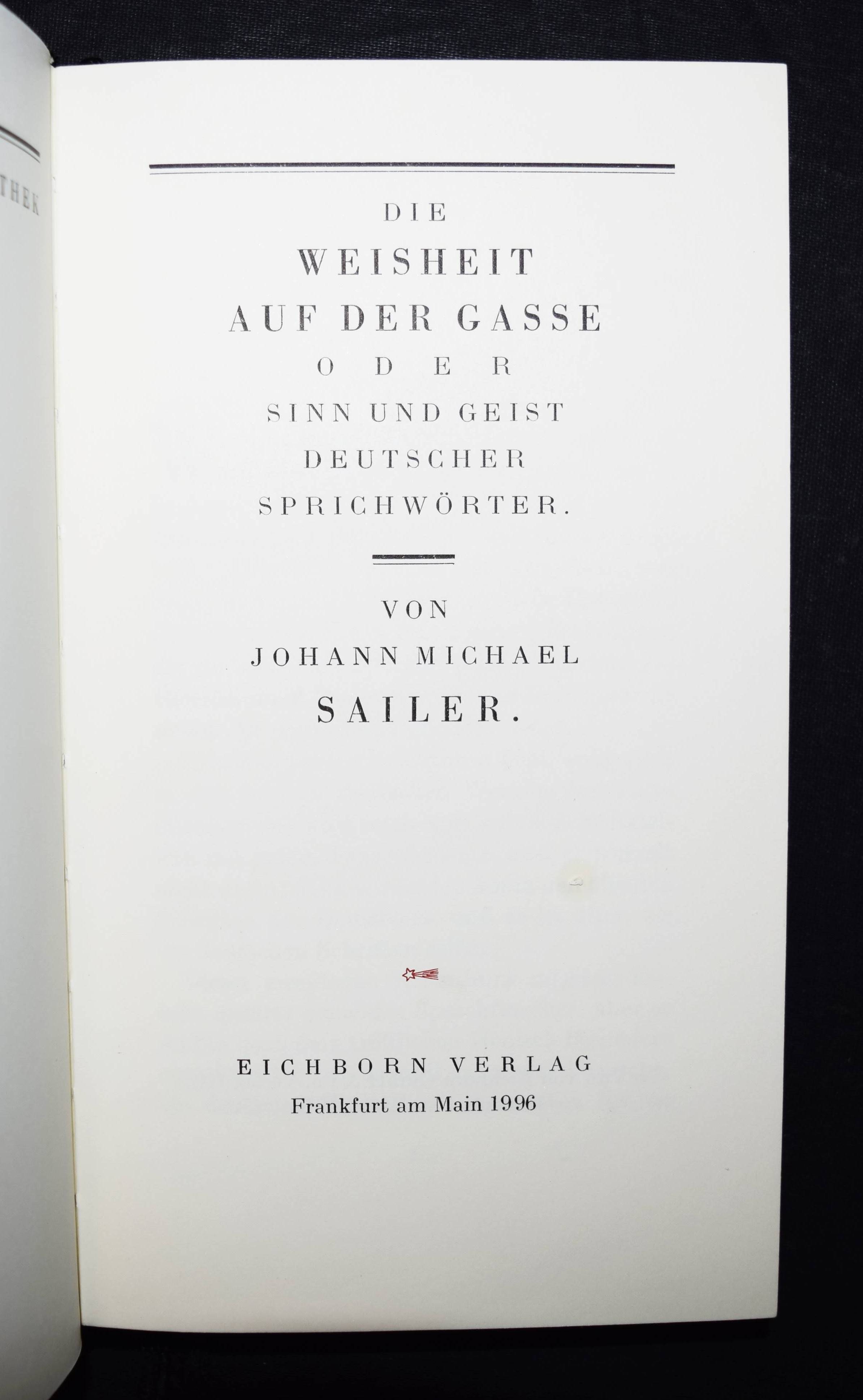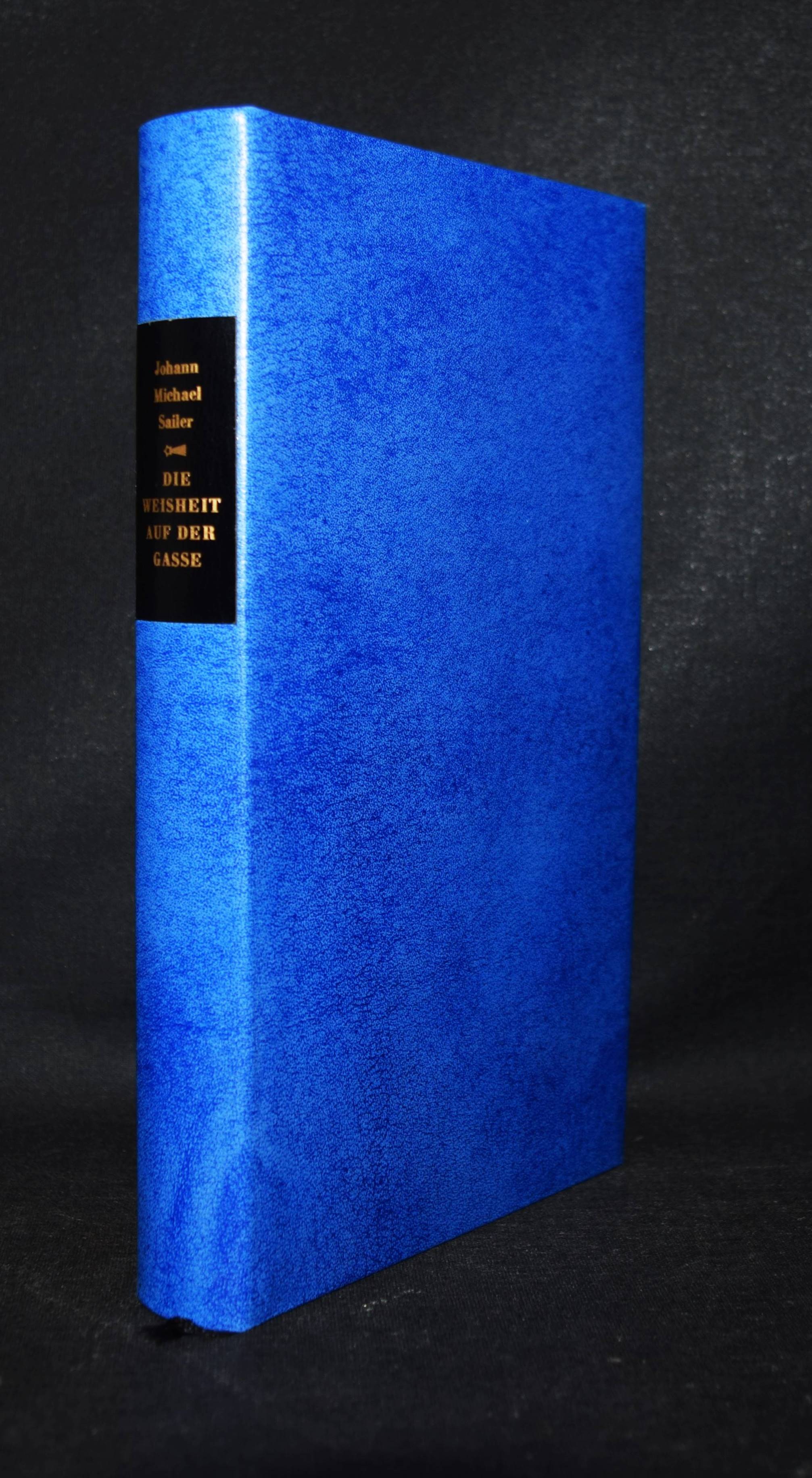 | Sailer, Johann Michael. Die Weisheit auf der Gasse oder Sinn und Geist deutscher Sprichwörter. Frankfurt am Main, Eichborn 1996. 8°. 356 S., [2] Bl. Blauer OLdr. (ostindisches Ziegenleder) mit goldgepr. Rückenschild in Orig.-Pappschuber. (Die andere Bibliothek, Band 144). Eines von 999 num. Exemplaren der Vorzugsausgabe. – Tadellos.