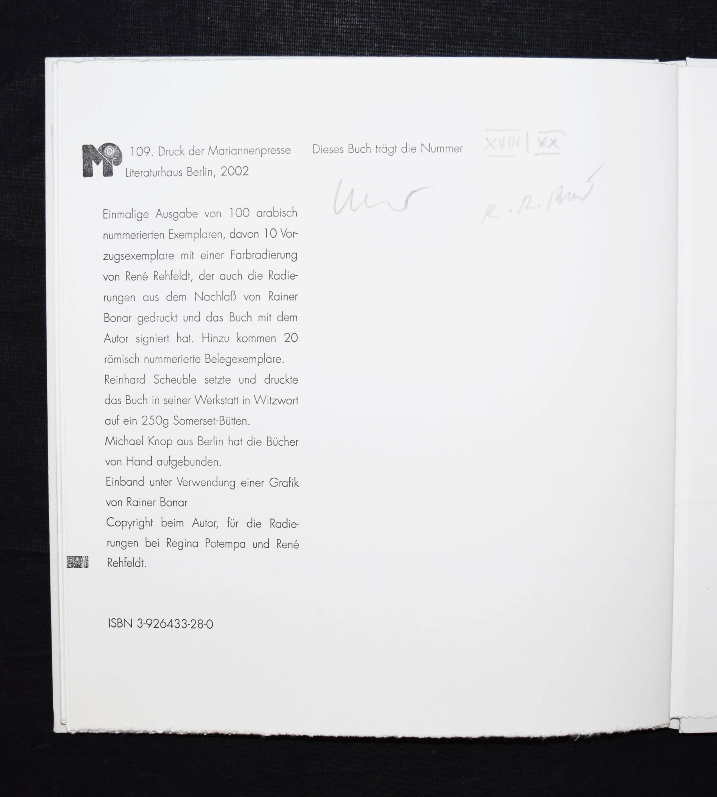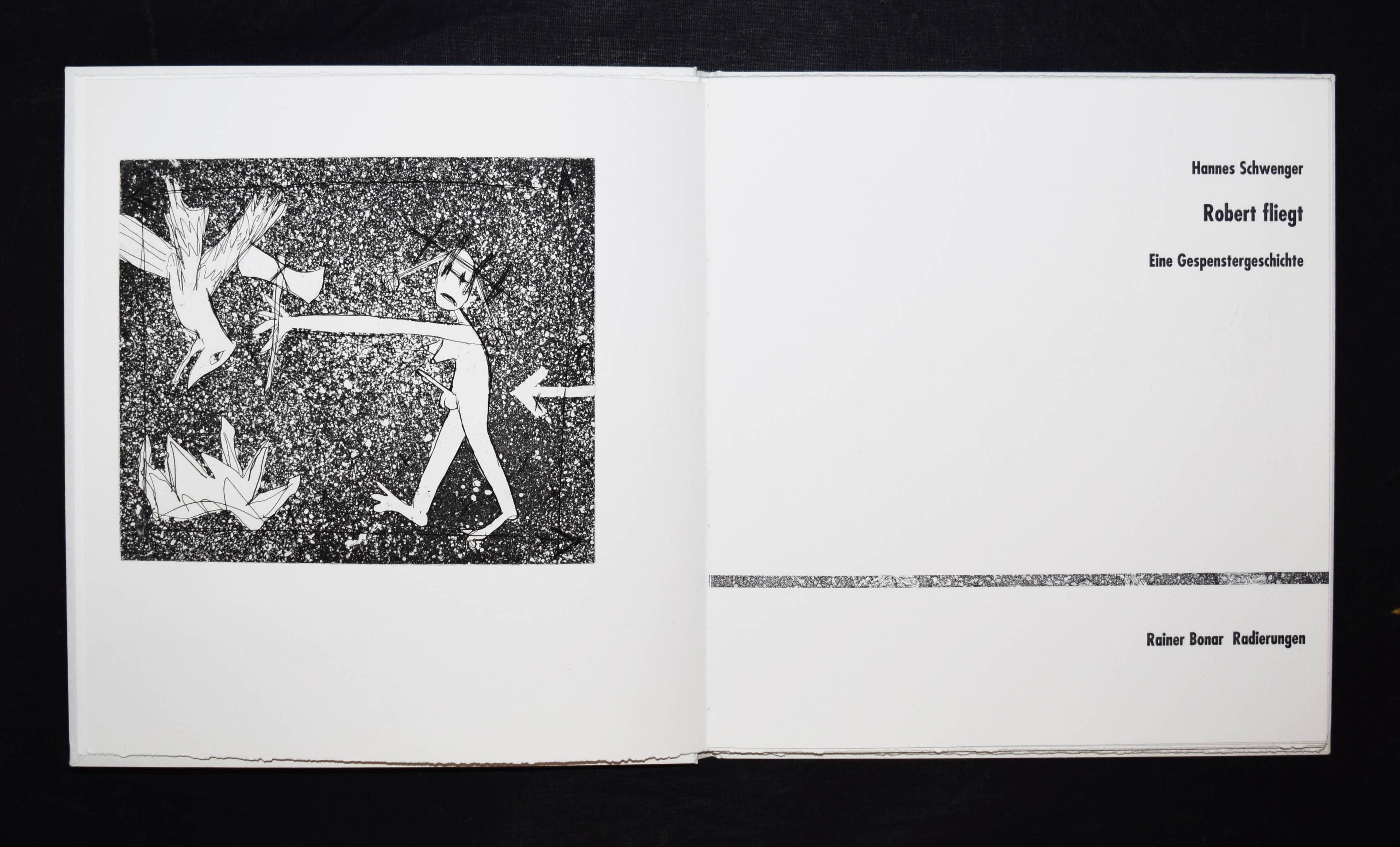 Schwenger, Hannes. Robert fliegt. Eine Gespenstergeschichte. Berlin, Edition Mariannenpresse 2002. 4°. [13] Bl. mit 3 Orig.-Kaltnadelradierungen von Rainer Bonar. Farbig illustr. OPbd. (von Michael Knop). (Veröffentlichung der Edition Mariannenpresse, Band 109). Eines von 20 röm. num. Exemplaren (GA 120 Exemplare). – Im Druckvermerk von H. Schwenger u. R. Bonar signiert. – Tadellos.