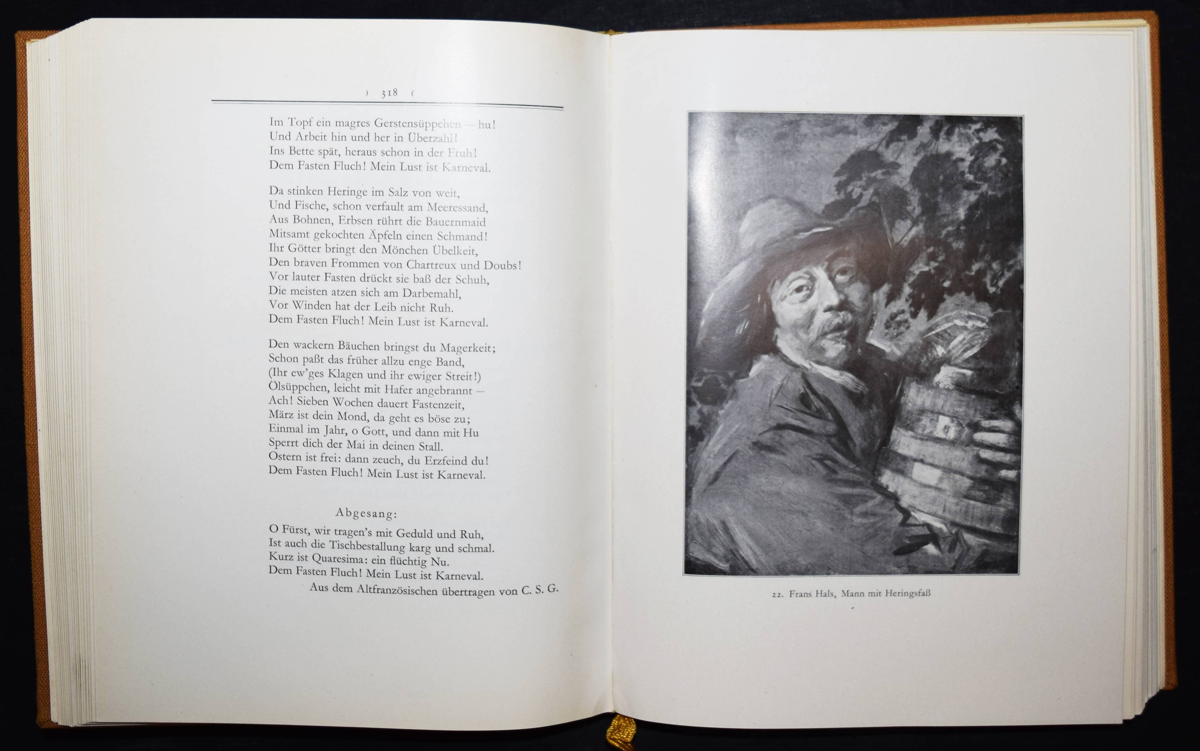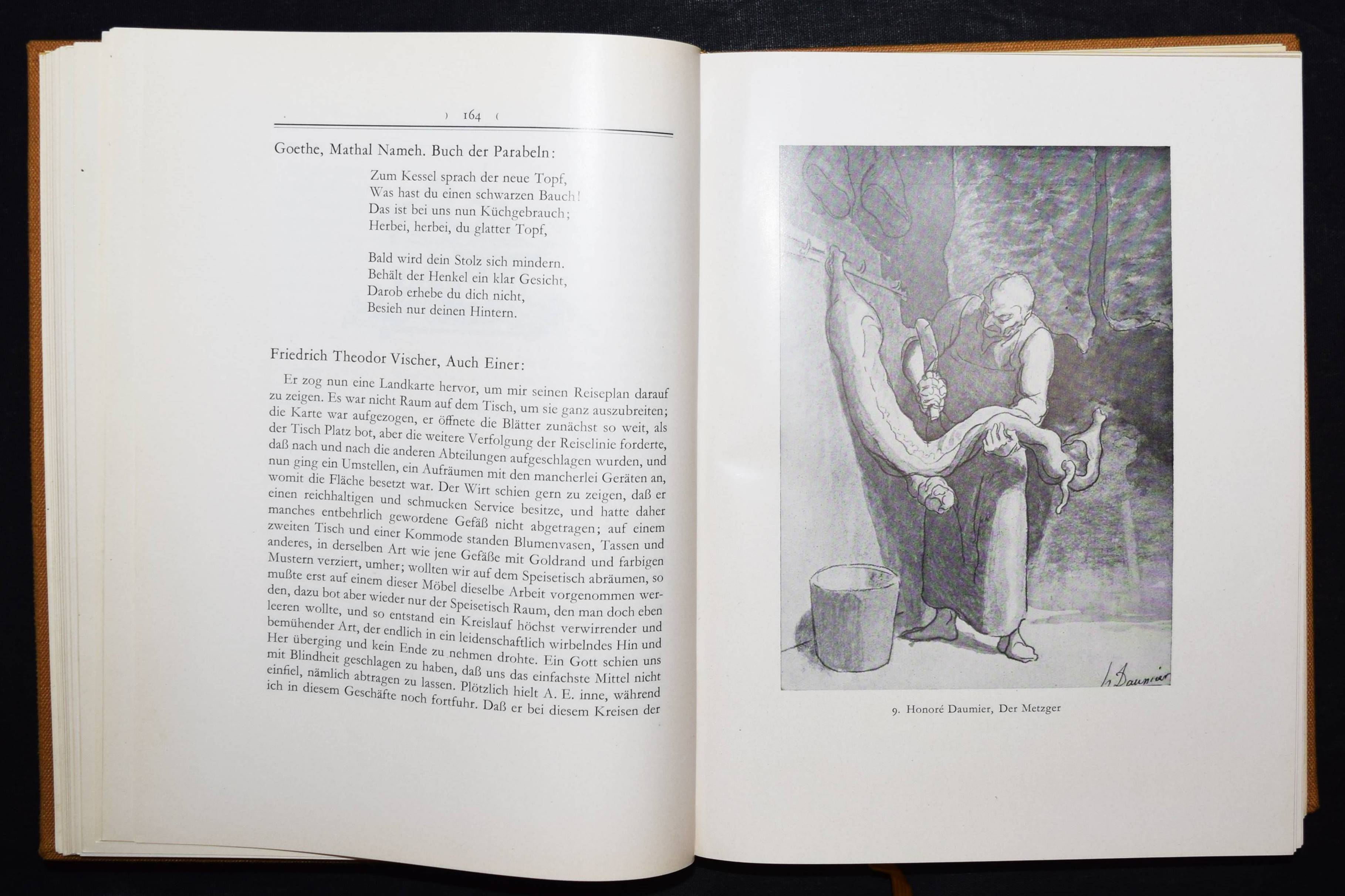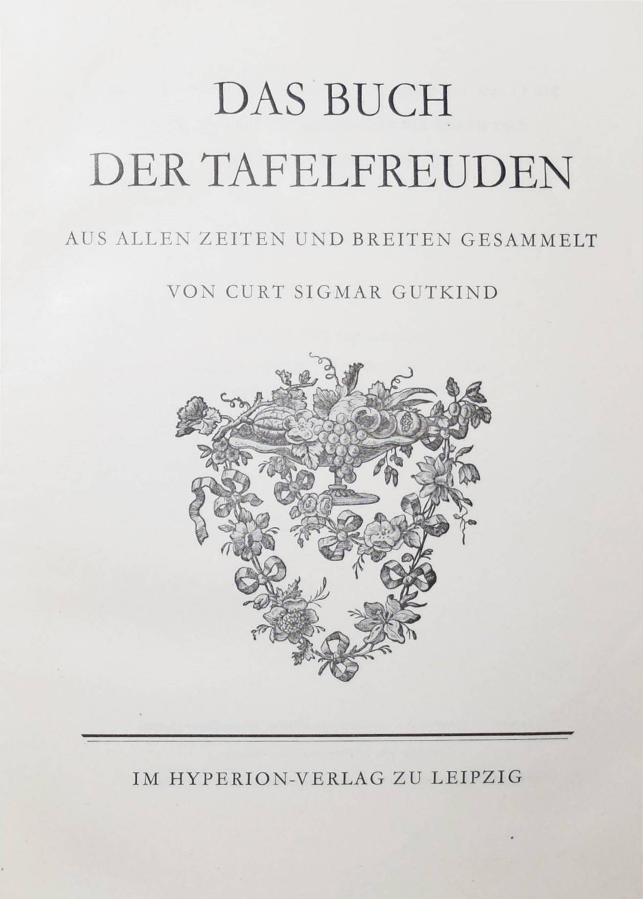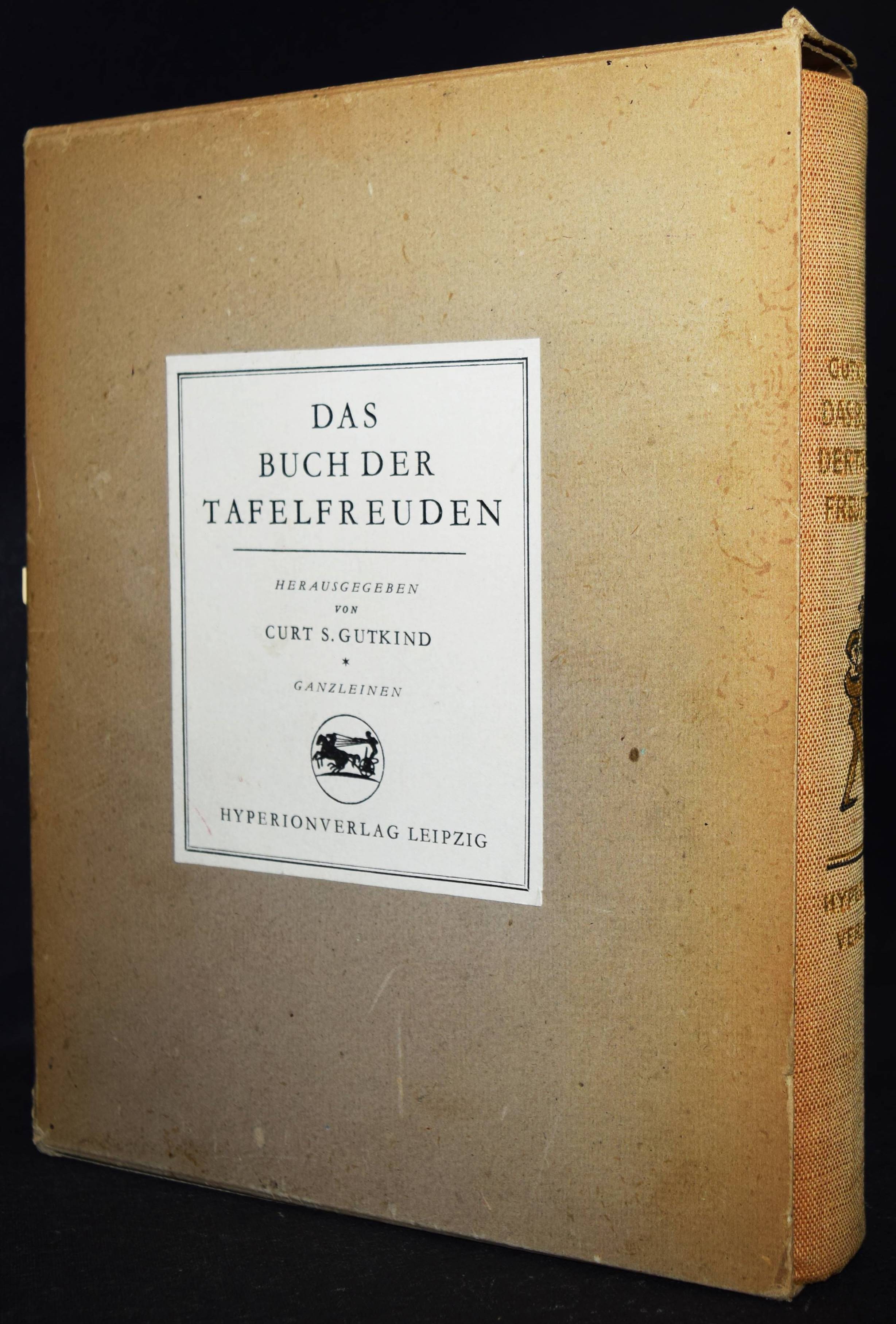 Gutkind, Curt Sigmar. Das Buch der Tafelfreuden. Aus allen Zeiten und Breiten gesammelt. Leipzig, Hyperion-Verlag (1929). Gr.-8°. 643, (1) S. mit 72 Abb. im Text u. 74 teils farb. Tafeln. Illustr. OLn. in Orig.-Pappschuber. Horn-Arndt 864. Walterspiel 237. – Erste Ausgabe. – Auswahl und Zusammenstellung der Bilder von Wilhelm Fraenger. – „Sammlung kulturhistorischer Zeugnisse der Gastronomie“ (Horn-Arndt). – Rücken leicht aufgehellt, Innengelenke vor dem Titelblatt und am Ende etwas angeplatzt, gutes Exemplar.