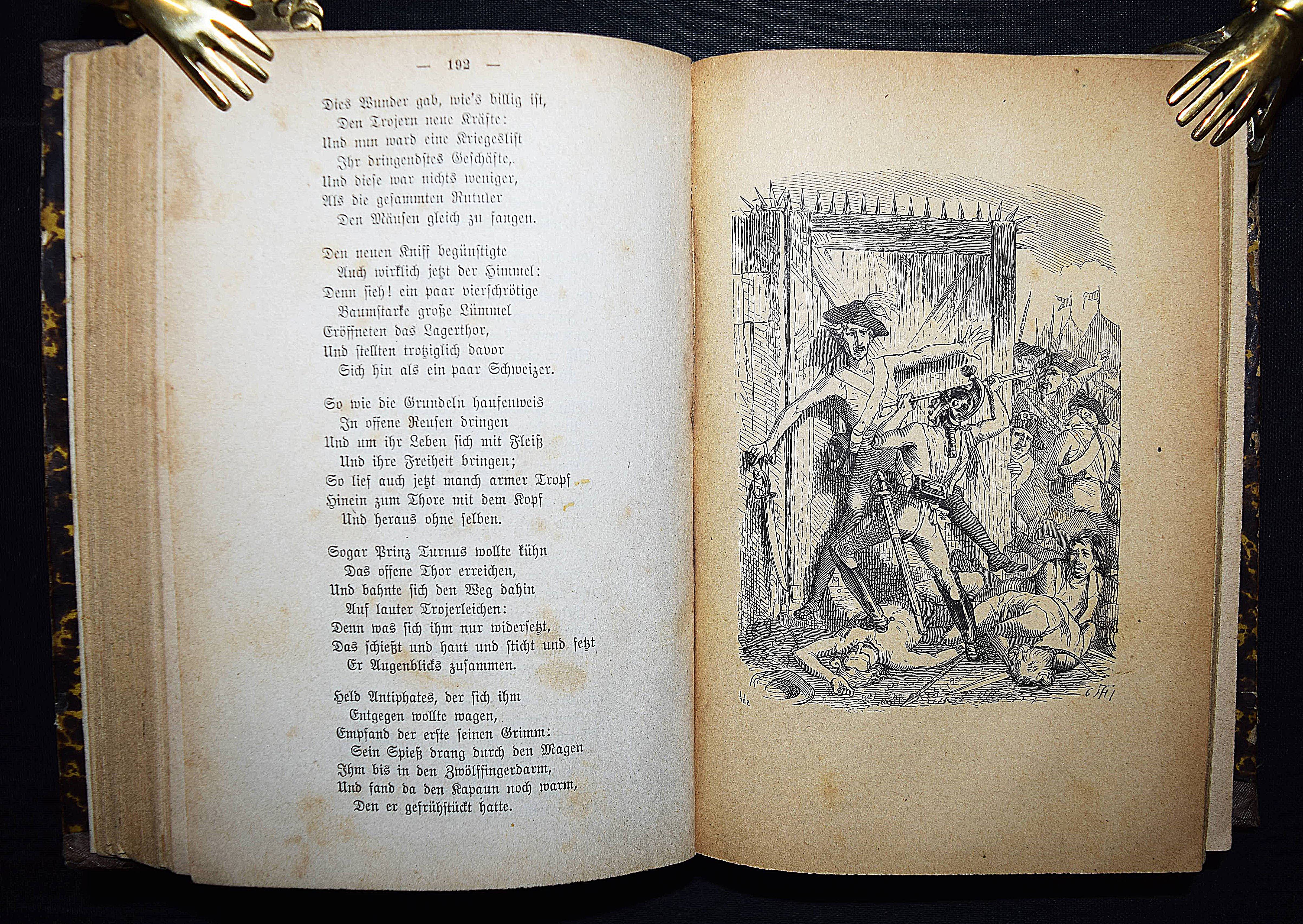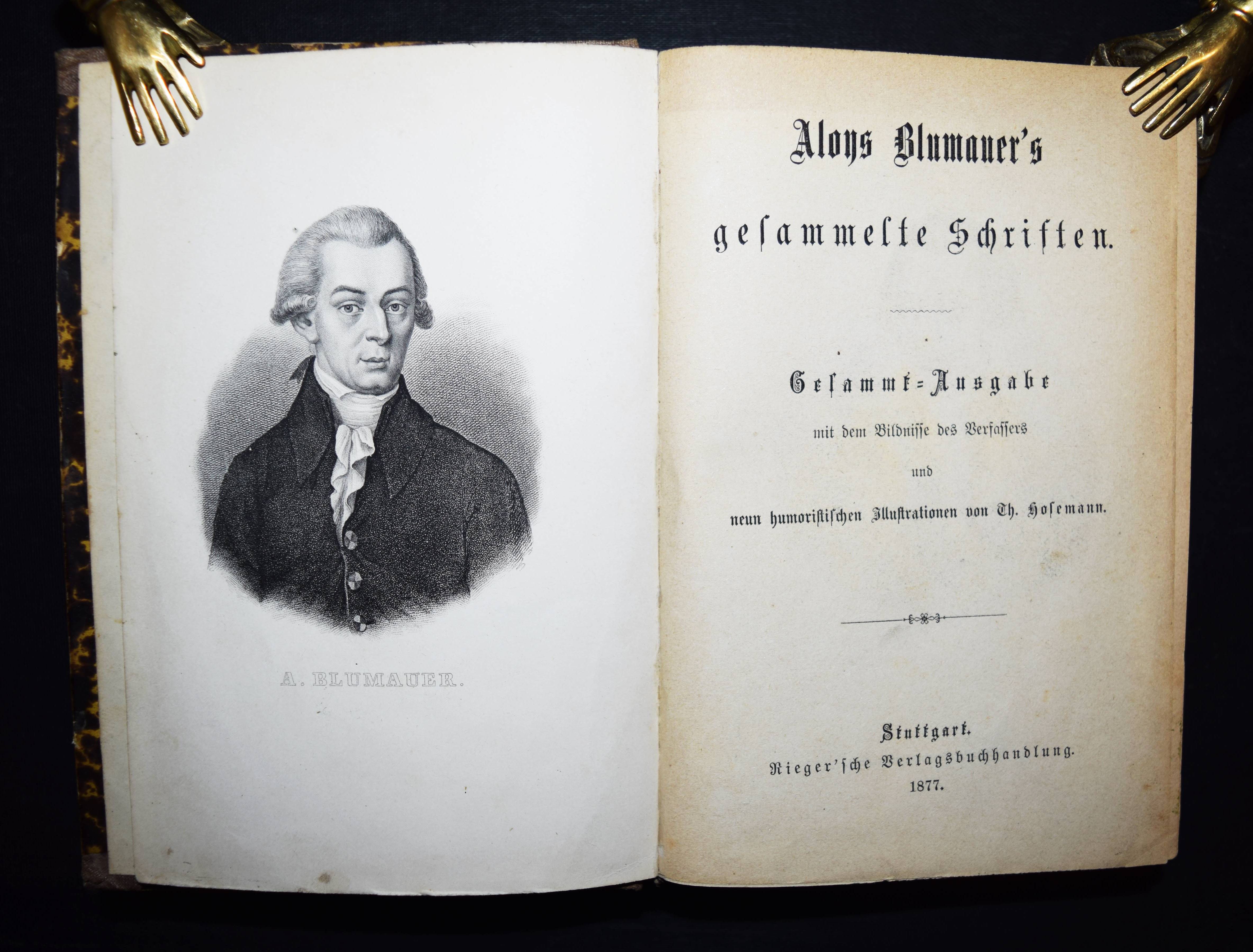 Blumauer, Alois. Gesammelte Schriften. Gesamt.-Ausgabe mit dem Bildnisse des Verfassers und neun humoristischen Illustrationen von Th(eodor) Hosemann. Stuttgart, Rieger 1877. 8°. 616 S. mit gestoch. Porträt u. 9 Holzschnitt-Tafeln. OHln. mit Rückenschild. Rümann 718. Brieger-Hobrecker 290. – Letzte Gesamtausgabe. – Rücken etwas aufgehellt u. fleckig, Kanten berieben, stellenweise etwas fingerfleckig, sonst gut erhalten.