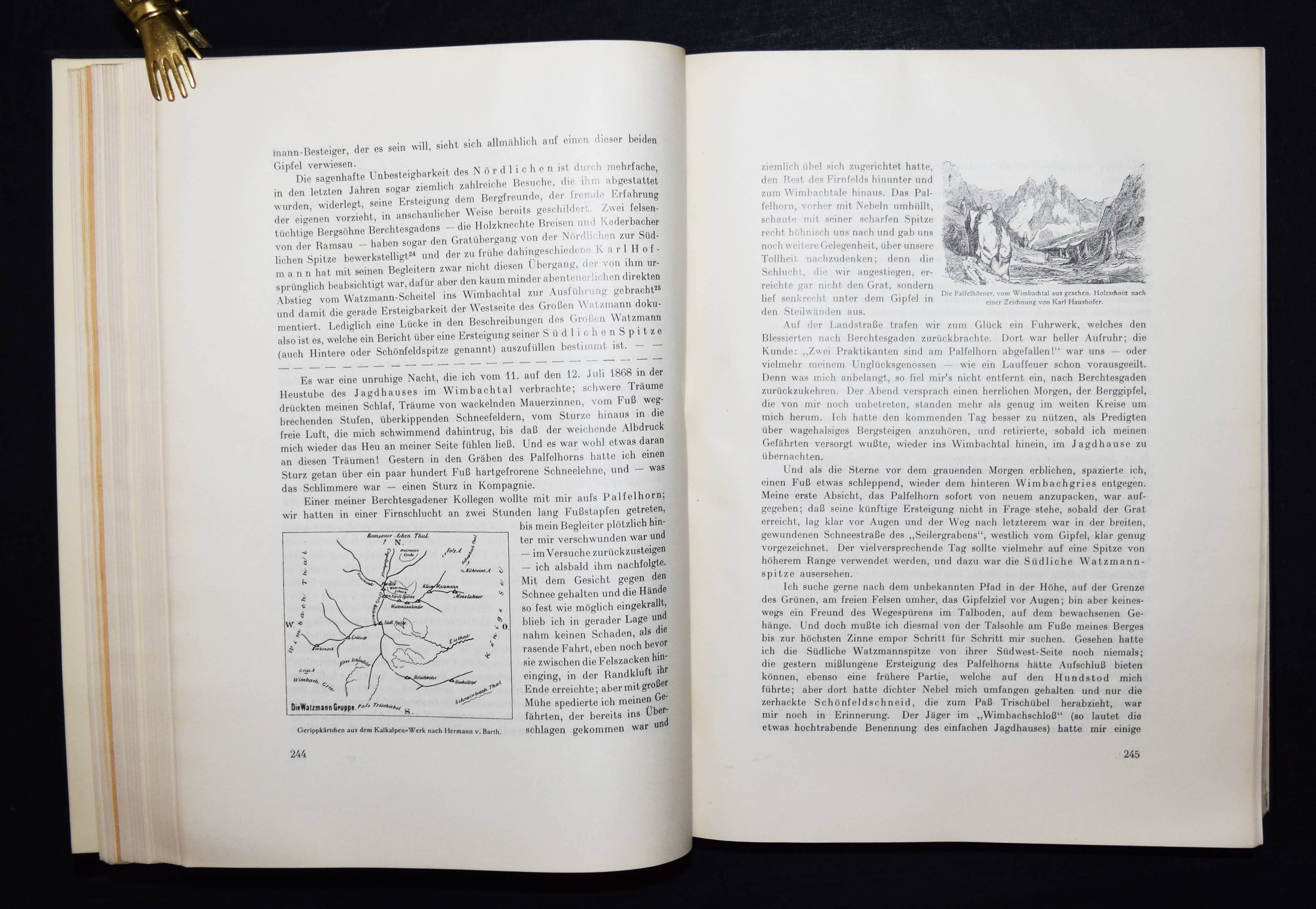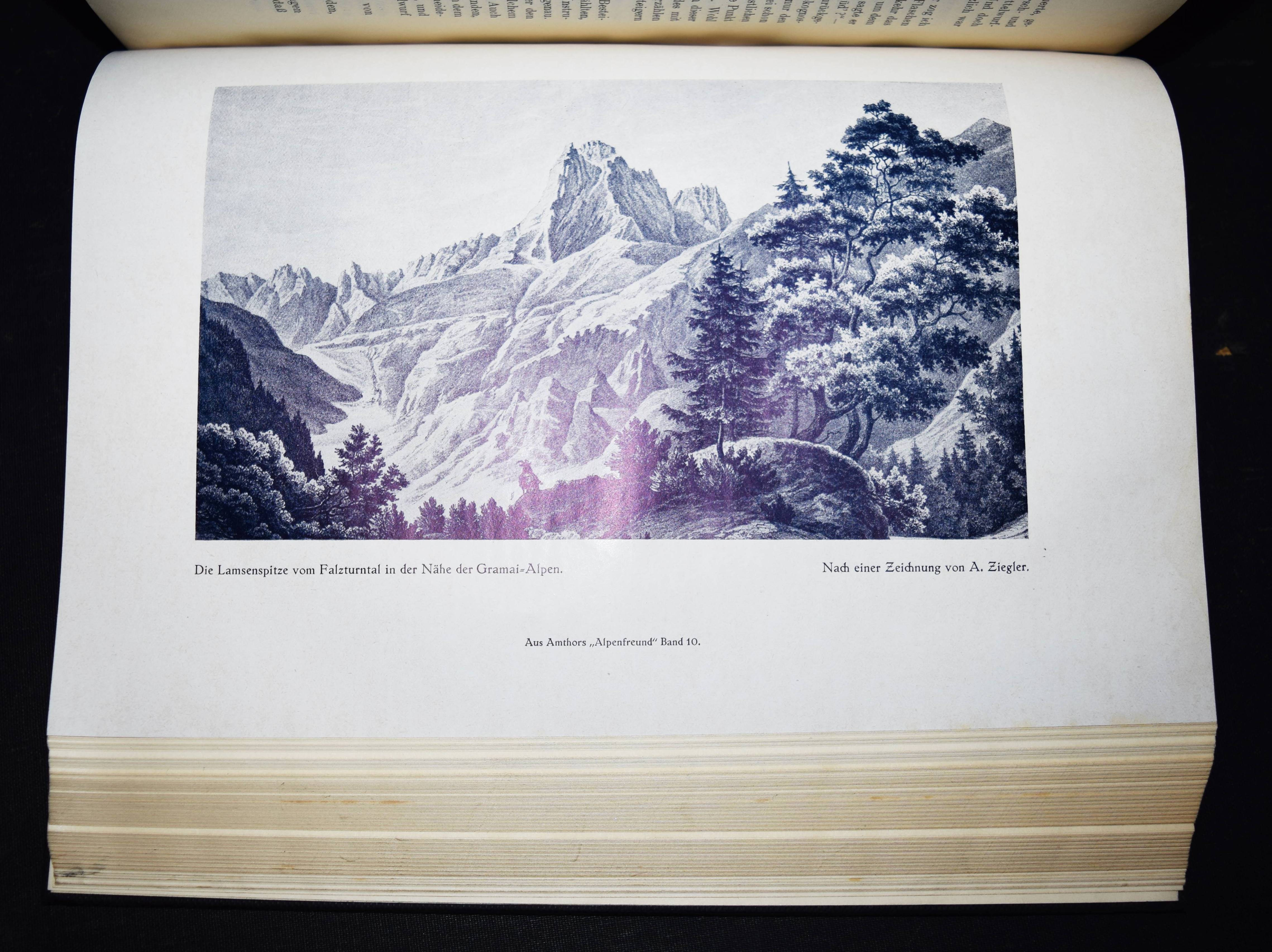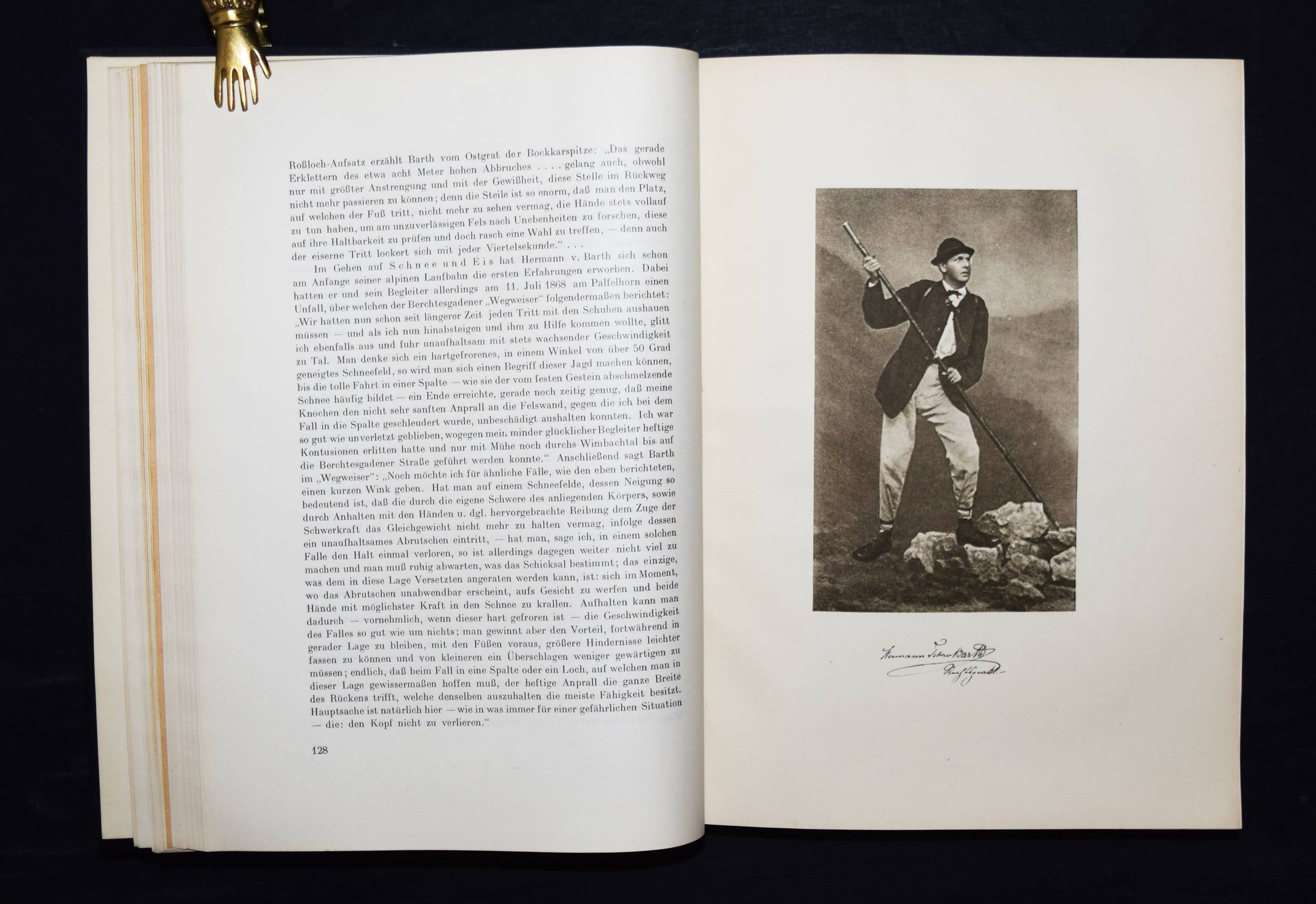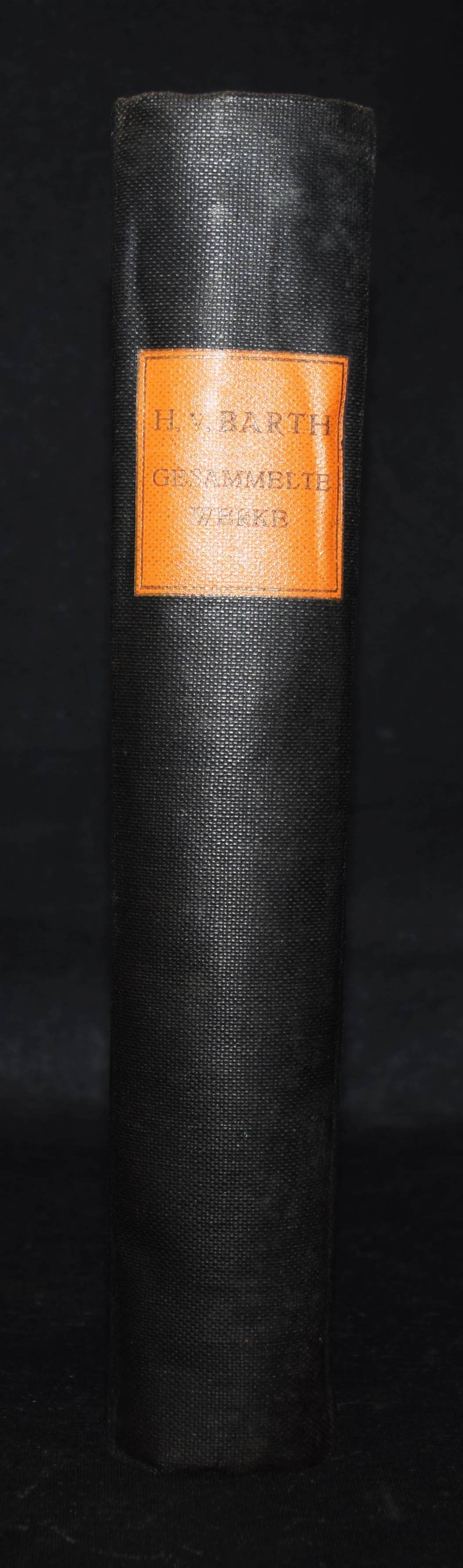 Barth, Hermann v. Gesammelte Schriften. Herausgegeben von Carl Bünsch und Max Rohrer. München, Alpine Verlagsanstalt (1926). 4°. 1206 S., 1 Bl. mit 12 (3 farb.) Tafeln u. zahlr. Abb. u. Karten. OLn. mit goldgepr. Rücken- u. Deckeltitel. Erste Gesamtausgabe. – Der Alpinist H. v. Barth (1845-1876) war einer der ersten, der ohne Führer und allein die Gipfel der Hochalpen bestieg; er erschloß die Berchtesgadener und die Allgäuer Alpen, den Karwendel und das Wettersteingebirge. Außerdem bereiste er Angola und die Capverdischen Inseln. – Mit Bibliographie. – Deckeltitel mit Abriebstellen, Exlibris, N.a.V., gutes sauberes Exemplar.