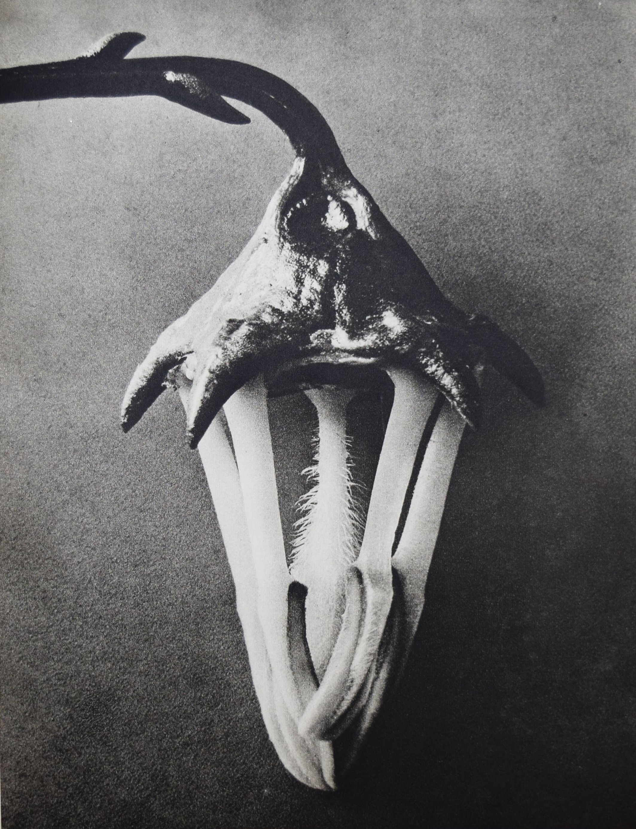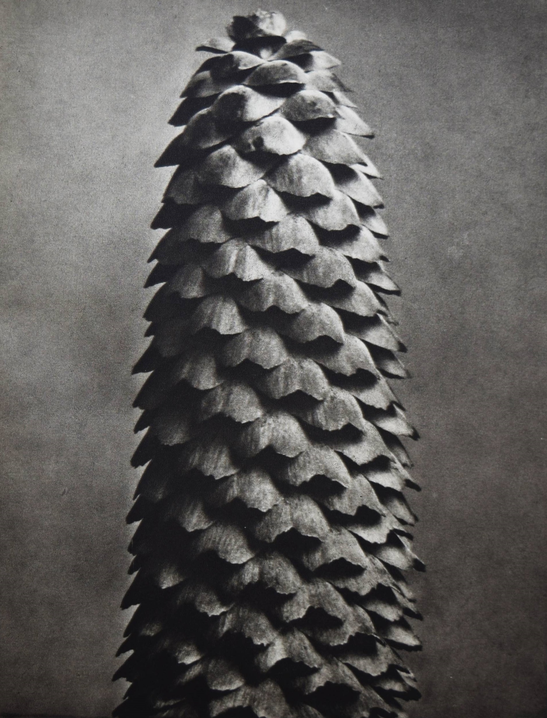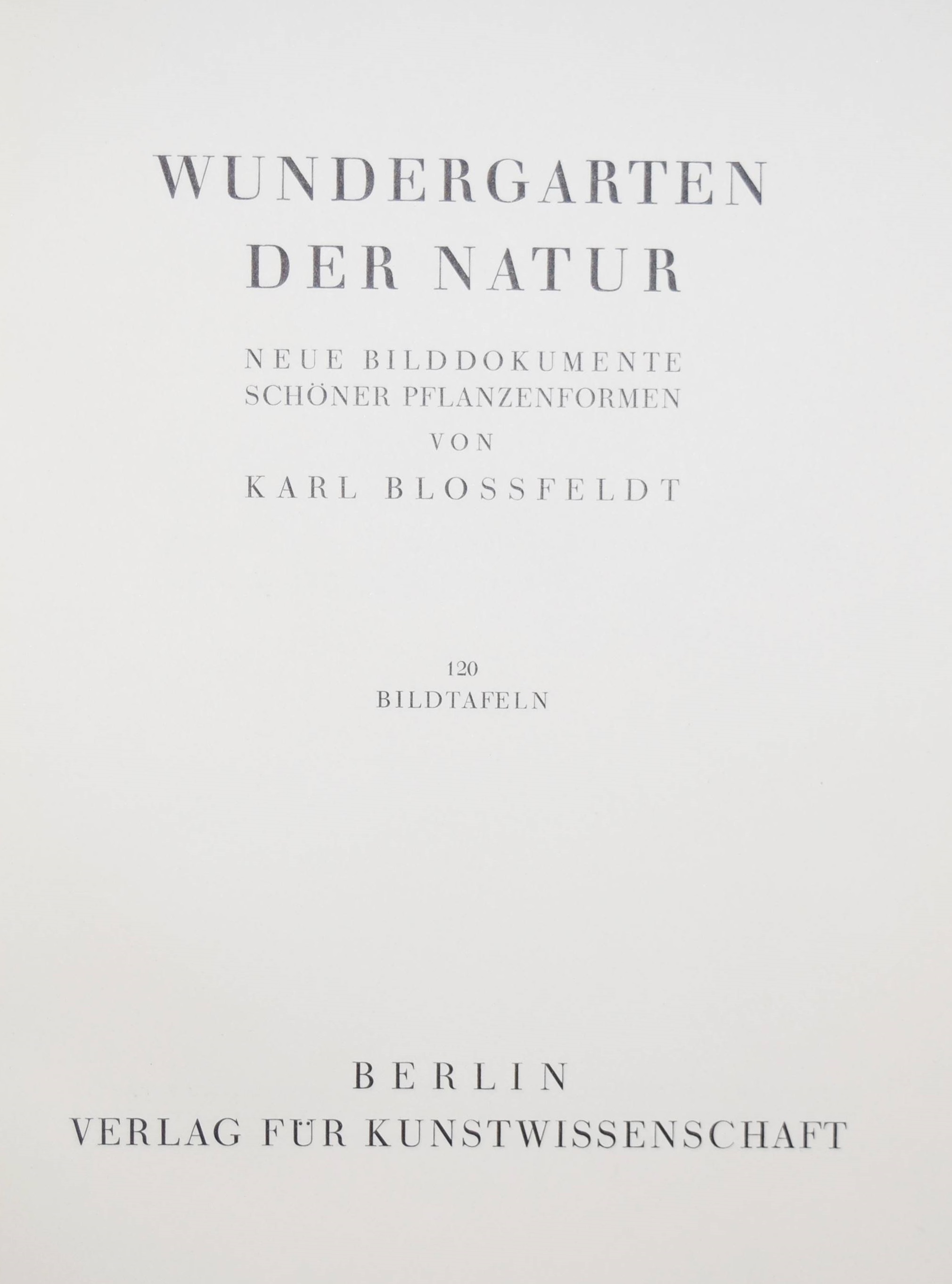 Blossfeldt, Karl. Wundergarten der Natur. Neue Bilddokumentation schöner Pflanzenformen. Berlin, Verlag für Kunstwissenschaft o. J. (1932). 4°. XIII, (3) S. u. 137 Abb. auf 120 num. Bildtafeln in Kupfertiefdruck. Hellgrauer OLn. mit Rücken- u. Deckeltitel u. Deckelvignette (Entwurf: Curt Siebert) u. illustr. Orig.-Schutzumschlag. Heidtmann 14481. Heiting/Jaeger I, 194 ff. (mit mehreren Abb.). The Open Book 106 f. – Erste Ausgabe. – „Dass hier die hohe Qualität des ersten Bandes beibehalten werden konnte, liegt daran, dass trotz des Verlagswechsels erneut die Graphische Anstalt Ganymed in Berlin mit der Druckherstellung beauftragt wurde… Gleich zu Beginn des Abbildungsteils fallen erste Unterschiede zu ‚Urformen der Kunst‘ ins Auge. Die Pflanzen bilden fast immer einen stärkeren Kontrast zum Hintergrund, was daran liegt, dass dieser, im Gegensatz zum vorherrschenden Grau des ersten Bildbandes häufig schwarz oder weiß gehalten ist. Dadurch geraten die Licht-Schatten-Kontraste insgesamt wesentlich eindrücklicher, die Pflanzen wirken folglich noch plastischer… Überhaupt tauchen nur wenige Seiten mit zwei oder drei Fotografien auf… Abgesehen davon, dass diese neue Form der Anordnung sich mehr den botanischen Gegebenheiten anpasst, entspricht sie in ihrer Klarheit und Strenge auch wesentlich deutlicher dem Stil der Neuen Sachlichkeit. Diese Feststellung darf im Übrigen für den gesamten zweiten Bildband gelten“ (B. Hammers in Heiting/Jaeger). – „Blossfeldts Aufnahmen zeigen in starker Vergrösserung pflanzliche Details und organische Formbildungen, die Bezüge zu dekorativen Elementen und ornamentalen Formen der Kunstgeschichte deutlich machen. Diese fotografischen Arbeiten beeinflussten Renger-Patzsch und Finsler“ (R. Mißelbeck S. 25). – Schutzumschlag etwas berieben, leicht angestaubt und am Kapital mit restaurierter Fehlstelle (ger. Textverlust des Rückentitels), Einband und Vorsätze leicht stockfleckig, gutes sauberes Exemplar.