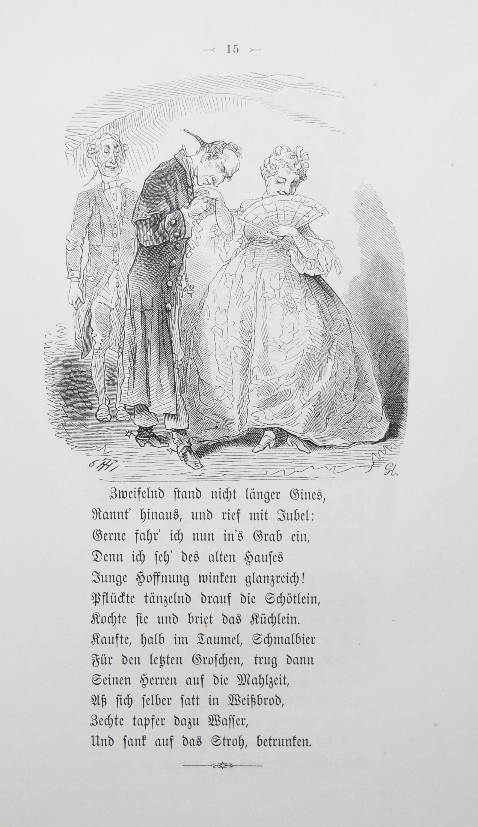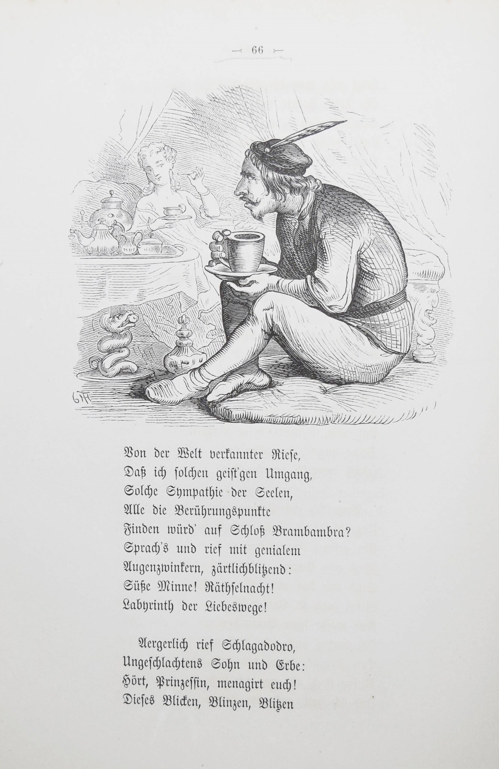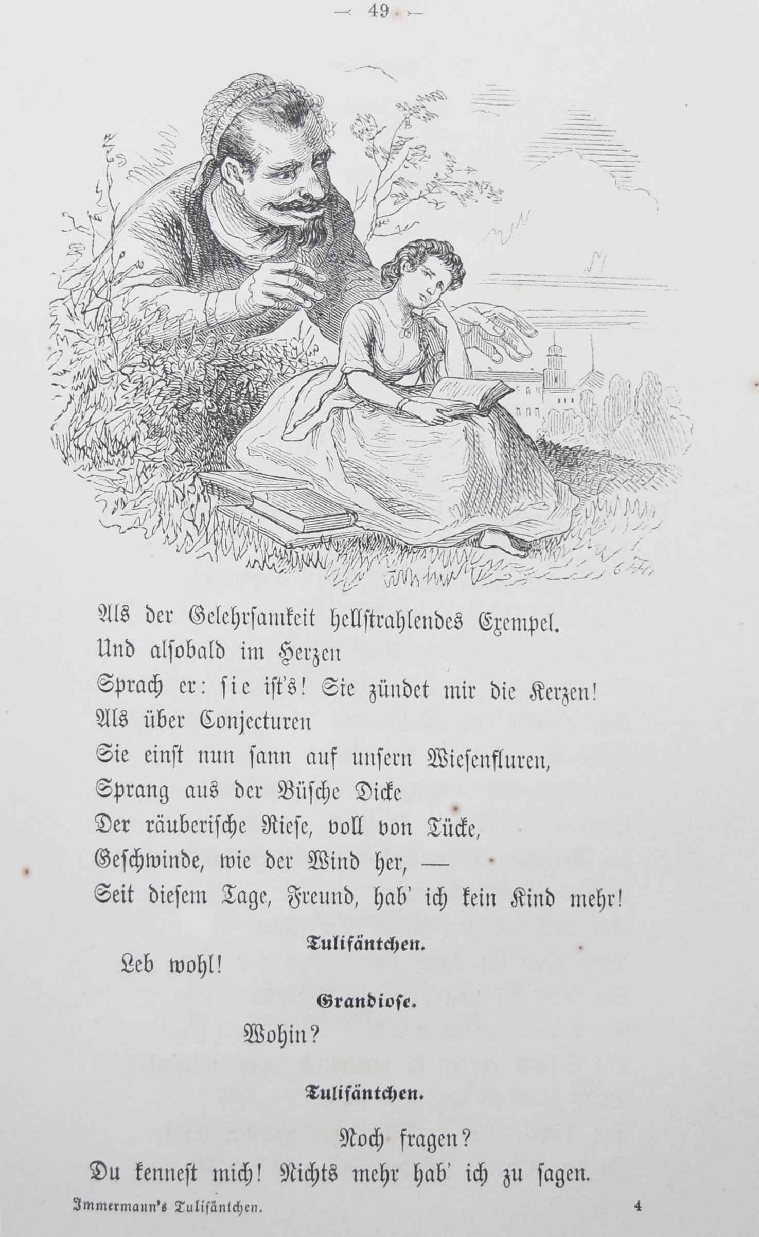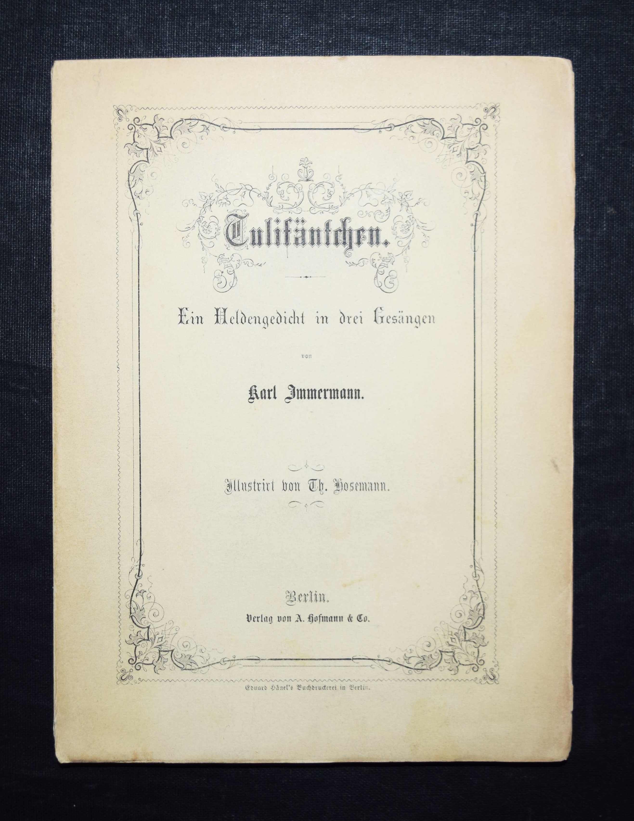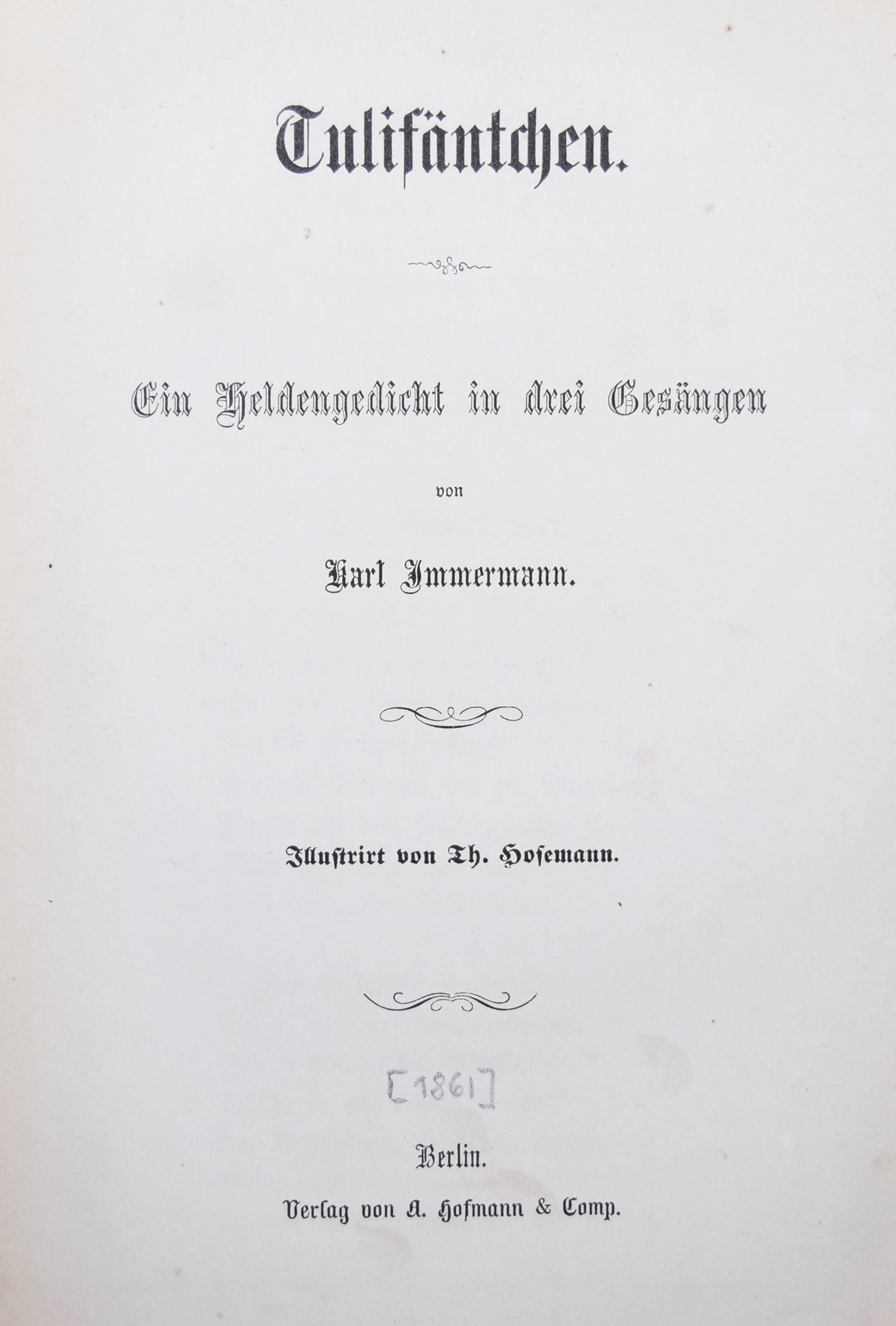Immermann, Karl (Leberecht). Tulifäntchen. Ein Heldengedicht in drei Gesängen. Illustriert von Th(eodor) Hosemann. Berlin, Hofmann & Comp. o. J. (1861). 8°. 135 S. mit 26 Holzschnitt-Illustrationen. Typogr. OKart. Brieger 291. LKJ II, 5. Goed. VIII, 615, 57. Rümann, Illustr. Bücher 880. – Erste illustrierte Ausgabe. – „Immermann empfindet seine Zeit als epigonal, zerissen und als Zeitalter des Übergangs. In diesem Bezug steht auch das satirisch-parodistische Kleinepos vom Tulifäntchen. Tulifäntchen, ein däumlingsgroßer Held, ist Repräsentant der Restaurationszeit, der Zeit der großen Taten kleiner Leute. Diese auch formal gelungene Parodie eines Großepos kann auch unabhängig von ihrer satirischen Zielsetzung als komisches Kunstmärchen gelesen werden. Als Kinderbuch erfreute sich die Ausgabe von 1861 großer Beliebtheit, vor allem wegen der einfühlsamen, dramatisch-komischen Illustrationen von Th. Hosemann“ (M. L. Linn in LKJ). – Umschlag und Blattränder etwas angestaubt, Gelenke geringf. angeplatzt, gutes Exemplar.