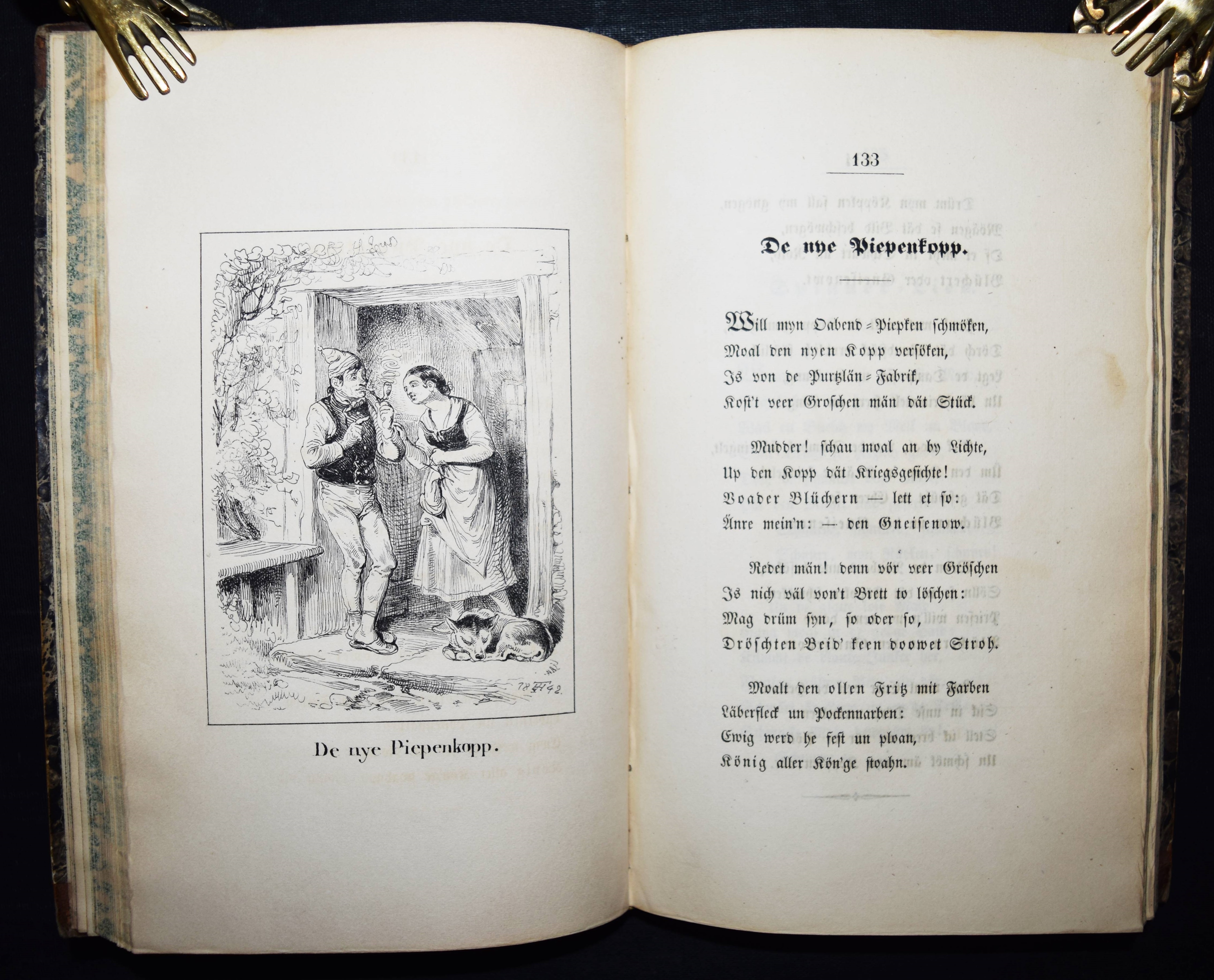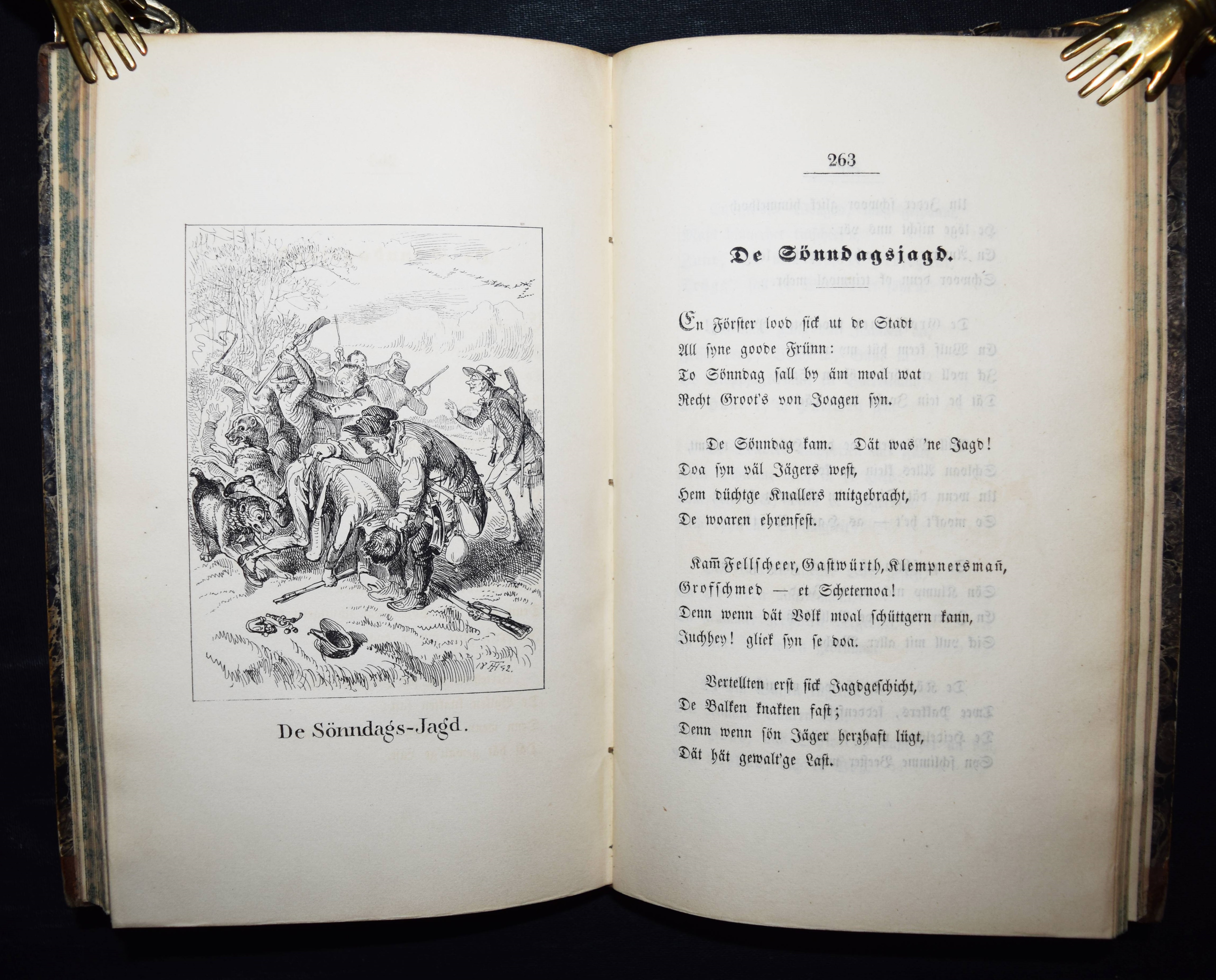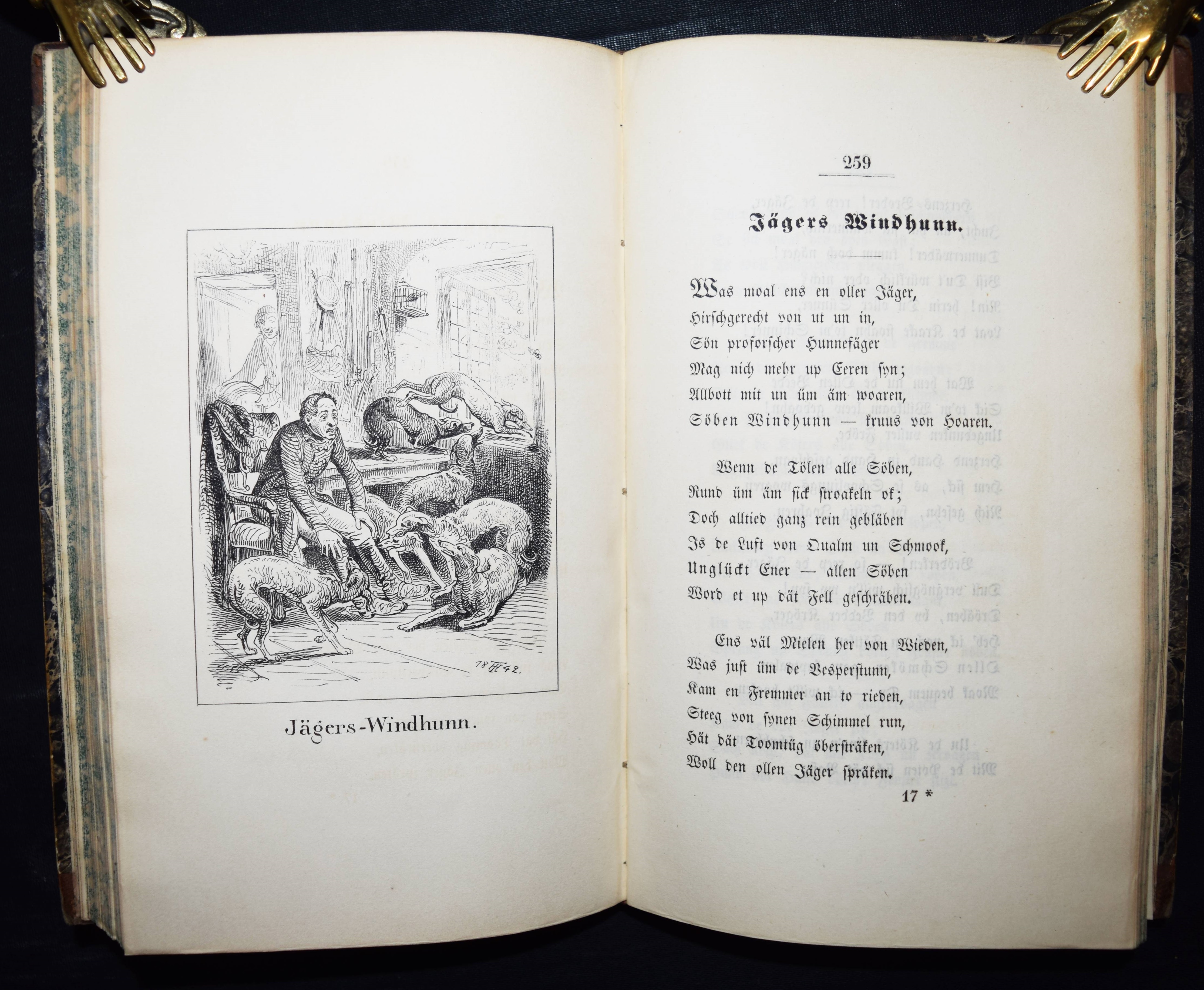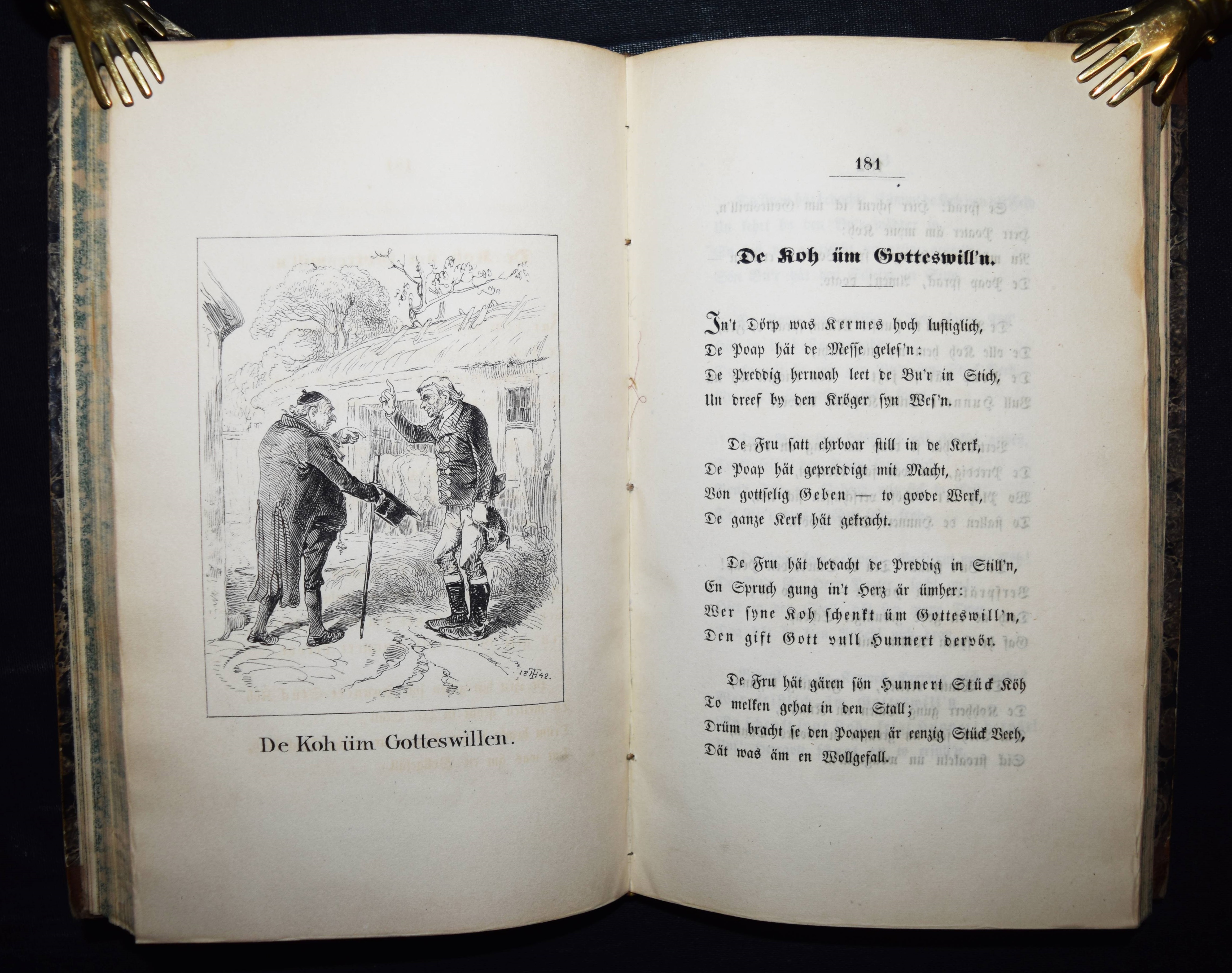 Bornemann, (Johann) Wilhelm (Jacob). Gedichte in plattdeutscher Mundart. Mit humoristischen Feder-Zeichnungen von T(heodor) Hosemann. 5. von Neuem gesichtete und vermehrte Ausgabe letzter Hand. Berlin, Decker 1843. 8°. XII, 356 S. mit Porträt u. 13 ganzs. lithogr. Illustrationen. Hldr. d. Zt. mit goldgepr. Rückentitel u. dezenter Rückenverg. Brieger 225. Goed. VII 563, 100. Hobrecker 99. Rümann 719. – Erste von Hosemann illustr. Ausgabe. – Der ehemalige Generaldirektor der Preußischen Staatslotterie J. W. J. Bornemann (1766-1851) ist vor allem durch seine Mundartgedichte bekannt geworden von seinen hochdeutschen Versen wurde „Im Wald und auf der Heide“ zum Volkslied. – Gelenke etwas berieben, nur vereinzelt minimal fleckig, sehr gutes dekorativ gebundenes Exemplar.