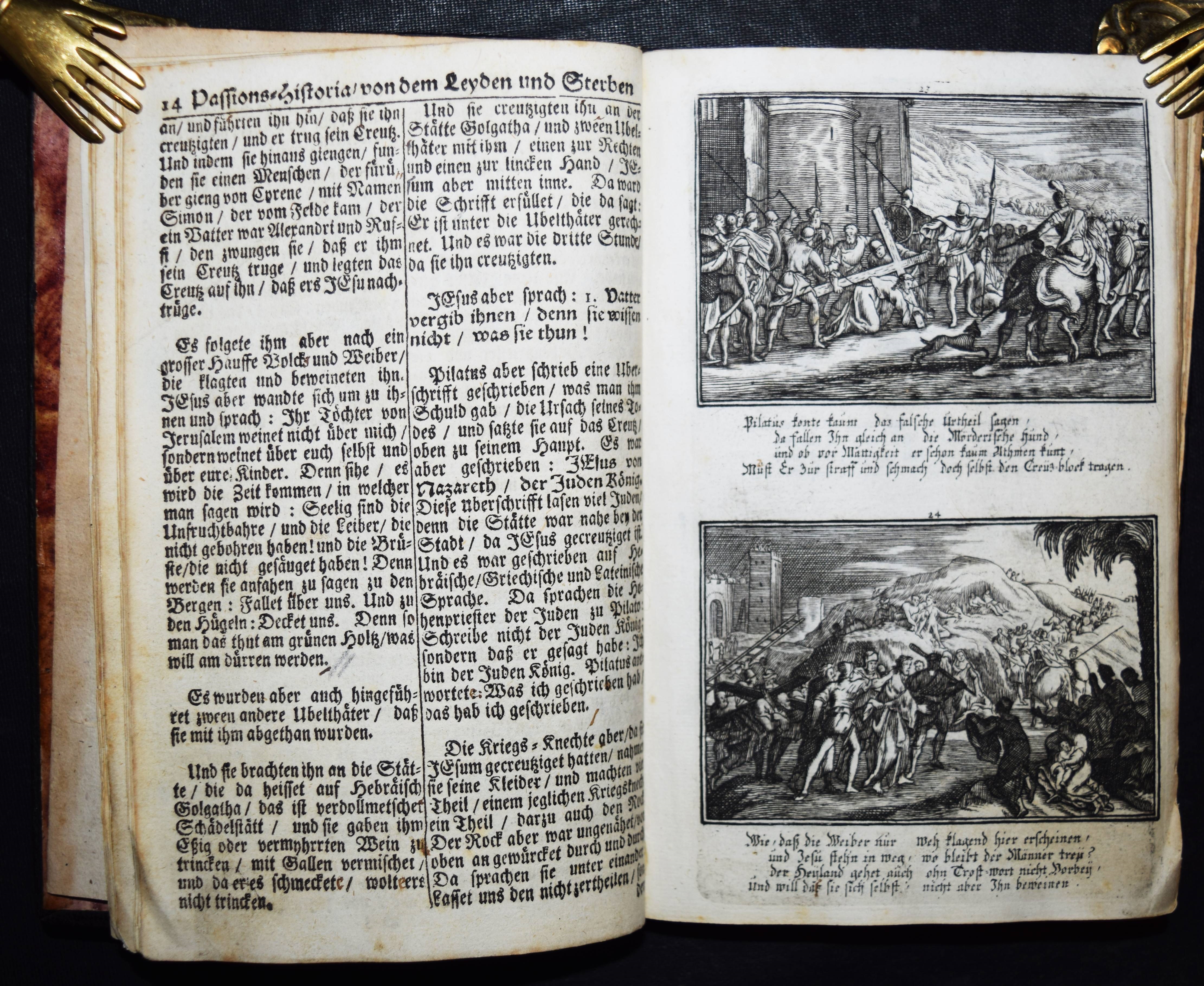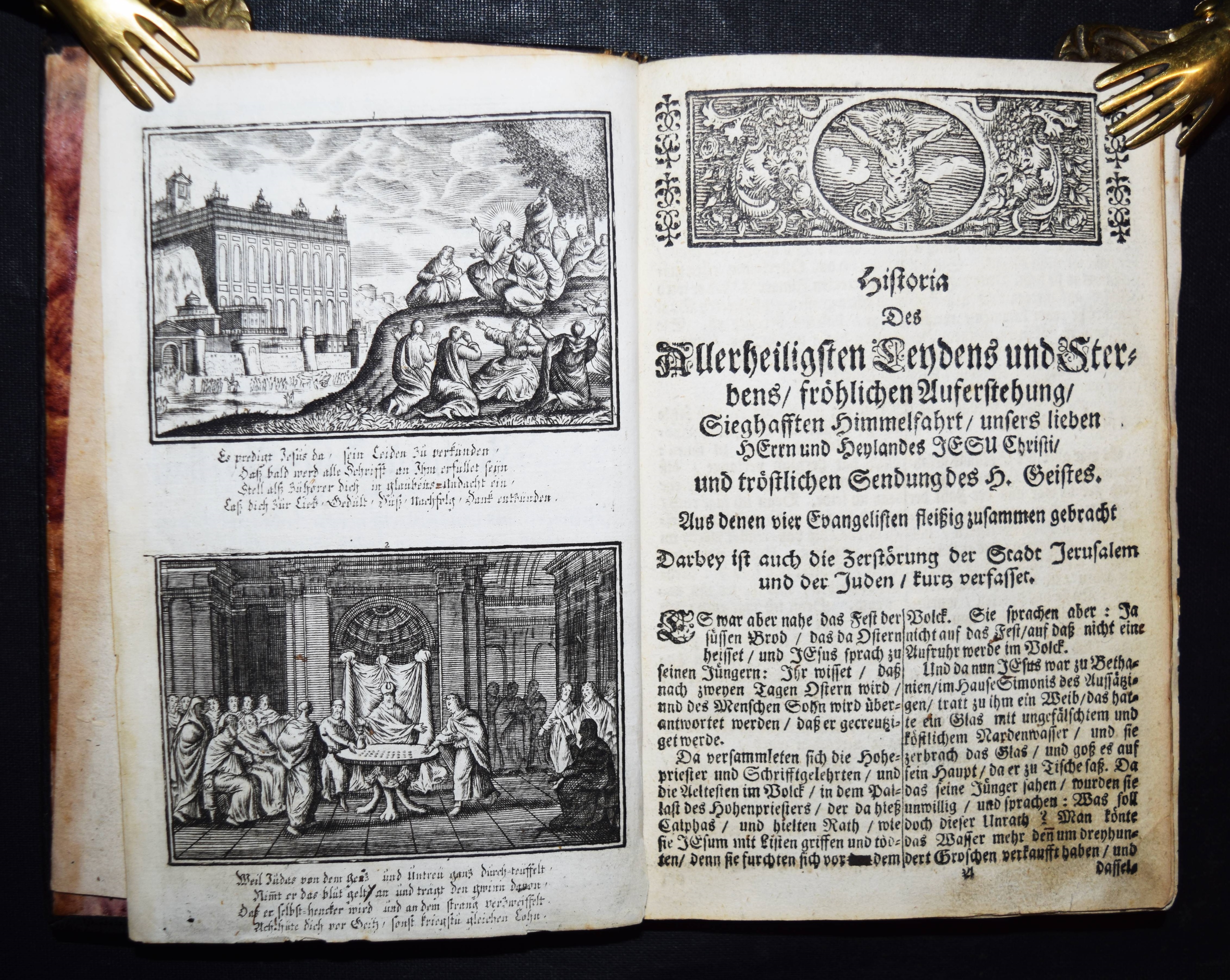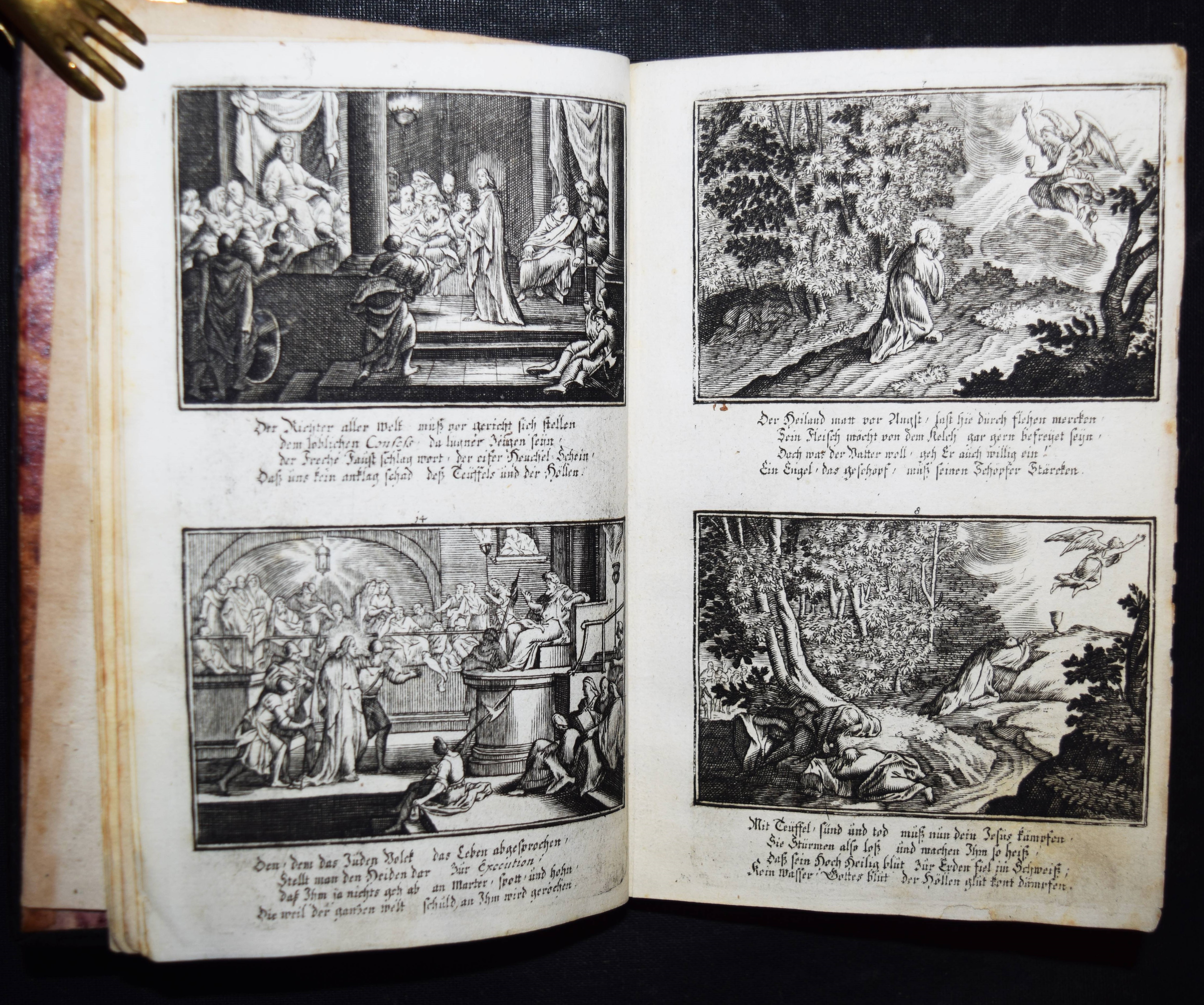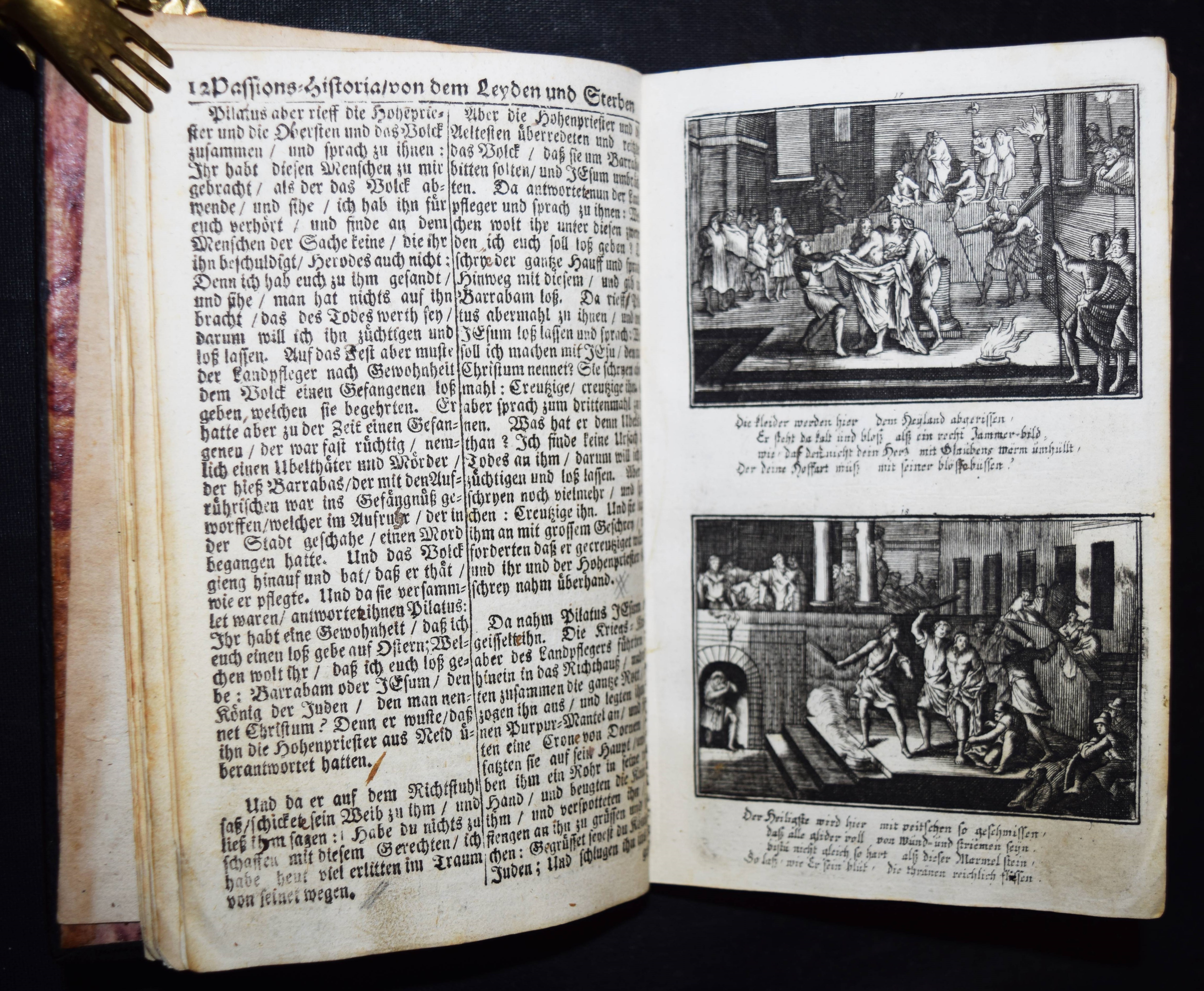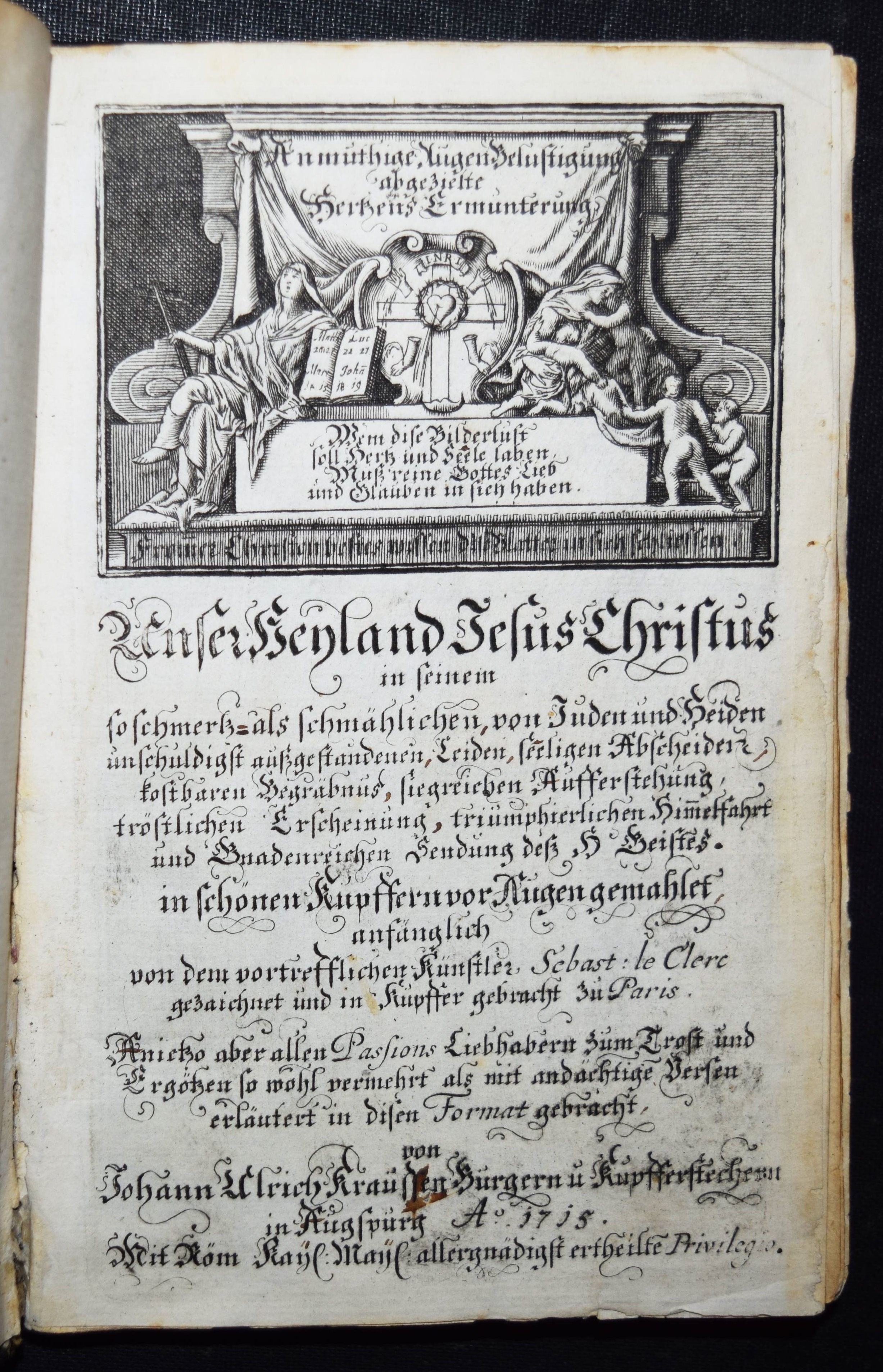 Krauß, Johann Ulrich. Anmuthige Augen Belustigung, abgezielte Hertzens Ermunterung. Unser Heyland Jesus Christus in seinem so schmertz als schmählichen von Juden und Heiden unschuldigst außgestandenen Leiden… In schönen Kupffern vor Augen gemahlet. Anfänglich von Sebast(ien) le Clerc gezaichnet und in Kupffer gebracht zu Paris. Anietzo aber … so wohl vermehrt als mit andächtige Versen erläutert in disen Format gebracht. Augsburg, Krauß 1715. 8°. 36 S. mit gestoch. illustr. Titel u. 40 Illustrationen auf 20 Kupfertafeln. Lederband der Zeit über Holzdeckeln mit goldgepr. Monogramm u. Jahreszahl (″1729“) auf dem Vorderdeckel u. Goldschnitt. Faber du Faur 1851. GV 80, 243. Vgl. Hollstein XIX, 148, 771-810 (Ausg. 1705). – Sehr seltener Barock-Katechismus. – Die Tafeln zeigen jeweils zwei Szenen aus dem Leben Jesu, versehen mit je vierzeiligen Sprüchen, alles in Kupferstich. – Heftung stellenweise etwas gelockert, stellenweise etwas fingerfleckig, gutes Exemplar.