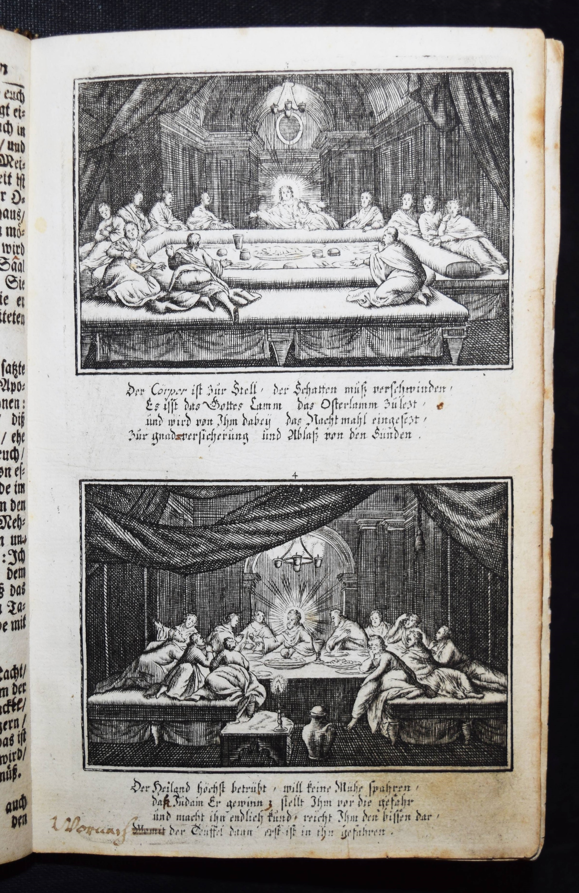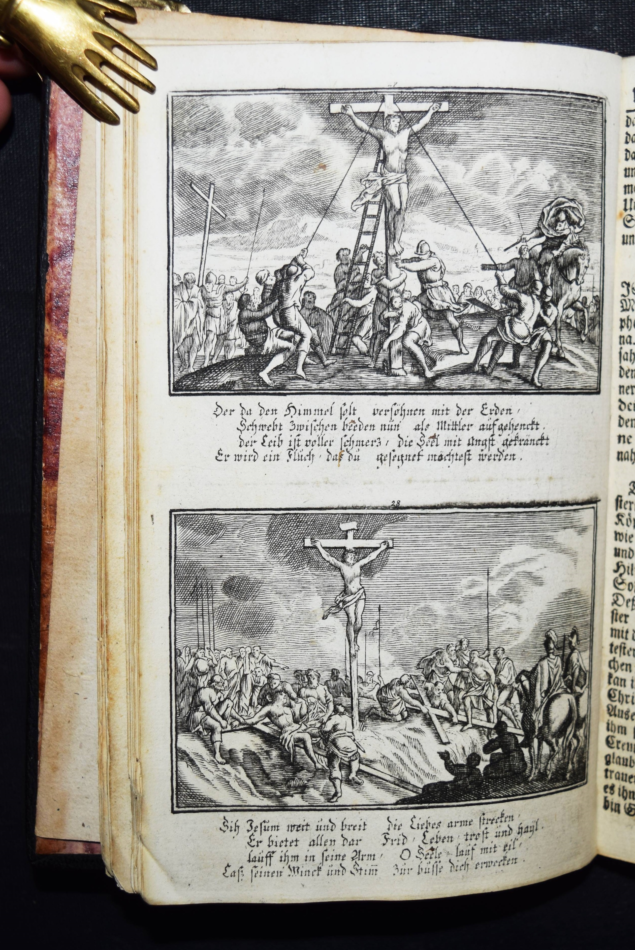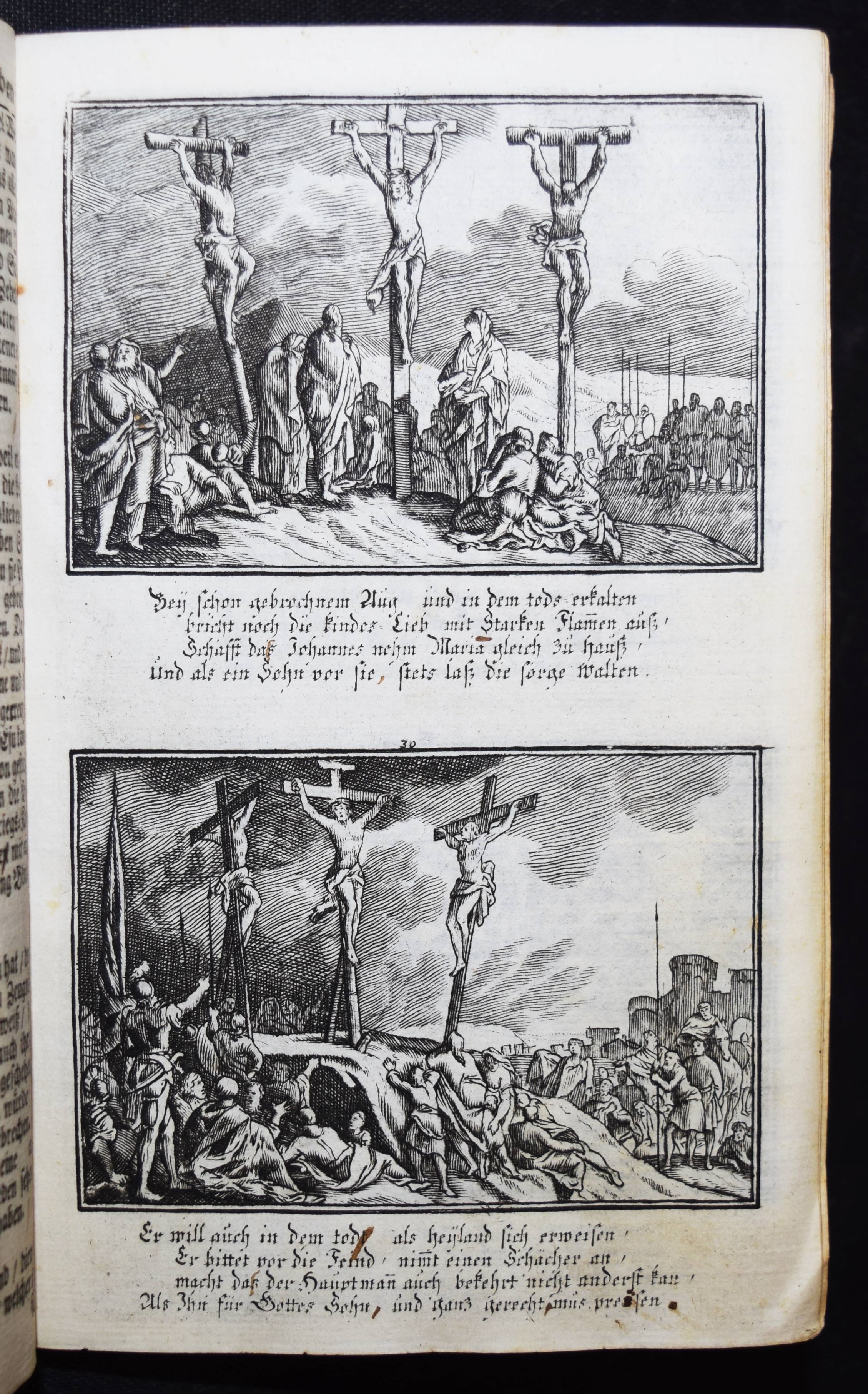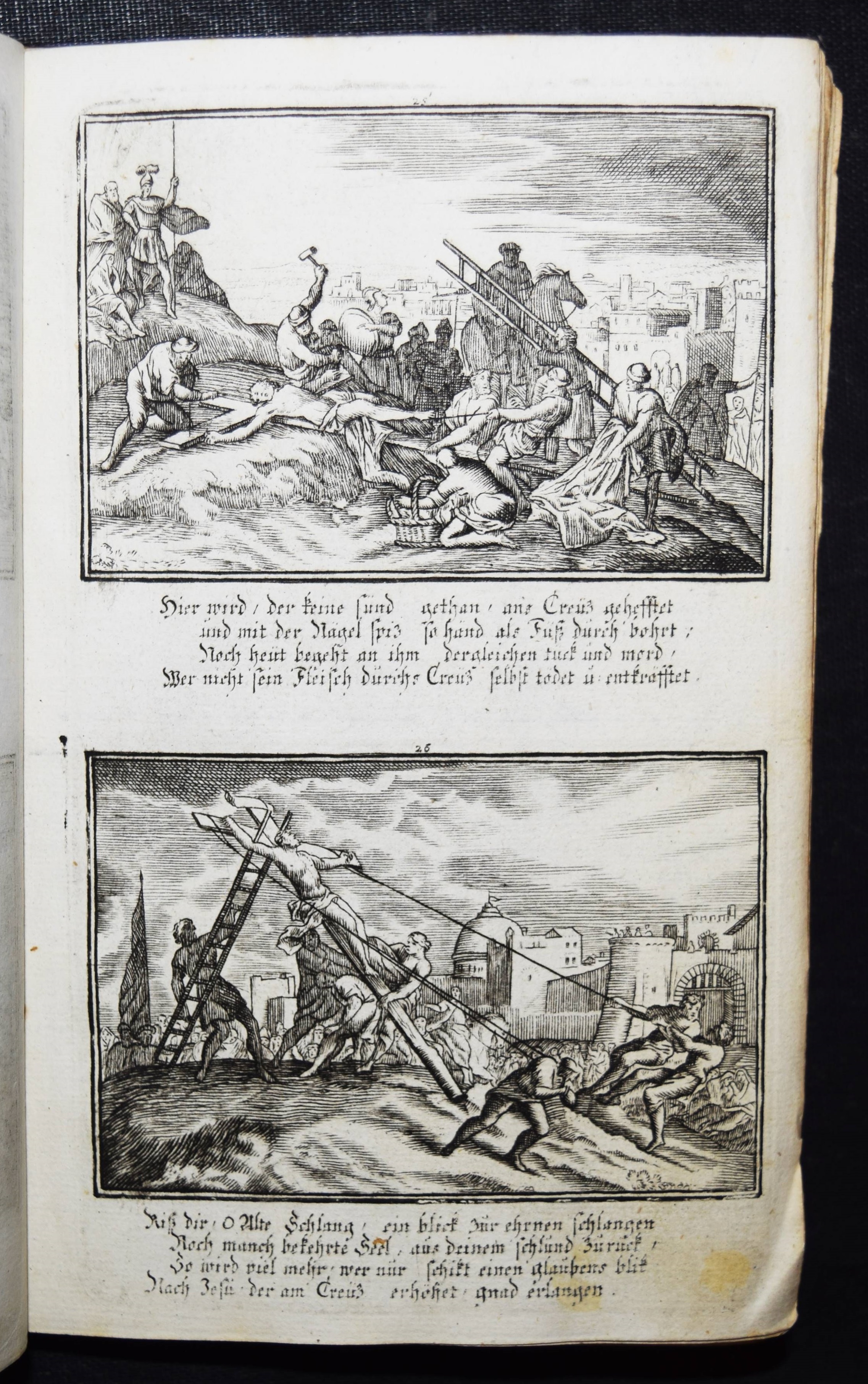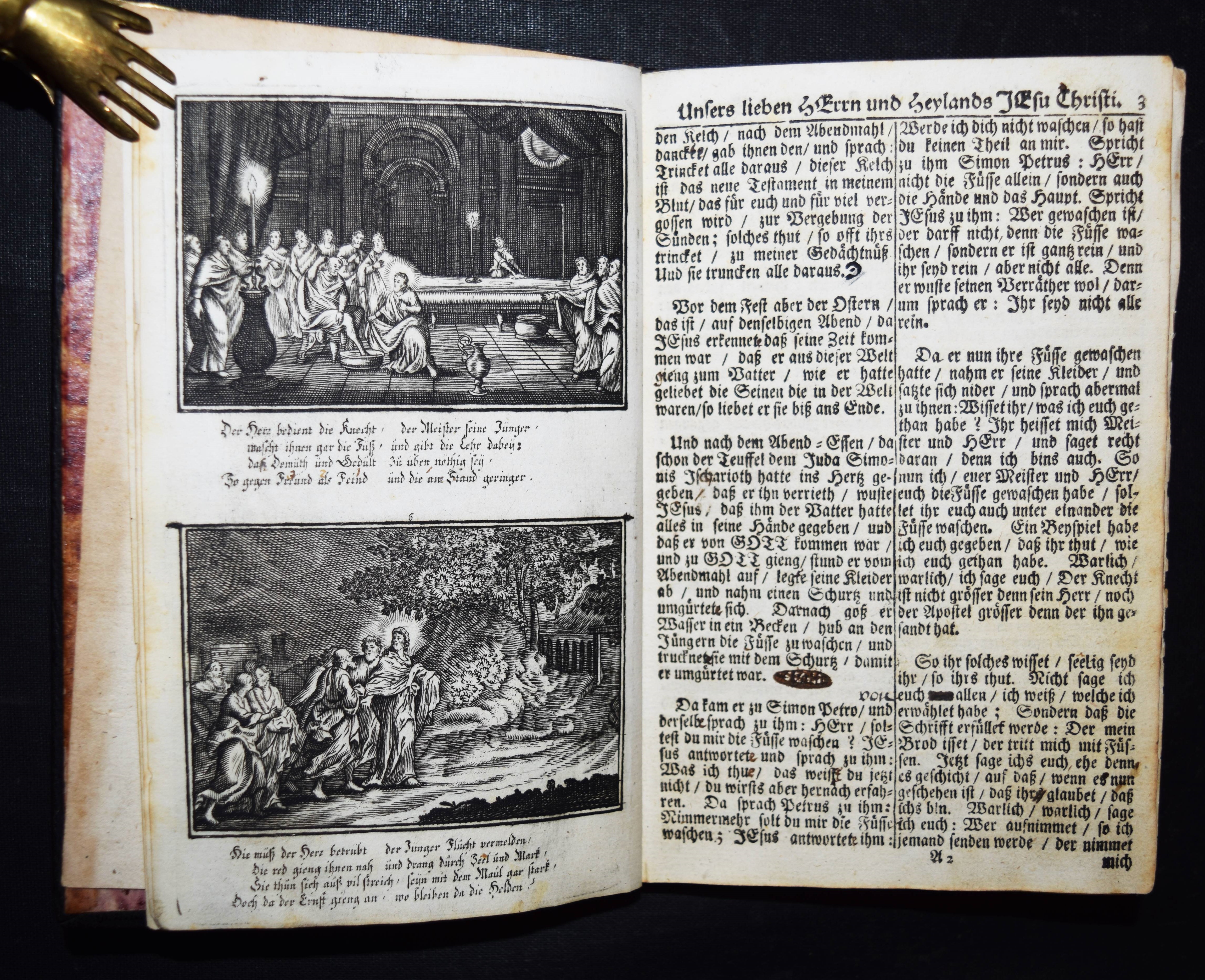 Krauß, Johann Ulrich. Anmuthige Augen Belustigung, abgezielte Hertzens Ermunterung. Unser Heyland Jesus Christus in seinem so schmertz als schmählichen von Juden und Heiden unschuldigst außgestandenen Leiden… In schönen Kupffern vor Augen gemahlet. Anfänglich von Sebast(ien) le Clerc gezaichnet und in Kupffer gebracht zu Paris. Anietzo aber … so wohl vermehrt als mit andächtige Versen erläutert in disen Format gebracht. Augsburg, Krauß 1715. 8°. 36 S. mit gestoch. illustr. Titel u. 40 Illustrationen auf 20 Kupfertafeln. Lederband der Zeit über Holzdeckeln mit goldgepr. Monogramm u. Jahreszahl (″1729“) auf dem Vorderdeckel u. Goldschnitt. Faber du Faur 1851. GV 80, 243. Vgl. Hollstein XIX, 148, 771-810 (Ausg. 1705). – Sehr seltener Barock-Katechismus. – Die Tafeln zeigen jeweils zwei Szenen aus dem Leben Jesu, versehen mit je vierzeiligen Sprüchen, alles in Kupferstich. – Heftung stellenweise etwas gelockert, stellenweise etwas fingerfleckig, gutes Exemplar.