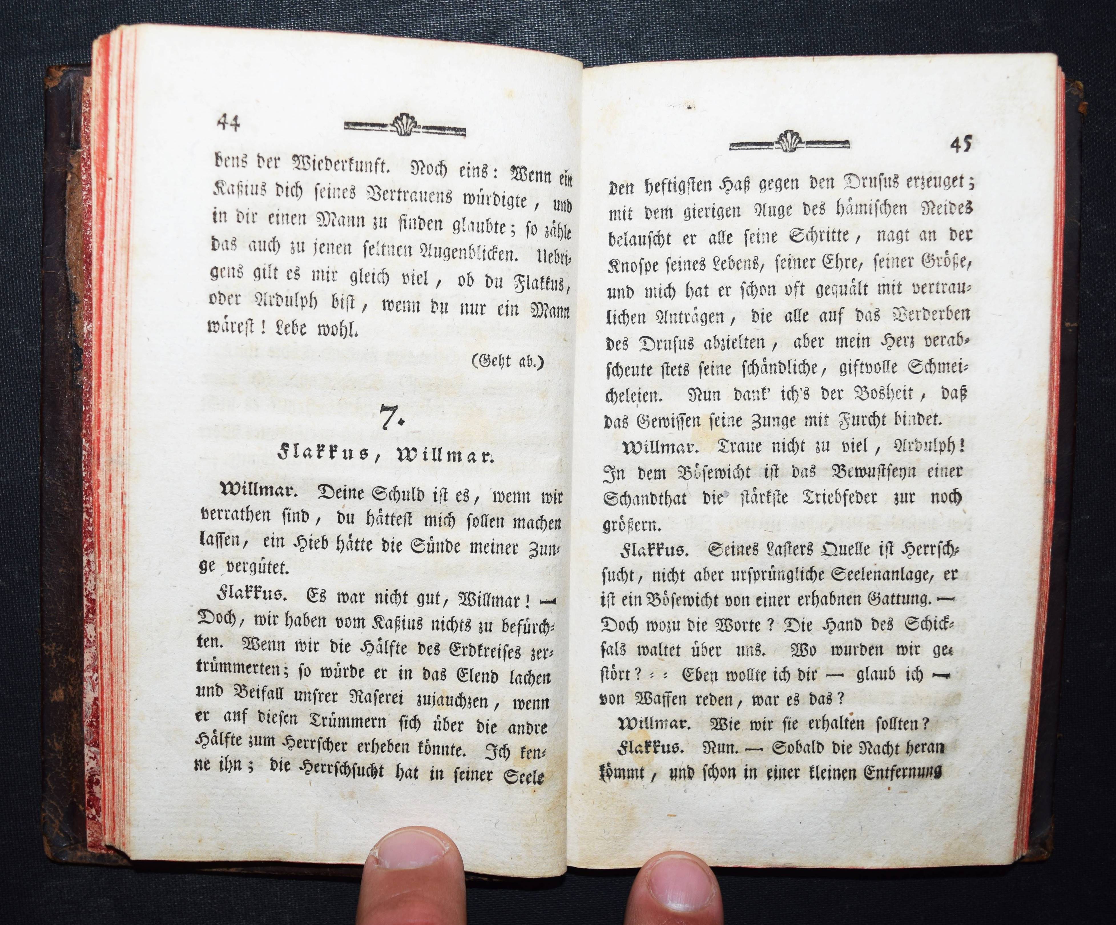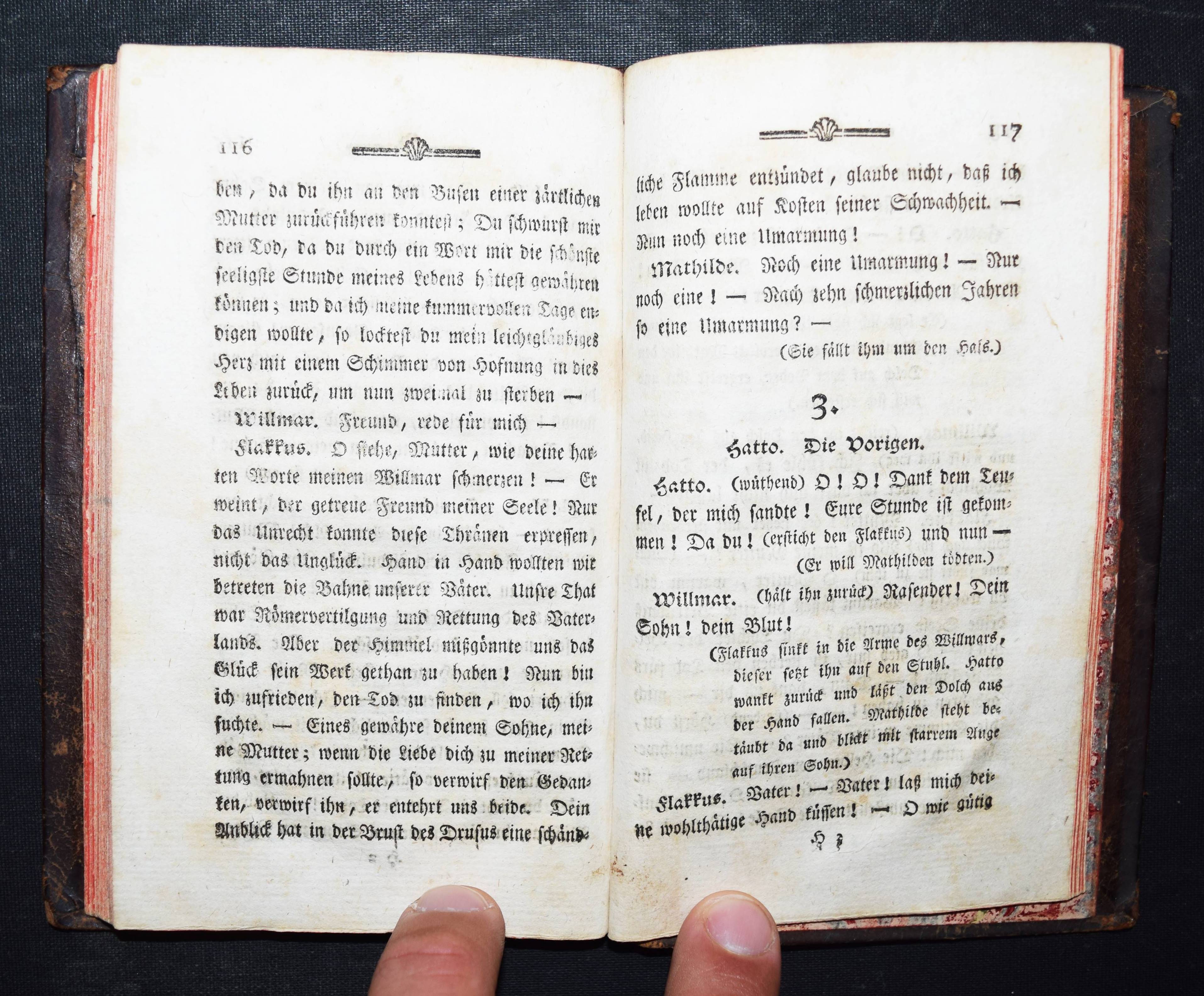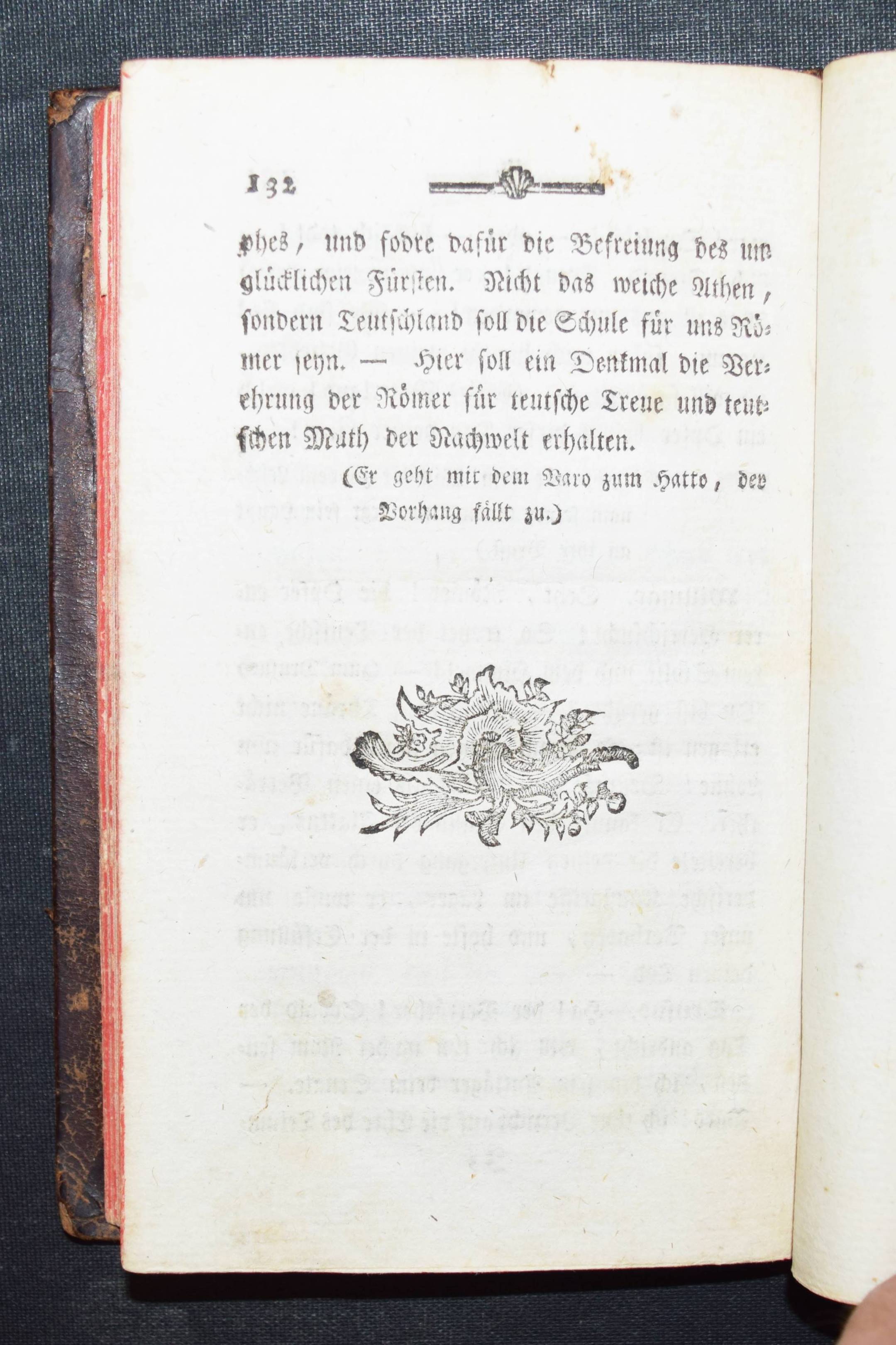 Babo, (Joseph Marius). Die Römer in Teutschland. Ein dramatisches Heldengedicht in fünf Akten. Frankenthal, Gegel 1780. Kl.-8°. Titel, 132 S. mit Titel- u. Schlußvignette in Holzschnitt. Ldr. d. Zt. mit goldgepr. Rückensch. u. floraler Rückenverg. Goed. V, 262, 4, 4. Kosch I, 203 (falsch dat. „1779“). W.-G. 7. – Erste Ausgabe. – J. M. Babo (1756-1822) „war ein erfolgreicher Dramatiker seiner Zeit; seine Stücke wurden unter Goethes Leitung am Weimarer Hoftheater aufgeführt“ (Körner/Jahn I, 83). – Einband berieben, N.a.V., gutes dekorativ gebundenes Exemplar.