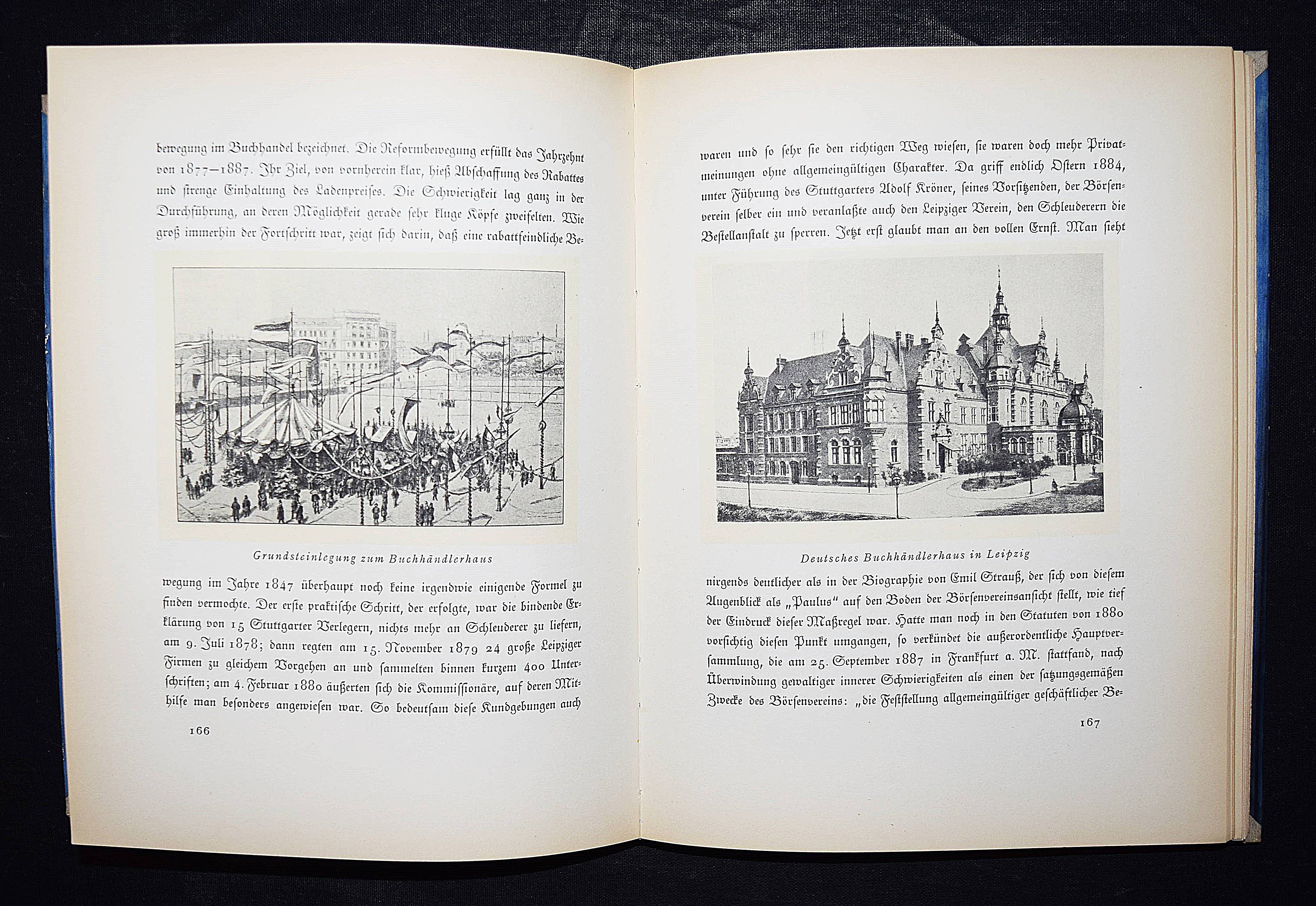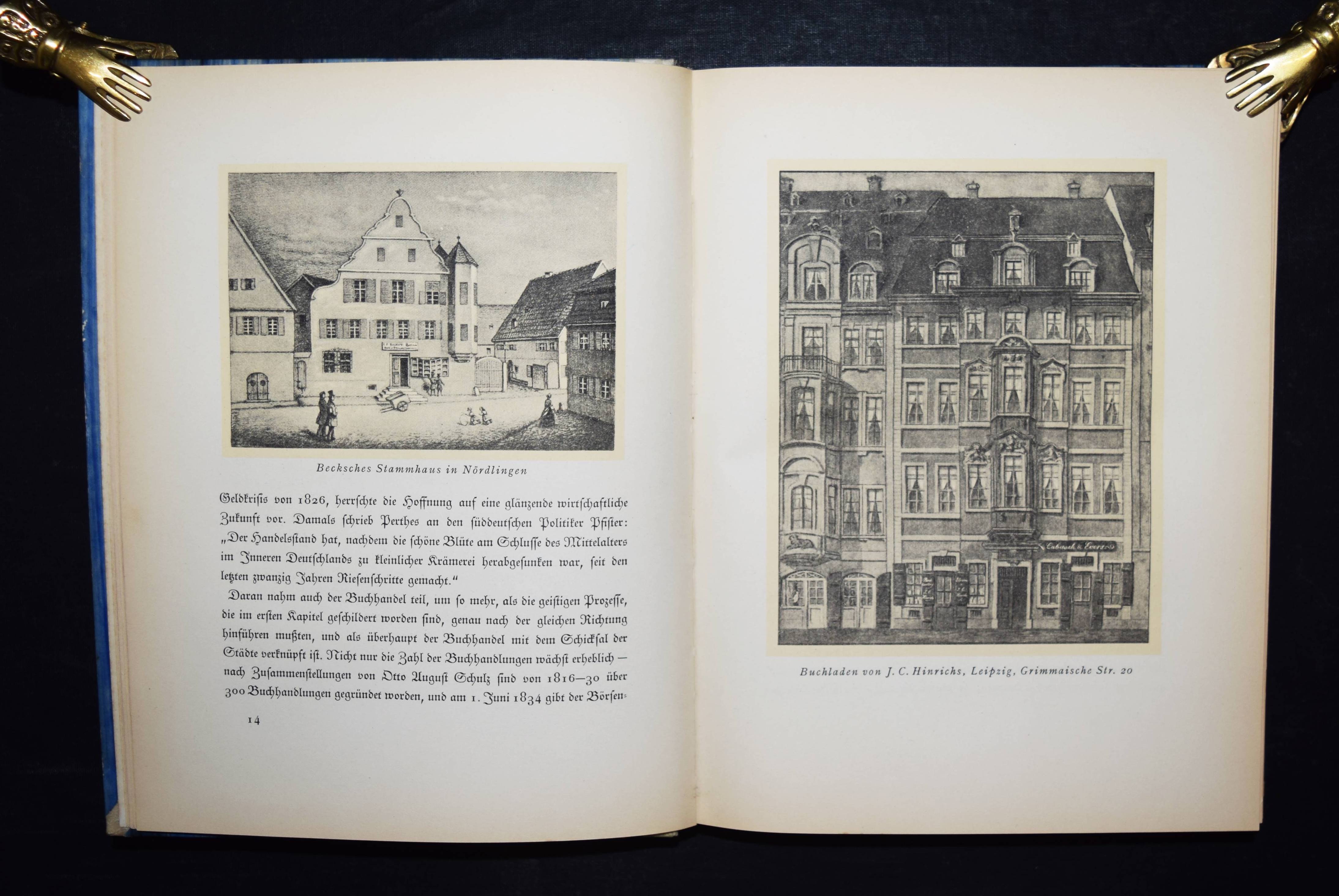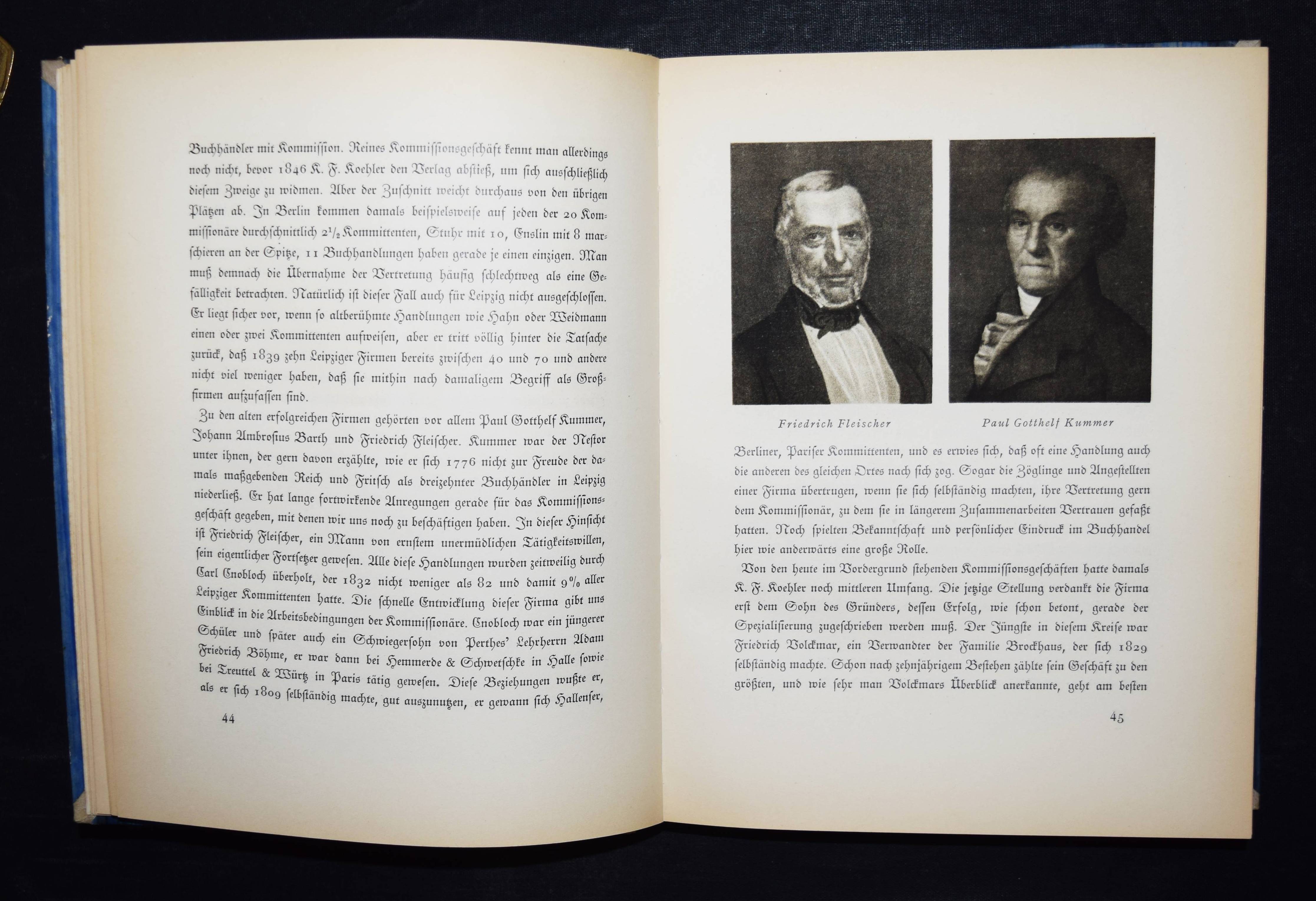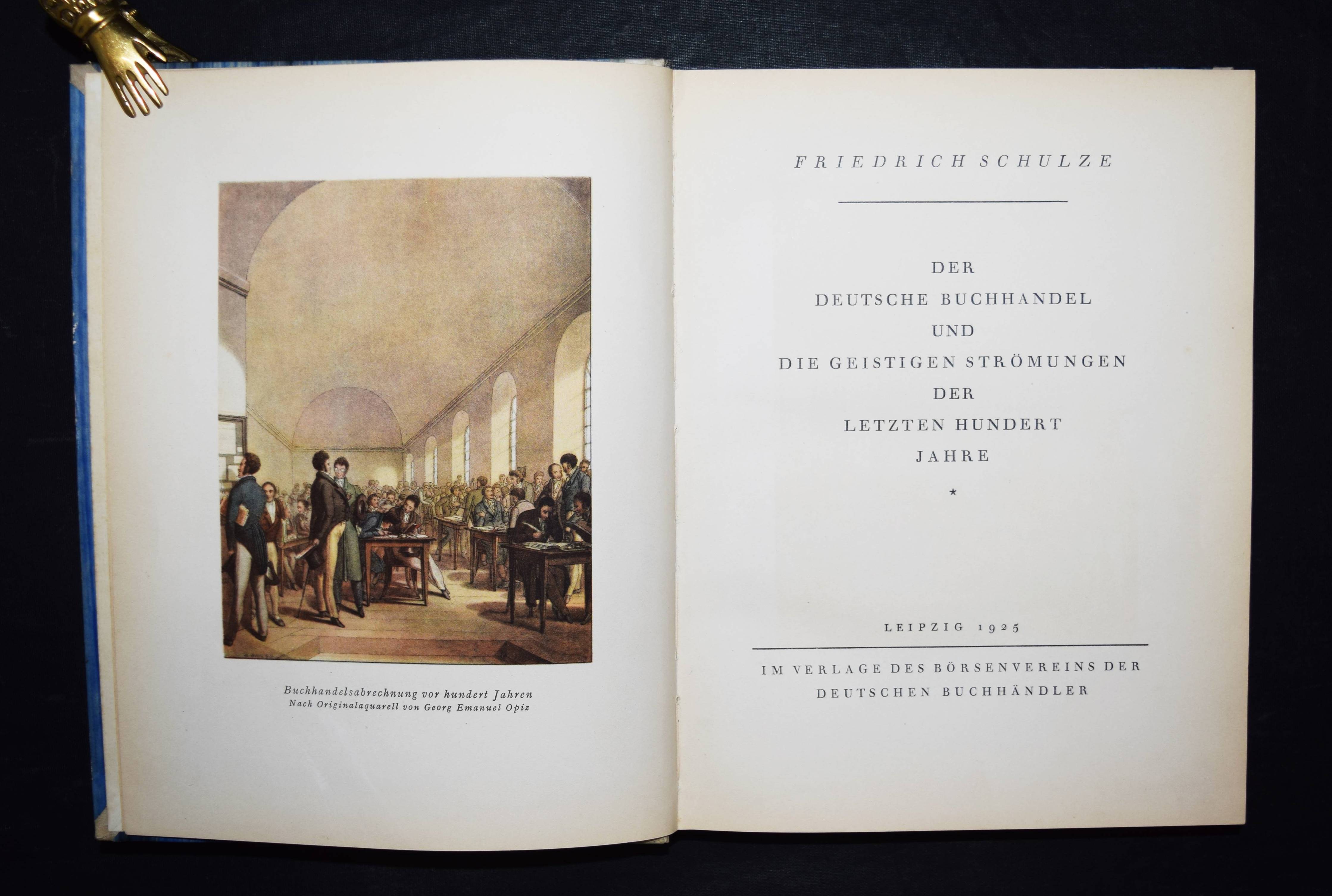 Schulze, Friedrich. Der deutsche Buchhandel und die geistigen Strömungen der letzten hundert Jahre. Leipzig, Verlag des Börsenvereins der deutschen Buchhändler 1925. Gr.-8°. III, 295 S. mit farb. Frontispiz, zahlr. teils farb. Abb. u. Faksimiles. OHprgt. mit goldgepr. Rückenschild u. Rückenverg. (Entwurf von Walter Tiemann). Inhalt: Der Buchhandel und die geistigen Mächte bei Anbruch des 19. Jahrhunderts. – Die Arbeit des Sortimenters. – Die Bücherzufuhr und der organisatorische Zusammenhang des deutschen Buchhandels. – Der deutsche Verleger in der ersten Hälfte des 19. Jahrhunderts. – Die Mitarbeit des Verlages an der geistigen Entwicklung des frühen 19. Jahrhunderts. – Umbildung des buchhändlerischen Vereinswesens als Ausdruck neuer Wirtschaftsziele. – Die einzelnen Buchhandels-Zweige nach der Einführung der Gewerbefreiheit. – Verlag und geistiges Leben seit 1870. – Die Beziehungen des deuschen Buchhandels zum Auslande. – Die Lage in der Kriegs- u. Nachkriegszeit. – St.a.V., gutes sauberes Exemplar.