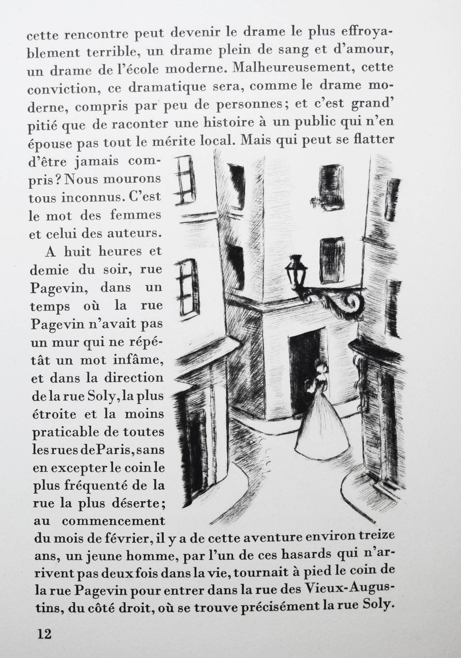 Balzac, H(onoré) de. Ferragus chef des dévorants. Pointes-sèches originales de Camille Berg. Paris, Éditions Rombaldi 1945. 8°. 188 S., [2] Bl. mit illustr. Titel u. teils ganzs. Illustrationen. Illustr. OKart. mit Japanpapierumschlag in Hln.-Chemise u. Orig.-Pappschuber. Eines von 300 num. Exemplaren auf Vélin teinté pur fil réséda (GA 419 Exemplare). – Schuber etwas gebräunt und an einer Kante angeplatzt, gutes Exemplar.