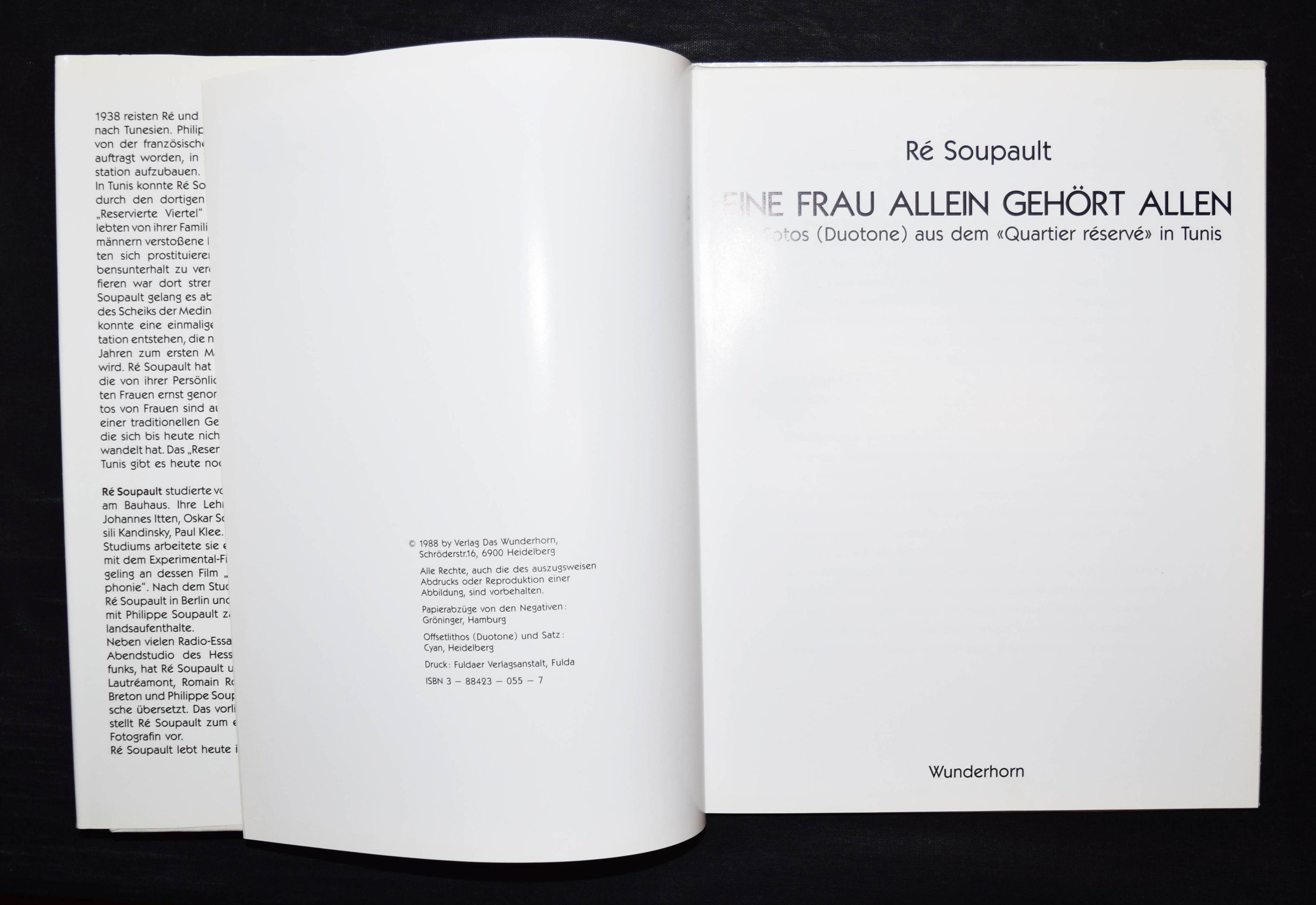 Soupault, Ré. Eine Frau allein gehört allen. 35 Fotos (Duotone) aus dem „Quartier réservé“ in Tunis. Heidelberg, Wunderhorn 1988. 4°. 12 S. u. 35 Tafeln. OPbd. mit illustr. OU. Erste Ausgabe. – Gutes Exemplar.