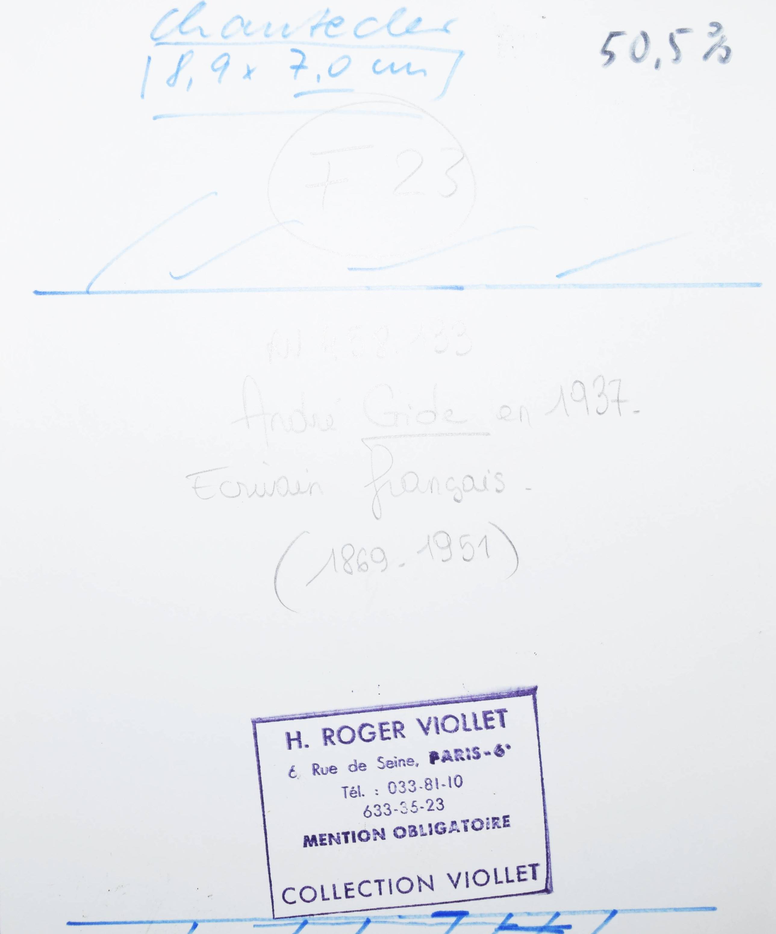 Gide, André Paul Guillaume (1869-1951, französischer Schriftsteller und Nobelpreisträger). Orig.-Portrait-Photographie (Silbergelatine) von Henri Roger Viollet (1869-1947). Paris 1937. Format: 24 x 18 cm. (Hochformat). Bekanntes Porträt des Nobelpreis-Trägers an seinem Schreibtisch. – Der bedeutende franz. Fotograf H. Roger Violett soll bereits als elfjähriger sein erstes Foto gemacht haben. Im Alter von 20 Jahren experimentierte er sich als junger Ingenieur mit fotografischen Spezialeffekten und fertigte witzige Selbstporträts an, die er „Bilokationen“ und „Trilokationen“ nannte. Nach dem Ersten Weltkrieg arbeitete er als Dokumentations- und Porträtfotograf. Die mehreren tausend Fotografien von Henri Roger Violett sowie die seines Bruders Ernest gehören bilden den Grundbestand der Pariser Agentur Roger-Viollet. – Rückseitig mit Stempel der Foto-Agentur (″Collection Violett“), vintage.