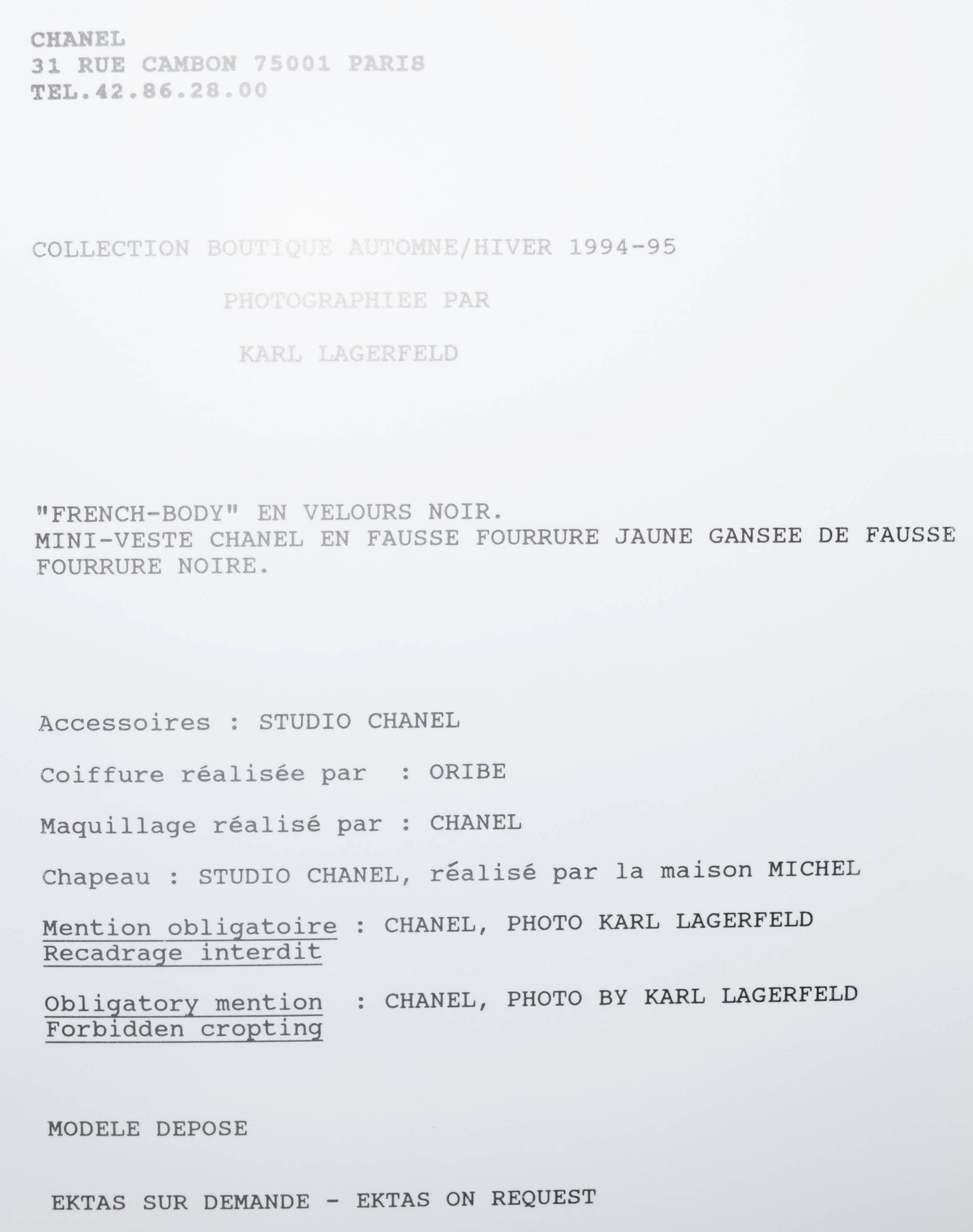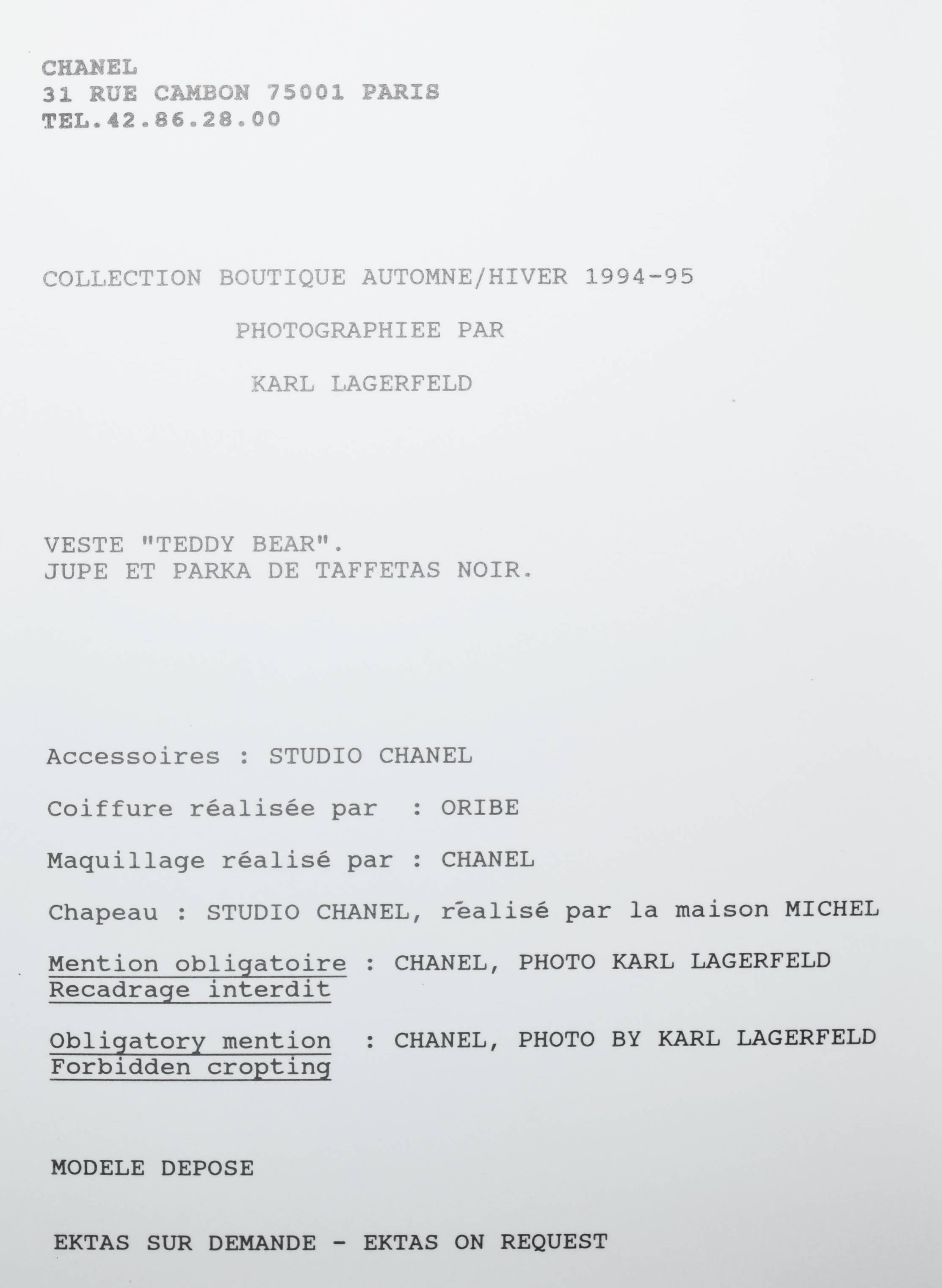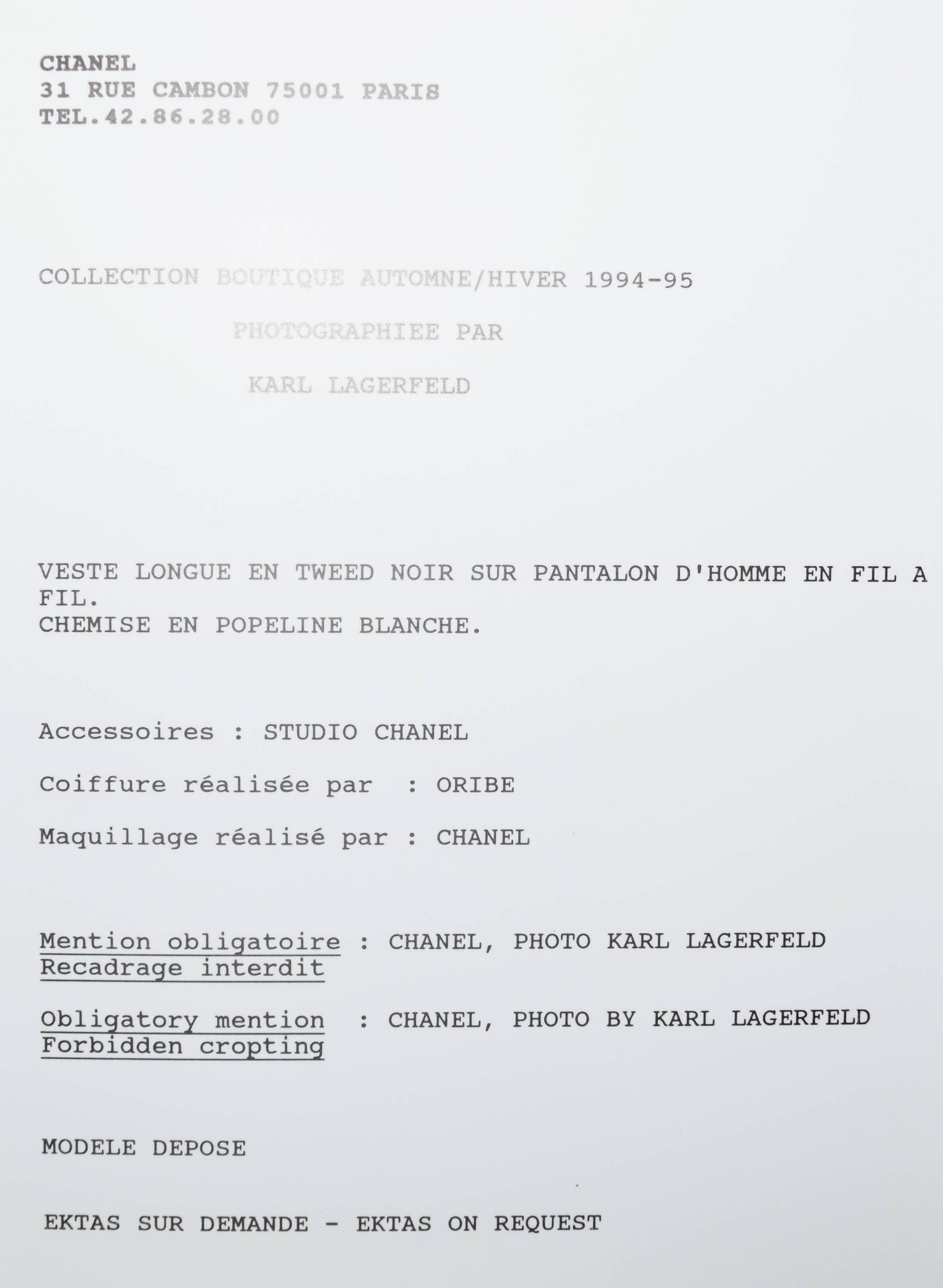 Lagerfeld, Karl (1933-2019, deutscher Modeschöpfer, Designer, Fotograf und Kostümbildner). 5 Orig.-Photographien zur Chanel-Kollektion Herbst/Winter 1994/95 u. Orig.-Portrait-Photographie. Paris, Chanel 1994. Jeweils 24 x 17,5 cm. Portrait 17,5 x 12,5 cm. Fünf von Karl Lagerfeld (1933-2019) kreierte und photographierte Ensembles, die den etwas trotzigen modischen Geist der neunziger Jahre perfekt einfangen. – Verso mit gedrucktem Impressum von Chanel in der Rue Cambon, der Kollektionsbezeichnung, den Namen des Fotografen, einer Materialbeschreibung und den Beteiligten an der Fotoproduktion (wie dem legendären Hairstylisten Oribe Canales) sowie den Bildrechten. – Ecken teils minimal bestoßen, sonst tadellos. – Beiliegt ein Schwarzweiß-Porträt des Designers aus den frühen neunziger Jahren. – 5 original press photos shot by Lagerfeld for Chanel fall/winter 1994/95. – On the back with the imprint with Chanel’s Rue Cambon address, the credits (including the legendary hair-stylist Oribe Canales), and instructions concerning copyrights and reprints. – Some corners minimally bumped, otherwise in pristine condition. – Enclosed is a black and white portrait of the designer from the early 90s.