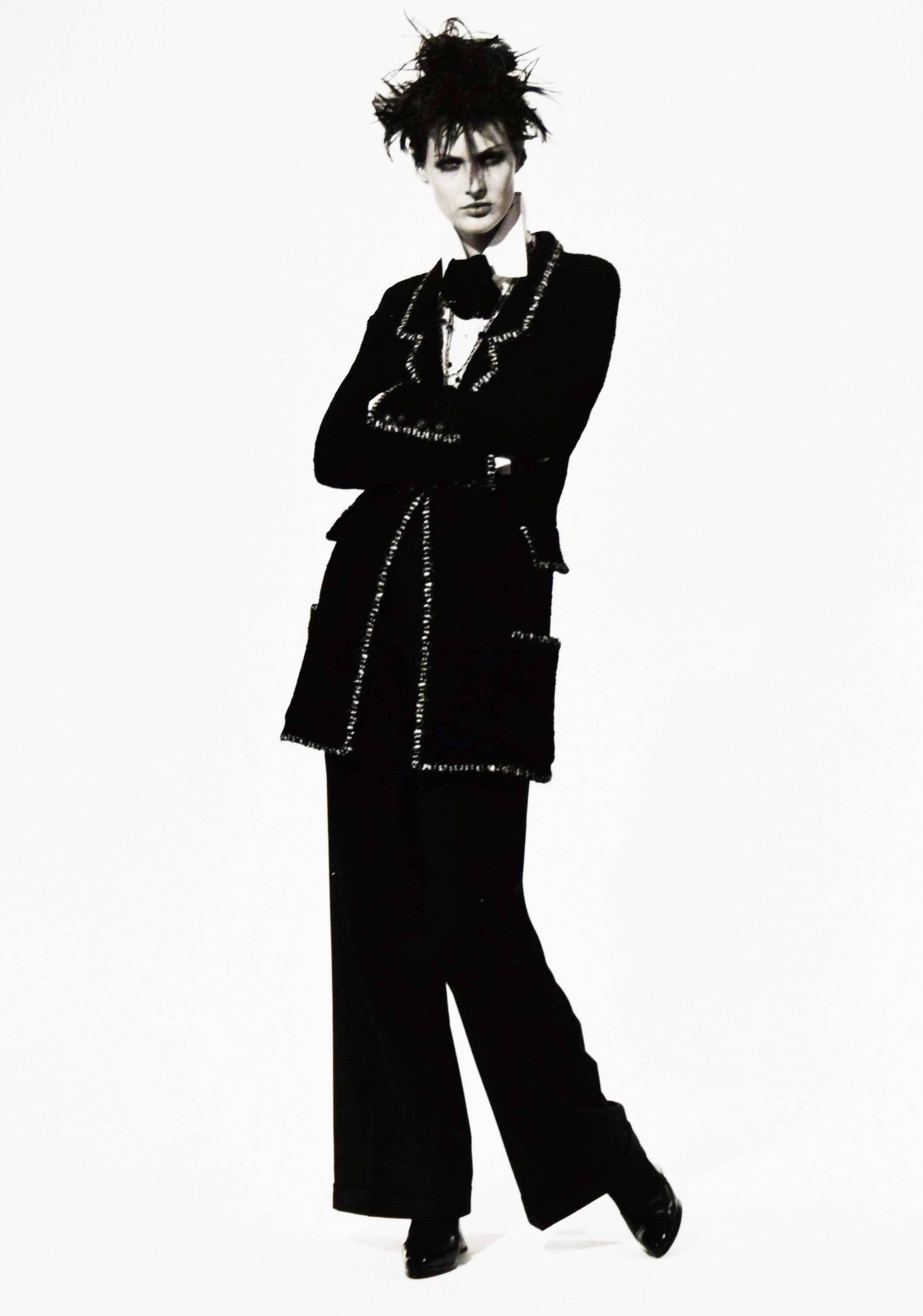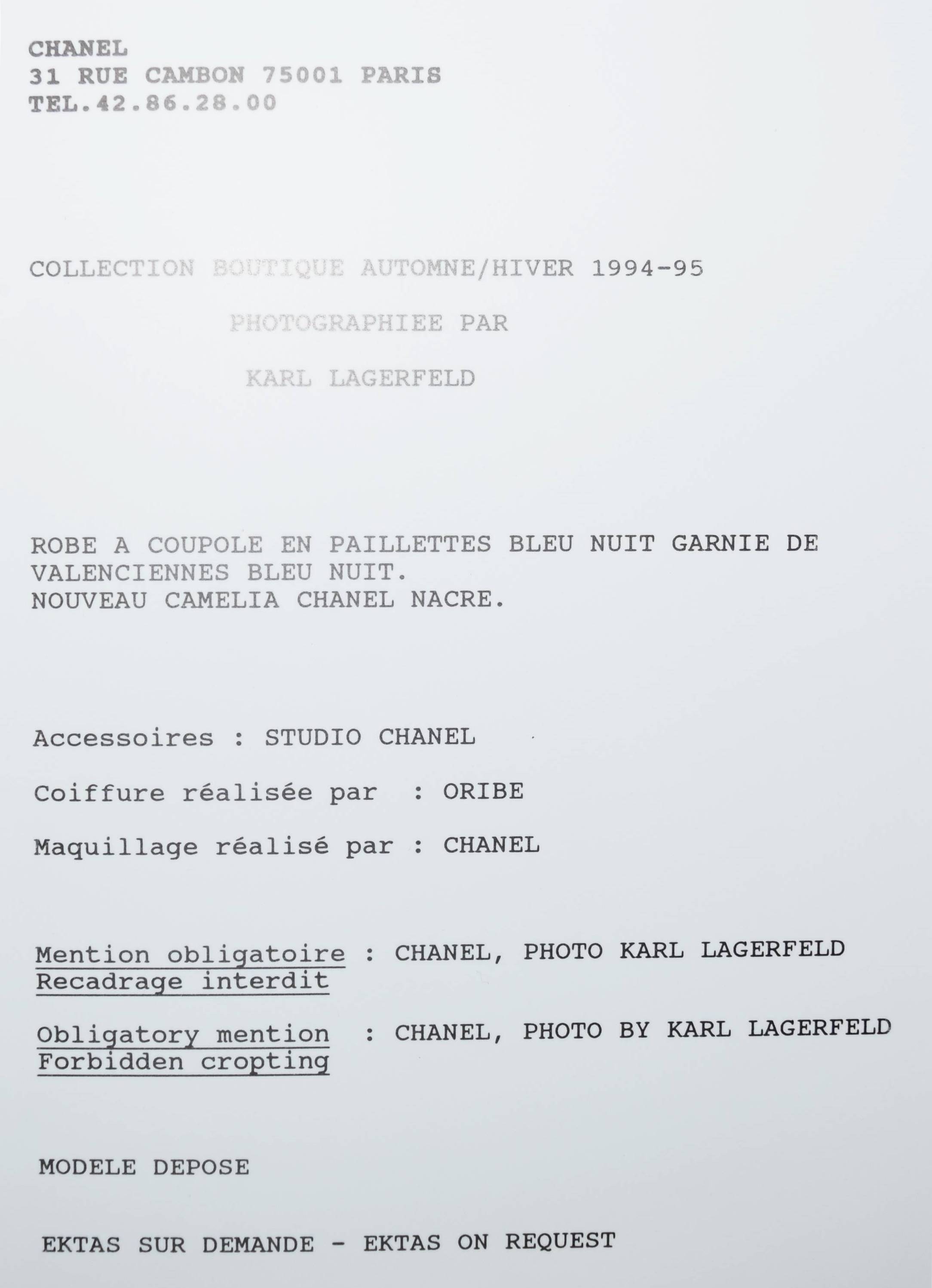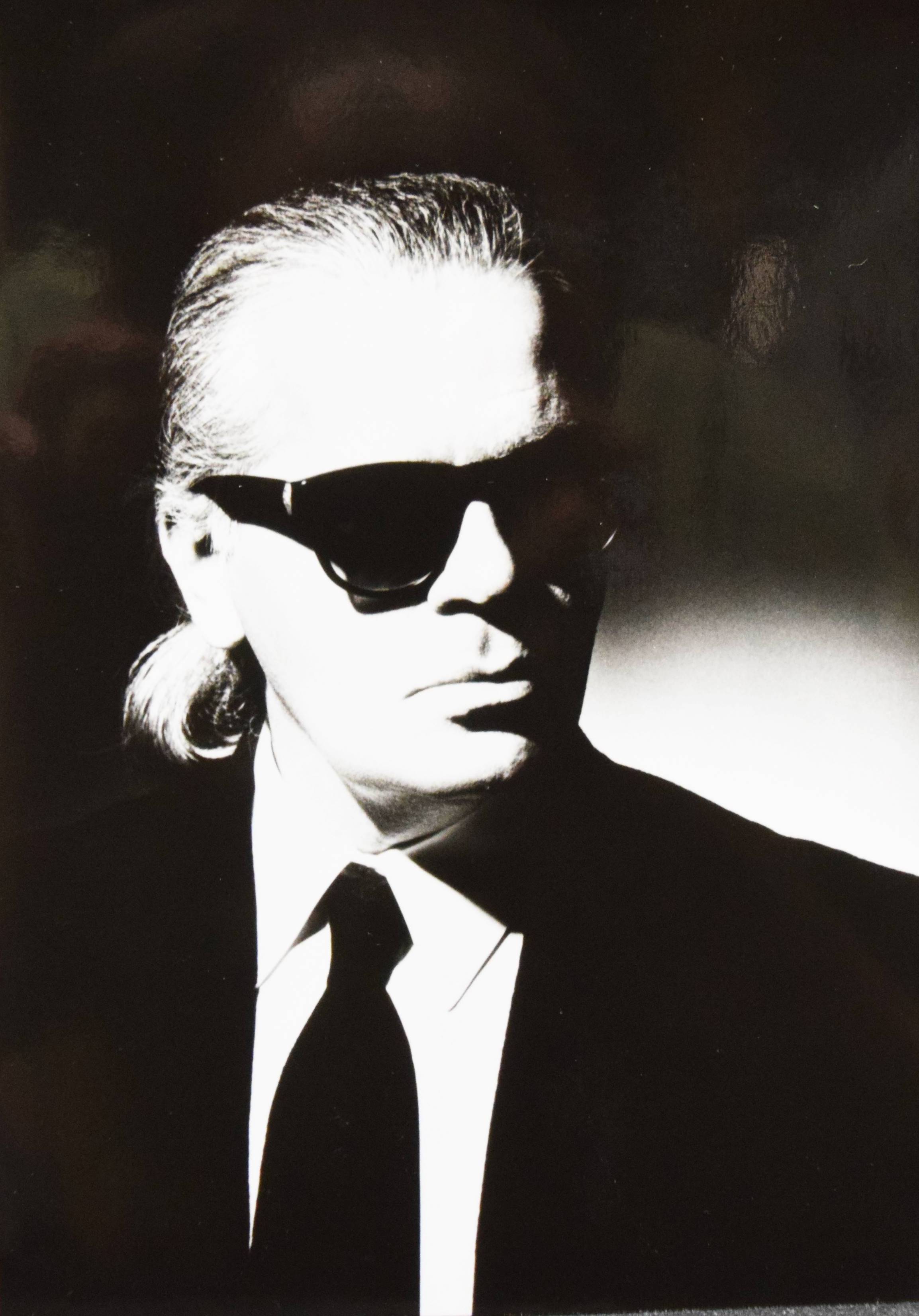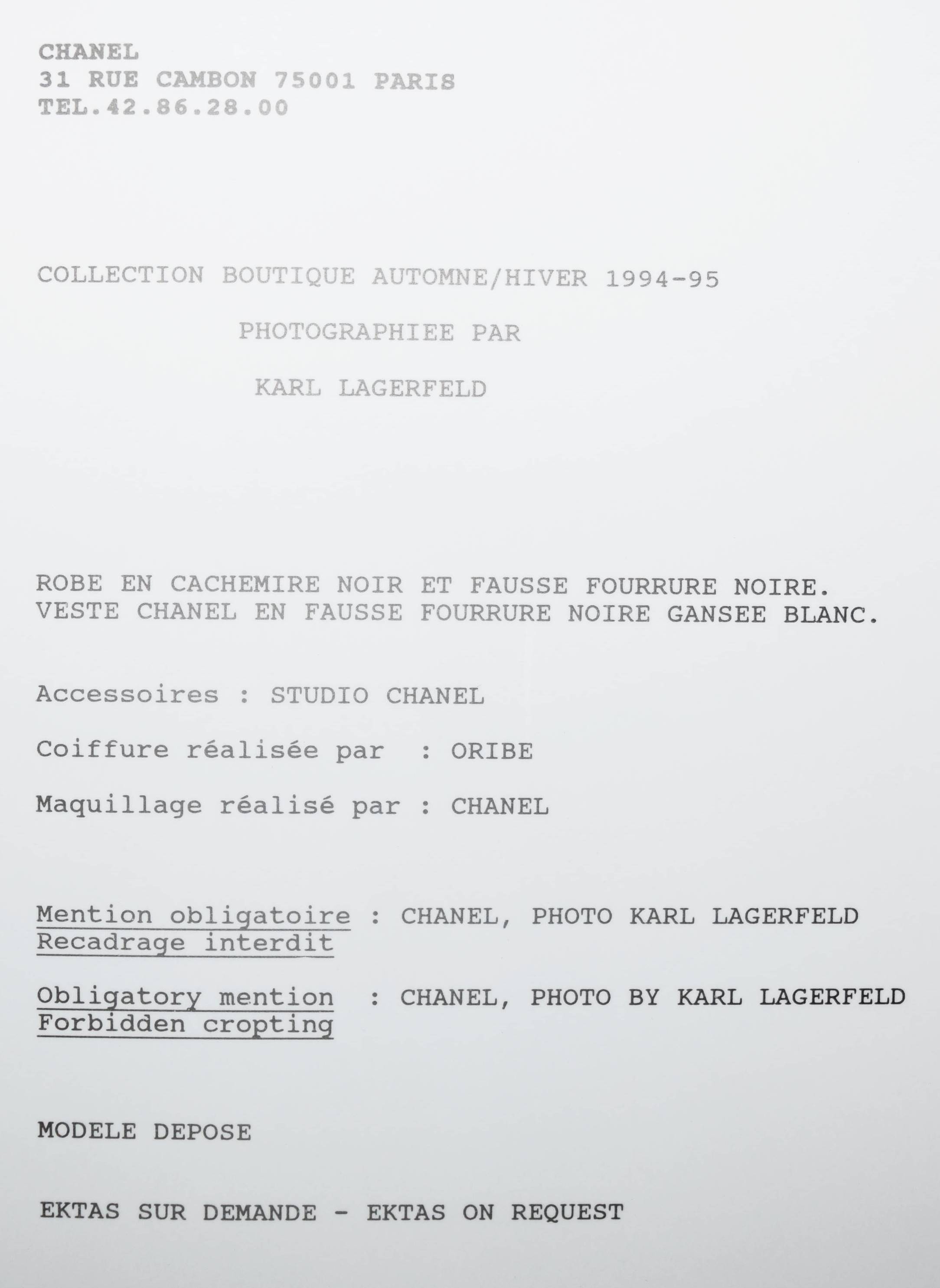 Lagerfeld, Karl (1933-2019, deutscher Modeschöpfer, Designer, Fotograf und Kostümbildner). 5 Orig.-Photographien zur Chanel-Kollektion Herbst/Winter 1994/95 u. Orig.-Portrait-Photographie. Paris, Chanel 1994. Jeweils 24 x 17,5 cm. Portrait 17,5 x 12,5 cm. Fünf von Karl Lagerfeld (1933-2019) kreierte und photographierte Ensembles, die den etwas trotzigen modischen Geist der neunziger Jahre perfekt einfangen. – Verso mit gedrucktem Impressum von Chanel in der Rue Cambon, der Kollektionsbezeichnung, den Namen des Fotografen, einer Materialbeschreibung und den Beteiligten an der Fotoproduktion (wie dem legendären Hairstylisten Oribe Canales) sowie den Bildrechten. – Ecken teils minimal bestoßen, sonst tadellos. – Beiliegt ein Schwarzweiß-Porträt des Designers aus den frühen neunziger Jahren. – 5 original press photos shot by Lagerfeld for Chanel fall/winter 1994/95. – On the back with the imprint with Chanel’s Rue Cambon address, the credits (including the legendary hair-stylist Oribe Canales), and instructions concerning copyrights and reprints. – Some corners minimally bumped, otherwise in pristine condition. – Enclosed is a black and white portrait of the designer from the early 90s.