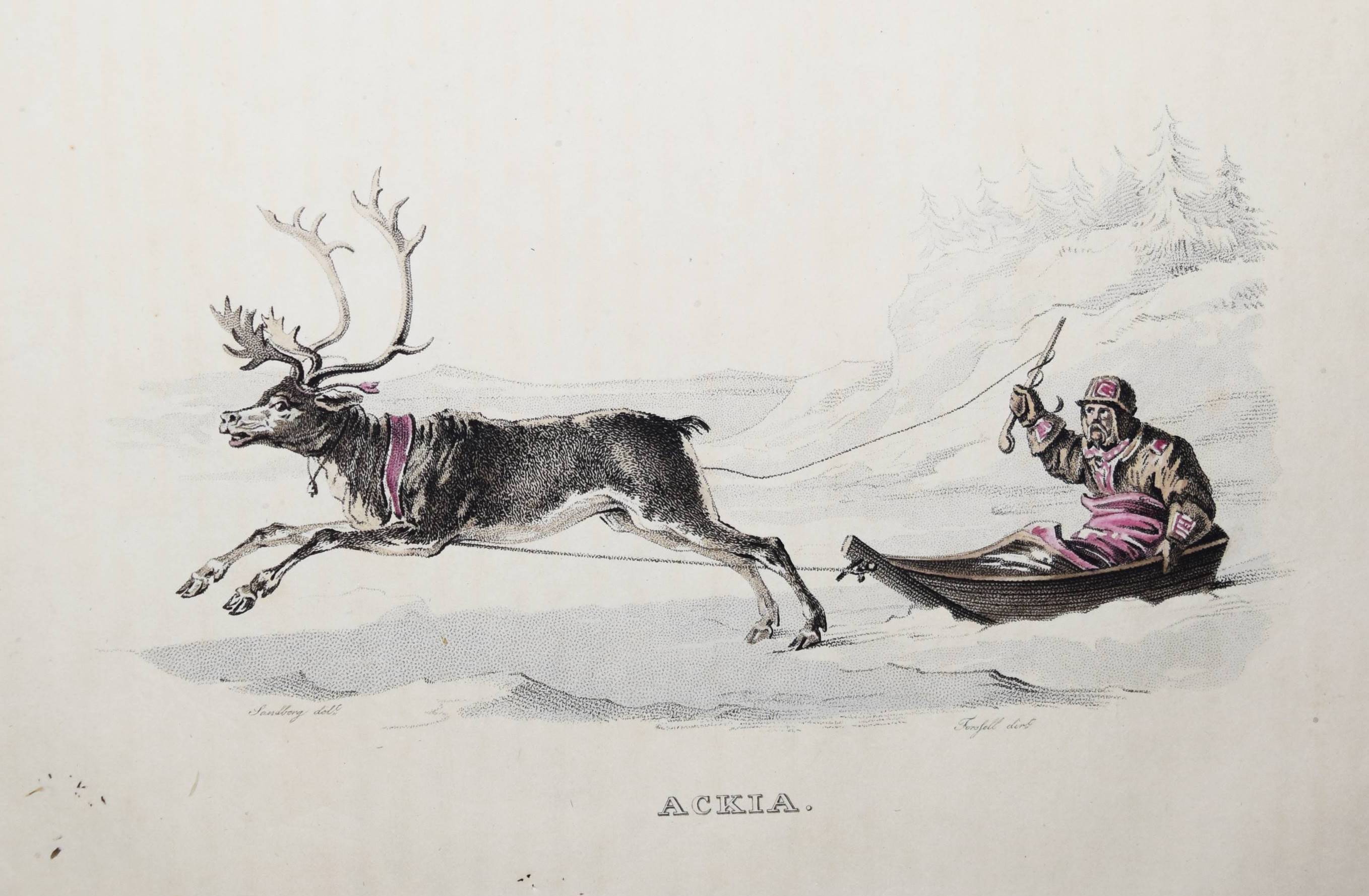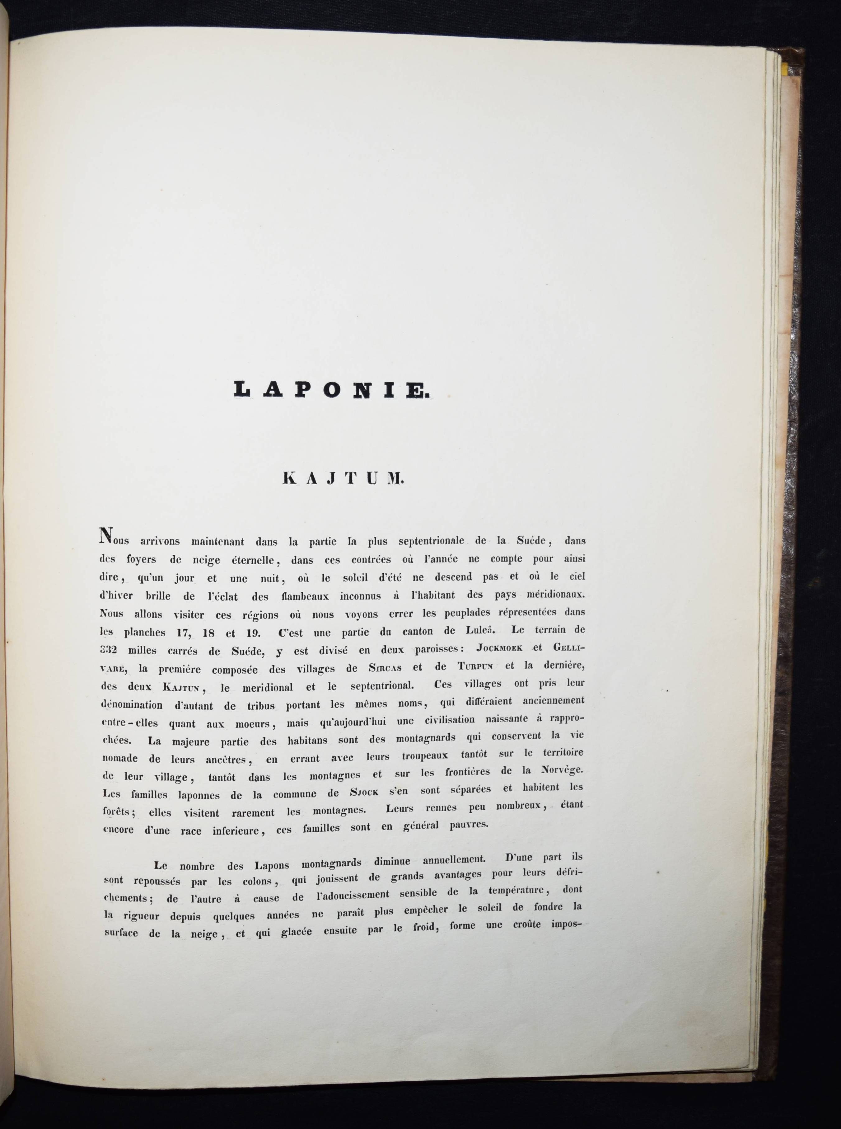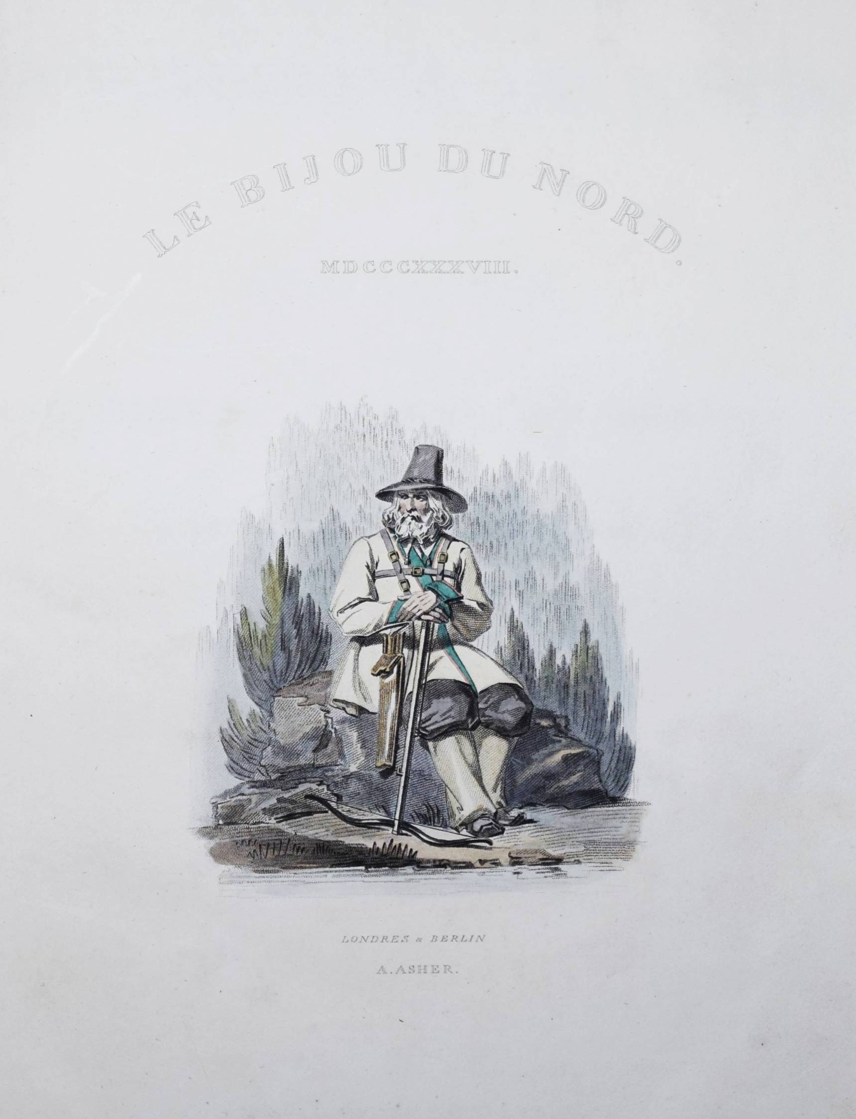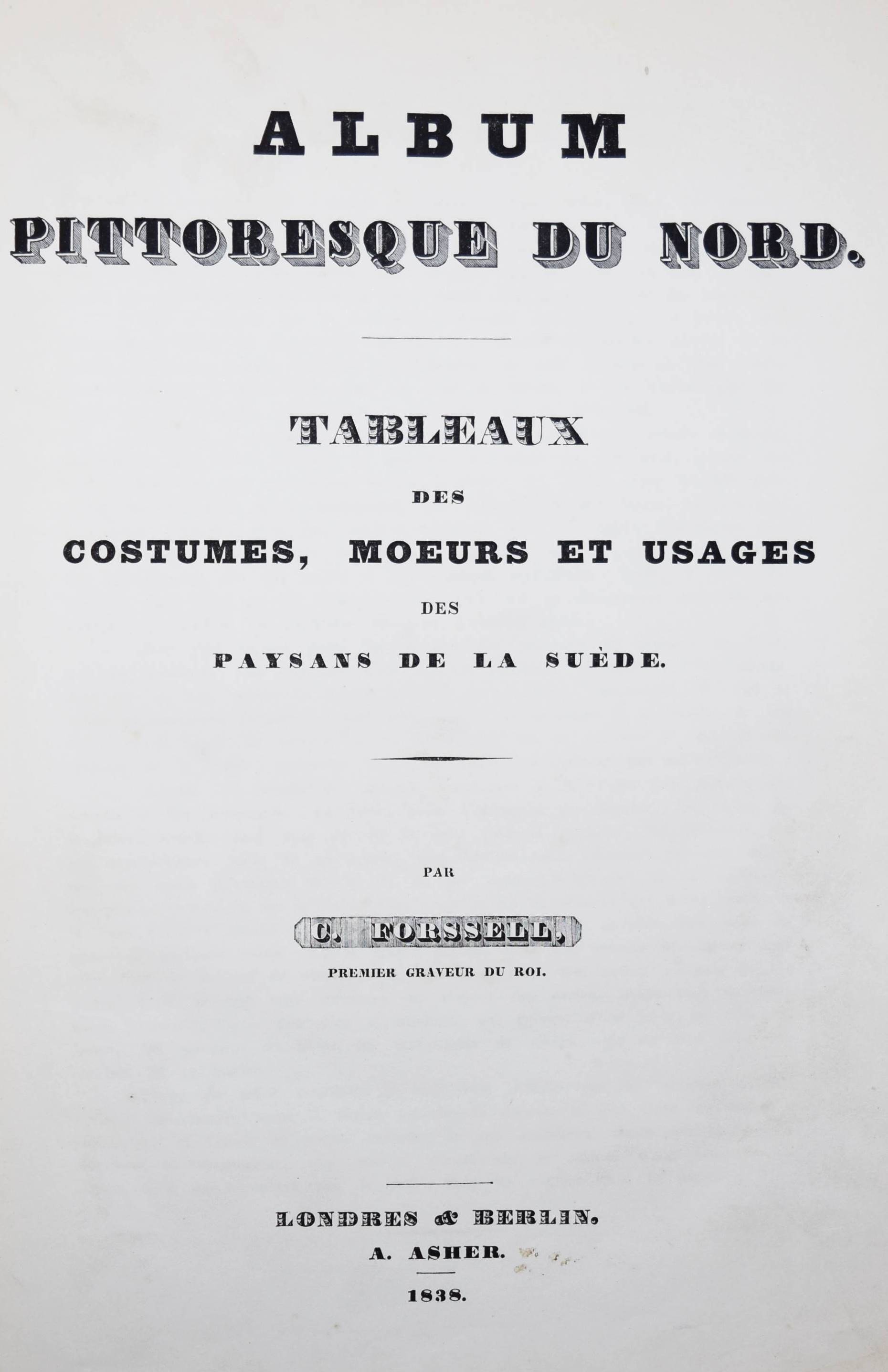 Forssell, C(hristian Didrik). Album pittoresque du Nord. Tableaux des costumes moeurs et usages des paysans de la Suède. (Nebentitel): Le bijou du nord. London, Berlin, A. Asher 1838. Gr.-4°. [3] Bl., 24 S. mit handkol. gestoch. Frontispiz, 15 handkol. Kupfertafeln von Forssell u. Grafströn nach J. G. Sandberg u. 1 lithogr. Musik-Beilage. Blindgepr. OLn. mit goldgepr. Deckeltitel u. Goldschnitt. Colas 1092. Vgl. Colas 1281 u. 1282. – Schön ausgestattetes Album; zuerst 1827 bis 1836 in Lieferungen erschienen. – Die schönen Tafeln zeigen Einwohner aus Helsinki, Schweden und Lappland, darunter auch Robbenjäger auf Skiern und einem Elch-Schlitten sowie ein Lappen-Paar vor einem Zelt. Zwei Tafeln mit Ansichten des Fiellen fjord und von Schloß Gripsholm. – Der schwed. Kupferstecher C. D. Forssell (1777-1852) ging nach seiner Ausbildung als Goldschmied in Stockholm für weitere Studien nach Paris und Amsterdam. Seit 1817 war er Professor an der Kunst-Akademie in Stockholm. – Rücken etwas aufgehellt, Frontispiz im unteren Rand mit restauriertem Eckabriss, nur vereinzelt leicht braunfleckig und etwas gebräunt, sehr gutes Exemplar.
