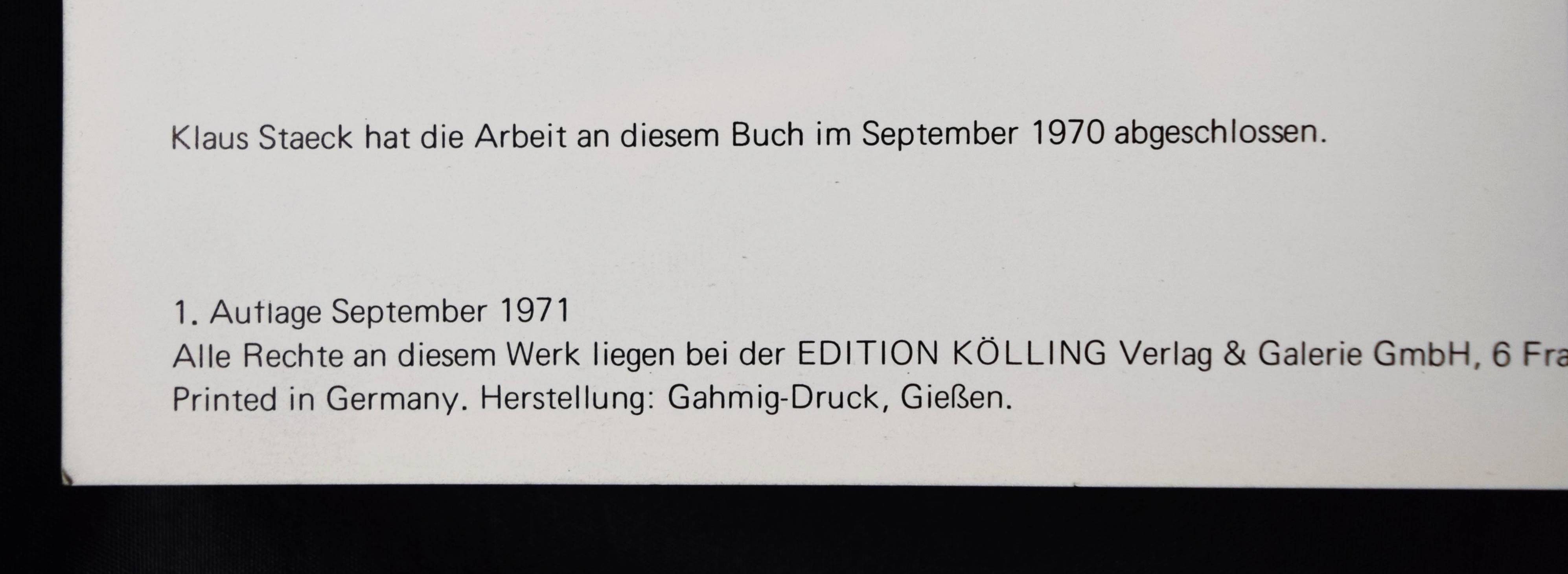 Staeck, Klaus u. H. C. Schmolck (Hrsg). Pornografie. (Frankfurt a. M.), Edition Kölling (1971). Gr.-8°. 192 unbez. Bl. Illustr. Orig.-Kartonumschlag. (Black Spring, Reihe A 4). Heidtmann 14770. Parr/Badger II, 150 f. – Sehr seltene erste Ausgabe, ein zweiter Druck erschien noch im selben Jahr bei Anabas in Berlin. – „The German film-maker Klaus Staeck took the news photograph and the advertisement as the basics of this hard-hitting anti-Vietnam-War, anti-violence artist’s book … As such, Pornografiie (Pornography) is one of the most expressionistic of artist’s books, a standard for a genre in which it is generally considered cool to be cool“ (Parr/Badger). – Folierung des Umschlags an den Kanten leicht abgelöst, Kanten etwas berieben, sehr gutes Exemplar.