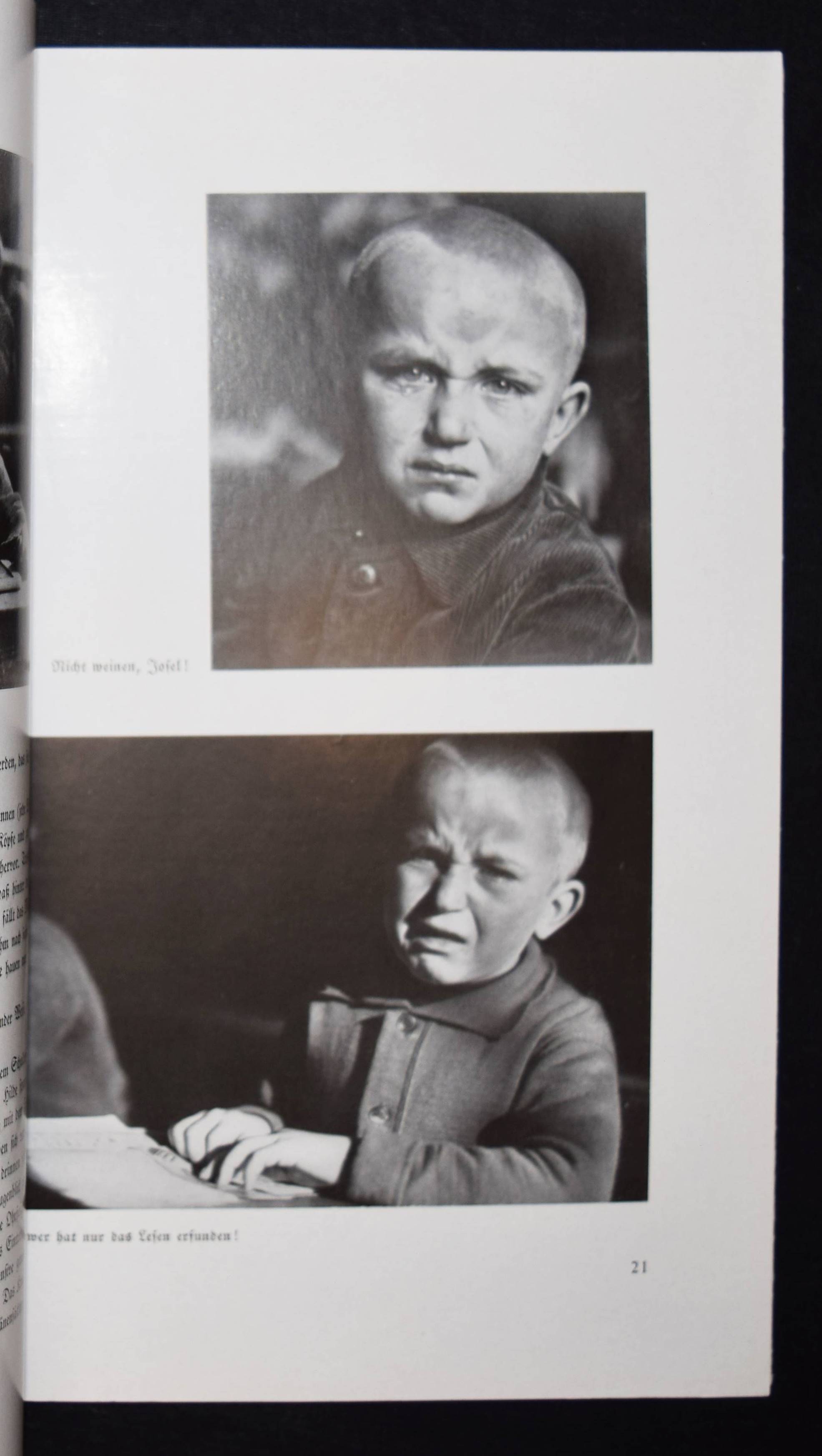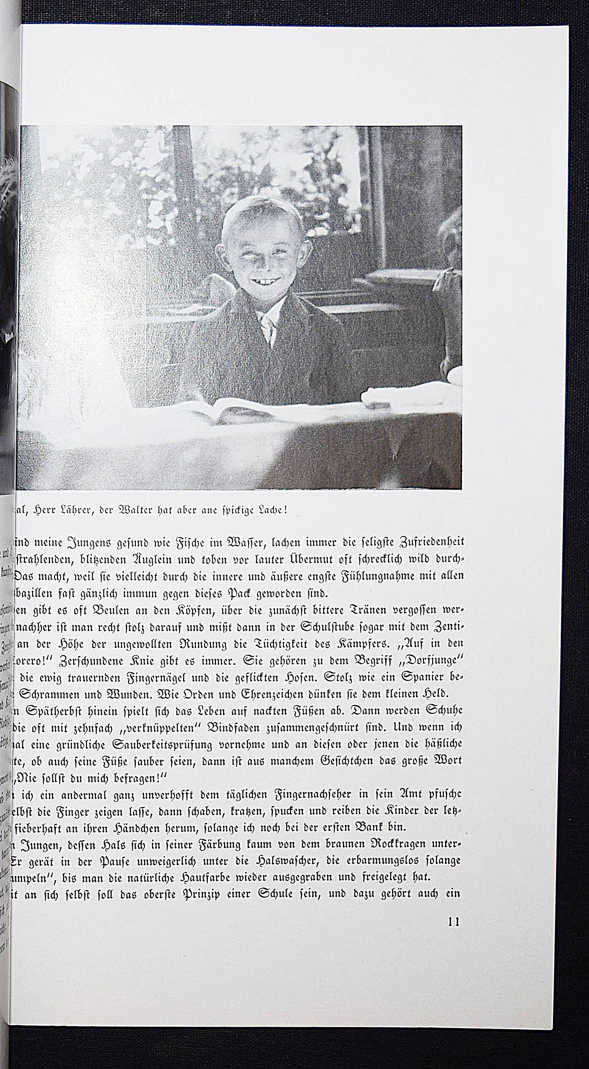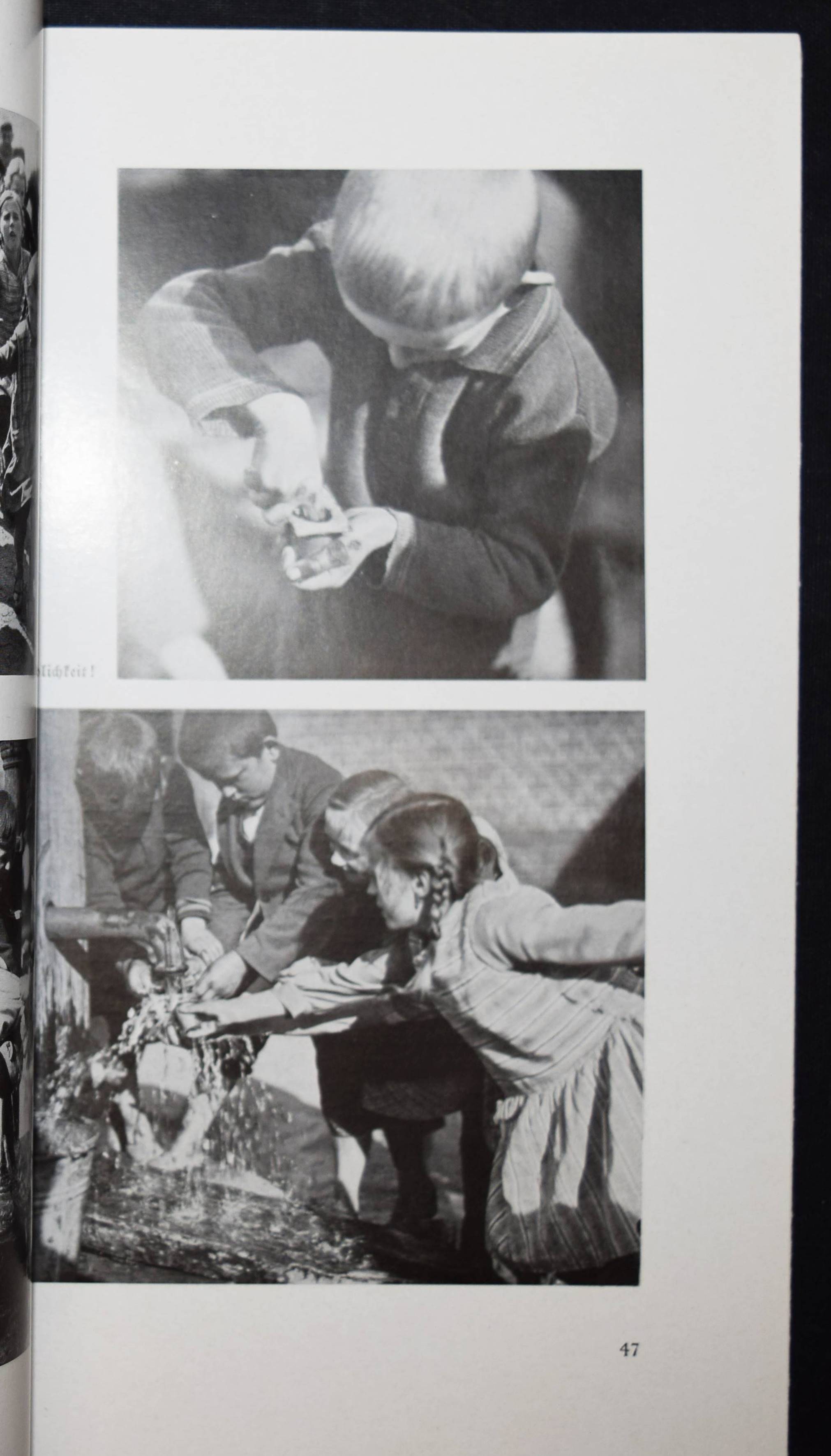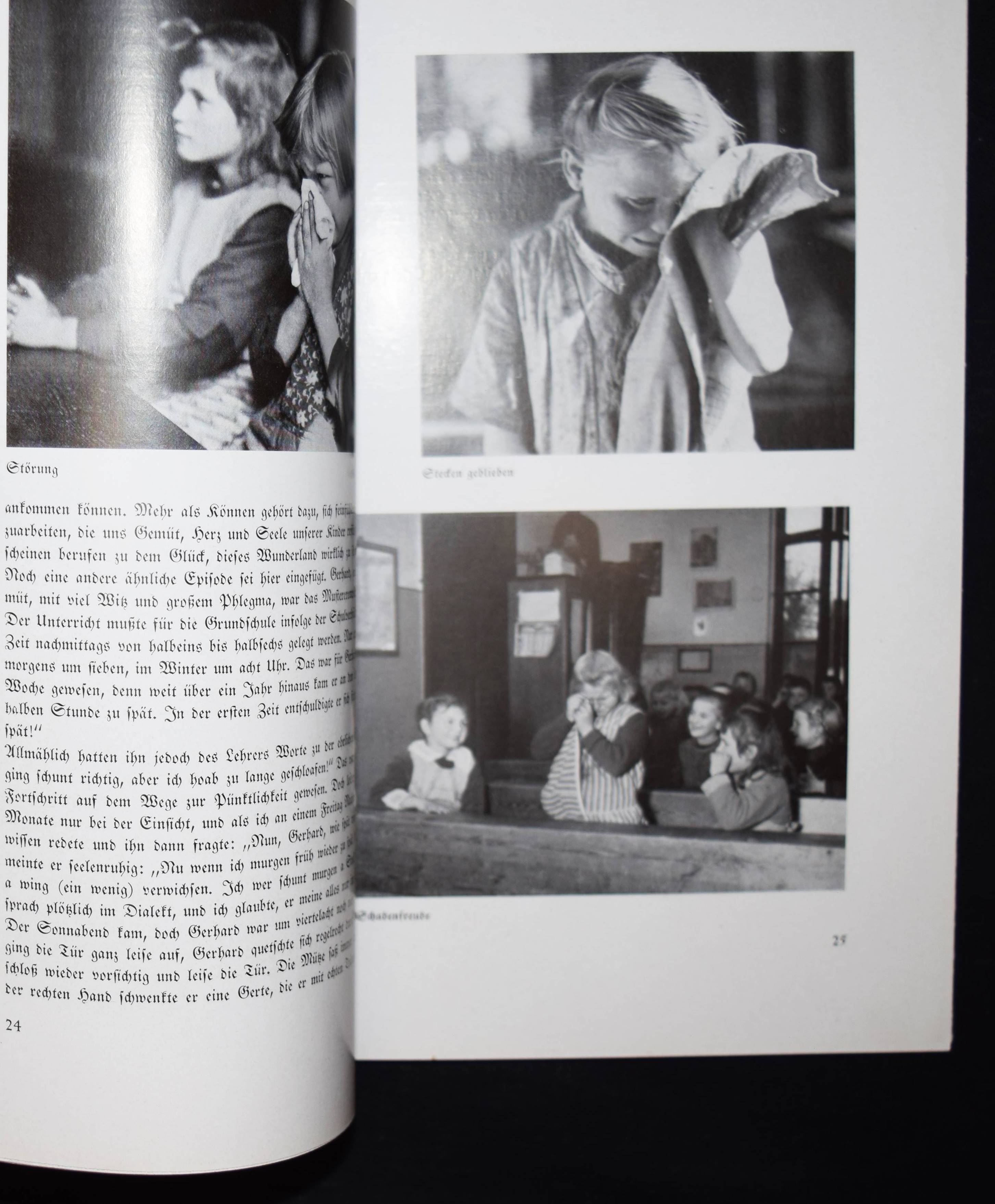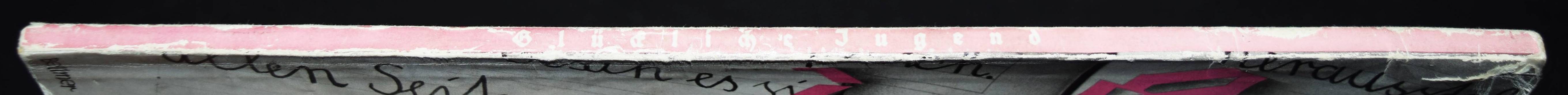 Bellmer – Welzel, Ewald. Glückliche Jugend. (5.-10. Tsd.). Berlin, Brehm 1932. Gr.-8°. 62 S. mit 80 Abb. nach Aufnahmen von E. Welzel. OKart. mit illustr. OU. (von (Hans) Bellmer). Heidtmann 13061. Heiting/Jaeger I, 344 ff. (mit 2 Abb. S. 352). Holstein, Buchumschläge S. 226. – Selten. – Der Umschlag mit einer Fotomontage von H. Bellmer (Porträt eines Schulmädchens vor einem aufgeschlagenen Schreibheft). – „Die letzte kleine „Reihe“ des Brehm Verlages umfasst zwei Titel, die sich freilich nur in Format, Aufmachung und Preis entsprechen: Ewald Wetzels ‚Glückliche Jugend‘ (1931) und Friedrich Lüers ‚Bayrisches Bilderbuch‘ (1934), beides 270 x 190 mm messende Englische Broschuren mit am Rücken festgeklebten zweifarbigen Schutzumschlägen, beide in Fraktur gesetzt und mit Fotos, die laufend den Text begleiten. Den Umschlag von Wetzels Buch ziert eine Fotomontage von Bellmer. Wetzel war Dorfschulmeister und Amateurfotograf, der seine Modelle in Momenten von Zorn, Freude, Spannung oder beim Spielen aufgenommen hatte. Im Text erzählt er von seiner Arbeit und den Verhaltensweisen seiner Schützlinge, in den Bildtexten werden die Fotos anekdotisch kommentiert. Man merkt, dass die Kinder die Kamera nicht mehr wahrgenommen hatten. Posiert wird nur selten, was zu einer eigentümlichen Nähe zu den Protagonisten führt. Wetzel baute einige Sequenzen ein, die auf ein einzelnes Kind beim Lachen, Weinen, Toben oder Lernen konzentriert sind. Um dies zu erreichen, arbeitete der Fotograf mit engen Ausschnitten und Beleuchtungen, die die Schüler und ihre Emotionen hell vor einem dunklen Hintergrund hervortreten lassen. Wenn das Buch nicht durch seine biedere Typografie auffallen würde, hätte es vom Umschlag und den Fotos her das Zeug zu einem Klassiker der Moderne gehabt; … Hans Bellmer beendete (um 1935) seine Tätigkeit als Gebrauchsgrafiker zugunsten einer neuen als freier Künstler, ging in die innere Emigration und verließ Deutschland 1938 in Richtung Paris“ (T. Wiegand in Heiting/Jaeger). – Beiliegt: Prospekt der Sächsischen Landesbildstelle für 12 Lichtbildreihen zum Thema „Glückliche Jugend“. – Schutzumschlag am Rücken etwas berieben und mit geringen Randläsuren, gutes Exemplar.
