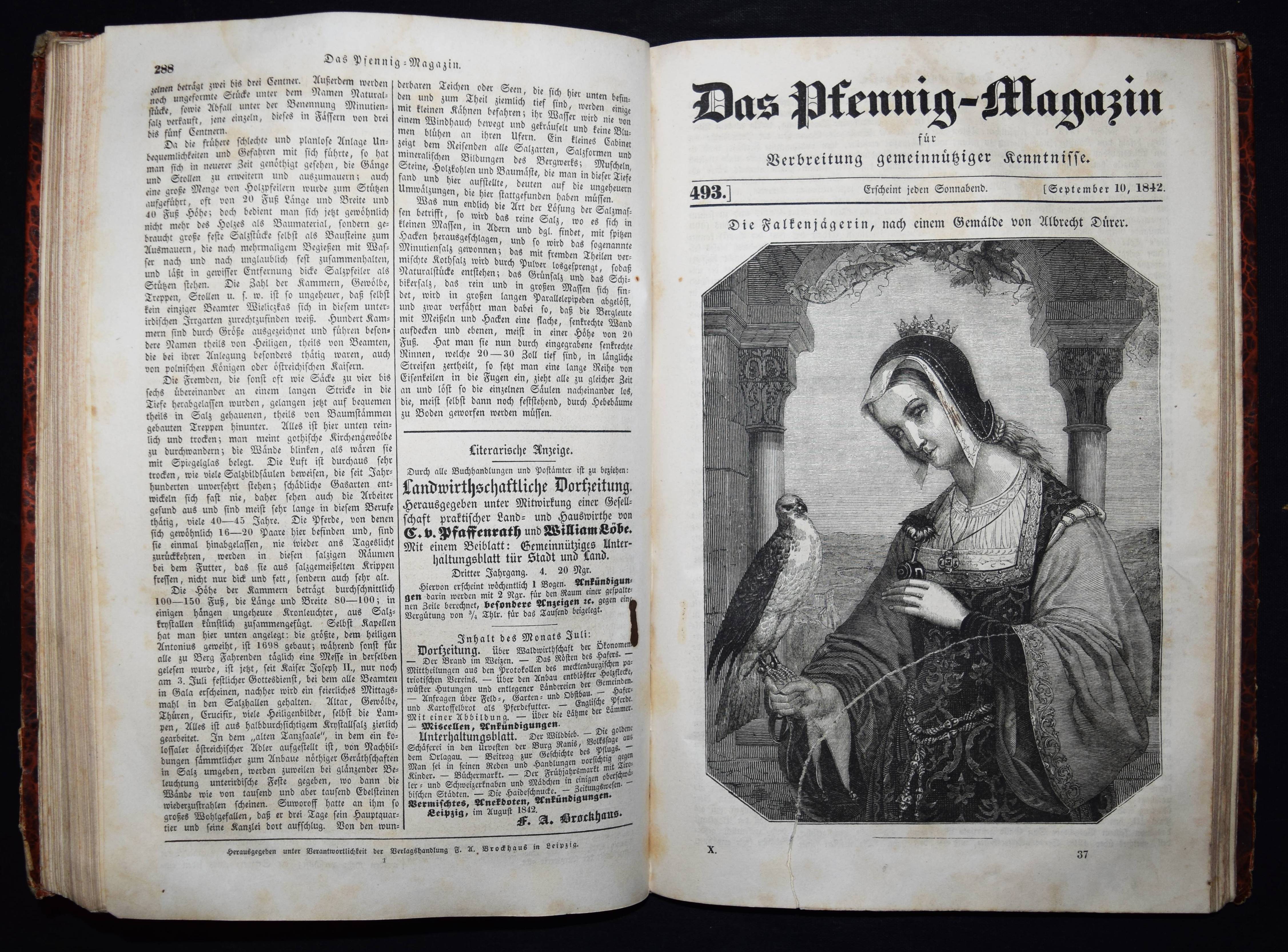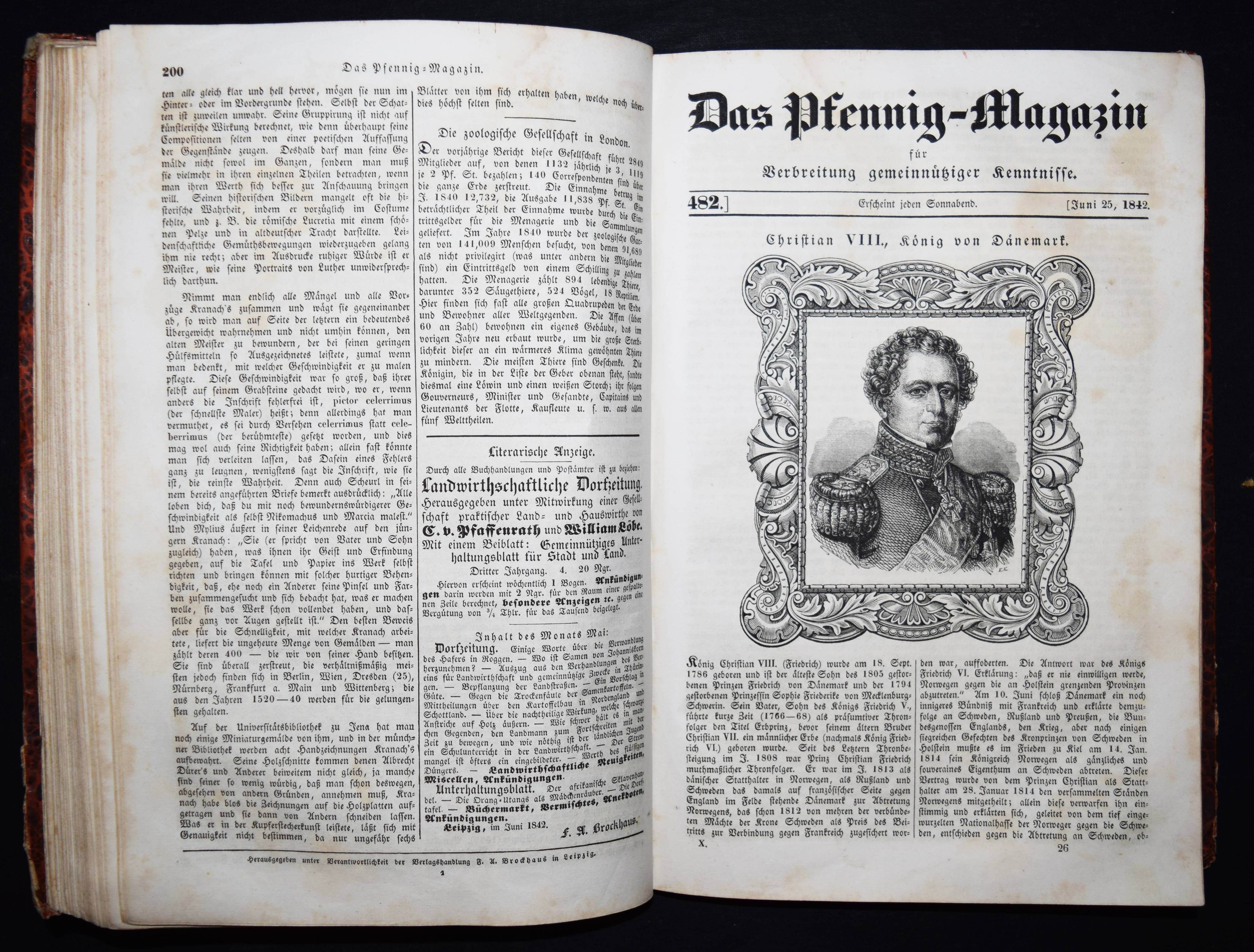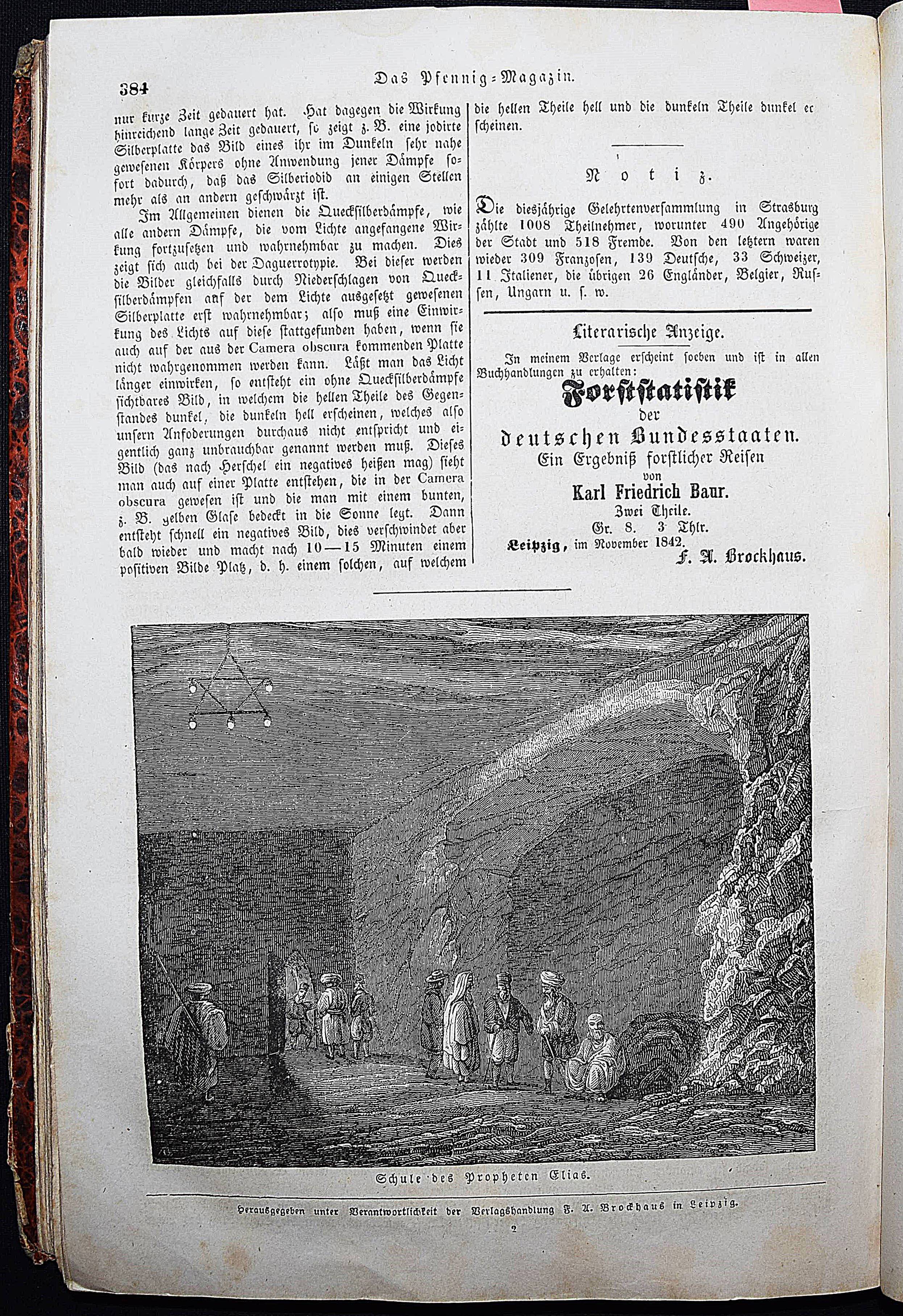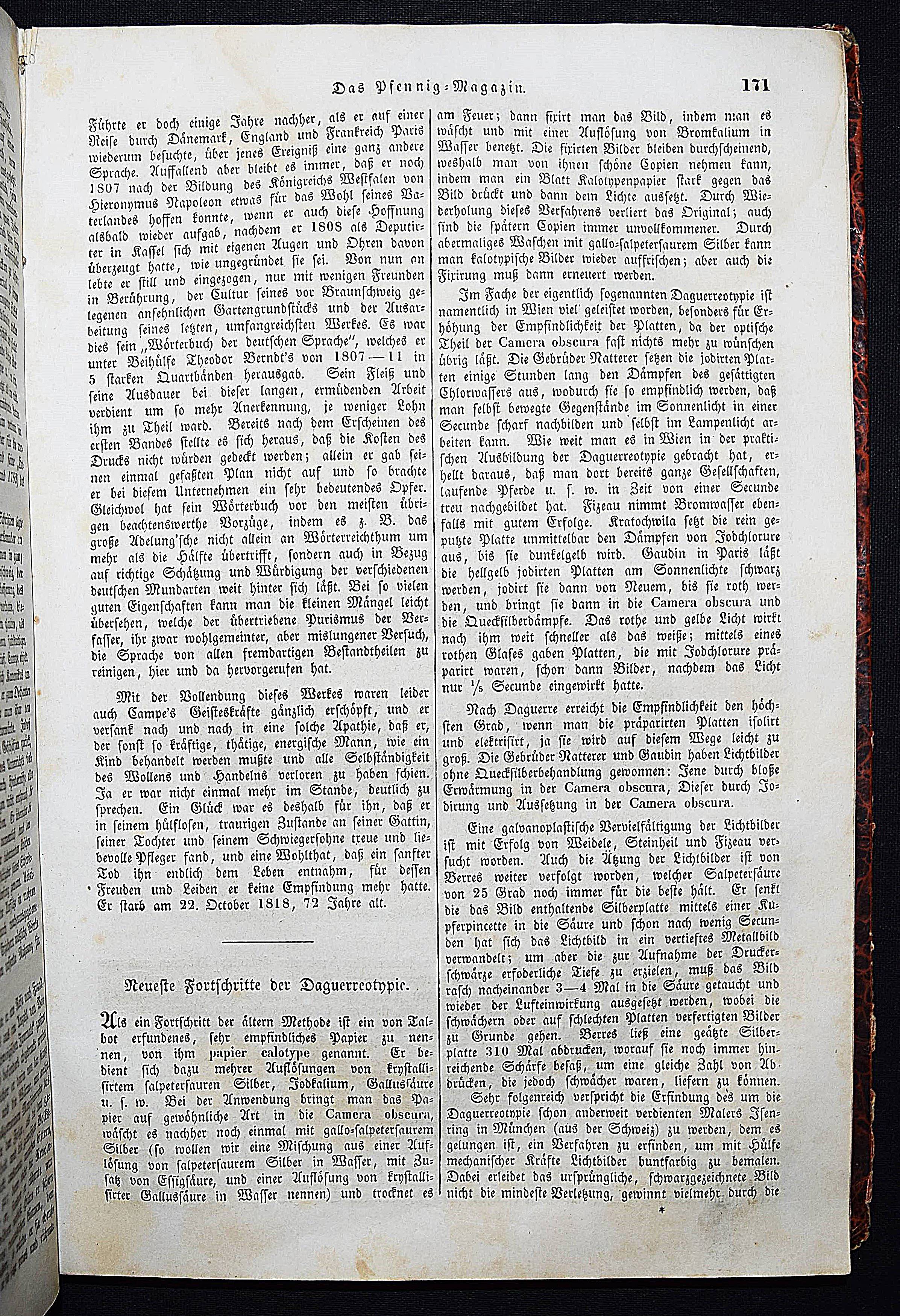 Daguerreotypie – Neueste Fortschritte der Daguerreotypie. In: Das Pfennig-Magazin der Gesellschaft zur Verbreitung gemeinnütziger Kenntnisse. Zehnter Band (Jahrgang), Nr. 476, 14. Mai 1842, S. 171/172. Nr. 457-509 in 1 Band. Leipzig, F. A. Brockhaus 1842. Gr.-8°. VII, 424 S. mit zahlr. Holzschnitten. Marm. Pbd. d. Zt. mit Rückenschild (lithogr. OU. beigebunden). Kirchner 10840. – Interessanter Artikel über die Daguerreotypie. – Der Jahrgang enthält außerdem einen Artikel: ″Wichtige Erweiterung der Photographie.″ (Nr. 504, S. 383/384). – Einband etwas berieben u. bestoßen, N.a.V., 1 Bl. mit Ausriß (S. 159/160, etwas Textverlust), 1 Bl. mit größerem rep. Einriß (S. 349/350), durchgehend leicht gebräunt und schwach braunfleckig, sonst gut erhalten.
