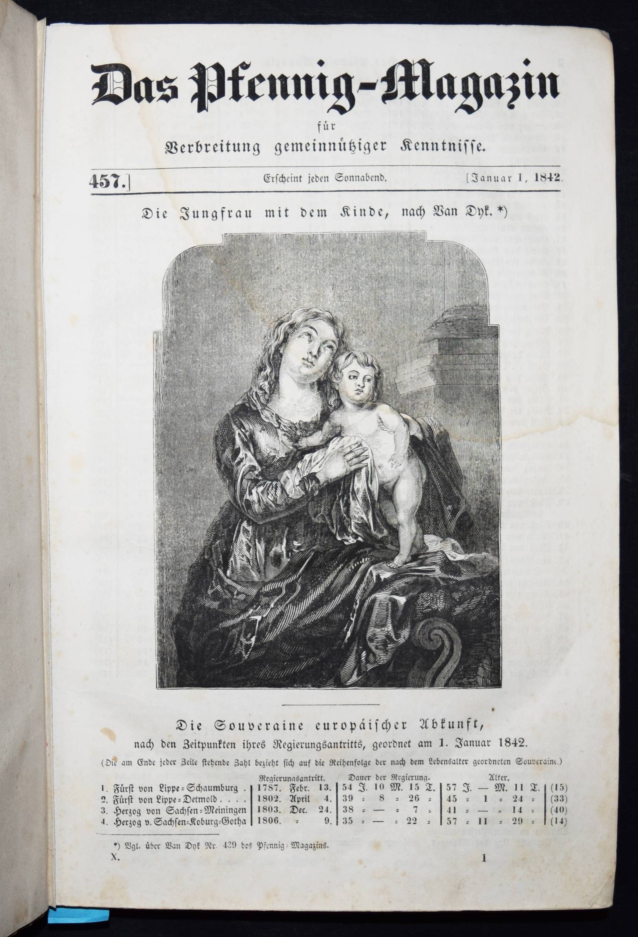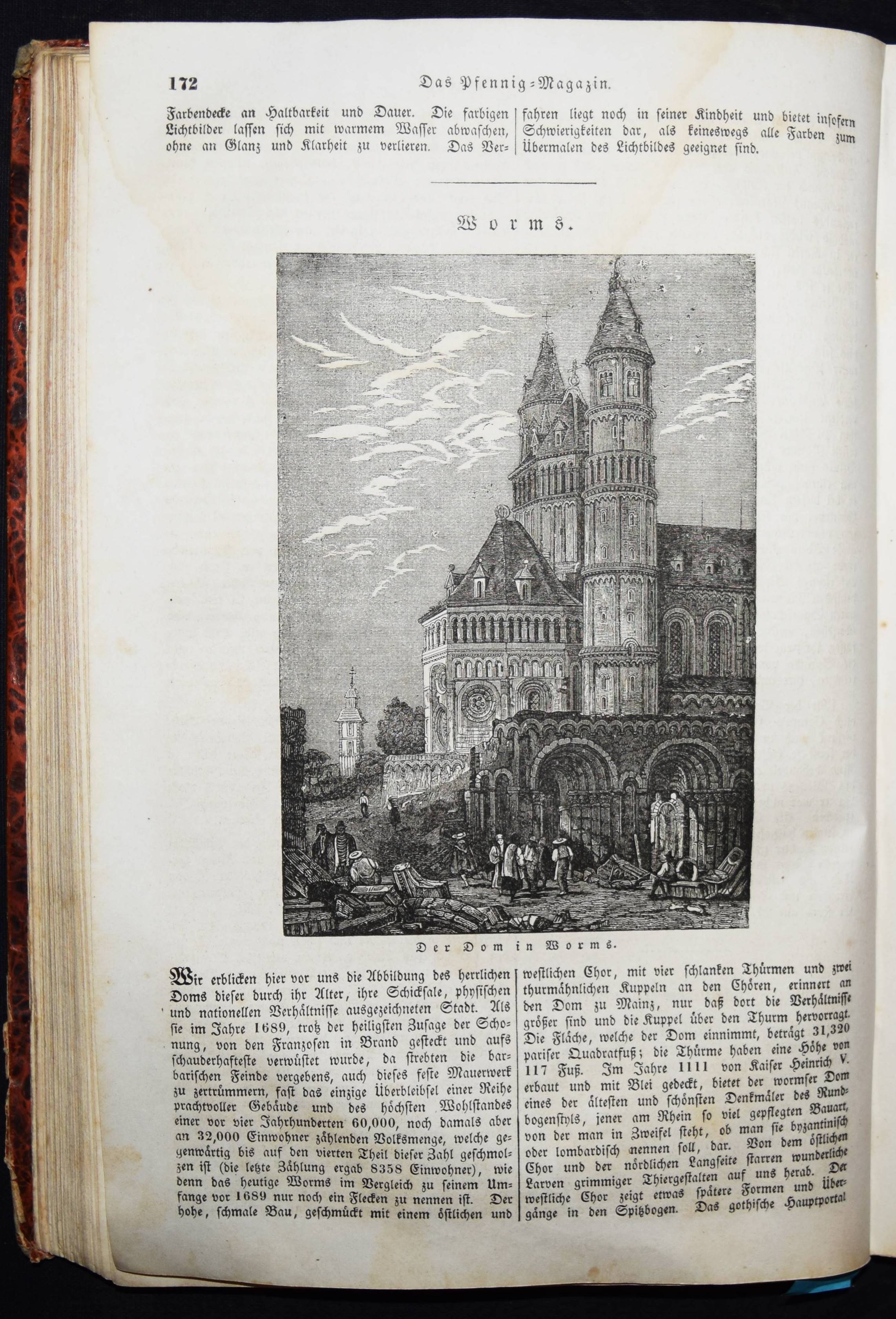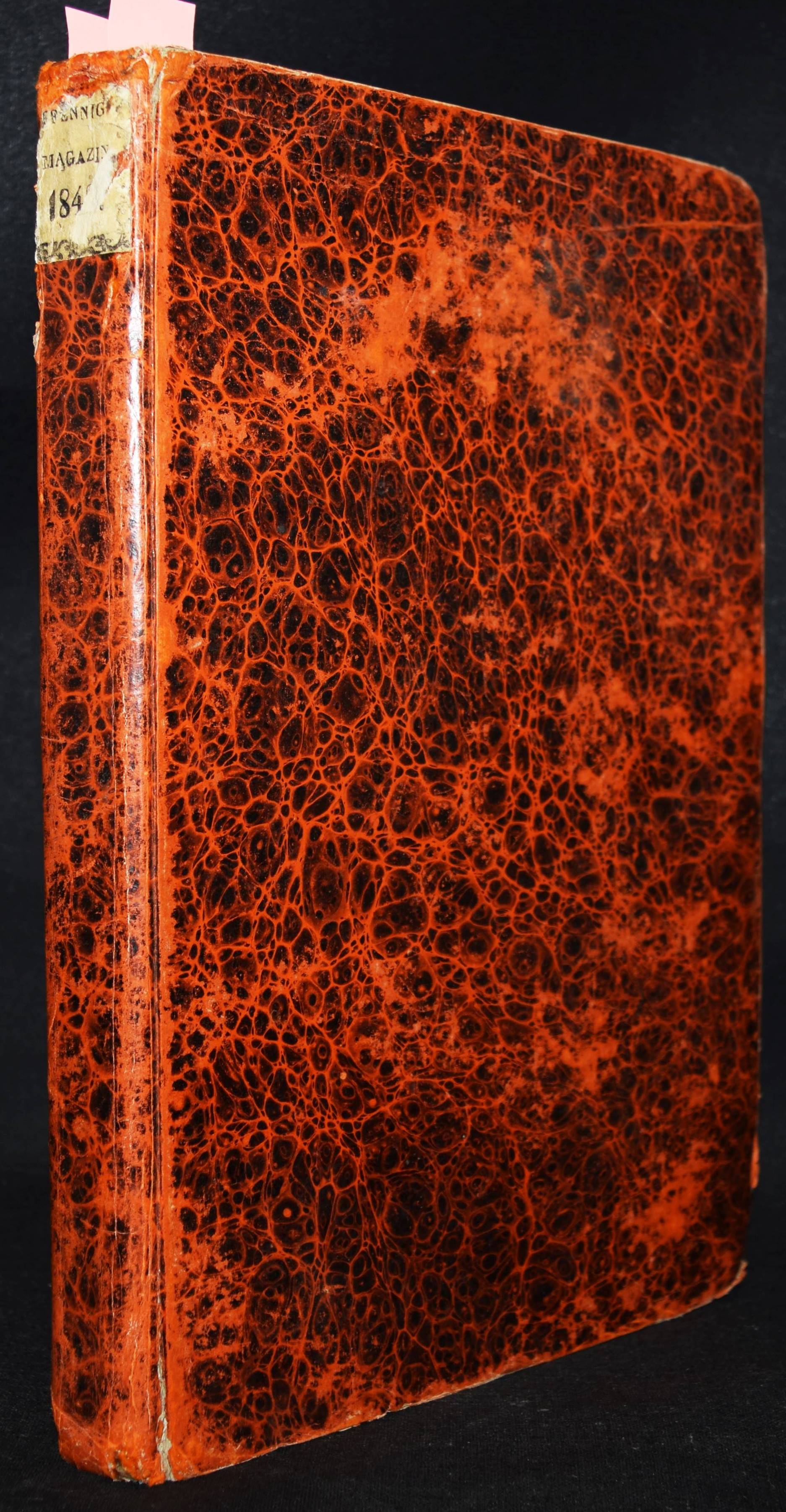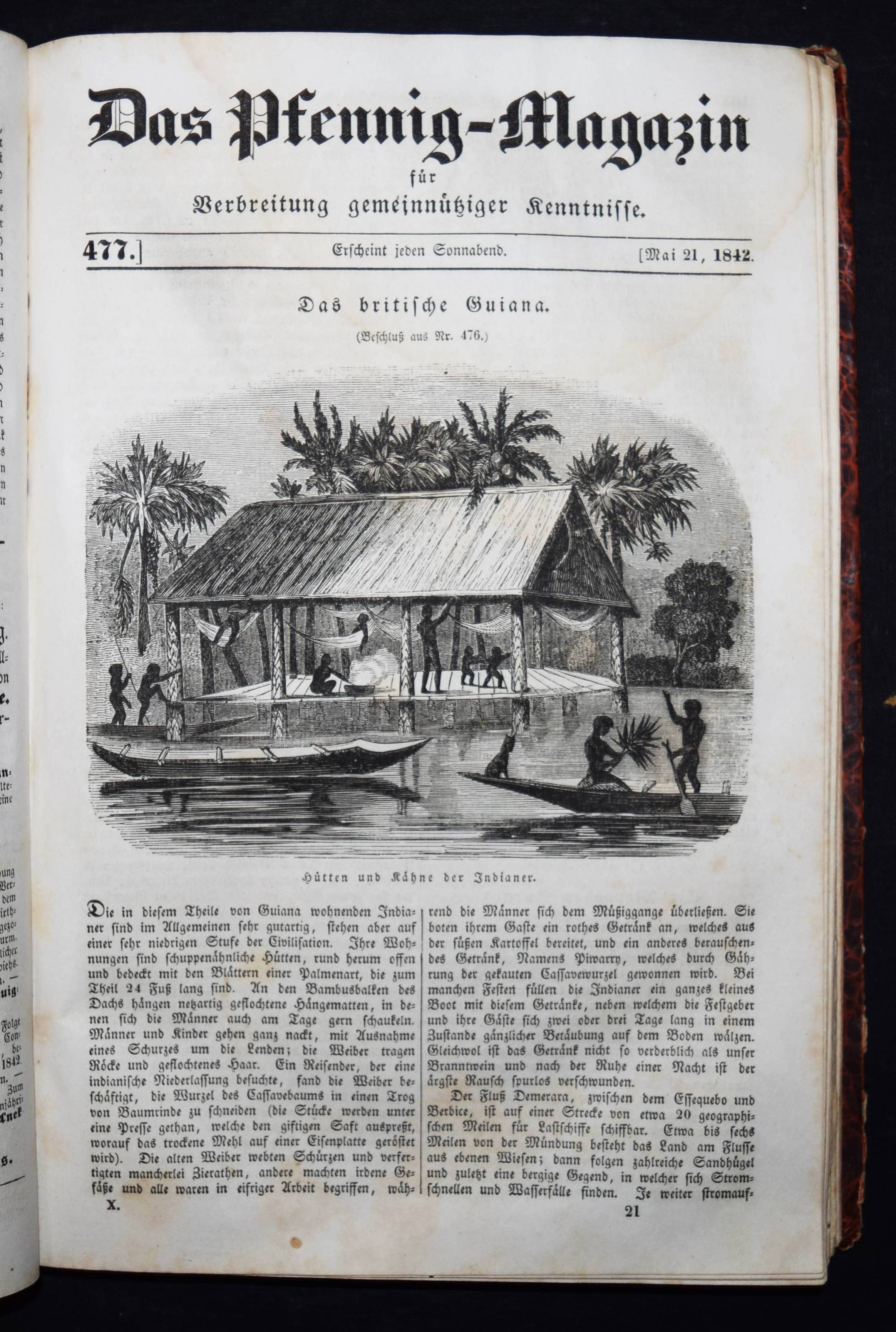 Daguerreotypie – Neueste Fortschritte der Daguerreotypie. In: Das Pfennig-Magazin der Gesellschaft zur Verbreitung gemeinnütziger Kenntnisse. Zehnter Band (Jahrgang), Nr. 476, 14. Mai 1842, S. 171/172. Nr. 457-509 in 1 Band. Leipzig, F. A. Brockhaus 1842. Gr.-8°. VII, 424 S. mit zahlr. Holzschnitten. Marm. Pbd. d. Zt. mit Rückenschild (lithogr. OU. beigebunden). Kirchner 10840. – Interessanter Artikel über die Daguerreotypie. – Der Jahrgang enthält außerdem einen Artikel: ″Wichtige Erweiterung der Photographie.″ (Nr. 504, S. 383/384). – Einband etwas berieben u. bestoßen, N.a.V., 1 Bl. mit Ausriß (S. 159/160, etwas Textverlust), 1 Bl. mit größerem rep. Einriß (S. 349/350), durchgehend leicht gebräunt und schwach braunfleckig, sonst gut erhalten.
