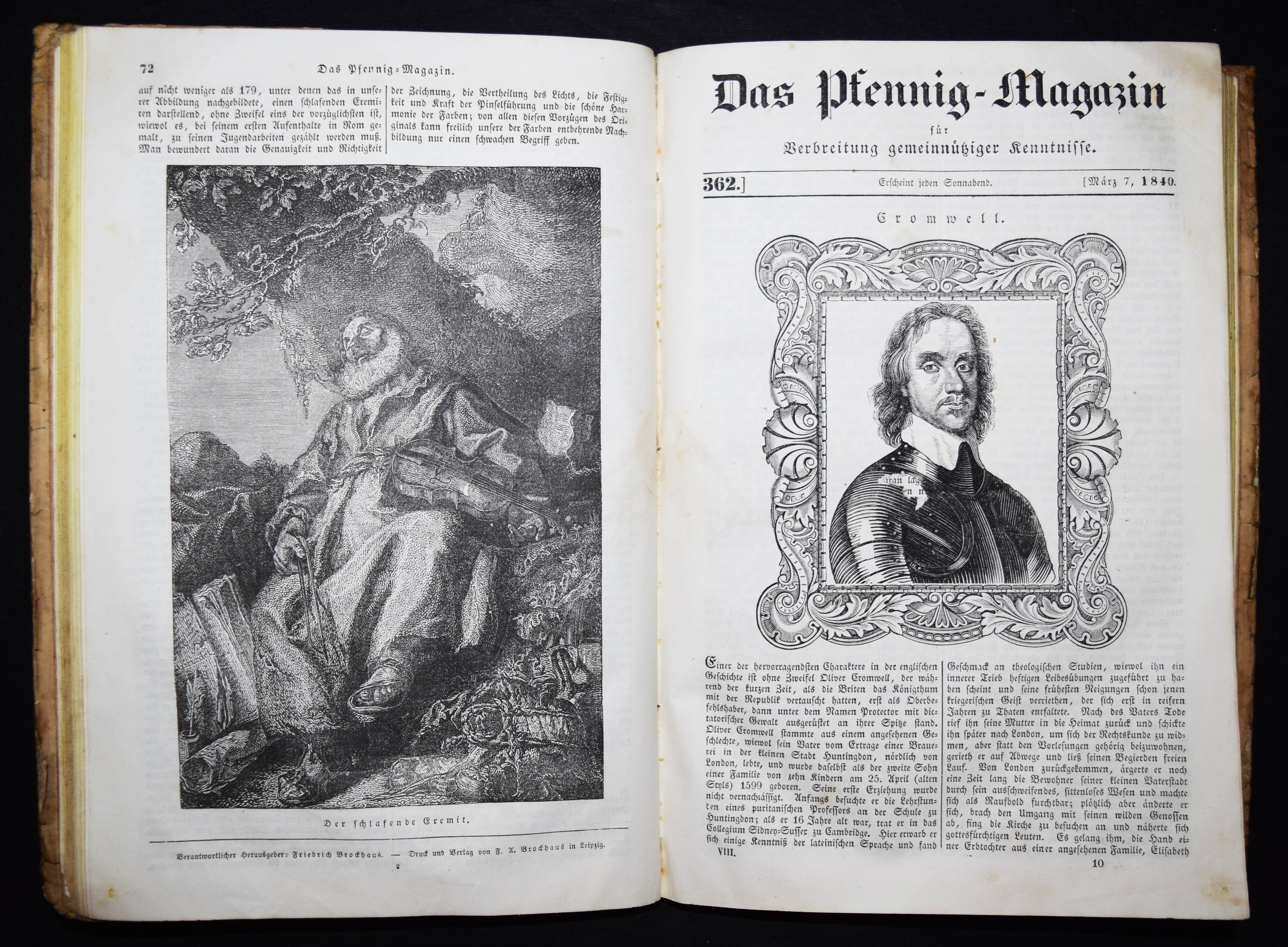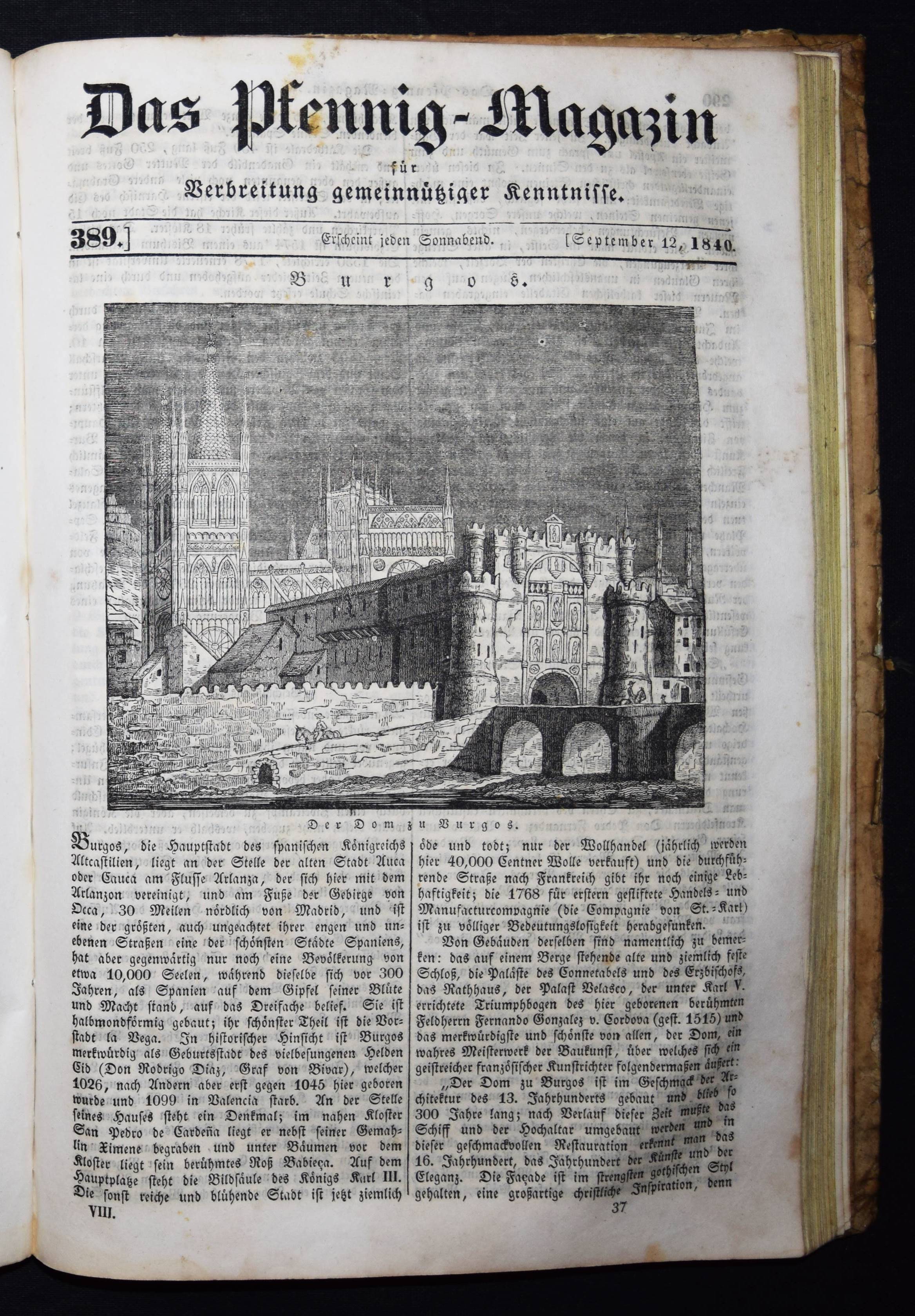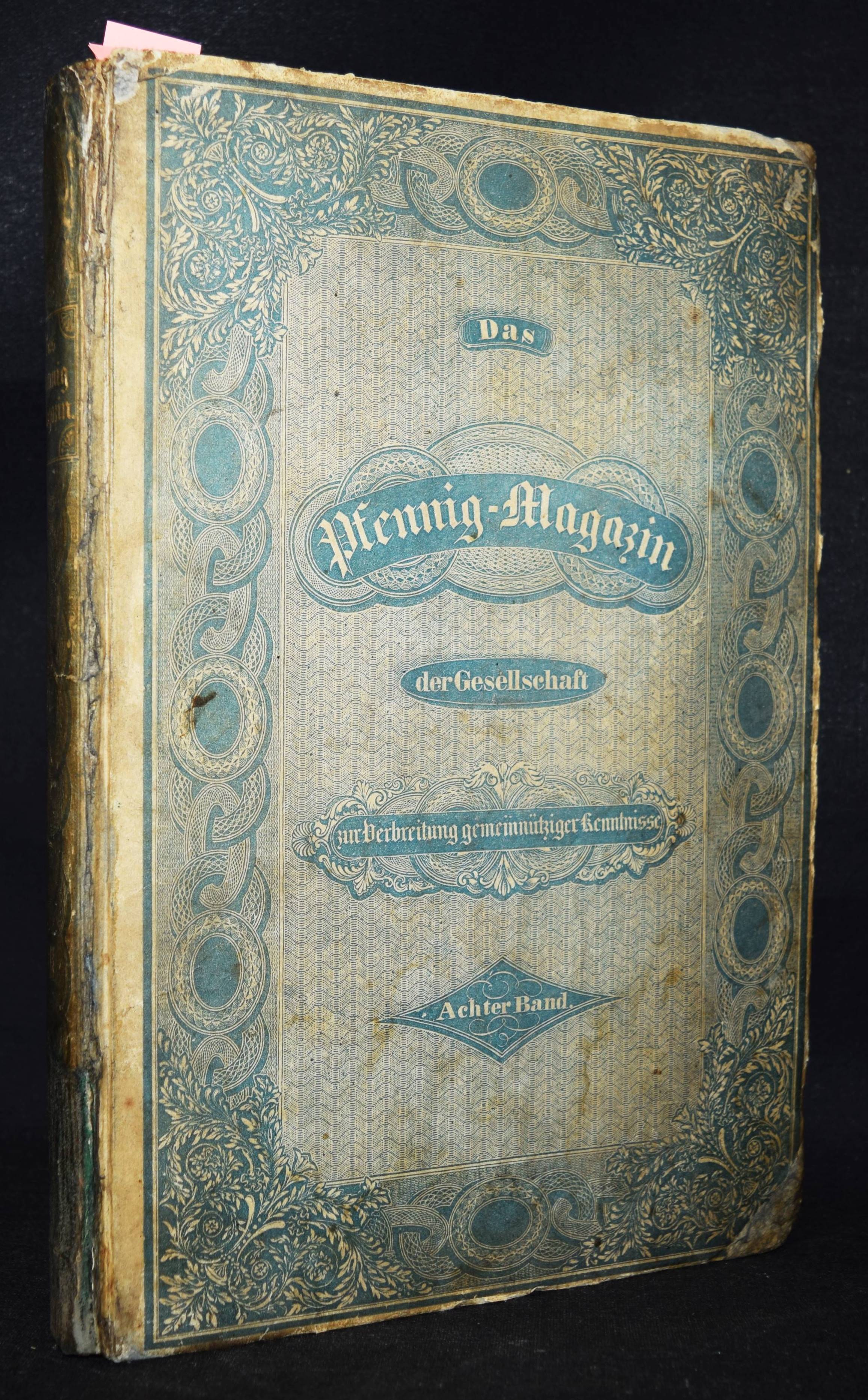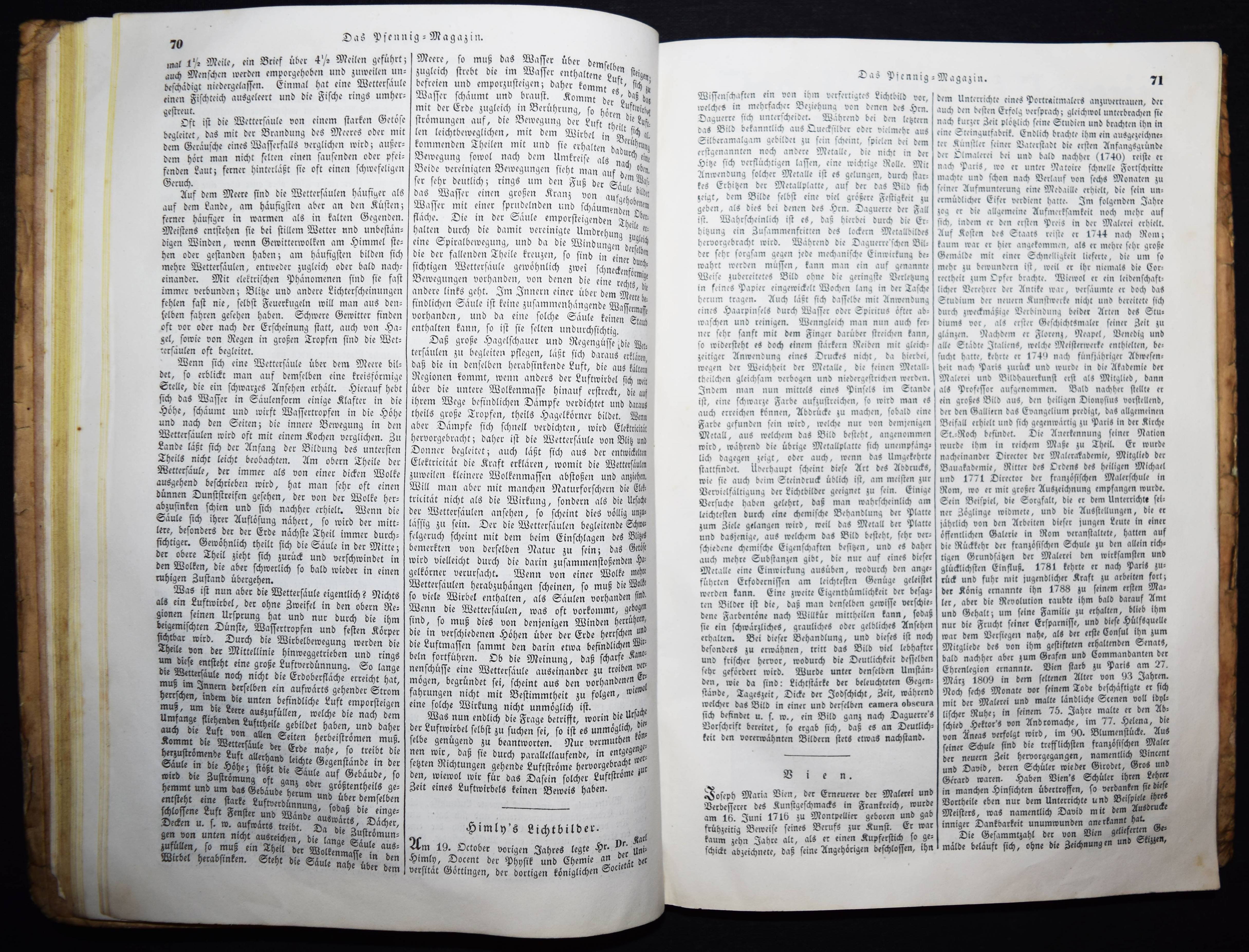 Daguerreotypie – Das Neueste aus der Natur- und Gewerbewissenschaft. In: Das Pfennig-Magazin der Gesellschaft zur Verbreitung gemeinnütziger Kenntnisse. Achter Band (Jahrgang), Nr. 360, 22. Februar 1840, S. 58-60 und Nr. 386, 22. August 1840, S. 268-271. Nr. 353-404 in 1 Band. Leipzig, F. A. Brockhaus 1840. Gr.-8°. VIII, 416 S. mit zahlr. Holzschnitten. Typogr. OPbd. Kirchner 10840. – Interessanter Artikel über die Anwendung der Galvanoplastik zur Bildreproduktion, welche der deutsch-russ. Physiker Moritz Hermann v. Jacobi (1801-1874) 1837 erfunden hatte. „… zur ausgedehnten Anwendung der interessanten Jacobini’schen Erfindung … Unmittelbar neben dem Liepmann’schen Öldrucke, … steht die freilich noch viel wundervollere Daguerre’sche Heliographie photogenischer Bilder… Wir rechnen dahin ganz besonders ein vom Dr. Schafhäutl aus München zu London producirtes Verfahren, Lichtbilder, zwar auch, wie bei Daguerre, mittels der Camera obscura, aber durch Anwendung ganz anders zubereiteter Platten zu erlangen … die chemische Präparation dieser gegen alles Licht so äußerst empfindlichen Platten auch in dem nämlichen Maße mühsam und kostbar sein, weshalb er auch noch auf eine Vereinfachung sinnt; gelingt ihm diese, so hat sein Verfahren offenbar vor dem Daguerre’schen unendlich viel voraus“ (S. 59). Außerdem über weitere Verbesserungen der Daguerreotypie. Der Artikel behandelt nach einem Exkurs über die elektrische Telegrafie in der Fortsetzung weitere wichtige Aspekte und Entwicklungen des „Daguerre’schen Verfahrens“. – „Daguerre’s große optische Erfindung gewährt in täglich wachsender Vervollkommnung wirklich auch bereits täglich bedeutenden Gewinn. Schon jetzt findet man überall Daguerre’sche Lichtbilder, welche durch die bewunderswürdigste Treue, durch die Deutlichkeit und Nettigkeit der Ausführung jede andere Darstellungsweise weit hinter sich zurücklassen“ (S. 268). – Der Jahrgang enthält außerdem einen Artikel: ″Himly’s Lichtbilder.″ (Nr. 357, S. 70/71) über ein neues fotografisches Verfahren des Göttinger Chemikers August Friedrich Karl Himly (1811-1885) der, unabhängig von Hippolyte Fizeau, zur Verbesserung der Daguerreotypie einen Goldüberzug entwickelte. – Einband angestaubt, berieben u. bestoßen, hinterer freier Vorsatz fehlt, Rücken am Fuß restauriert, teils gebräunt und stellenweise braunfleckig, sonst gut erhalten.