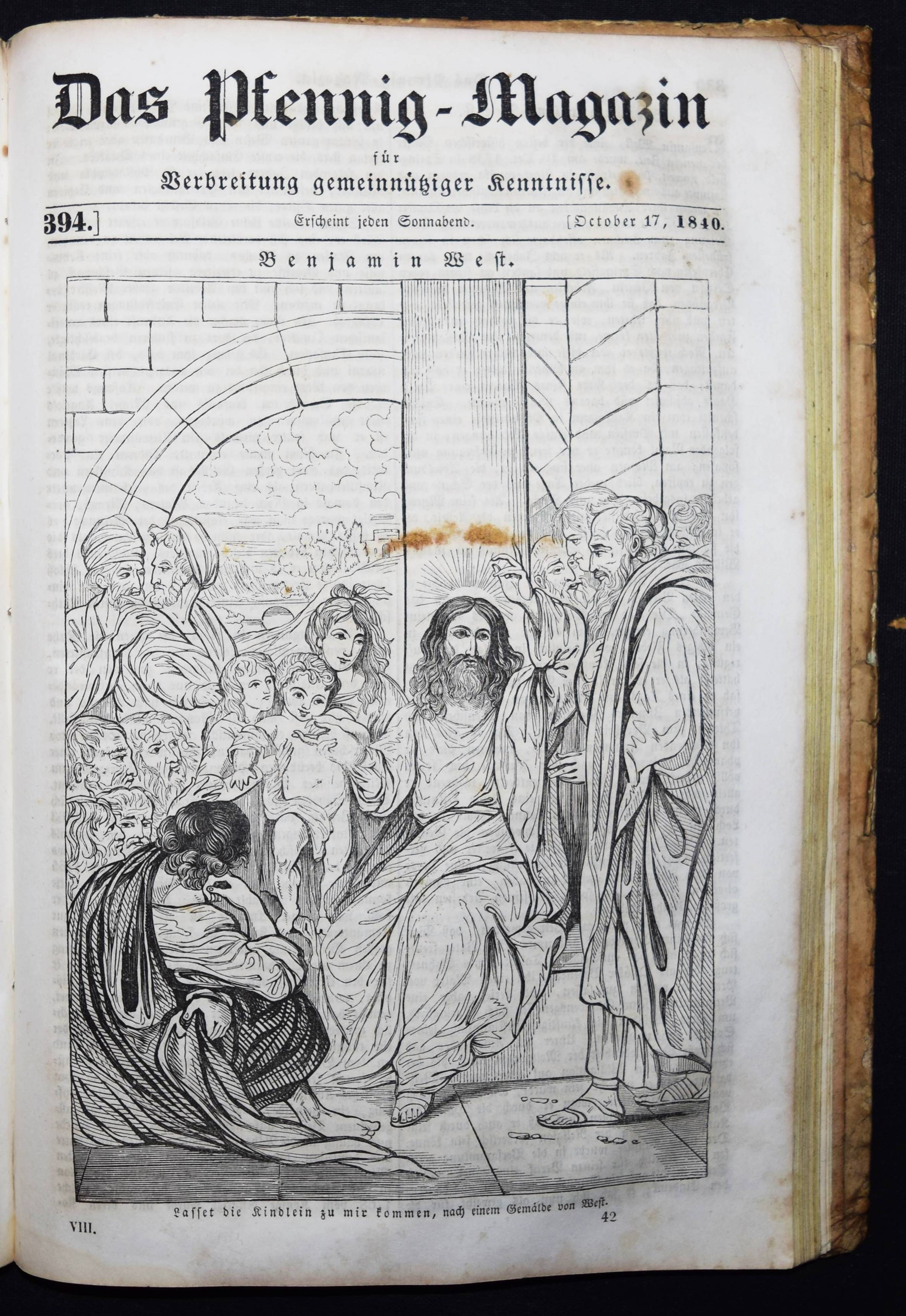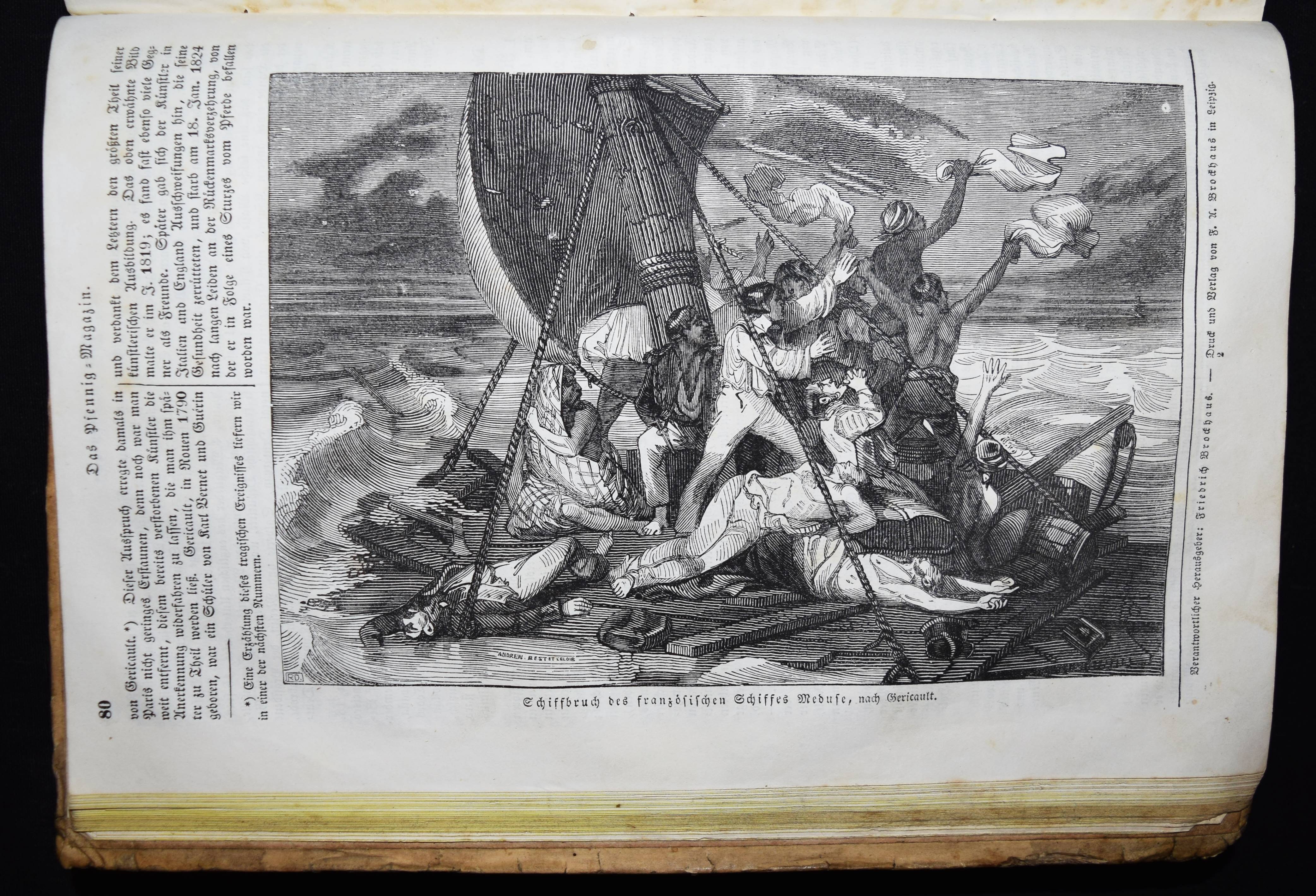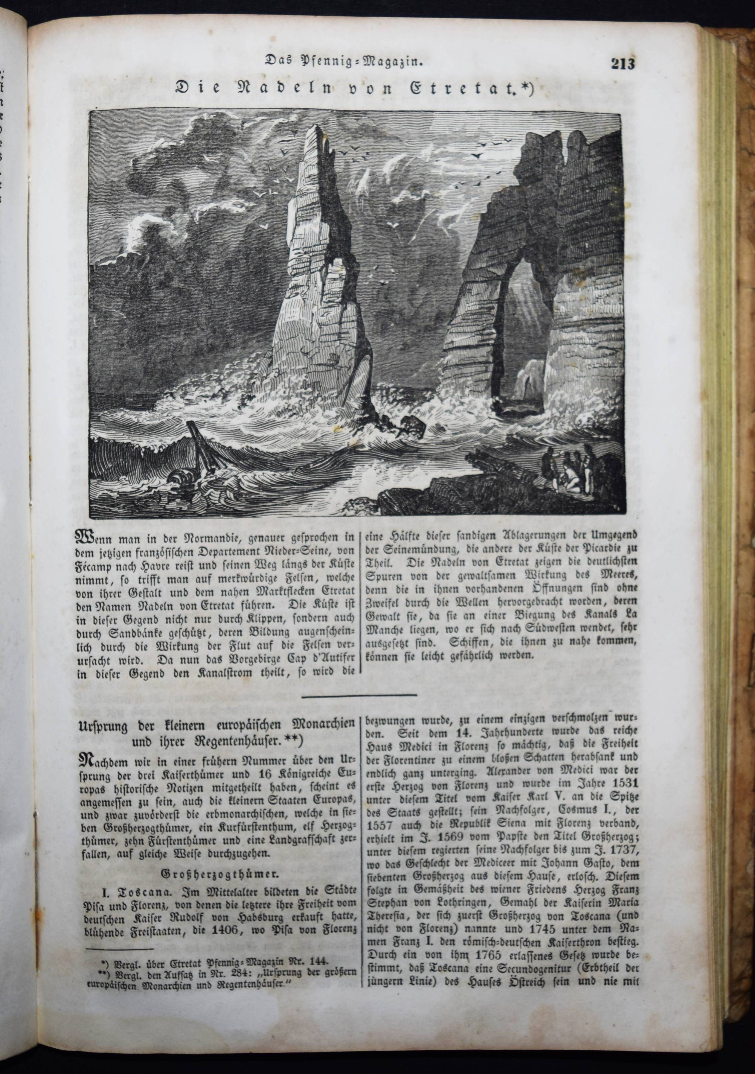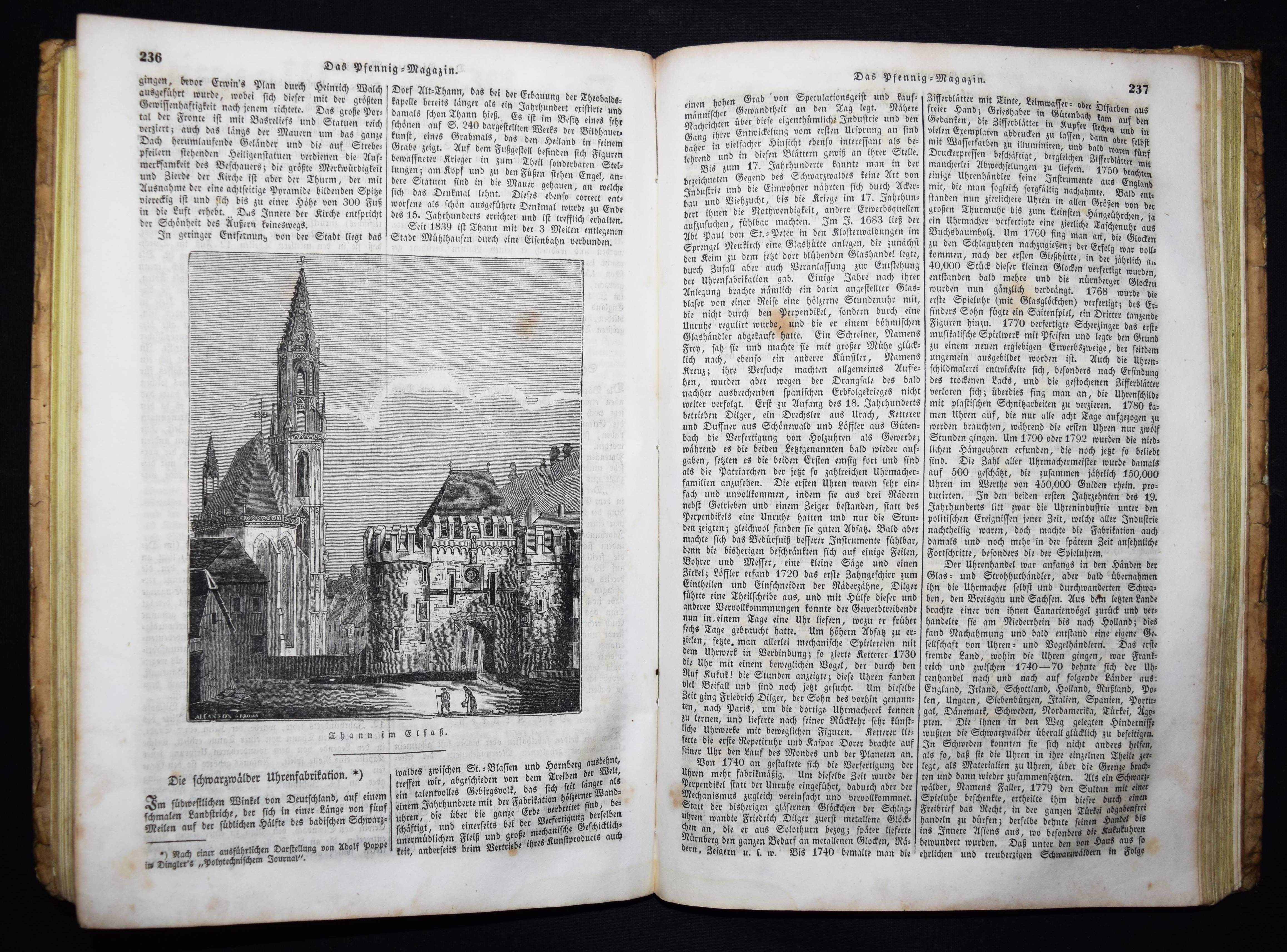 Daguerreotypie – Das Neueste aus der Natur- und Gewerbewissenschaft. In: Das Pfennig-Magazin der Gesellschaft zur Verbreitung gemeinnütziger Kenntnisse. Achter Band (Jahrgang), Nr. 360, 22. Februar 1840, S. 58-60 und Nr. 386, 22. August 1840, S. 268-271. Nr. 353-404 in 1 Band. Leipzig, F. A. Brockhaus 1840. Gr.-8°. VIII, 416 S. mit zahlr. Holzschnitten. Typogr. OPbd. Kirchner 10840. – Interessanter Artikel über die Anwendung der Galvanoplastik zur Bildreproduktion, welche der deutsch-russ. Physiker Moritz Hermann v. Jacobi (1801-1874) 1837 erfunden hatte. „… zur ausgedehnten Anwendung der interessanten Jacobini’schen Erfindung … Unmittelbar neben dem Liepmann’schen Öldrucke, … steht die freilich noch viel wundervollere Daguerre’sche Heliographie photogenischer Bilder… Wir rechnen dahin ganz besonders ein vom Dr. Schafhäutl aus München zu London producirtes Verfahren, Lichtbilder, zwar auch, wie bei Daguerre, mittels der Camera obscura, aber durch Anwendung ganz anders zubereiteter Platten zu erlangen … die chemische Präparation dieser gegen alles Licht so äußerst empfindlichen Platten auch in dem nämlichen Maße mühsam und kostbar sein, weshalb er auch noch auf eine Vereinfachung sinnt; gelingt ihm diese, so hat sein Verfahren offenbar vor dem Daguerre’schen unendlich viel voraus“ (S. 59). Außerdem über weitere Verbesserungen der Daguerreotypie. Der Artikel behandelt nach einem Exkurs über die elektrische Telegrafie in der Fortsetzung weitere wichtige Aspekte und Entwicklungen des „Daguerre’schen Verfahrens“. – „Daguerre’s große optische Erfindung gewährt in täglich wachsender Vervollkommnung wirklich auch bereits täglich bedeutenden Gewinn. Schon jetzt findet man überall Daguerre’sche Lichtbilder, welche durch die bewunderswürdigste Treue, durch die Deutlichkeit und Nettigkeit der Ausführung jede andere Darstellungsweise weit hinter sich zurücklassen“ (S. 268). – Der Jahrgang enthält außerdem einen Artikel: ″Himly’s Lichtbilder.″ (Nr. 357, S. 70/71) über ein neues fotografisches Verfahren des Göttinger Chemikers August Friedrich Karl Himly (1811-1885) der, unabhängig von Hippolyte Fizeau, zur Verbesserung der Daguerreotypie einen Goldüberzug entwickelte. – Einband angestaubt, berieben u. bestoßen, hinterer freier Vorsatz fehlt, Rücken am Fuß restauriert, teils gebräunt und stellenweise braunfleckig, sonst gut erhalten.
