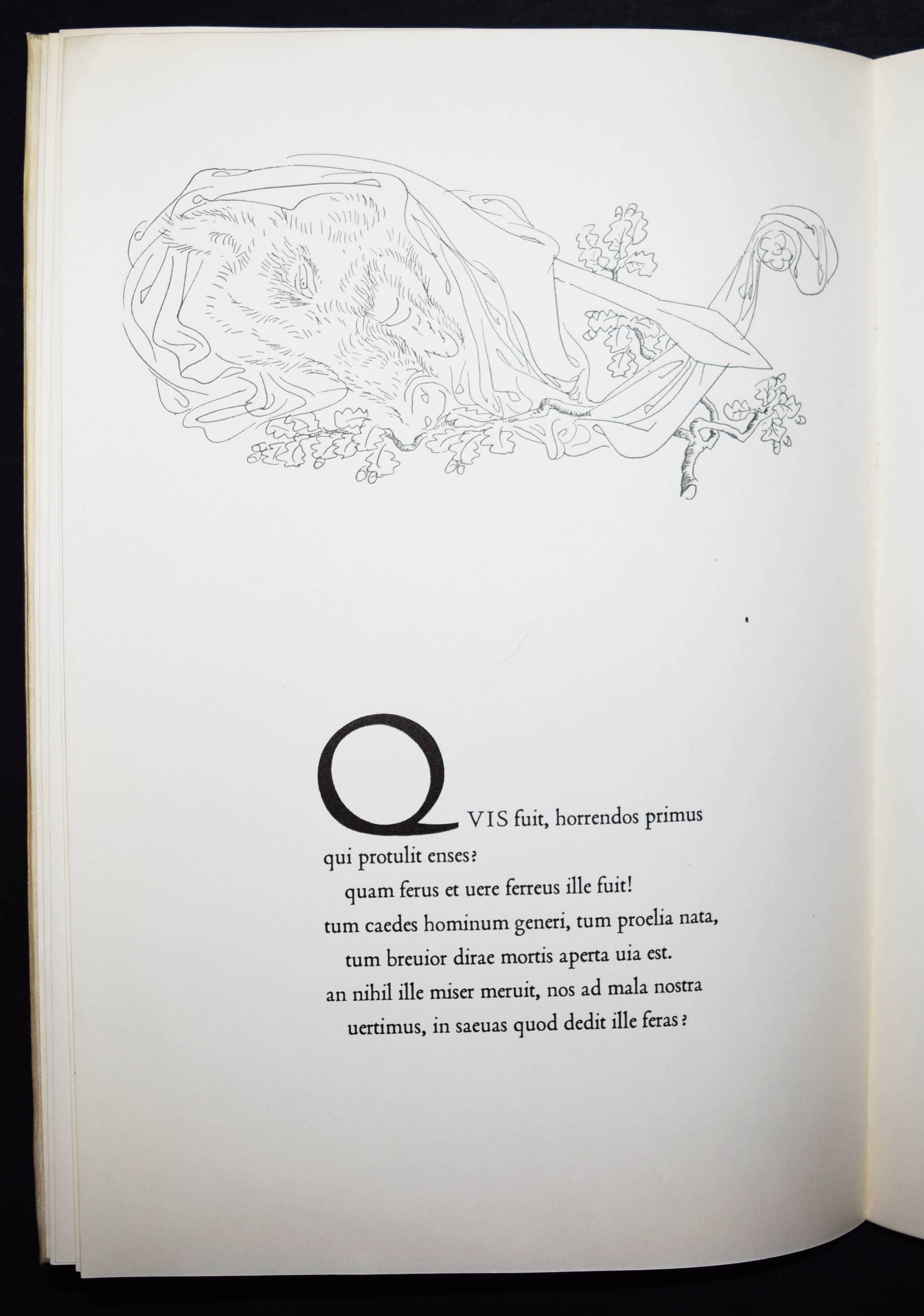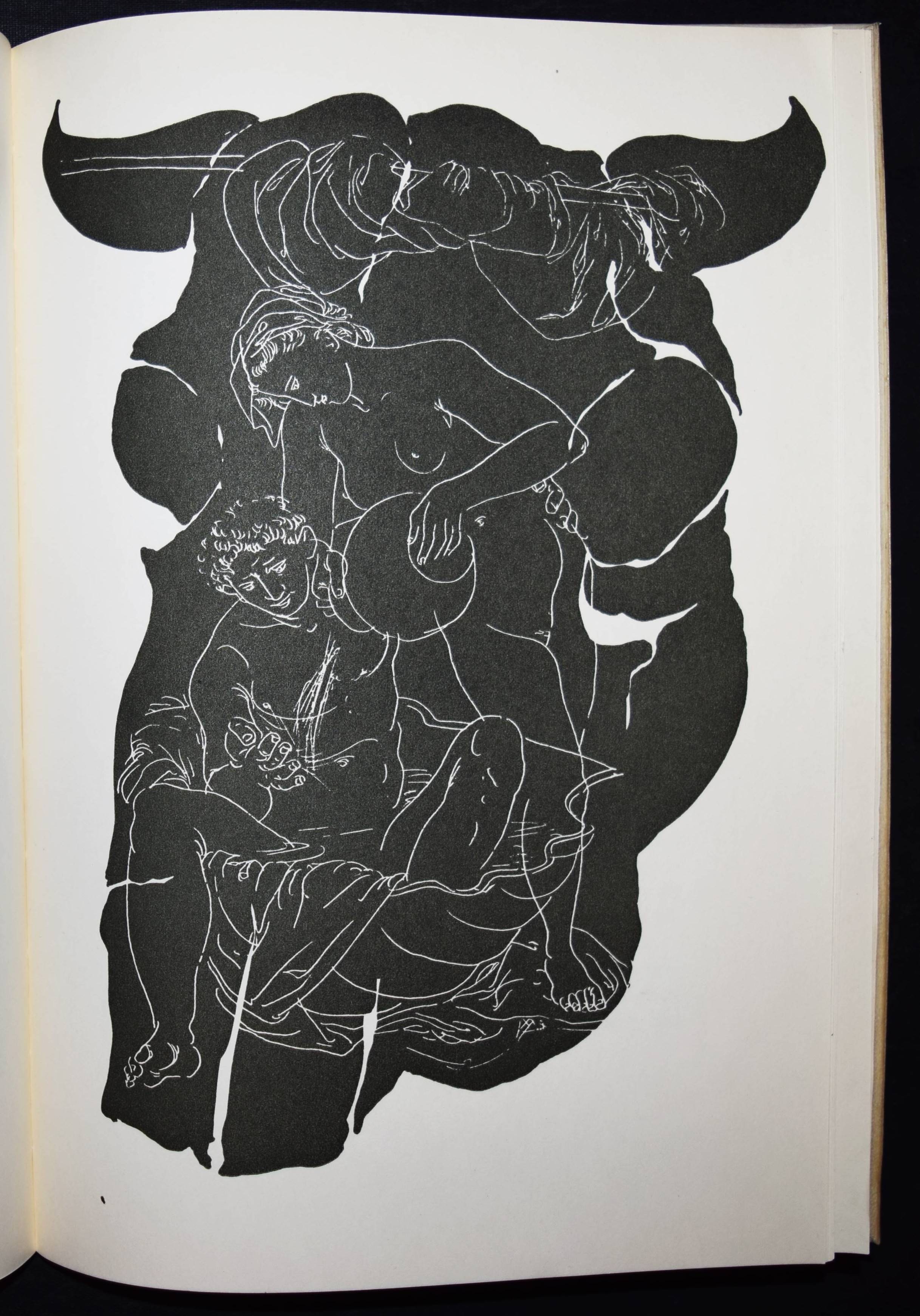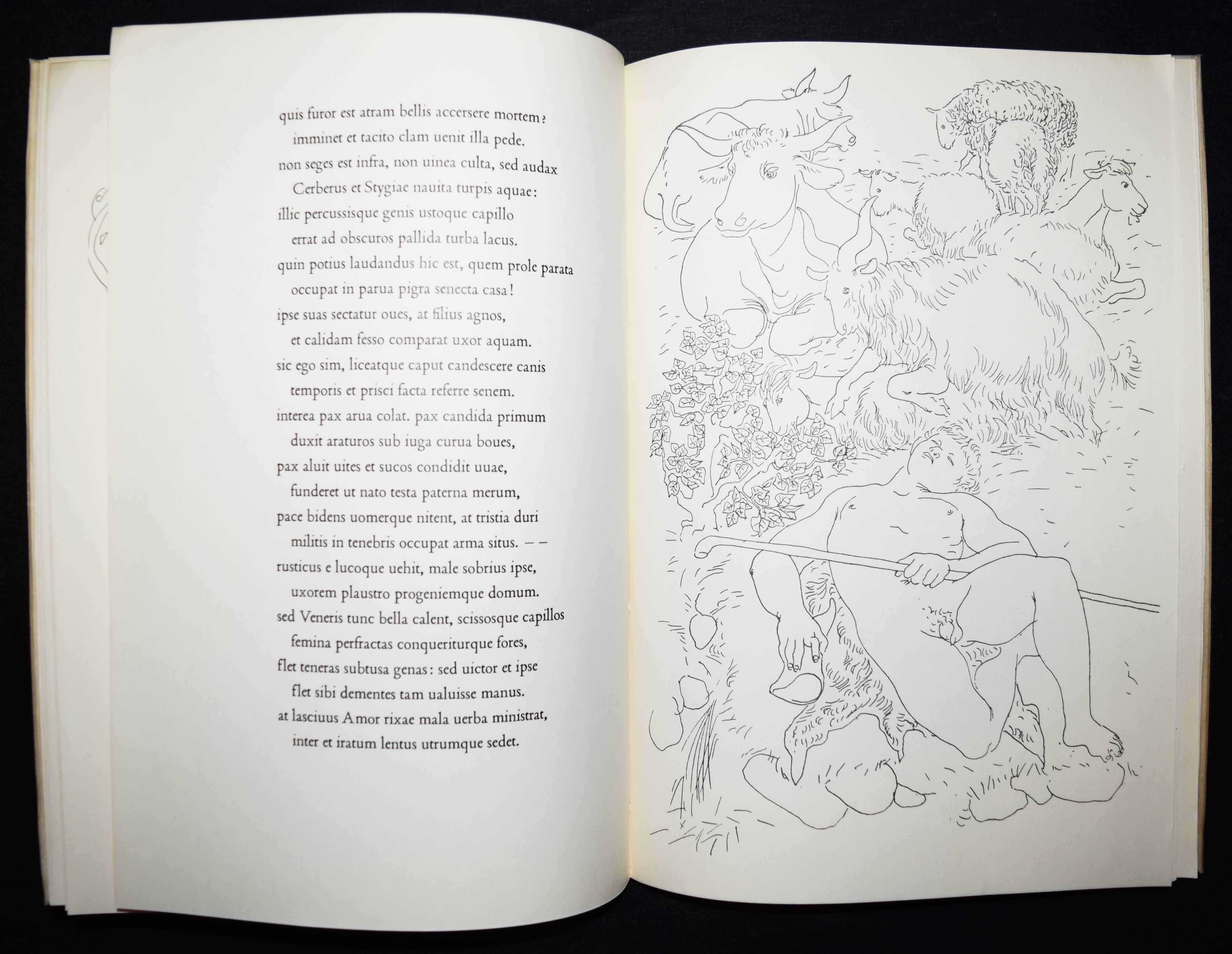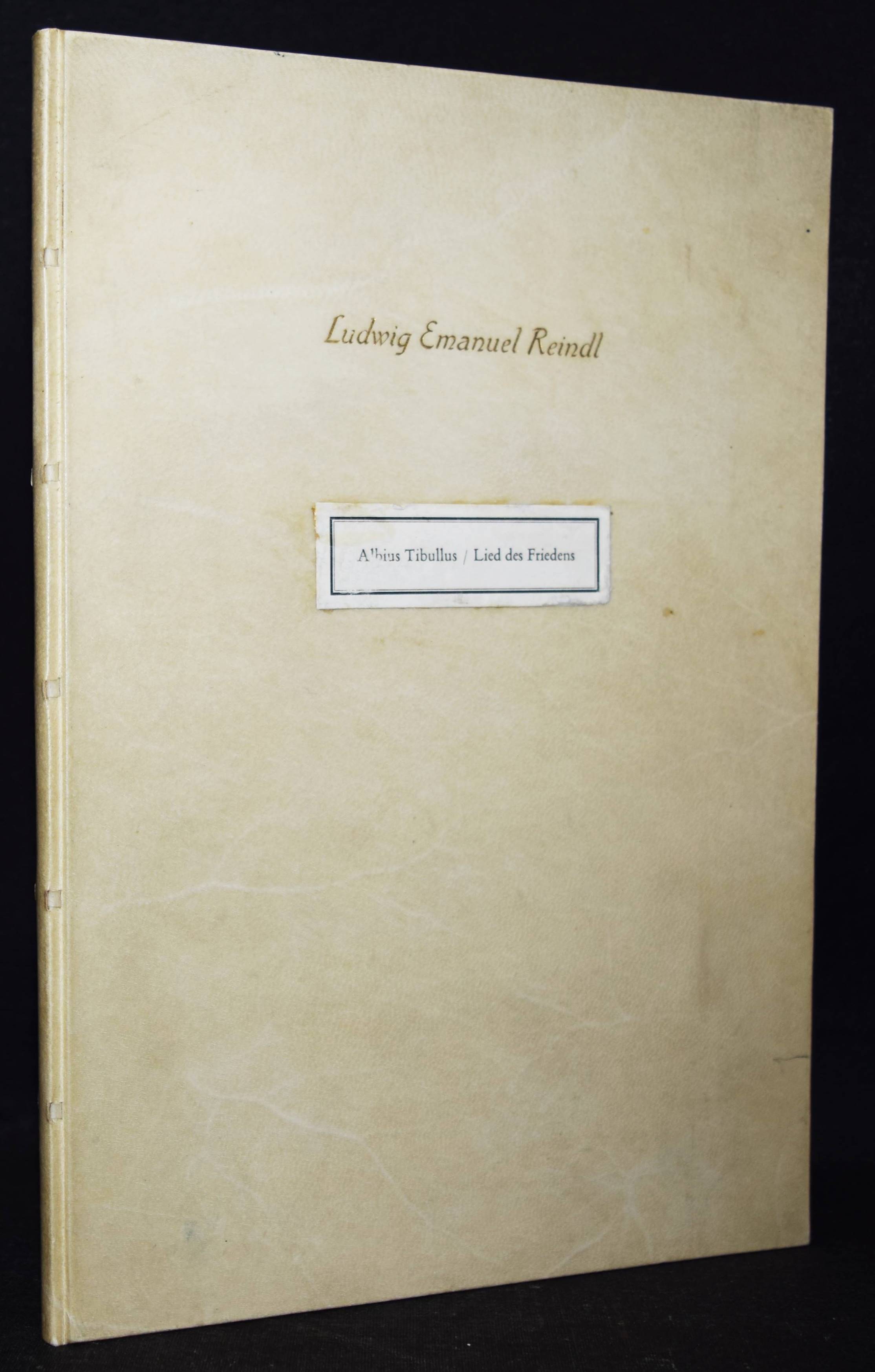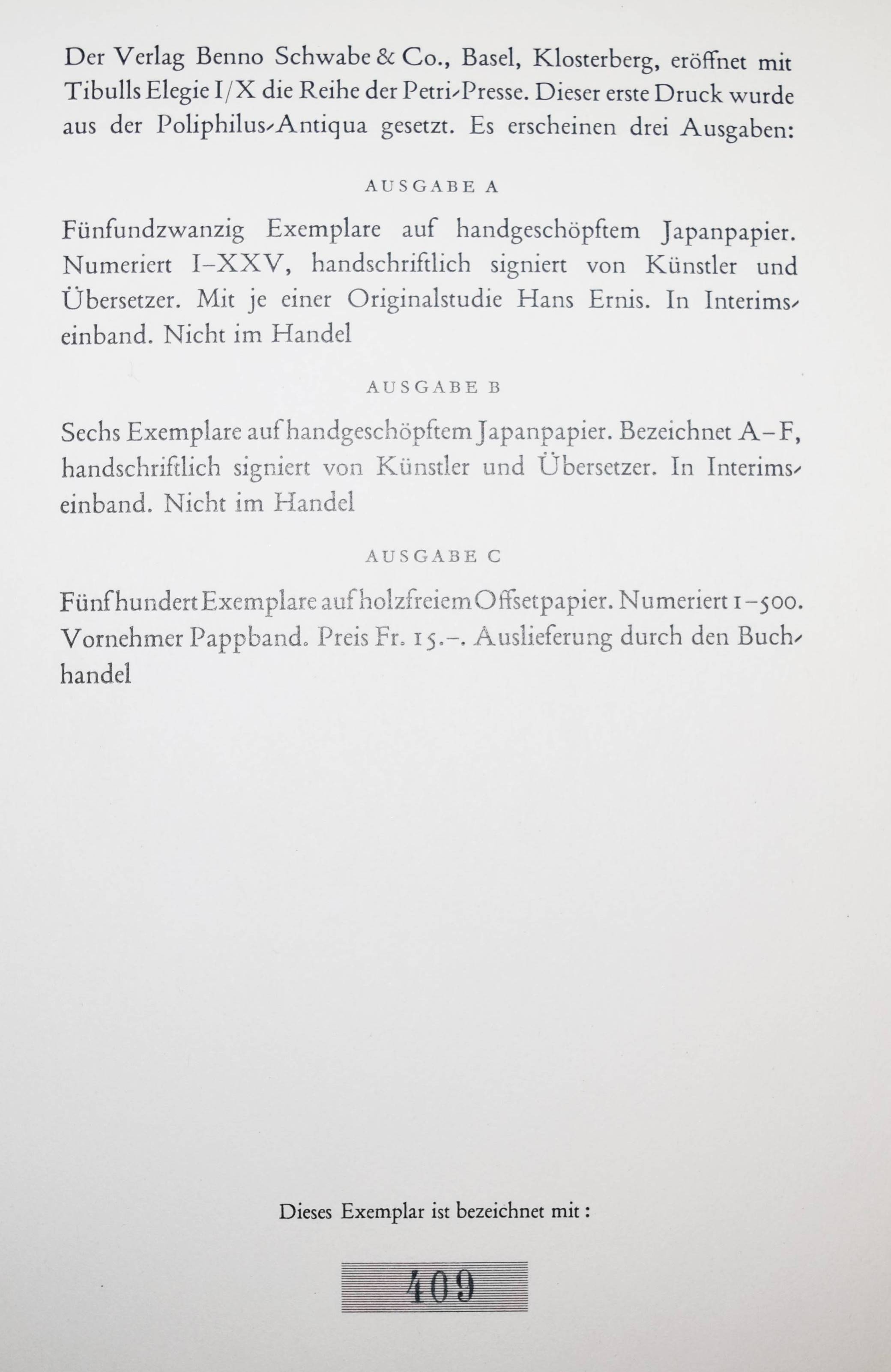 Erni – Tibullus, Albius. Lied des Friedens. Elegie 1-10. Lateinisch und Deutsch. Übersetzung und Geleitwort von Walter Wili. Illustriert mit Original-Zinkzeichnungen von Hans Erni. Basel, Schwabe (1942). 4°. [19] Bl. mit 13 (8 ganzs.) Zinkätzungen in Rot u. Schwarz. Prgt. d. Zt. mit Deckelschild u. goldgepr. Namenszug des Vorbesitzers. (Erster Druck der Petri-Presse). Tiessen II, 2. – Eines von 500 num. Exemplaren der Ausgabe C. – Von Hans Erni signiert. – Dekorativ gebundenes Exemplar aus der Bibliothek des Schriftstellers Ludwig Emanuel Reindl (1899–1983) mit dessen goldgeprägten Namenszug auf dem Deckel.