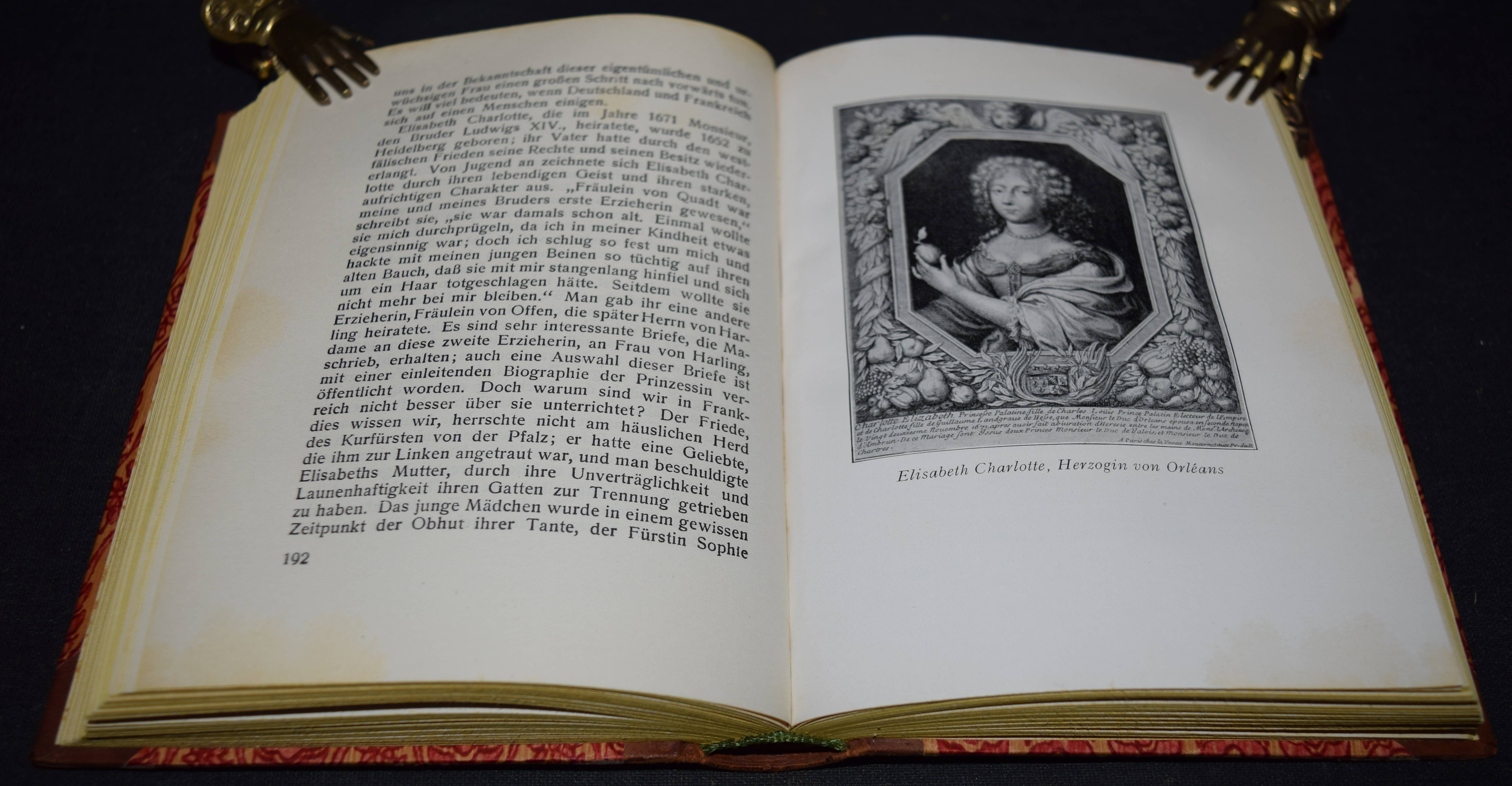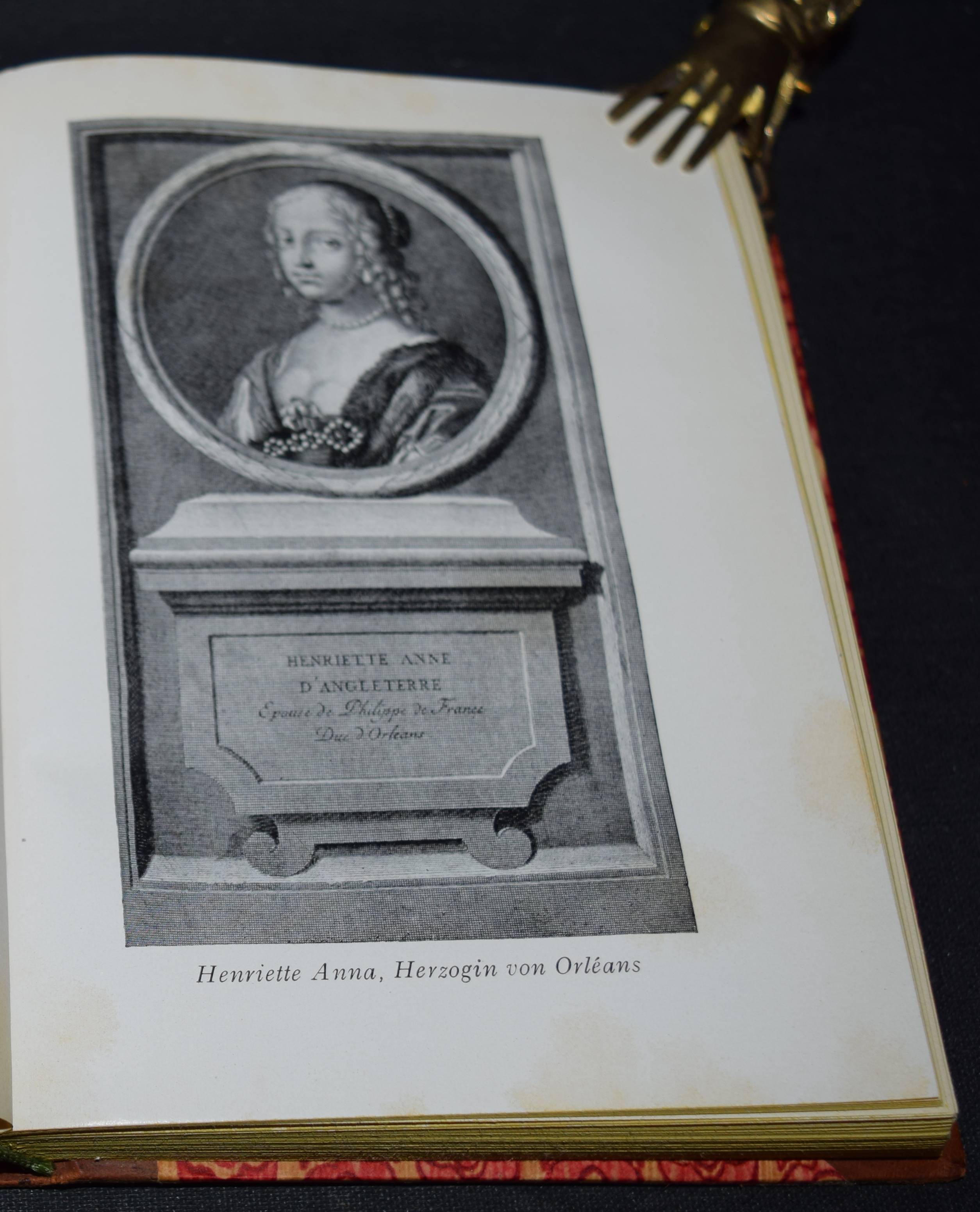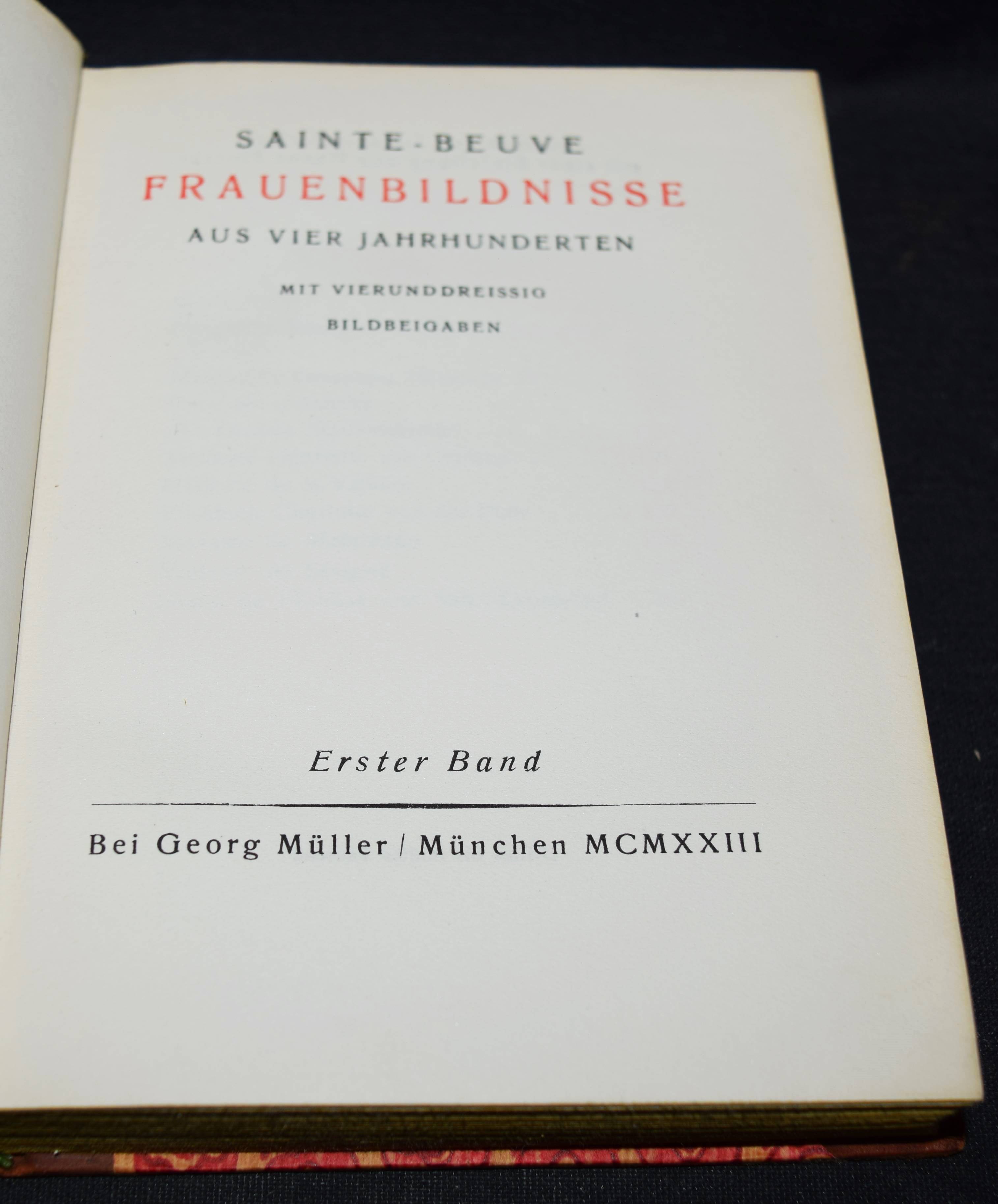 Sainte-Beuve, (Charles Augustin). Frauenbildnisse aus vier Jahrhunderten. (Deutsch von Stefanie Strizek mit einer Einleitung von Hanns Floerke). 3.-5. Tsd. 2 Bände. München, Georg Müller 1923. Kl.-8°. XV, 321, (3) S.; XVIII, 390 S. mit 34 Porträts. OHldr. mit goldgepr. Rückensch. u. dekorativer Rückenverg. Mit 22 Biographien, darunter Maria Stuart, Henriette von Orléans, Elisabeth Charlotte von der Pfalz, Ninon de l’Enclos, Marquise von Caylus, Madame de Pompadour, Marie Antoinette, Maria Antoinette, Maria Theresia und Bettina von Arnim. – Gelenke tewas berieben, Vorsätze u. Tafeln etwas braunfleckig, N.a.V., sonst gut erhalten.