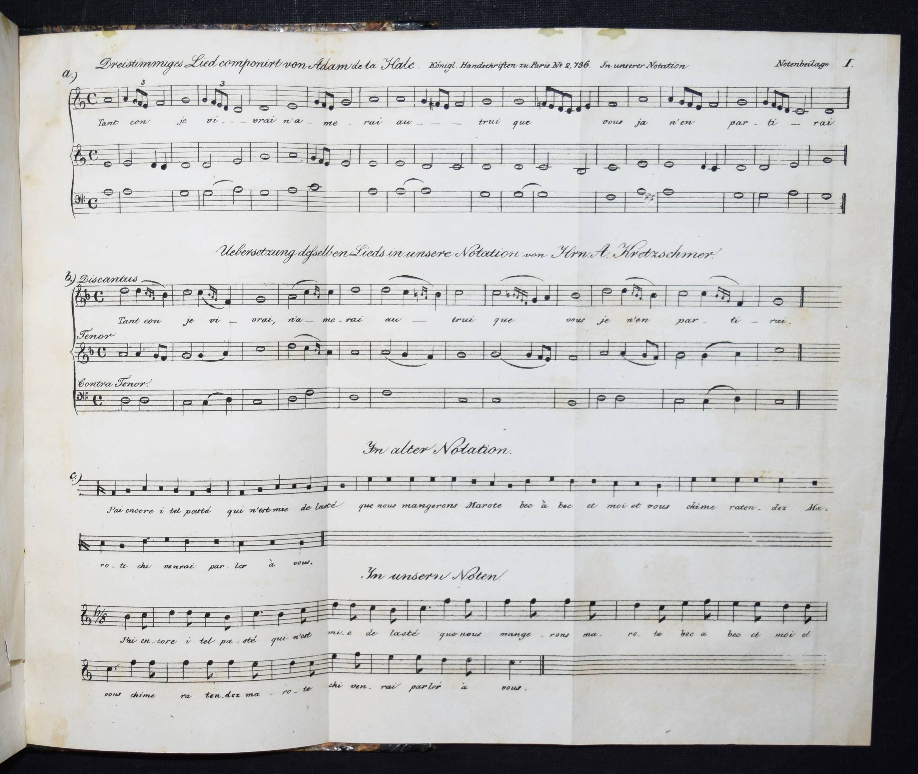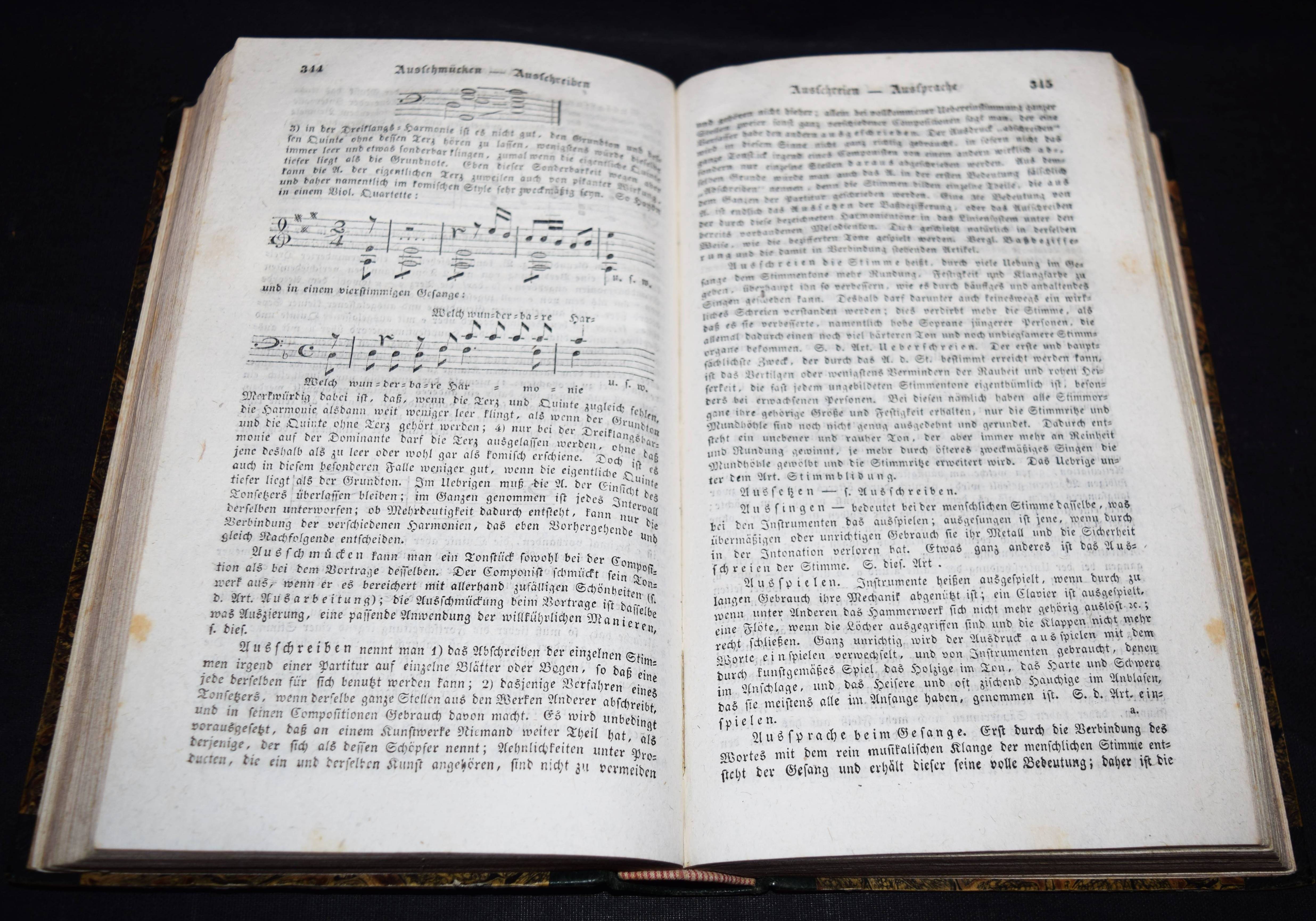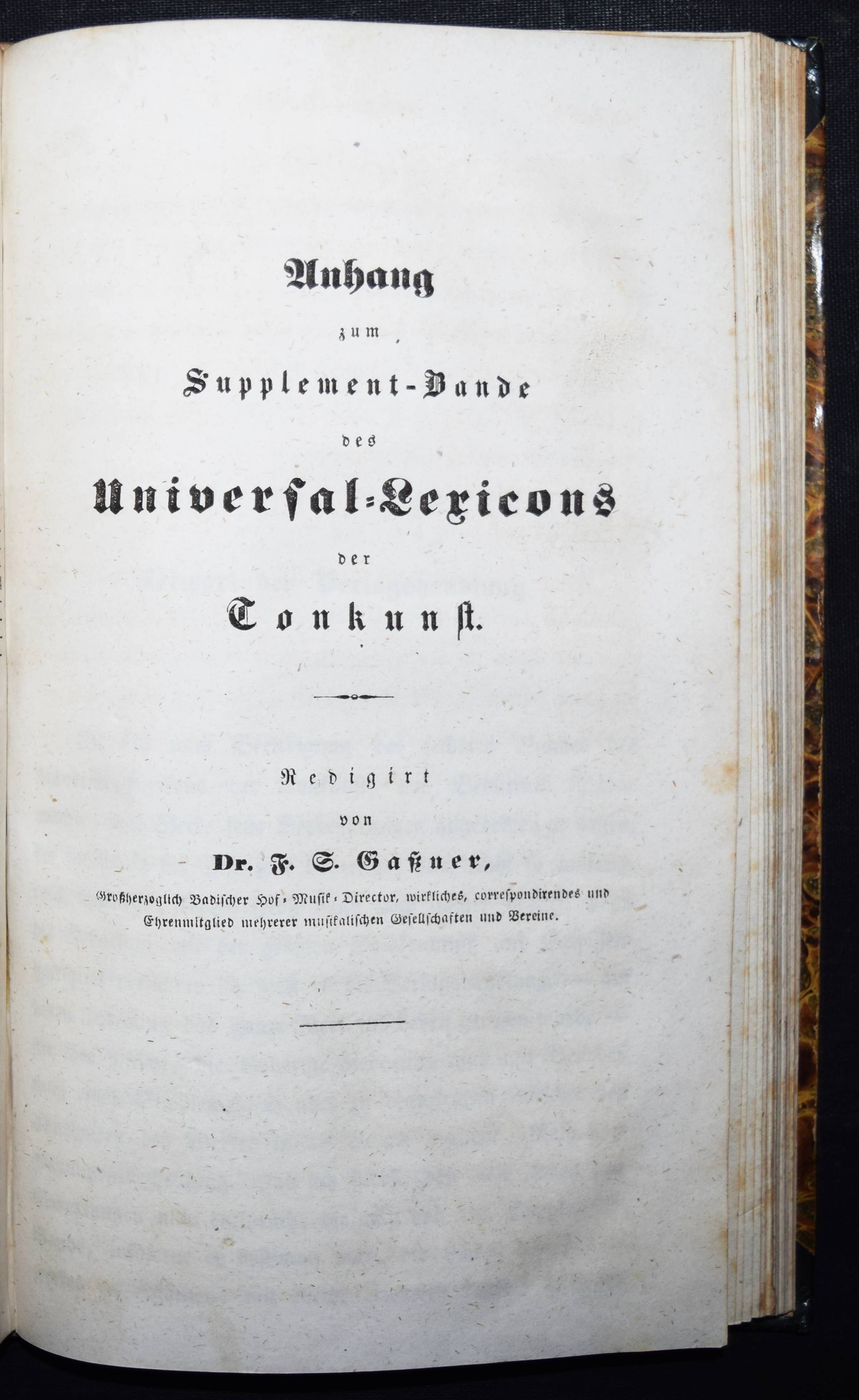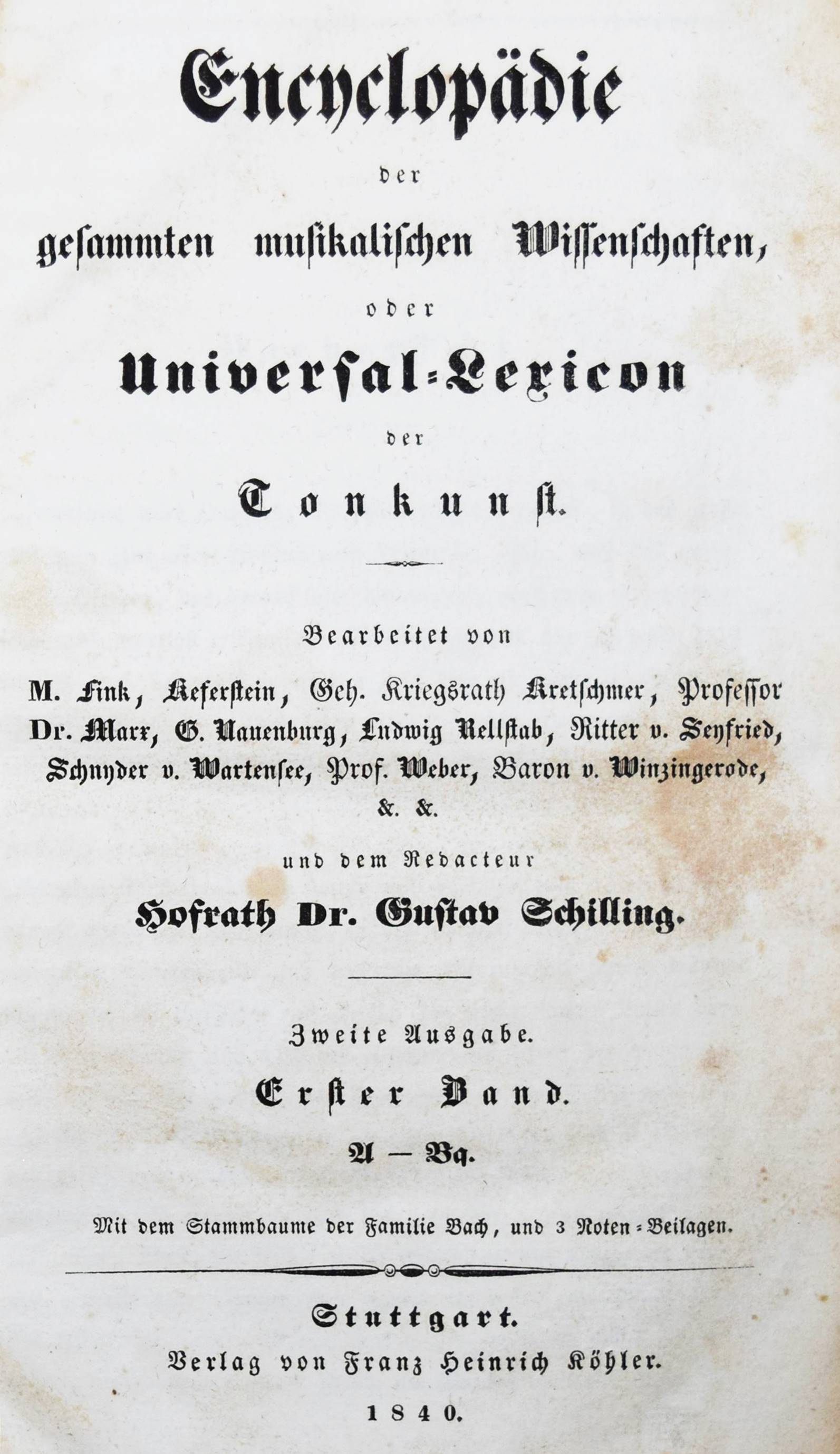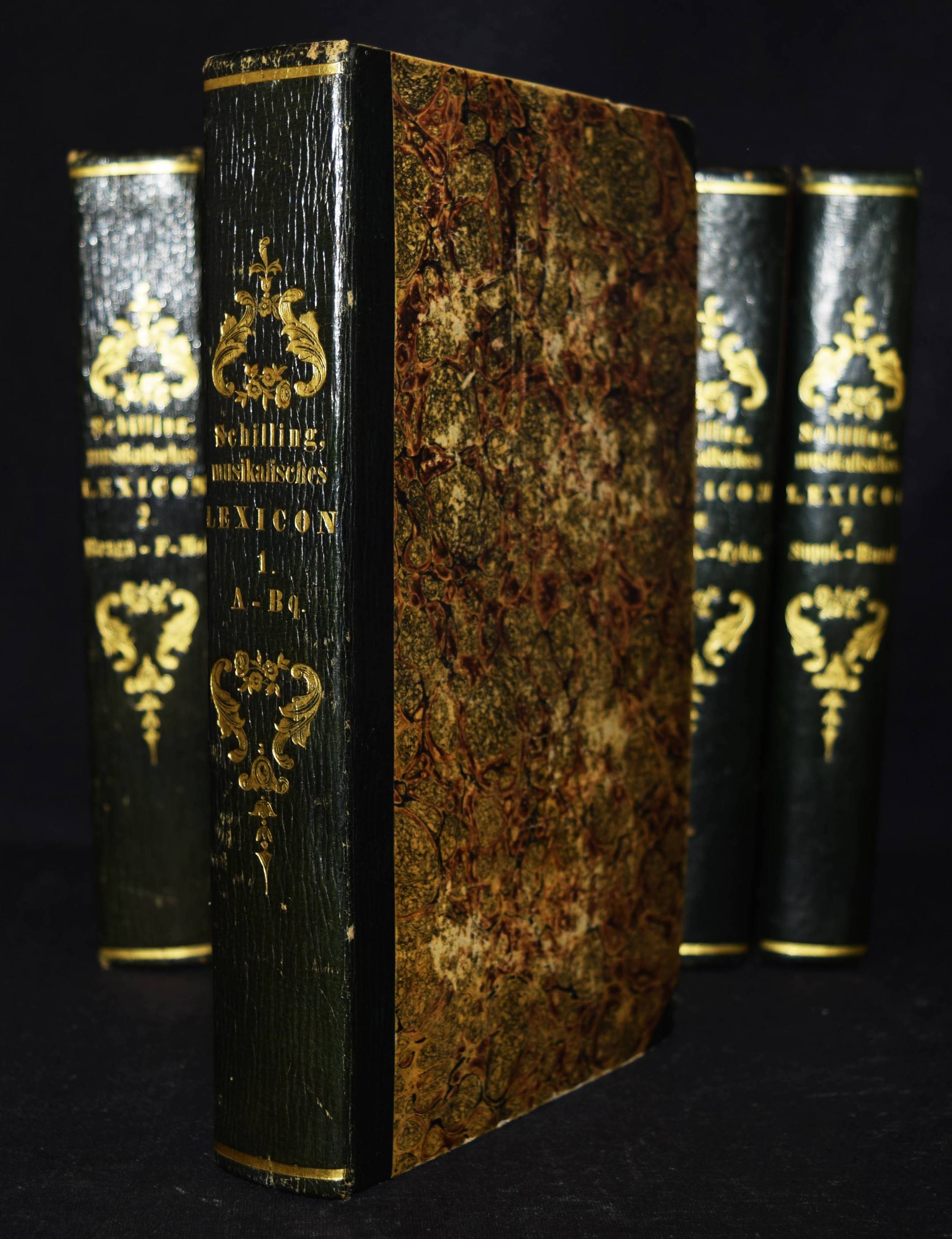 Schilling, Gustav (Red.). Encyclopädie der gesammten musikalischen Wissenschaften, oder Universal-lexicon der Tonkunst. Bearbeitet von (Gottfried Wilhelm) Fink, Referstein, (Andreas) Kretschmer, Marx, G.Nauenburg, Ludwig Rellstab, Ritter v. Seyfried, Schnyder u. Wartensee, Weber, Baron v. Winzingerode &. &. 7 Bände. Stuttgart, franz Heinrich Köhler 1840-1842. 8°. Mit 1 gefalt. lithogr. Stamm-Tafel der Familie Bach, 7 (2 gefalt.) Musikbeilagen u. zahlr. Notenbeispielen. Halblederbände der Zeit mit goldgepr. Rückentiteln u. dekorativer Romantikervergoldung. Wolfheim I, 384. Vgl. Zischka 161. – Erste vollständige Ausgabe mit dem oft fehlenden Supplementband, dem Anhang dazu von F. S.Gaßner und dem Generalregister. – „Der Wert der Encyclopädie liegt, abgesehen von etlichen Sachartikeln der Mitarbeiter, vornehmlich in den Biographien zeitgenössischer Musiker“ (MGG). Der seltene Supplementband enthält auch eine Autobiographie von G. Schilling (1803-1881), der seine eigenen Beiträge mit „D. Sch.“ kennzeichnete. – Die ersten Lieferungen erschienen schon 1834, das Titelblatt des 1. Bandes trägt aber die Jahreszahl 1835. Der 6. und letzte Band kam bereits 1838 heraus und 1840 bis 1842 erschien eine neue Titelausgabe, mit einem Supplementbande vermehrt. … S. Verstand es vortrefflich, sein Licht vor den hohen Herren leuchten zu lassen … 1835 verlieh ihm der König von Preußen die große goldene Medaille für Verdienste um Kunst und Wissenschaft, 1839 erhielt er vom Belgier dieselbe Auszeichnung, 1840 ernannte ihn der Fürst von Hohenzollern-Hechingen zum Hofrath“ (R. Eitner in ADB, 256 ff.). – Stellenweise braunfleckig, sehr gutes dekorativ gebundenes Exemplar.