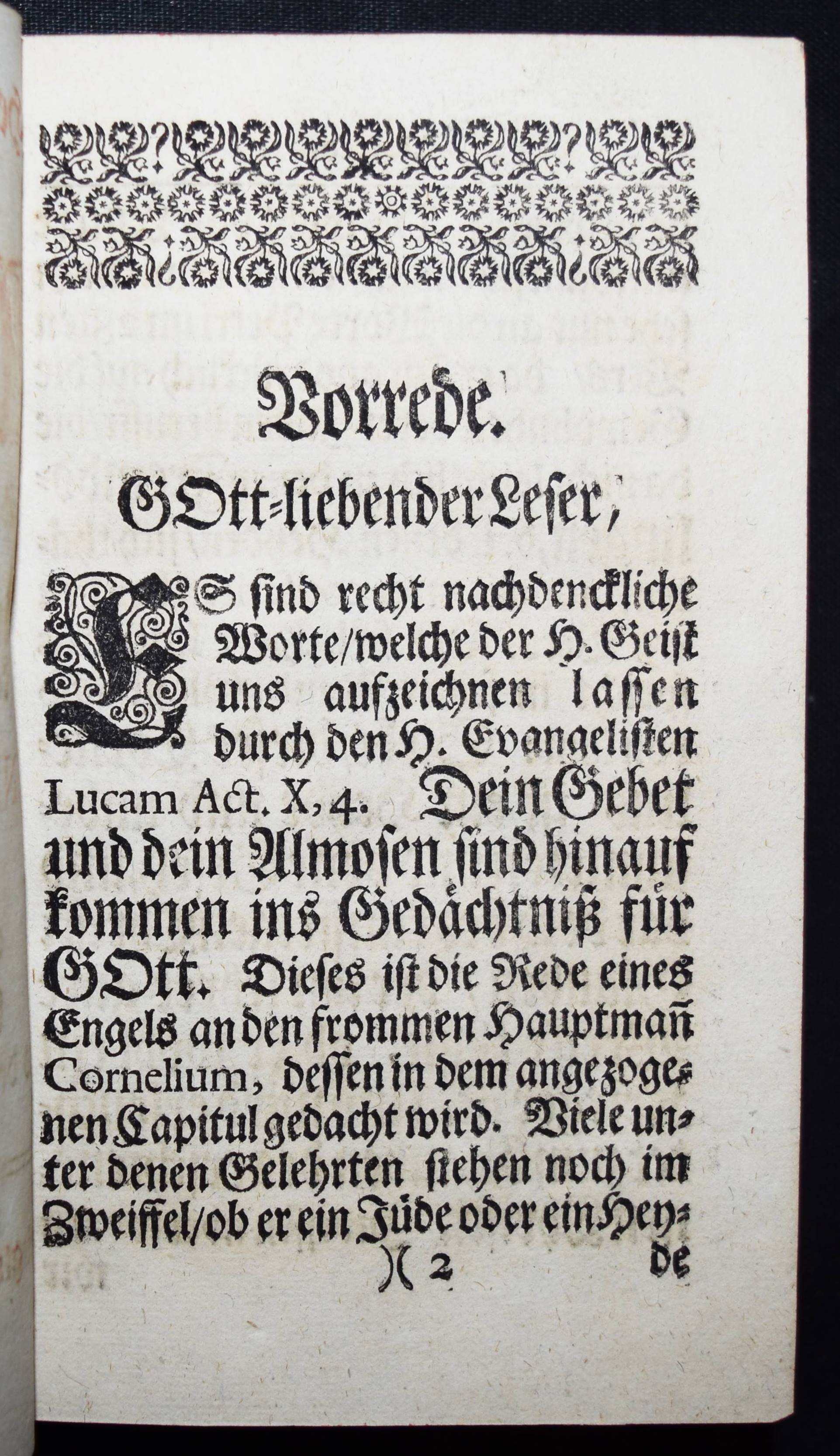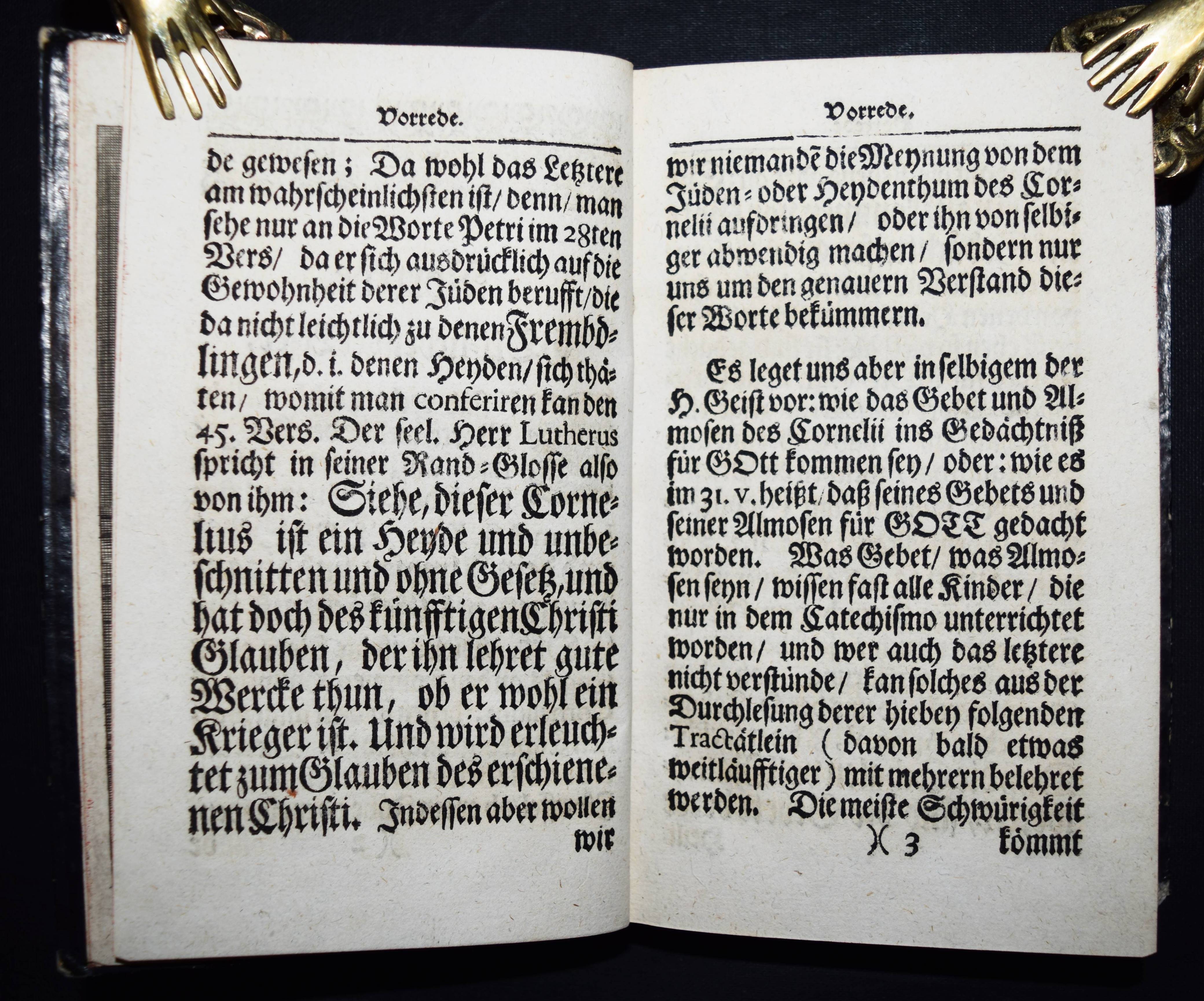 La Placette, Jean. Vier Bücher vom Almosen. Nebst dessen Beweis, daß die Therapeutæ, Deren Philo gedencket, keine Christen gewesen, Deme beygefügt Henrici Hammondi Gedancken Vom Almosen. Aus dem Frantzösischen und Engelischen ins Teutsche übersetzt. Franckfurt u. Leipzig, Boetius 1717. 8°. Gestoch. Frontispiz, [13] Bl., 288, 32 S., [5] Bl. mit Titel in Rot und Schwarz. Pbd. d. 19. Jahrhunderts. Hoefer XXIX, 55. VD18 11312343. Nicht bei Fromm. – Erste deutsche Ausgabe. – Der franz. Theologe J. La Placette (1639-1718) emigrierte wegen der Hugenotten-Verfolgung um 1685 über Preußen und Königsberg nach Kopenhagen, wo er fast 25 Jahre verbrachte. Später ging er als Missionar in die Niederlande; er starb 1718 in Utrecht. Die französischen Originalausgaben seiner zahlreichen Schriften erschienen meist in Amsterdam und Den Haag. – Der Anhang enthält eine thematisch verwandte Arbeit des englischen Theologen Henry Hammond (1605-1660). – Einband geringf. berieben, sehr gutes sauberes Exemplar.