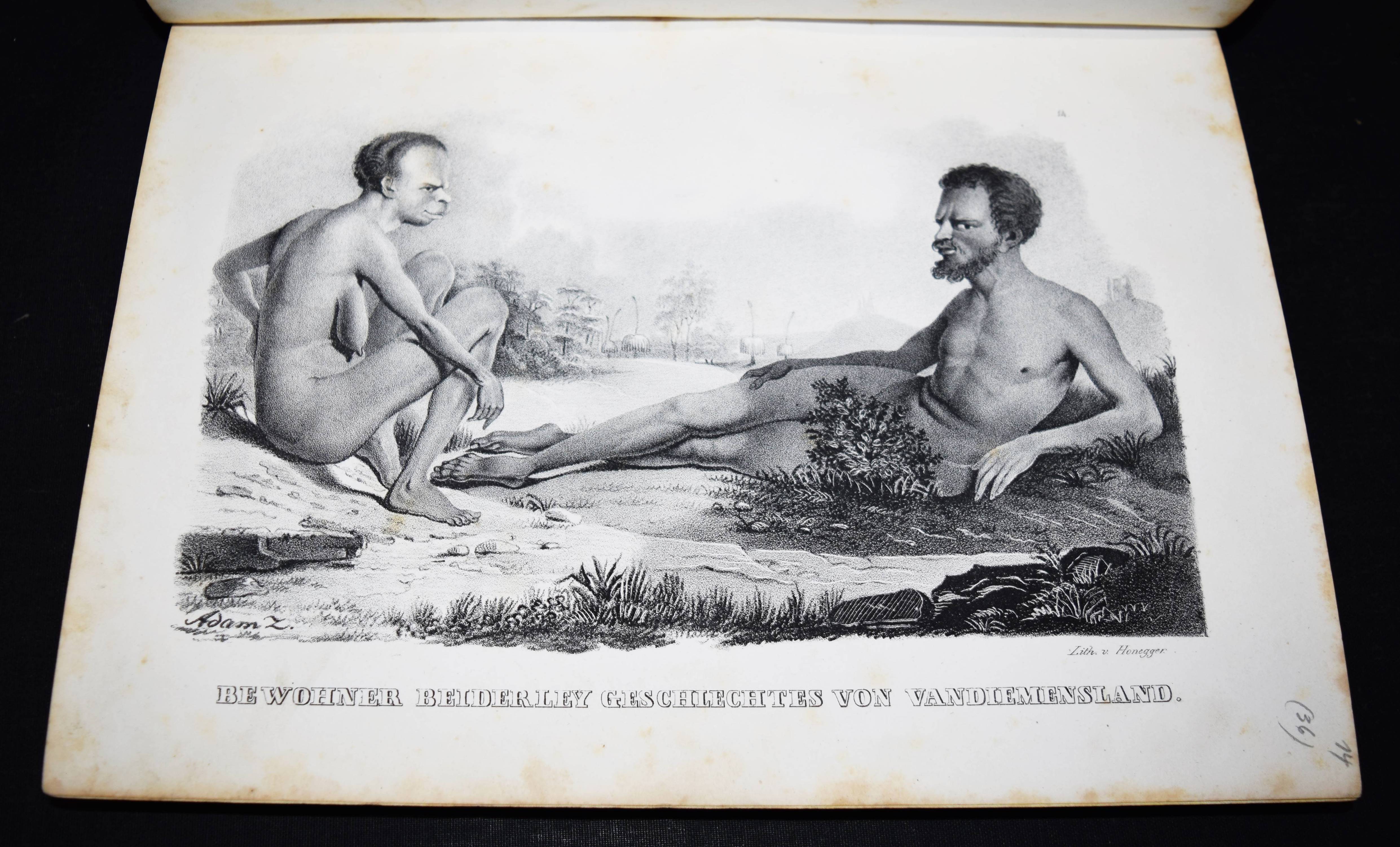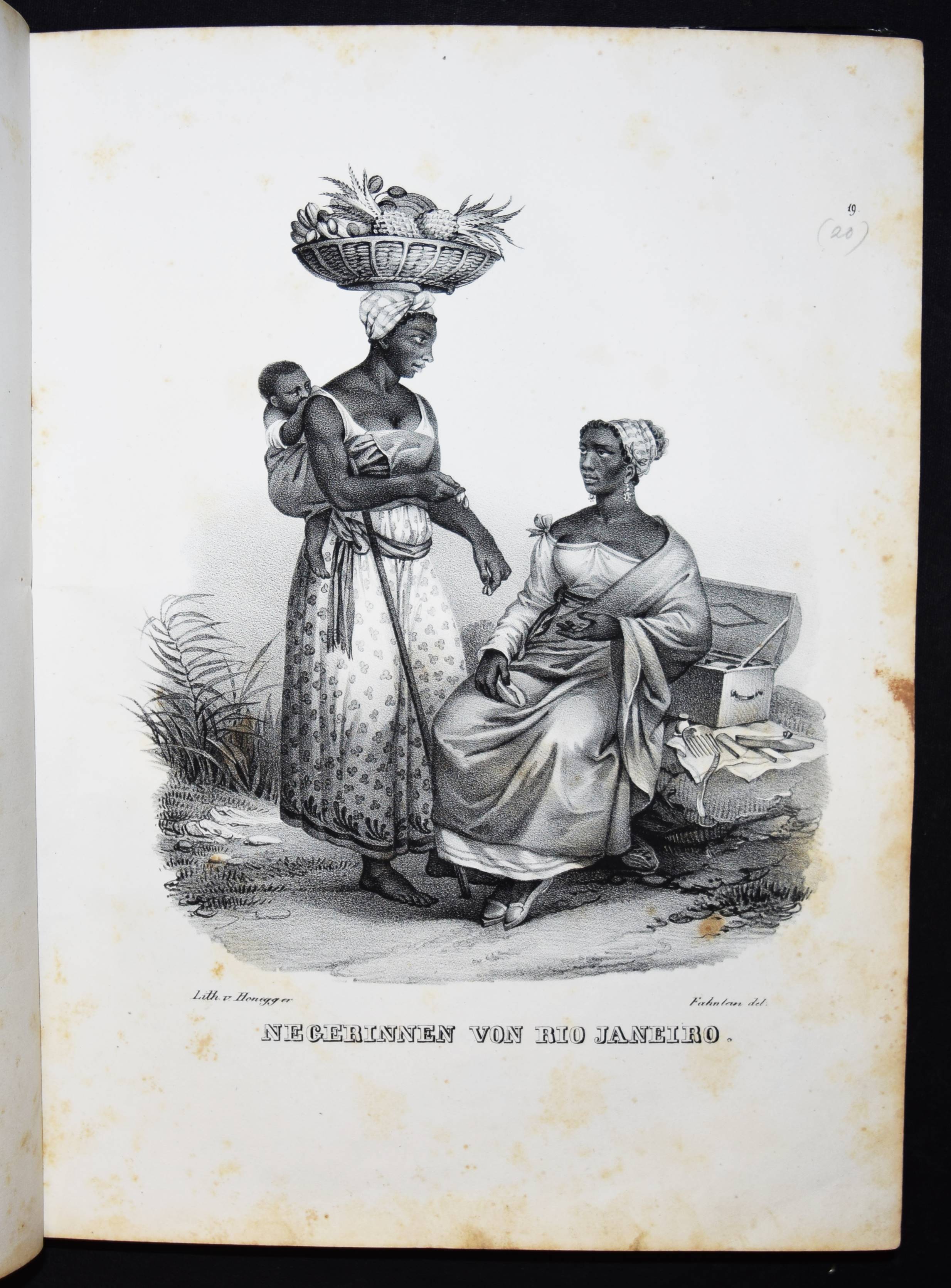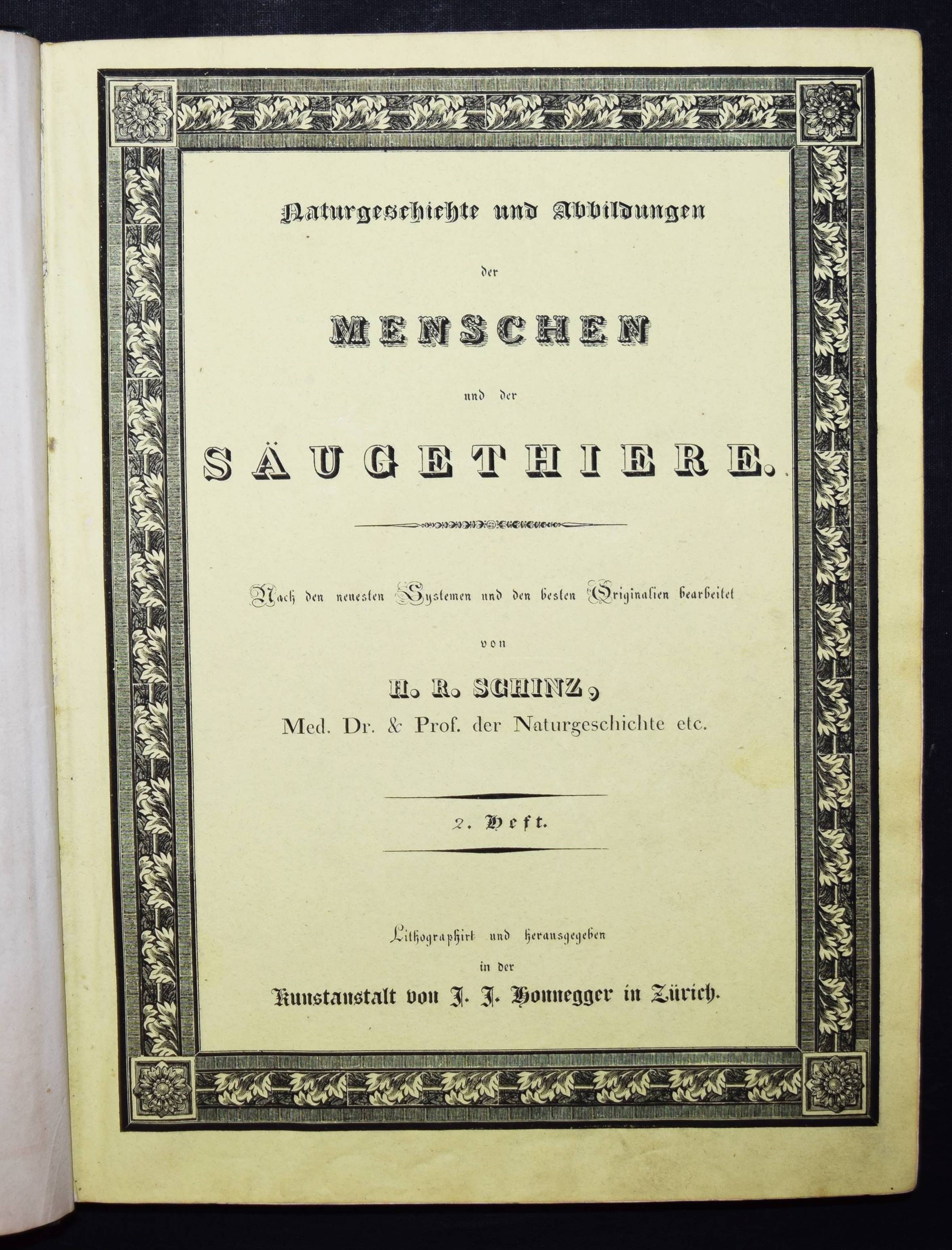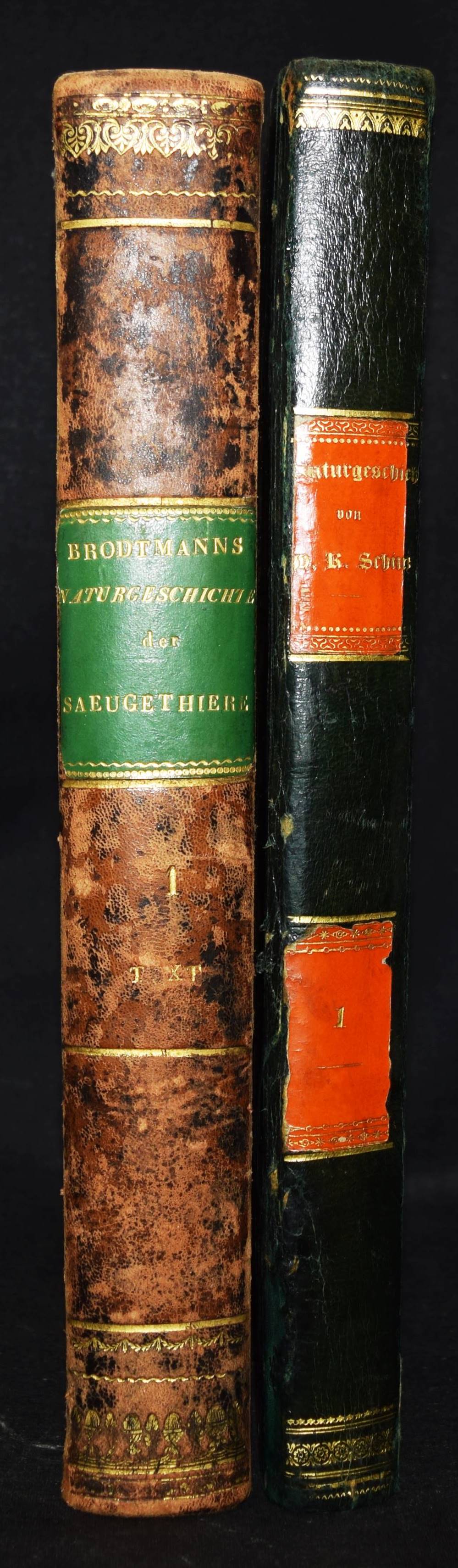 Schinz, H(einrich) R(udolf). Naturgeschichte und Abbildungen der Menschen und der Säugethiere. Nach den neuesten Systemen und den besten Originalen bearbeitet. Band I u. II, 1 (von 3). Zürich, Brodtmann u. J. J. Honnegger 1824 u. (1834). Gr.-4° (33 x 24 cm.). [4] Bl.; 124 S. mit 63 lithogr. Tafeln von Fuchs, Scheuchzer, Wegner, Balder u. a.; VI, 417 S. Halblederband der Zeit mit goldgepr. Rückensch. u. dezenter Rückenverg. (Band I mit beigebundenen vord. Orig.-Lieferungsumschlag, „2. Heft“) Leemann-van Elck, Die zürcherische Buchillustration von den Anfängen bis um 1850, S. 207. Nissen, ZBI 3673 (Band II in 2. Ausg. von 1840). – Eines der schönsten Werke zur Naturgeschichte des 19. Jahrhunderts. – Ohne den Tafelband von Brodtmann zu den Säugetieren. – Die schönen Tafeln zeigen verschiedene Menschenrassen in ihren Trachten, darunter deutsche und ausländische Fürsten und Eingeborene aus allen Kontinenten (Georgier, Chinesen Tchonka spielend, Einheimische aus Mosambique und Bahia, Hottentotten, Patagonier, Javaner, Eskimos und Neuseeländer sowie Cooks „Auslandung zu Tannau“. Eine Tafel mit nordamerikanischen Indianern, gezeichnet von Karl Bodmer (1809-1893), der von 1832 bis 1834 mit Maximilian, Prinz zu Wied, das Innere Nordamerikas bereiste und mit Schinz in wissenschaftlichem Kontakt stand). – Heinrich Rudolf Schinz (1777-1861) kehrte nach seinem Studium der Medizin in Würzburg und Jena nach Zürich zurück. Er war Lehrer und auch Rektor der Industrieschule, Prof. für Zoologie an der neugegründeten Universität Zürich, Begründer und Konservator der Zürcher Zoologischen Sammlung, Oberrichter, Grossrat, Präsident der Naturforschenden Gesellschaft Zürich, Initiant, Mitgründer und später Präsident der Schweiz. Naturforschenden Gesellschaft. – Abweichend gebunden, Einbande etwas berieben, Band I ohne den lithogr. Titel, die Tafeln im Rand teils stärker finger- und braunfleckig, sonst nur stellenweise etwas braunfleckig und gebräunt, sonst gut erhalten.