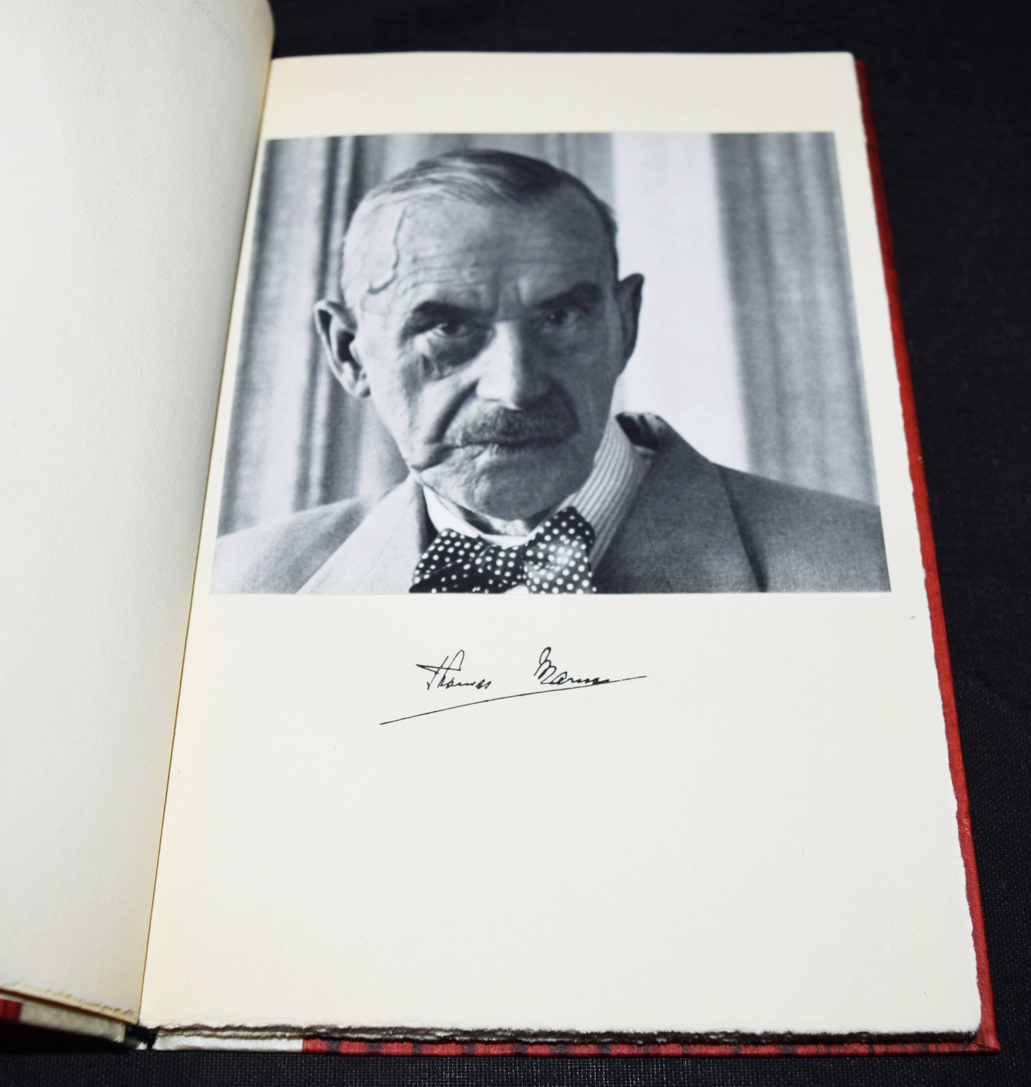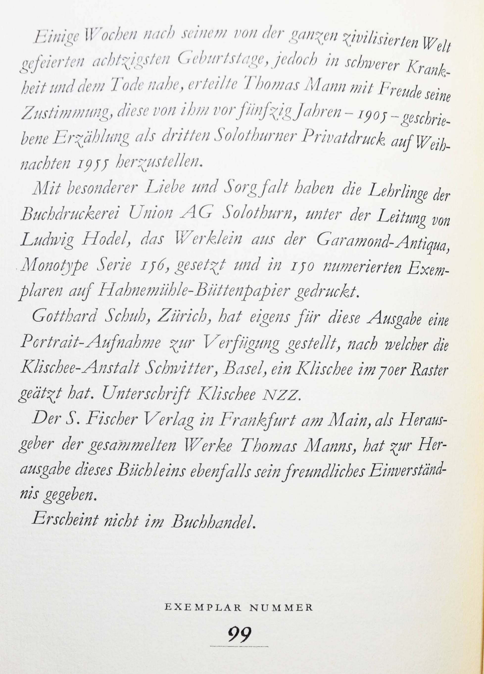 Mann, Thomas. Tristan. Solothurn 1955. 8°. 76 S., 1 Bl. mit mont. Porträt von Gerhard Schuh und faksimilierter Signatur von T. Mann. OHprgt. mit goldgepr. Rückentitel. (Dritter Solothurner Privatdruck). Potempa E 13.9. – Eines von 150 Exemplaren. – „Einige Wochen nach seinem von der ganzen zivilisierten Welt gefeierten achtzigsten Geburtstage, jedoch in schwerer Krankheit und dem Tode nahe, erteilte Thomas Mann mit Freude seine Zustimmung, diese von ihm vor fünfzig Jahren – 1905 – geschriebene Erzählung als dritten Solothurner Privatdruck auf Weihnachten 1955 herzustellen“ (Druckvermerk). – Private Widmung a. V., schönes Exemplar.