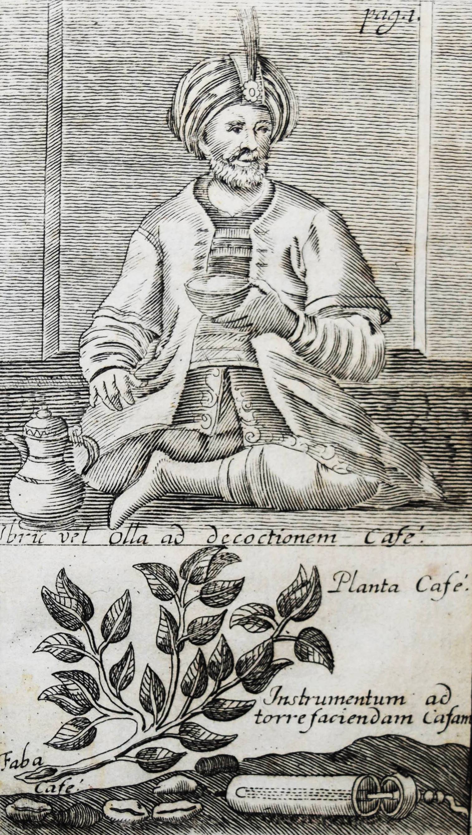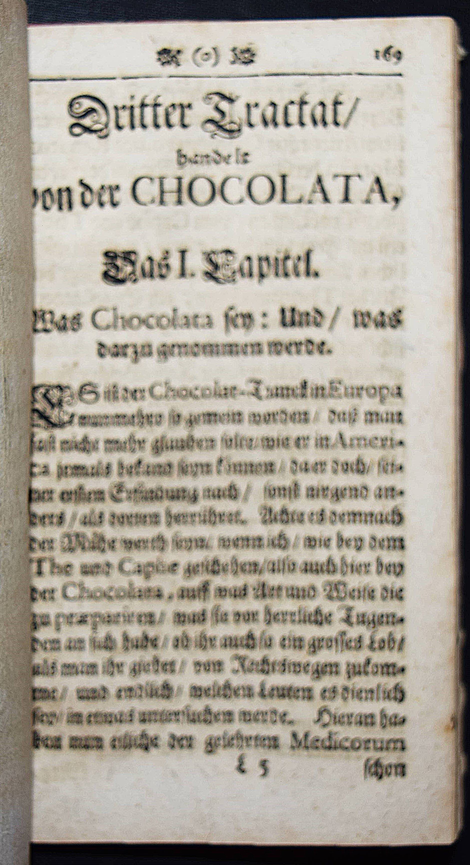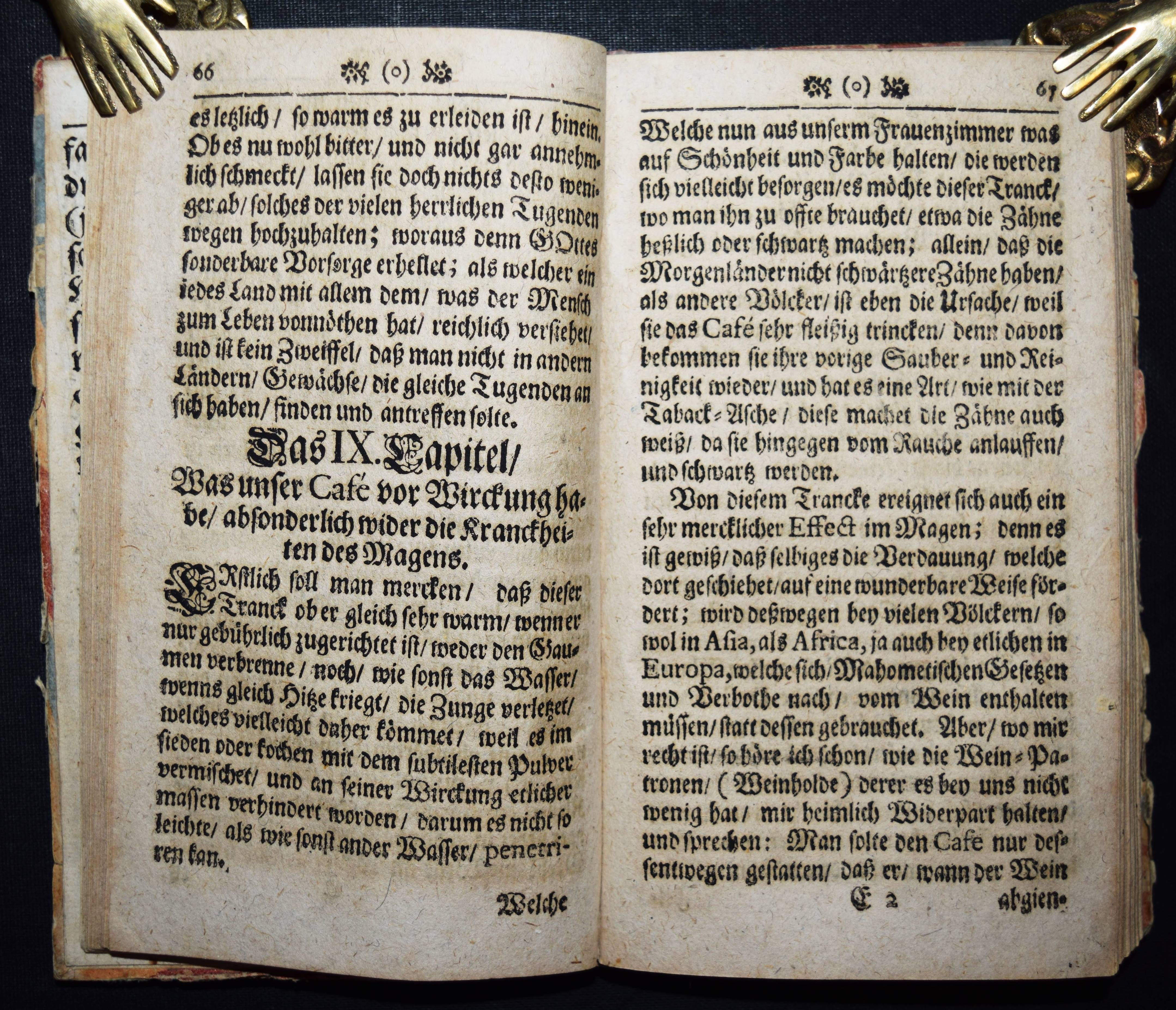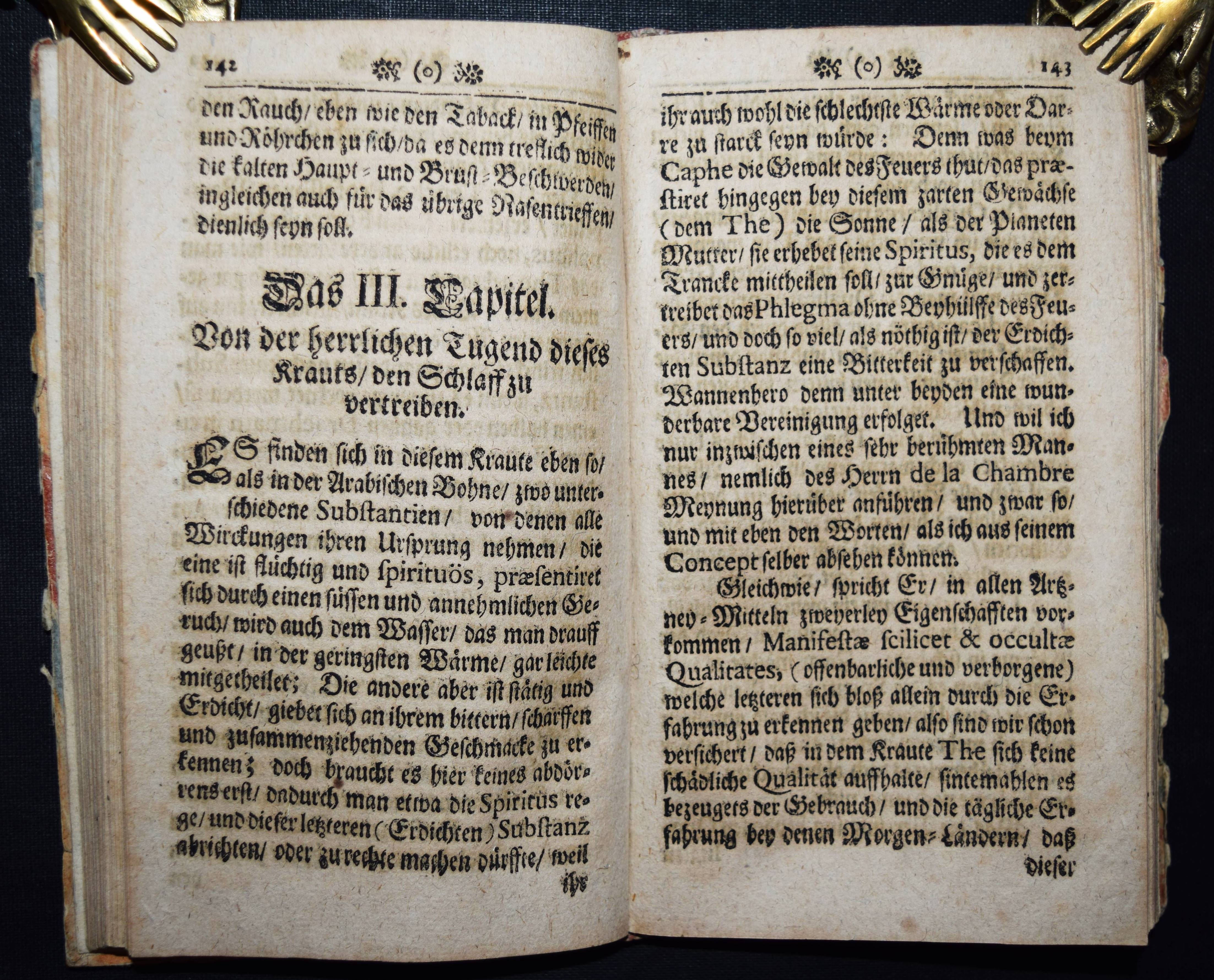 (Dufour, Philippe Sylvestre). Drey neue curieuse Tractätgen von dem Tranck Cafe, Sinesischen The, und der Chocolata, welche nach ihren Eigenschafften, Gewächs, Fortpflantzung, Praeparirung, Tugenden und herrlichen Nutzen sehr curieus beschrieben, und nunmehro in die hochteutsche Sprache übersetzet. Bautzen, J. Wilisch 1701. Kl.-8°. [3] Bl., 247 (recte 245) S., [1] Bl. mit Titel in Rot u. Schwarz, gestoch. Frontispiz u. 3 Kupfertafeln. Marmorierter Pappband der Zeit. Horn-Arndt 121. Hünersdorff 442. Krivatsy 3488. Mueller 69. Vgl. Vicaire 293 ff., Bitting 134, Cordier, BS 491 f. u. Lust 1234 (franz. u. lateinische Ausg.). – Dritte deutsche Ausgabe. – Berühmte, erstmals 1671 in Lyon erschienene Monographie nach verschiedenen Quellen. – Die „Gespräche von der Chocolata“ sind nach Krivatsy nach dem Spanischen des Bartolomé Marradón. – Die Kupfer zeigen jeweils einen Türken, Chinesen und Indianer beim Genuß ihrer Nationalgetränke, jeweils mit kleiner Darstellung der Pflanze. – Einband etwas berieben, St. a. T., geringer Feuchtigkeitsrand zu Beginn, durchgehend etwas gebräunt, gutes Exemplar.