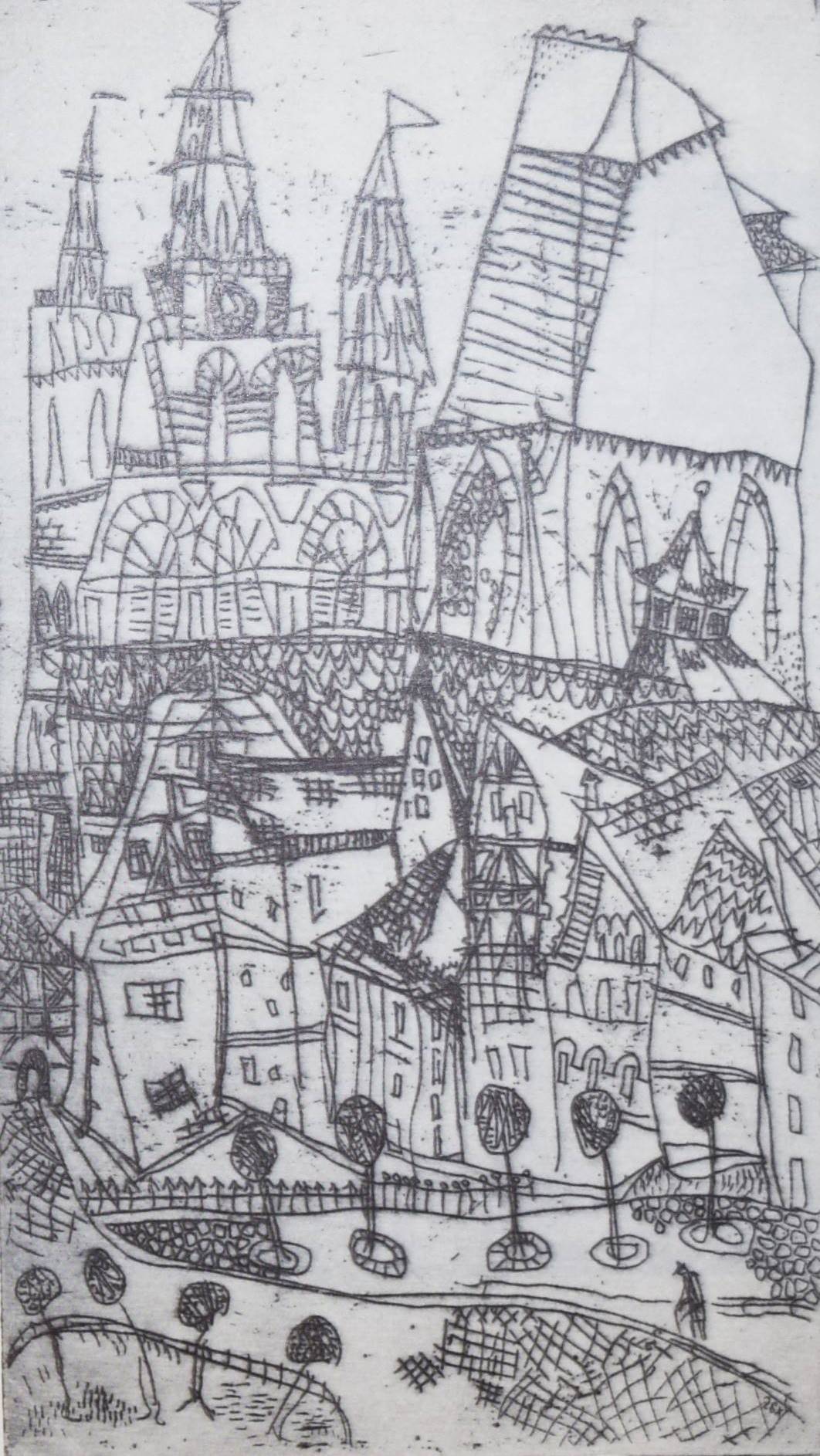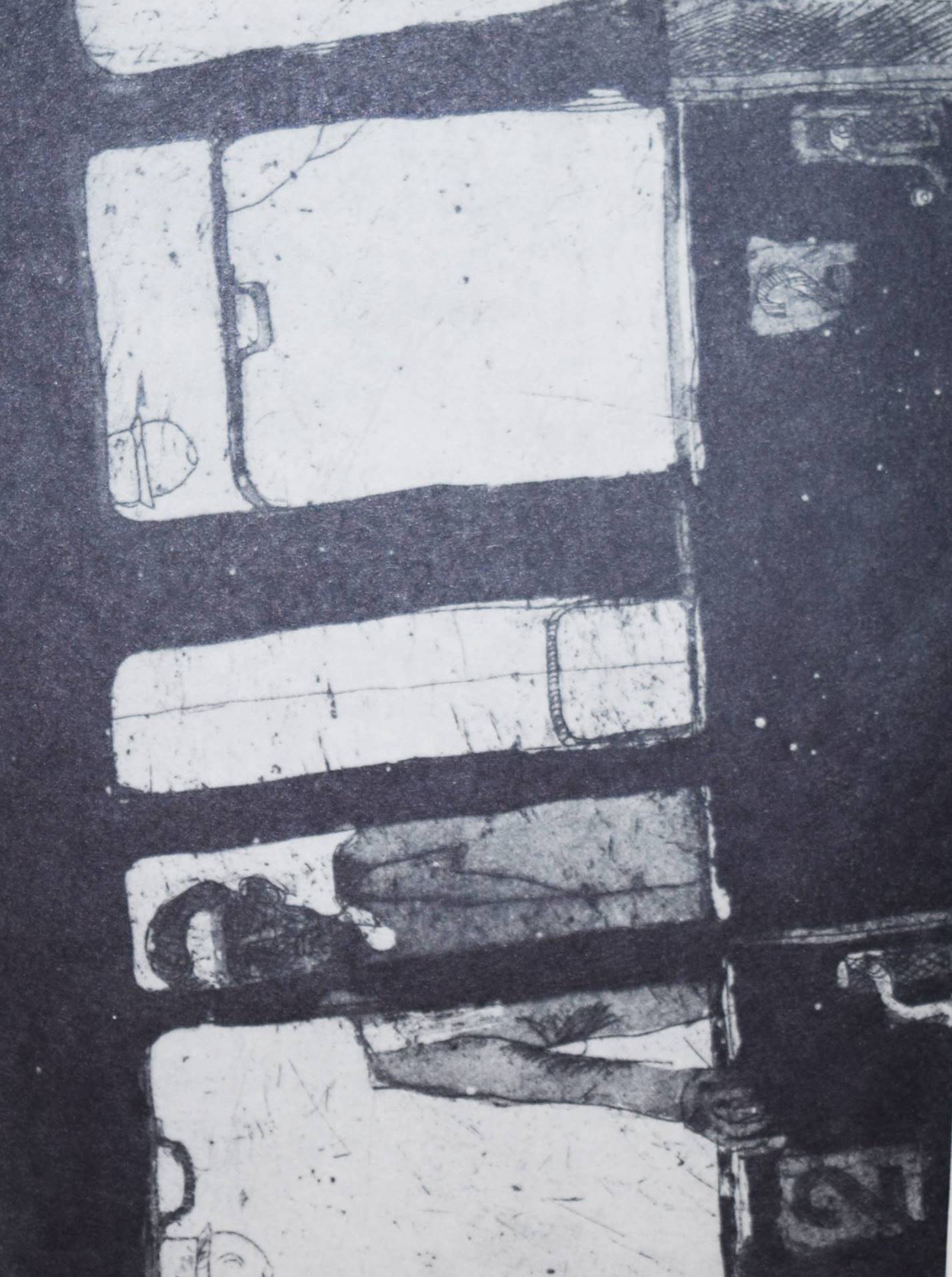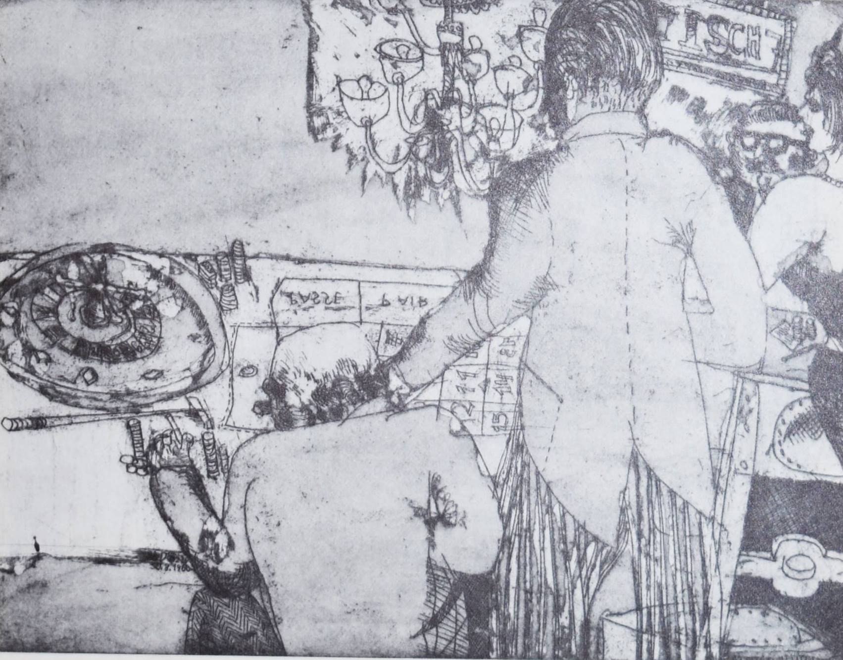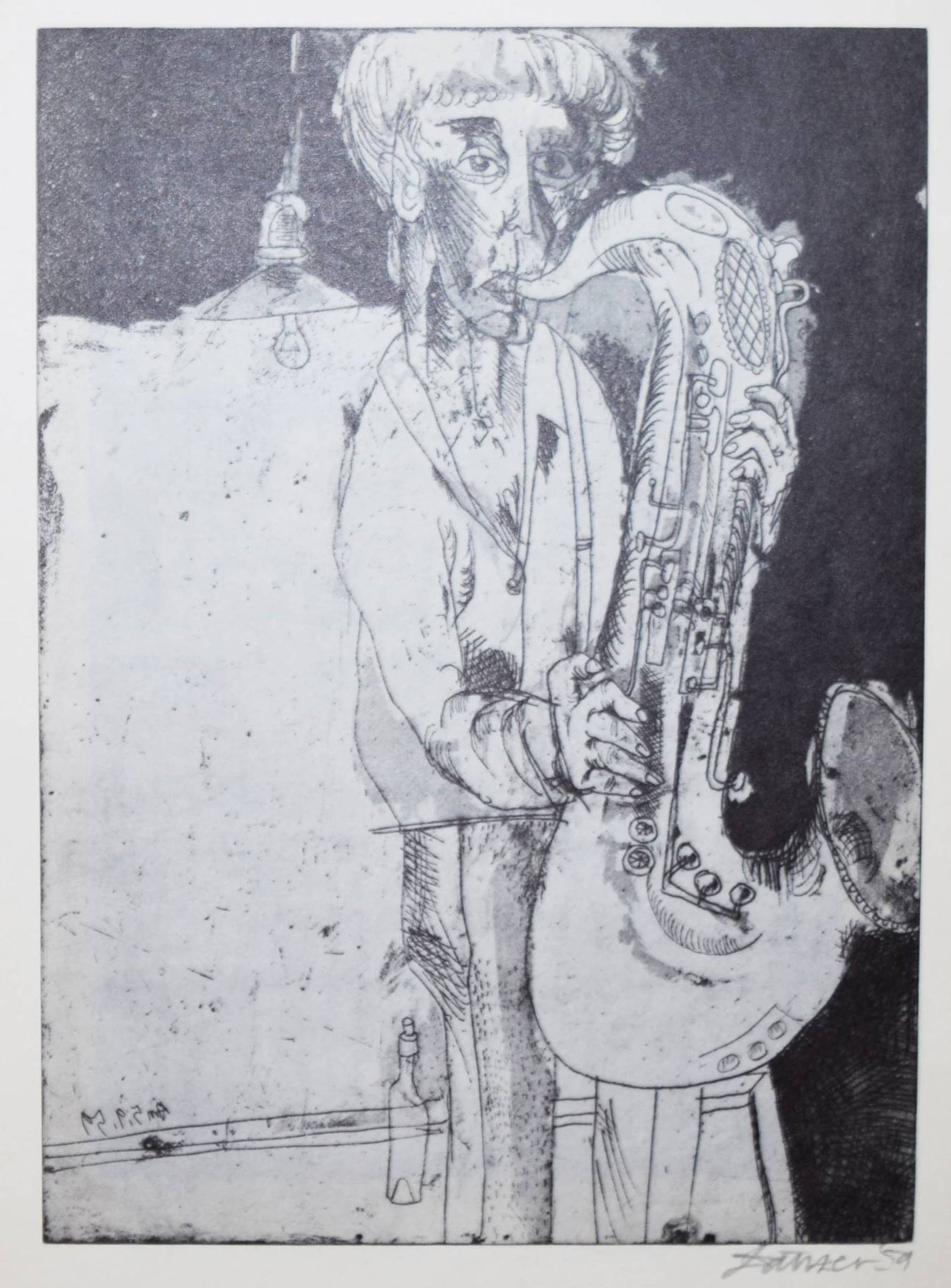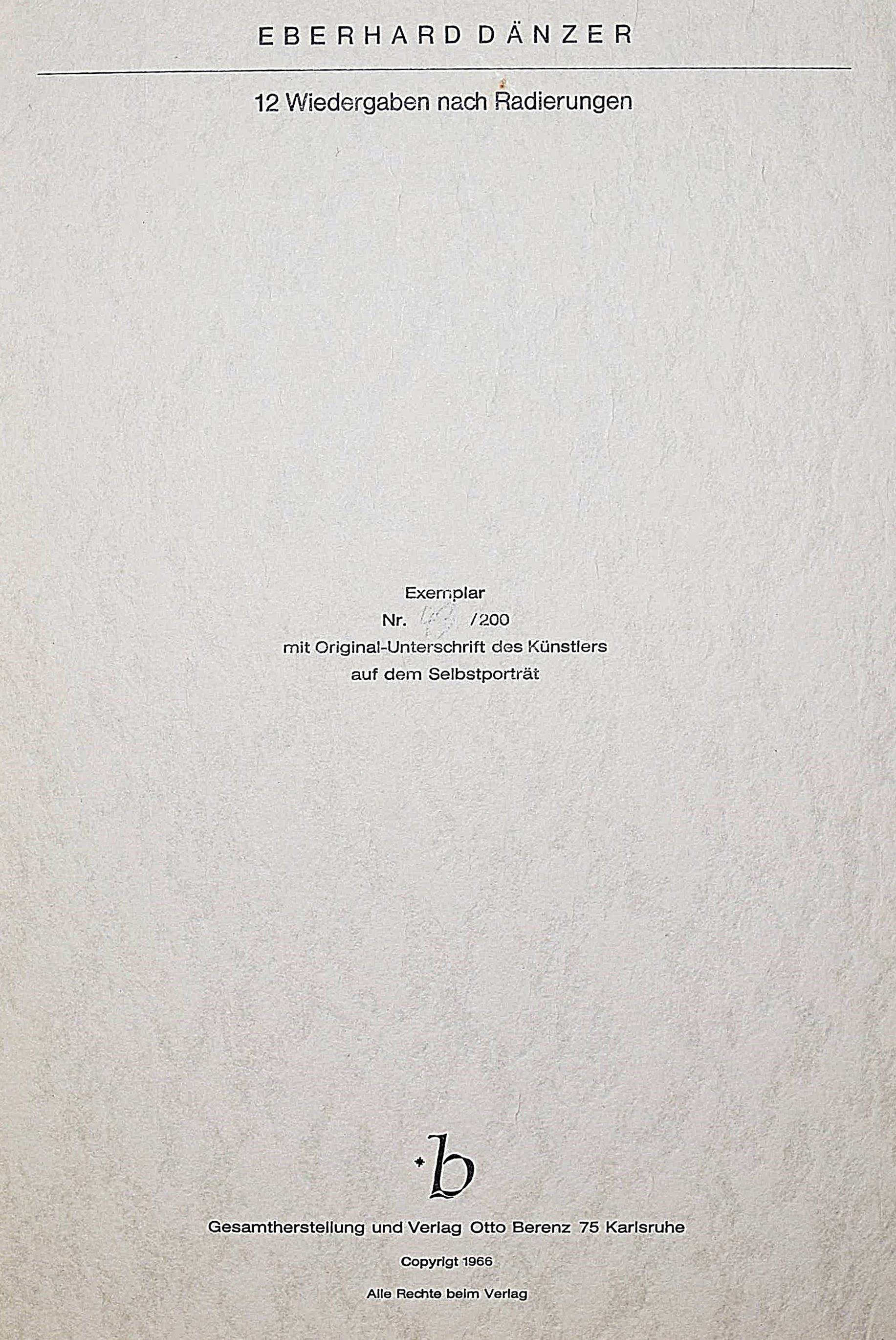 Dänzer, Eberhard. 12 Wiedergaben nach Radierungen. Karlsruhe, Berenz 1966. 4°. 4 Bl. (Text) mit 1 Selbstbildnis u. 12 Tafeln. Orig.-Leinenflügelmappe. Eines von 200 num. Exemplaren. – Von Eberhard Dänzer unter dem Selbstbilnis signiert. – E. Dänzer (1935-2008) studierte 1954/’55 an der Kunstakademie München, dann bis 1961 an der Karlsruher Kunstakademie, wo er unter anderem Schüler von Karl Hubbuch, Emil Wachter und Ernst Würtenberger war. 1966 bekam er ein Berlin-Stipedium für Lithographie. Seine Bilder wurden in Karlsruhe, Berlin, Ansbach, Landau und Helsinki ausgestellt und sind vertreten in der Staatlichen Kunsthalle Karlsruhe und in den Städtischen Sammlungen Karlsruhe. Dänzer lebte zuletzt in Karlsruhe. – Mappe etwas fleckig, sonst gut erhalten.
