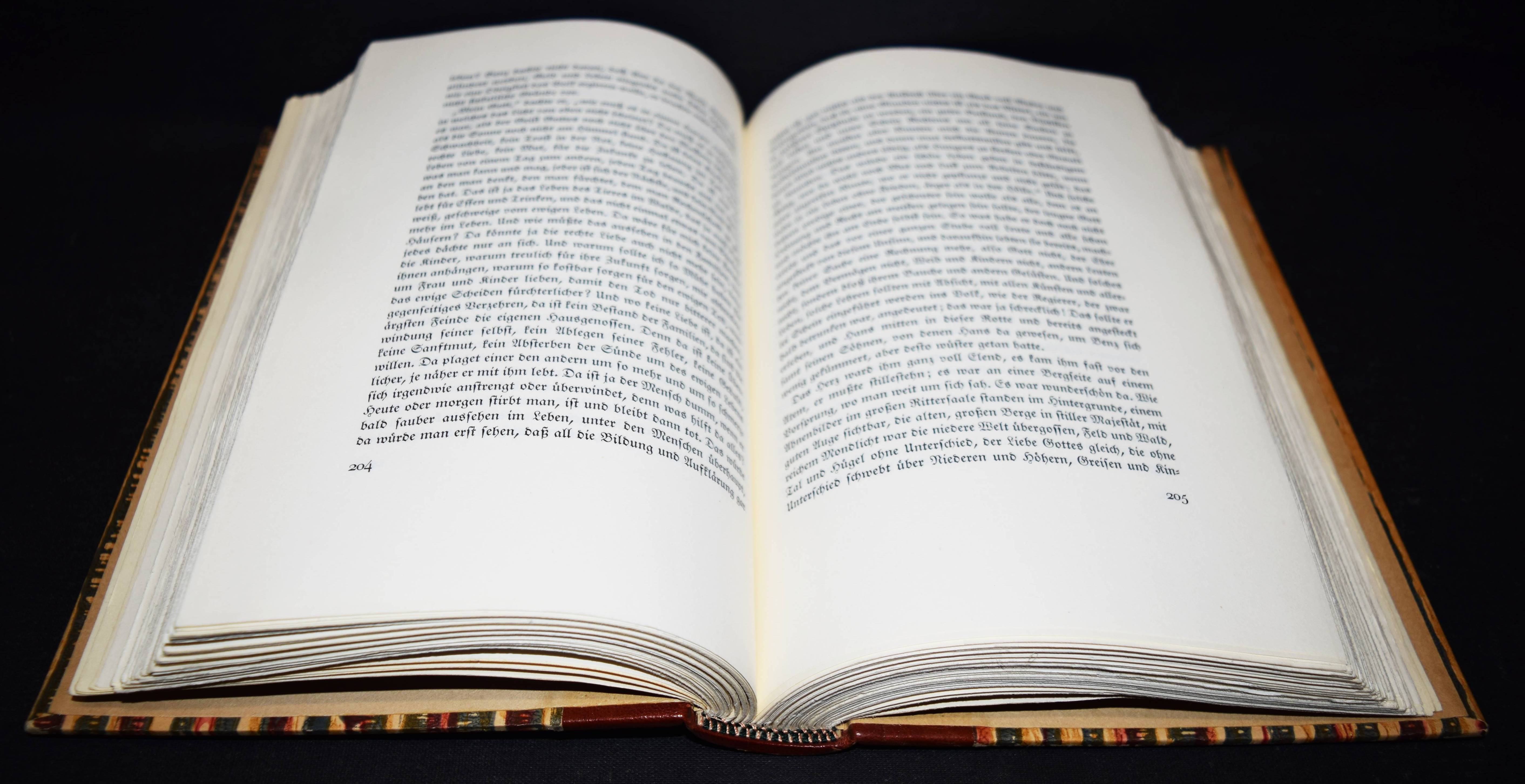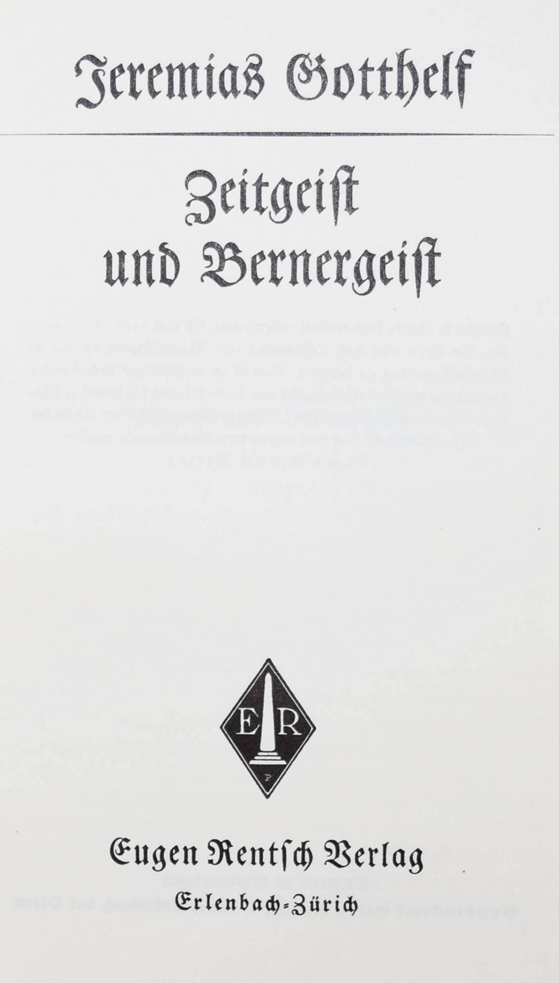 Gotthelf, Jeremias. Zeitgeist und Bernergeist. Erlenbach-Zürich, Eugen Rentsch o. J. (um 1925). 8°. 524 S. Handgebundener rotbrauner Halbledereinband mit goldgepr. Rückentitel, 4 Zierbünden, Linienvergoldung u. Kopfgoldschnitt. Sehr schönes Exemplar im dekorativen Handeinband.