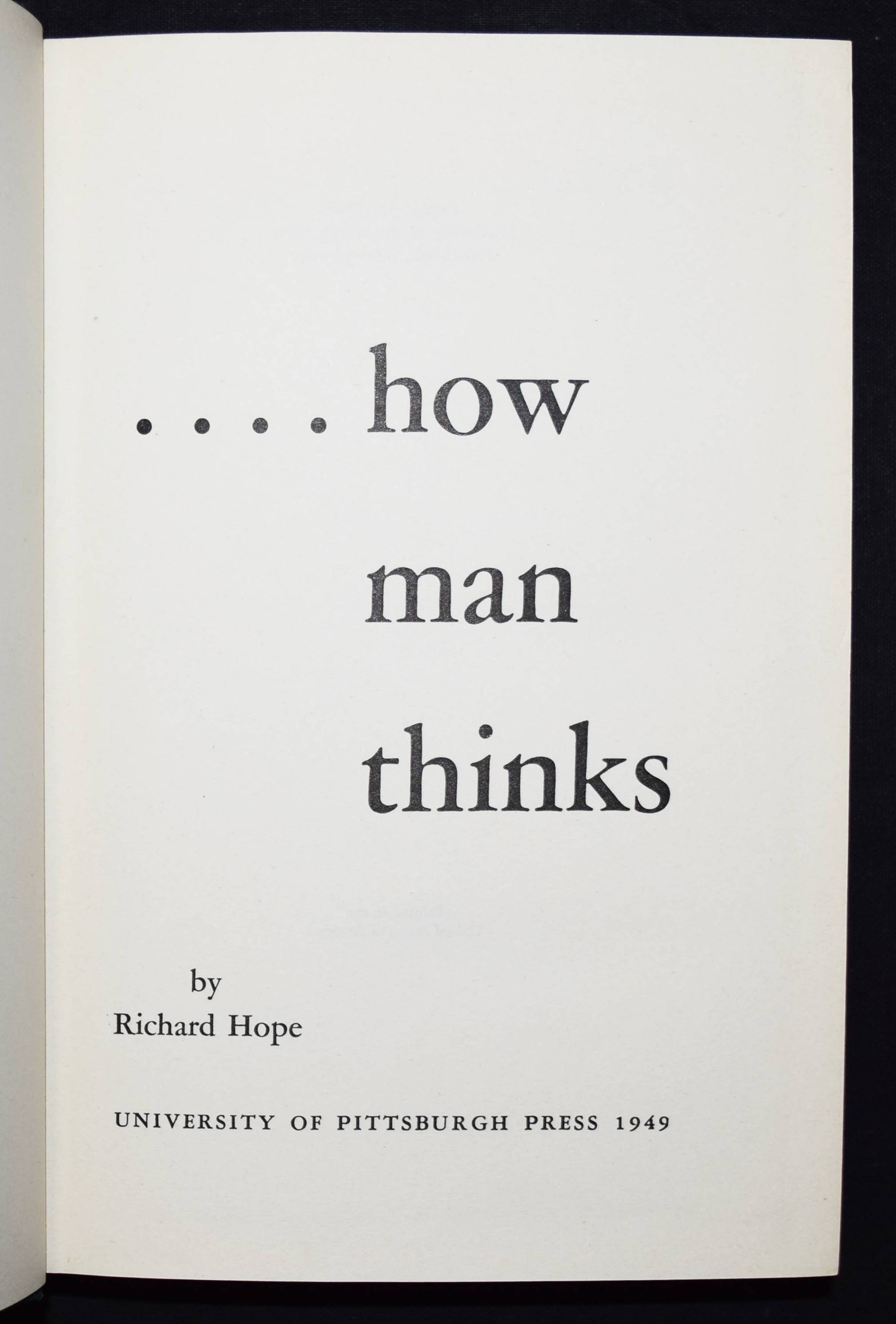 Hope, Richard. How man thinks. (Pittsburgh), University of Pittsburgh Press (1949). 8°. [7] Bl., 479 S. OLn. mit goldgepr. Rücken- u. Deckeltitel. Erste Ausgabe. – „The presentation here offered combines elements of traditional, symbolic, and experimental logic“ (R. Hope). – R. Hope (?-1955) war Professor für Philosophie an der University of Pittsburgh. – Sehr gutes Exemplar.
