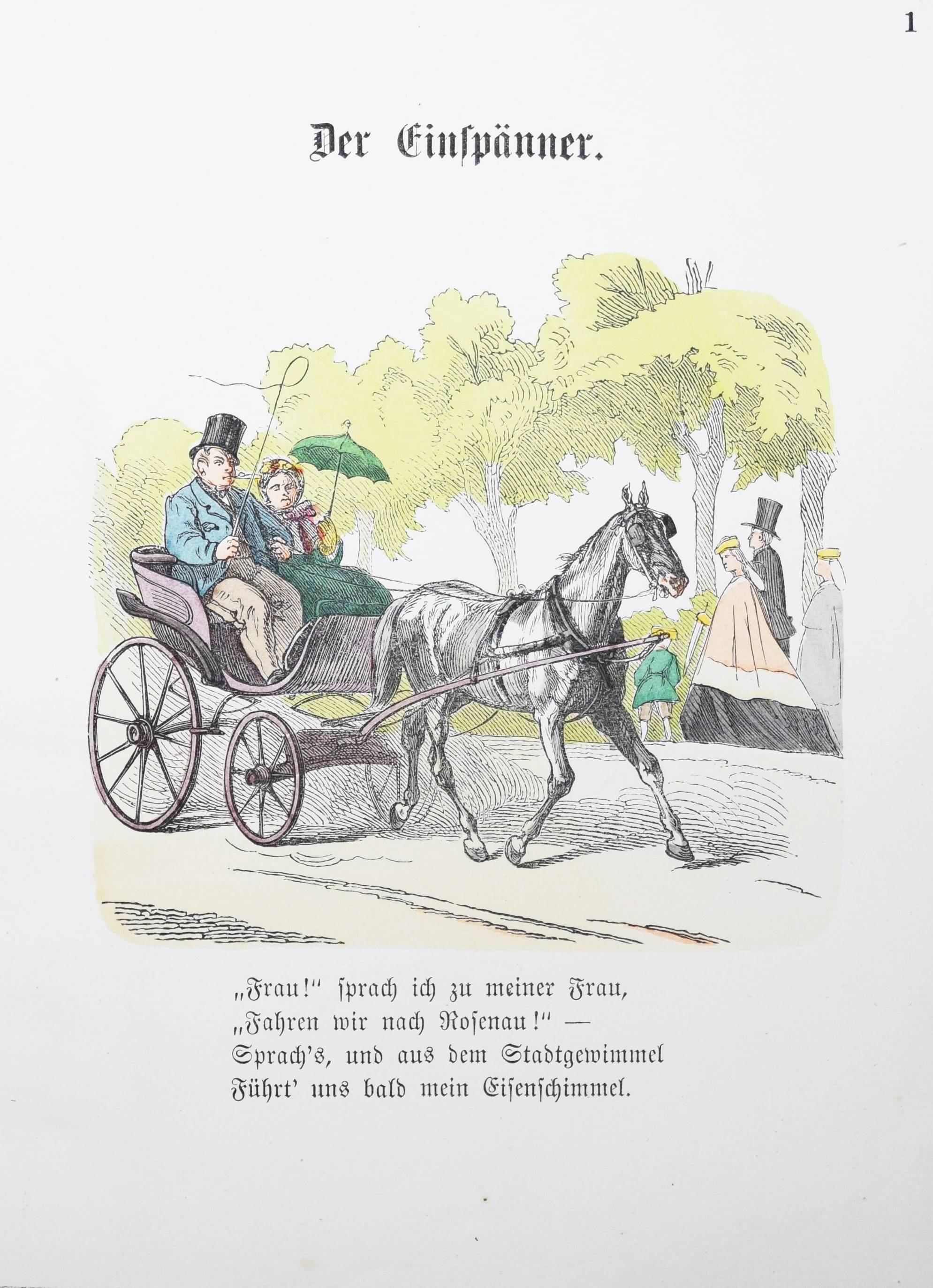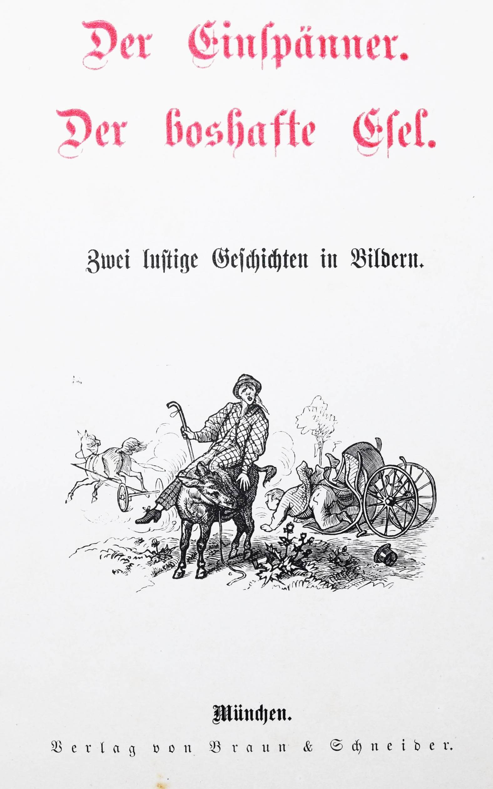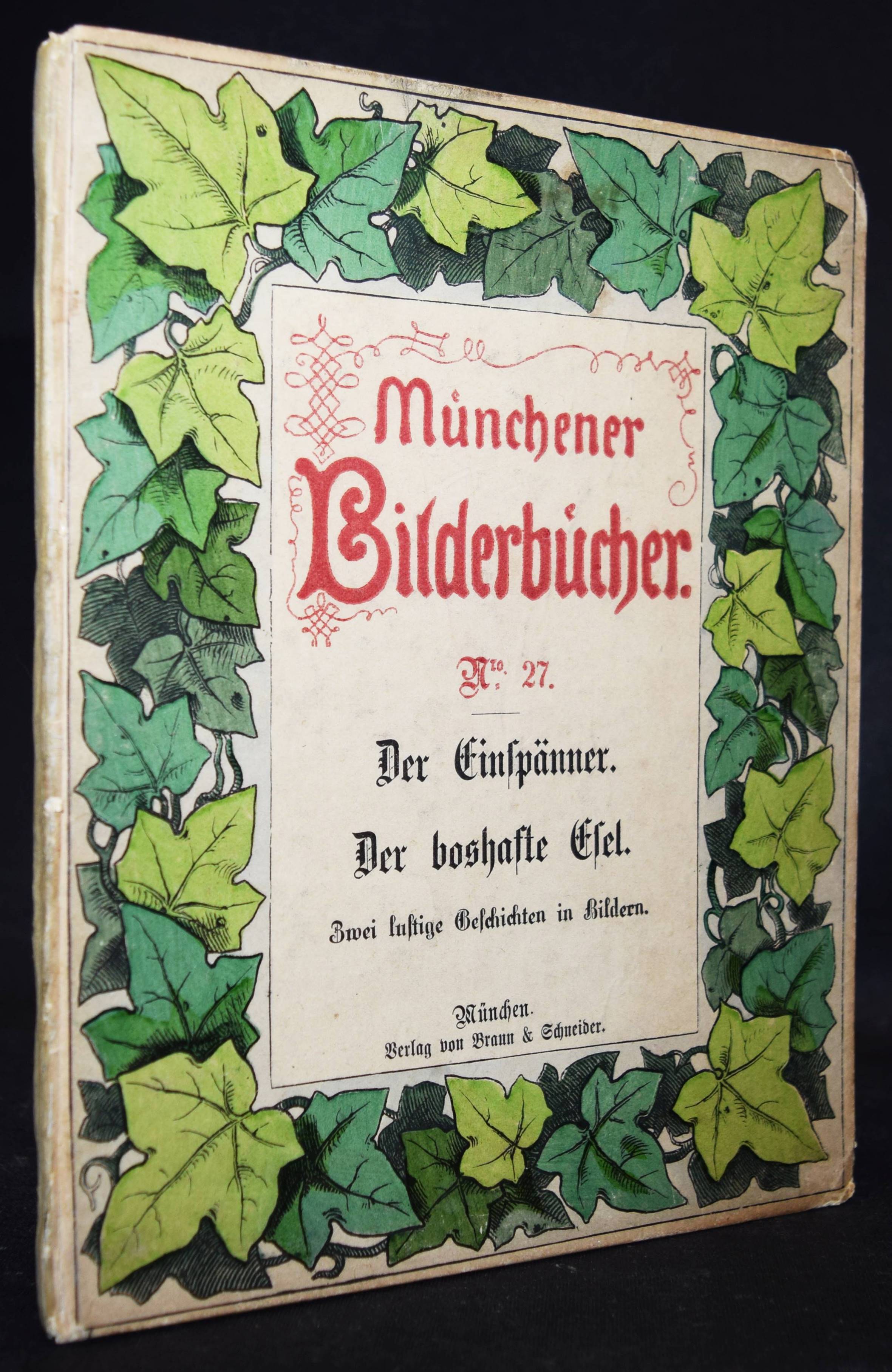 (Lossow, Friedrich). Der Einspänner. Der boshafte Esel. Zwei lustige Geschichten in Bildern. München, Braun & Schneider o. J. (1874). Gr.-8°. 16 Bl. mit Titelvignette u. 16 handkol. Holzschnitt-Illustrationen. Farbig illustr. OPbd. (Münchener Bilderbücher, Nro. 27). Bilderwelt 406. Ries 652, 2. Rümann, Illustr. Bücher 1257. Seebaß II, 481. Wegehaupt II, 2053. – Erste Buchausgabe. – Die Bildergeschichten erschienen zuerst 1865 als „Münchener Bilderbogen“ Nr. 408 und 424. – F. Lossow (1834-1872) war einer der Hauptmitarbeiter der „Fliegenden Blätter“ und der „Münchener Bilderbogen“. – Rücken unaufflällig restauriert, Ecken leicht bestoßen, gutes sauberes Exemplar.