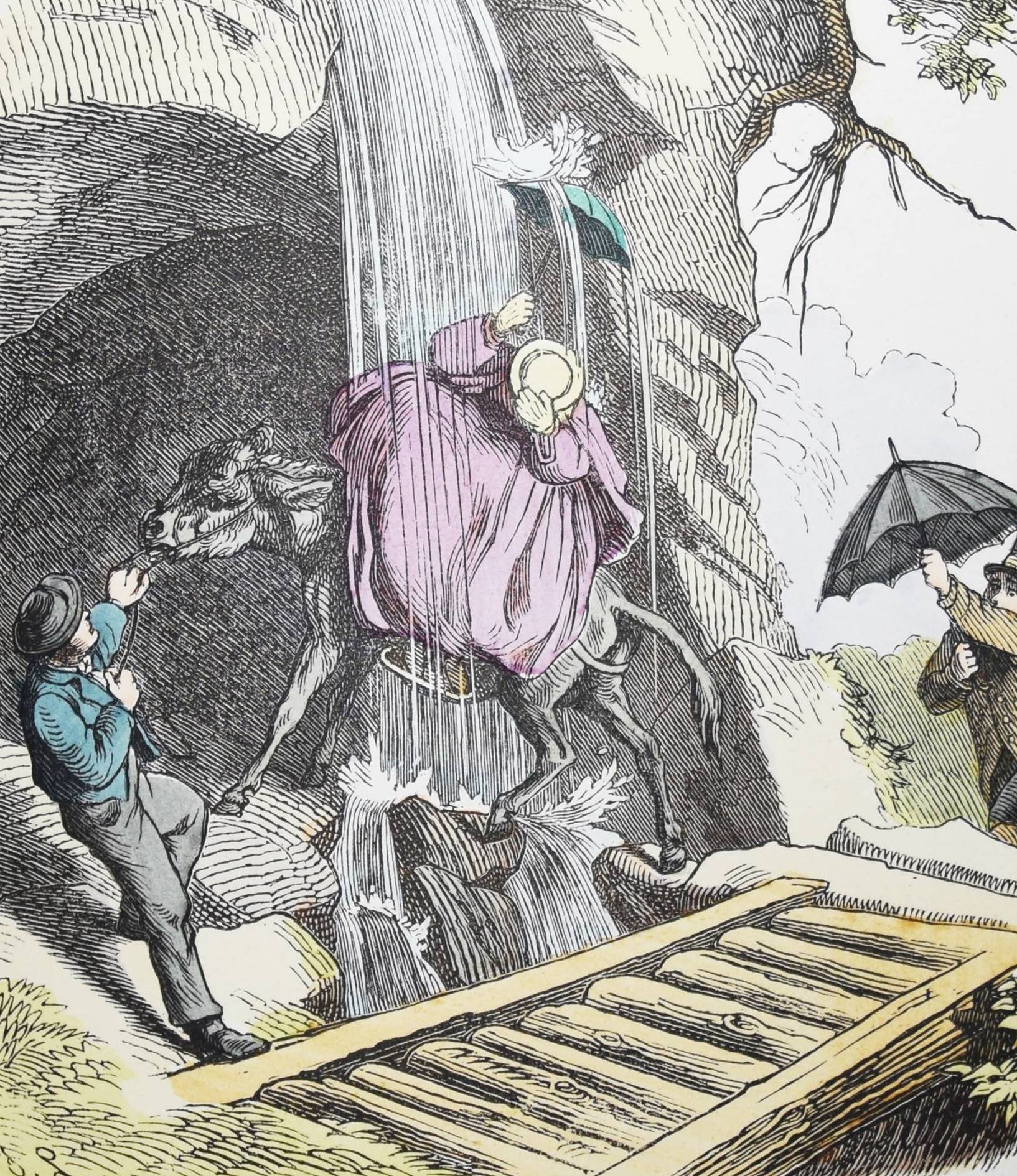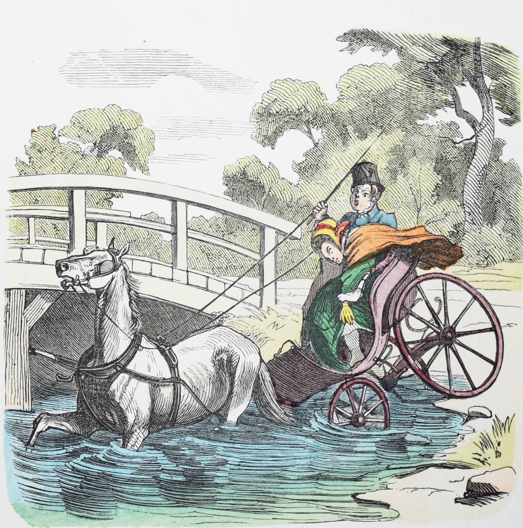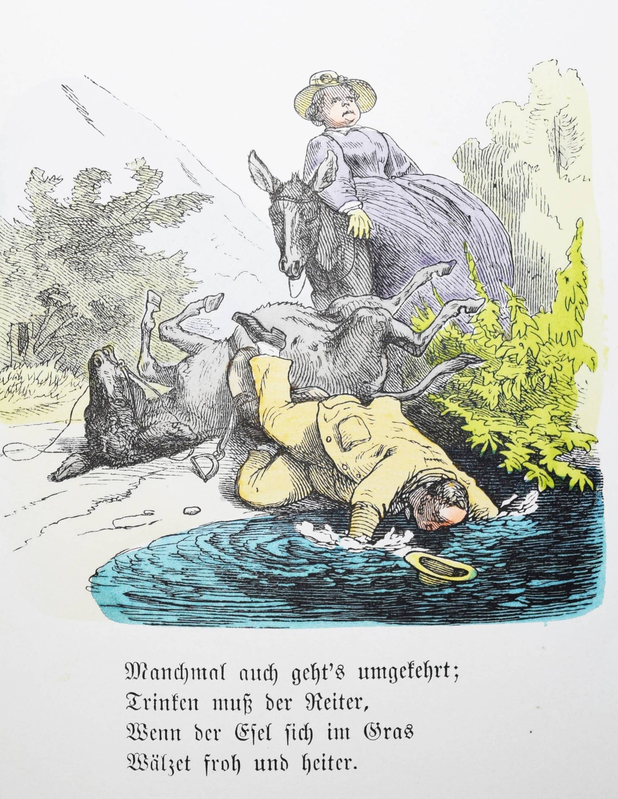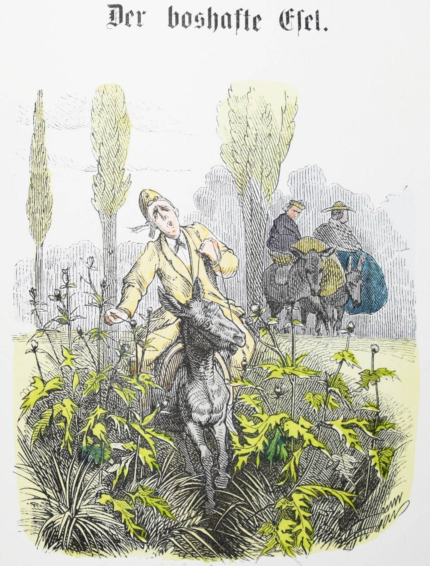 (Lossow, Friedrich). Der Einspänner. Der boshafte Esel. Zwei lustige Geschichten in Bildern. München, Braun & Schneider o. J. (1874). Gr.-8°. 16 Bl. mit Titelvignette u. 16 handkol. Holzschnitt-Illustrationen. Farbig illustr. OPbd. (Münchener Bilderbücher, Nro. 27). Bilderwelt 406. Ries 652, 2. Rümann, Illustr. Bücher 1257. Seebaß II, 481. Wegehaupt II, 2053. – Erste Buchausgabe. – Die Bildergeschichten erschienen zuerst 1865 als „Münchener Bilderbogen“ Nr. 408 und 424. – F. Lossow (1834-1872) war einer der Hauptmitarbeiter der „Fliegenden Blätter“ und der „Münchener Bilderbogen“. – Rücken unaufflällig restauriert, Ecken leicht bestoßen, gutes sauberes Exemplar.