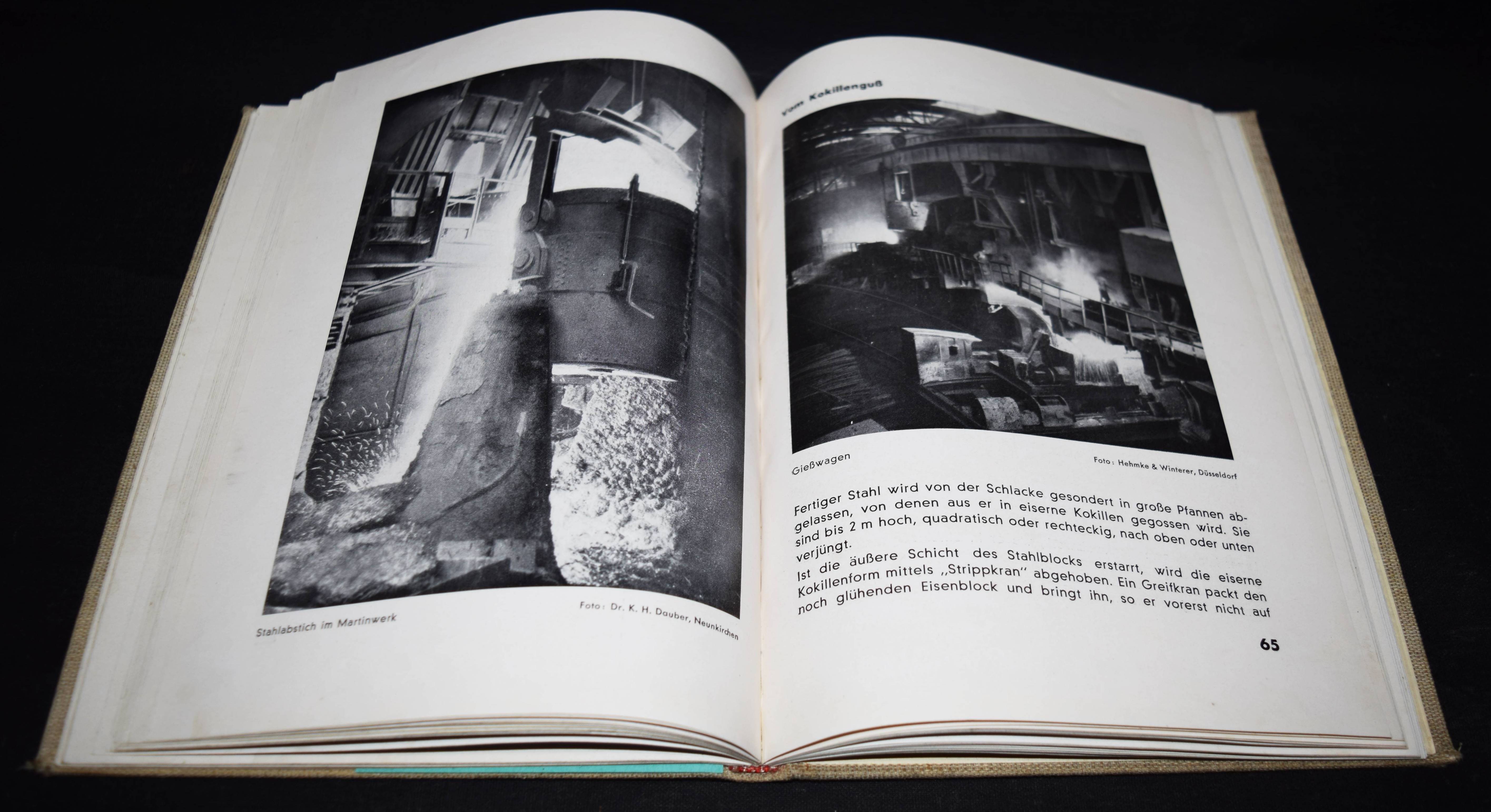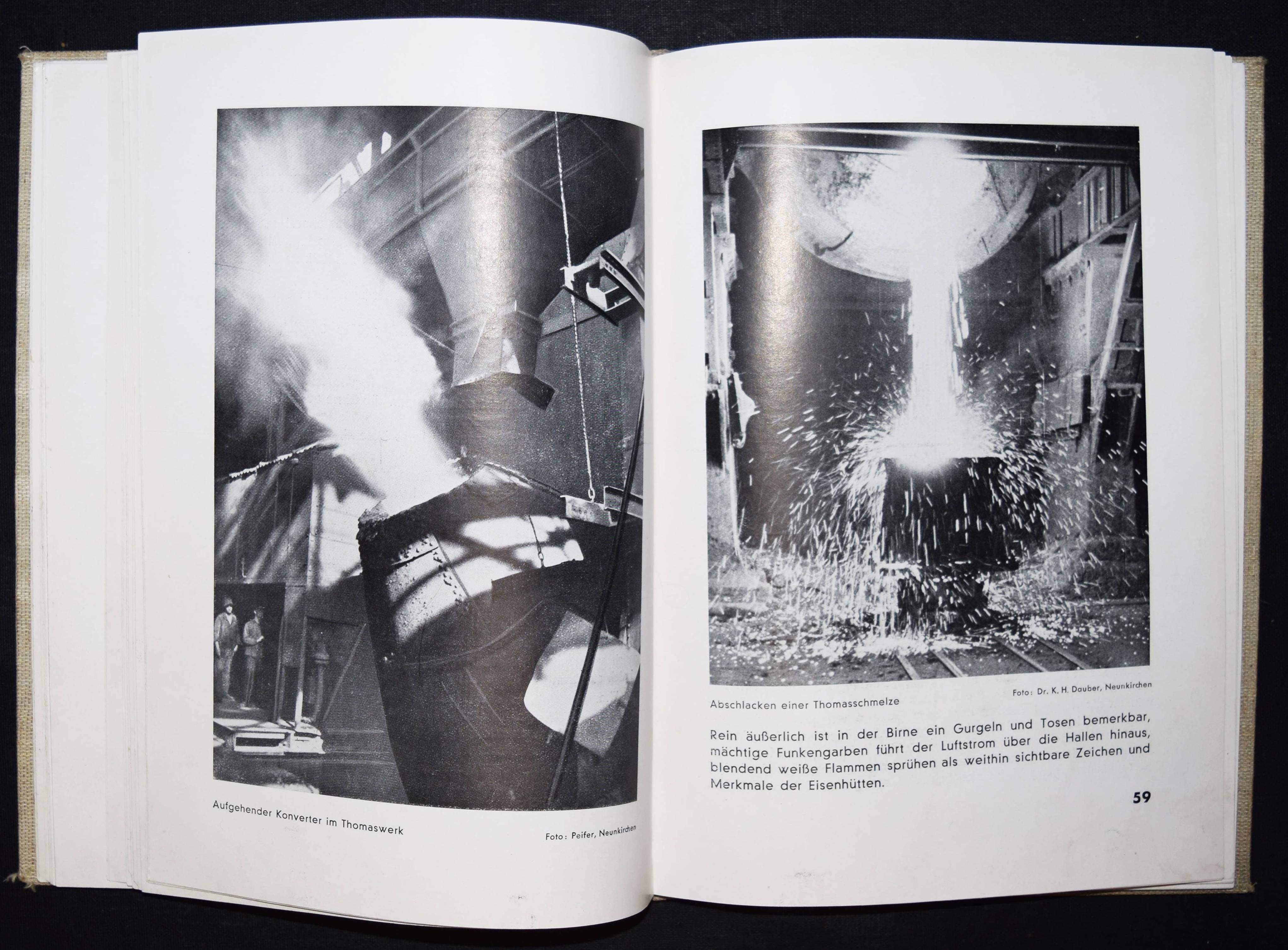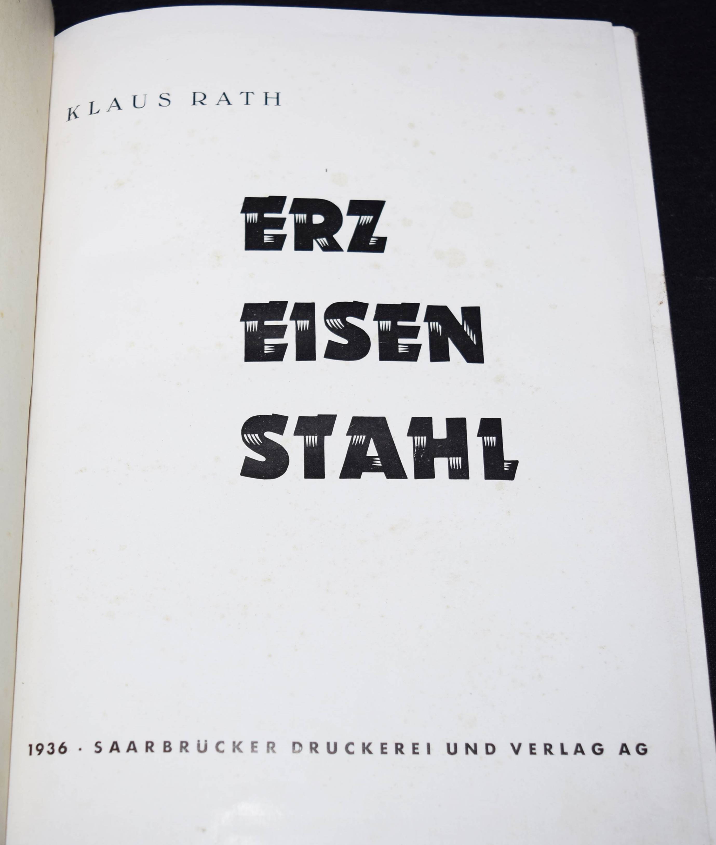 Rath, Klaus. Erz, Eisen, Stahl. Saarbrücken, Saarbrücker Druckerei und Verlag (1936). Gr.-8°. 108 S. mit zahlr. teils ganzs. Abb. nach Fotografien von K. H. Dauber, Josef Furtwänler, Hehmke & Winterer, Josef Lavo u. Pfeifer. OLn. mit schwarzgepr. Rücken- u. Deckeltitel. Nicht bei Heiting/Jaeger. – Erste und einzige Ausgabe, selten. – Im Stil der Neuen Sachlichkeit gestaltete Dokumentation des saarländischen Bergbaus. Alle Aufnahmen mit Ausnahme derjenigen des Düsseldorfer Photoateliers Hehmke & Winterer, stammen von regionalen Fotografen. – Rückentitel stellenweise abgeplatzt, gutes sauberes Exemplar.