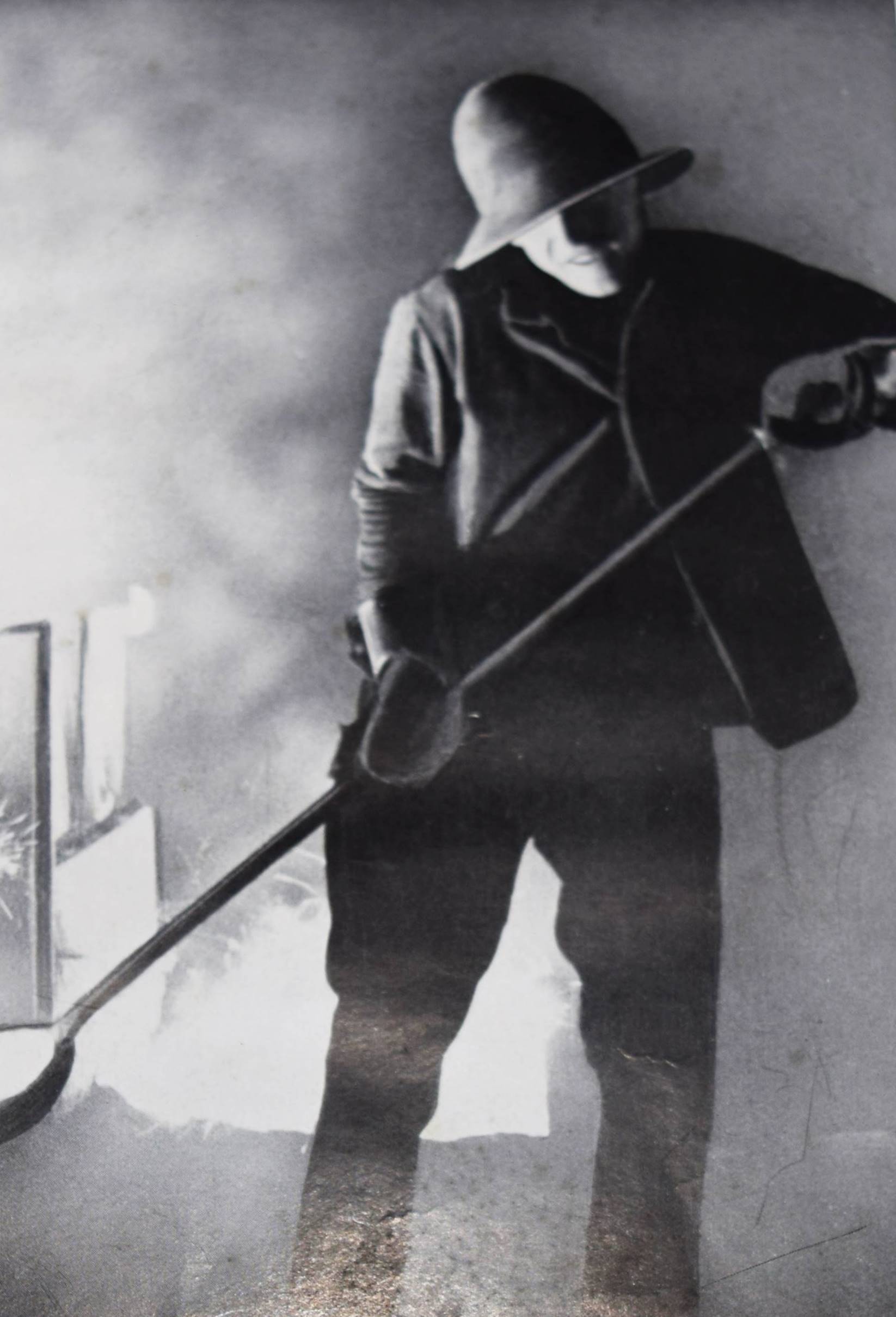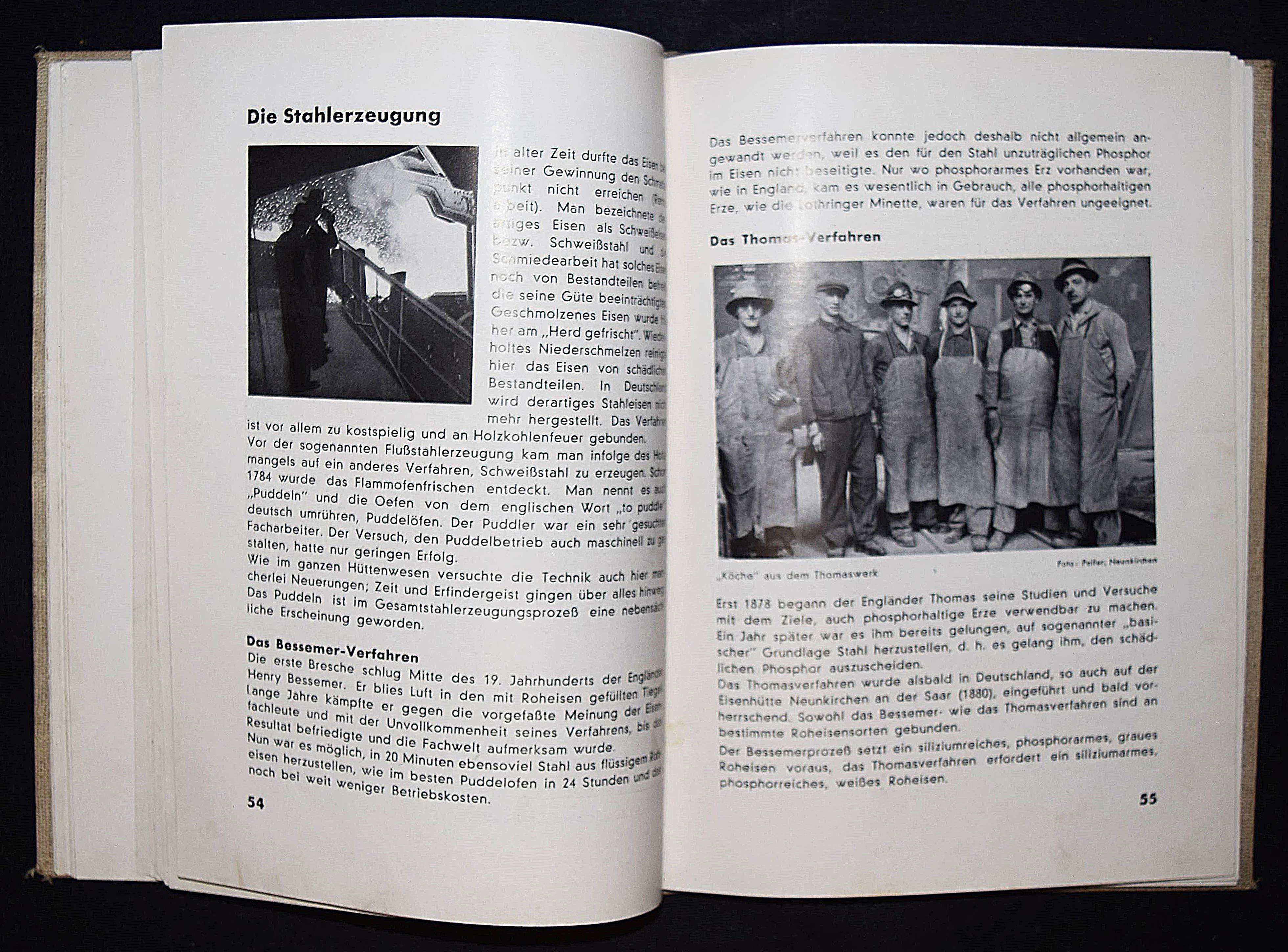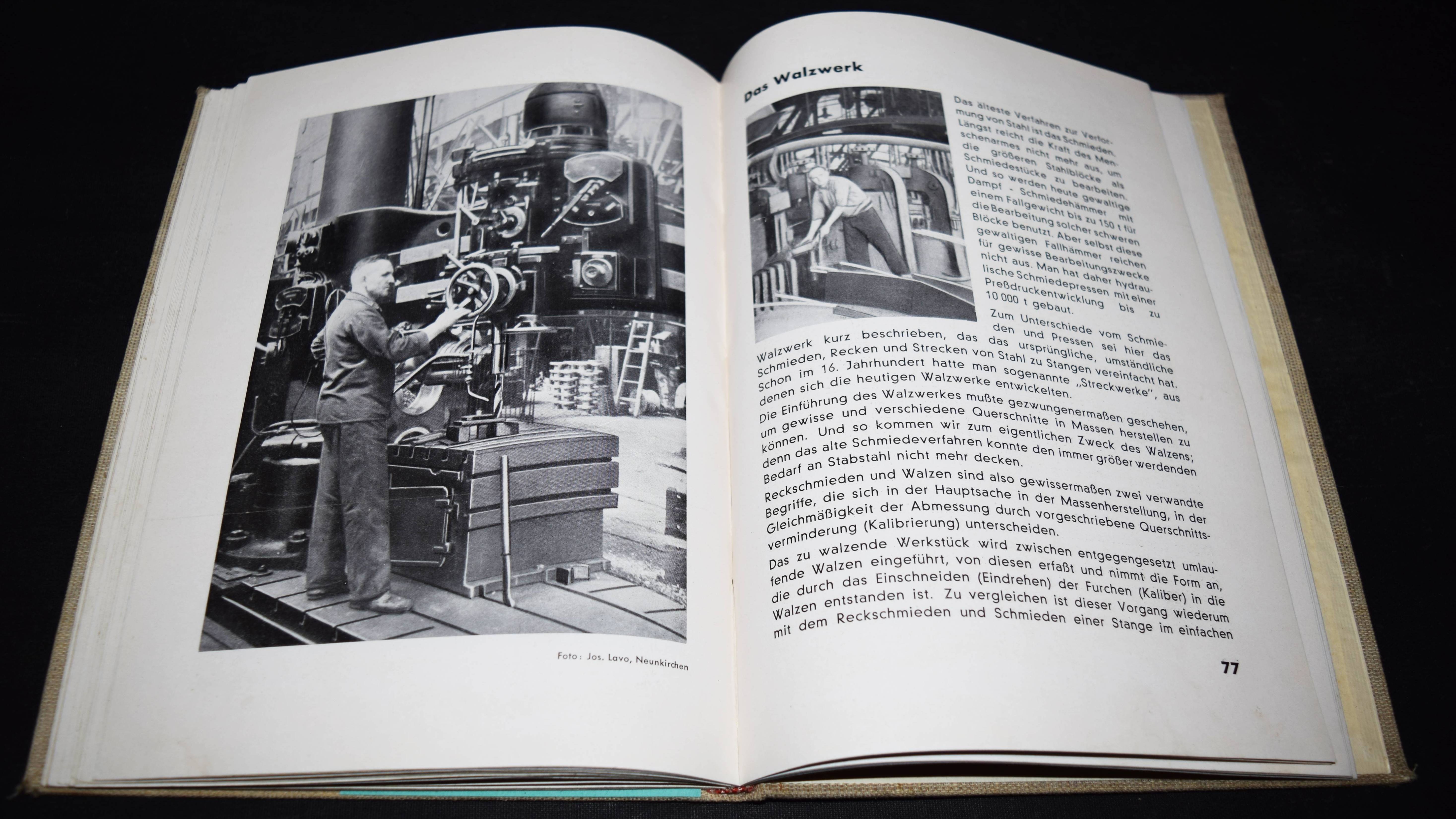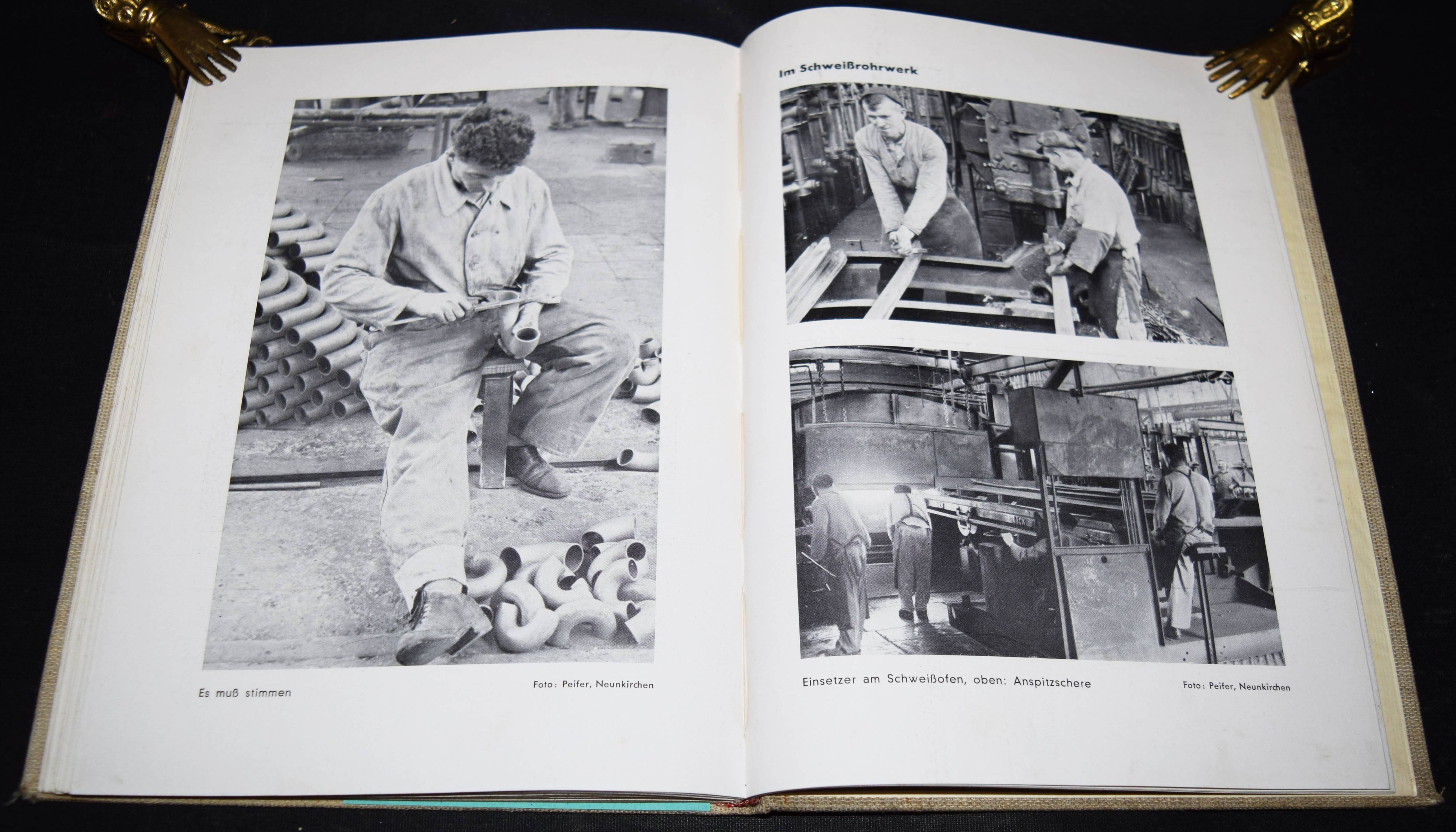 Rath, Klaus. Erz, Eisen, Stahl. Saarbrücken, Saarbrücker Druckerei und Verlag (1936). Gr.-8°. 108 S. mit zahlr. teils ganzs. Abb. nach Fotografien von K. H. Dauber, Josef Furtwänler, Hehmke & Winterer, Josef Lavo u. Pfeifer. OLn. mit schwarzgepr. Rücken- u. Deckeltitel. Nicht bei Heiting/Jaeger. – Erste und einzige Ausgabe, selten. – Im Stil der Neuen Sachlichkeit gestaltete Dokumentation des saarländischen Bergbaus. Alle Aufnahmen mit Ausnahme derjenigen des Düsseldorfer Photoateliers Hehmke & Winterer, stammen von regionalen Fotografen. – Rückentitel stellenweise abgeplatzt, gutes sauberes Exemplar.