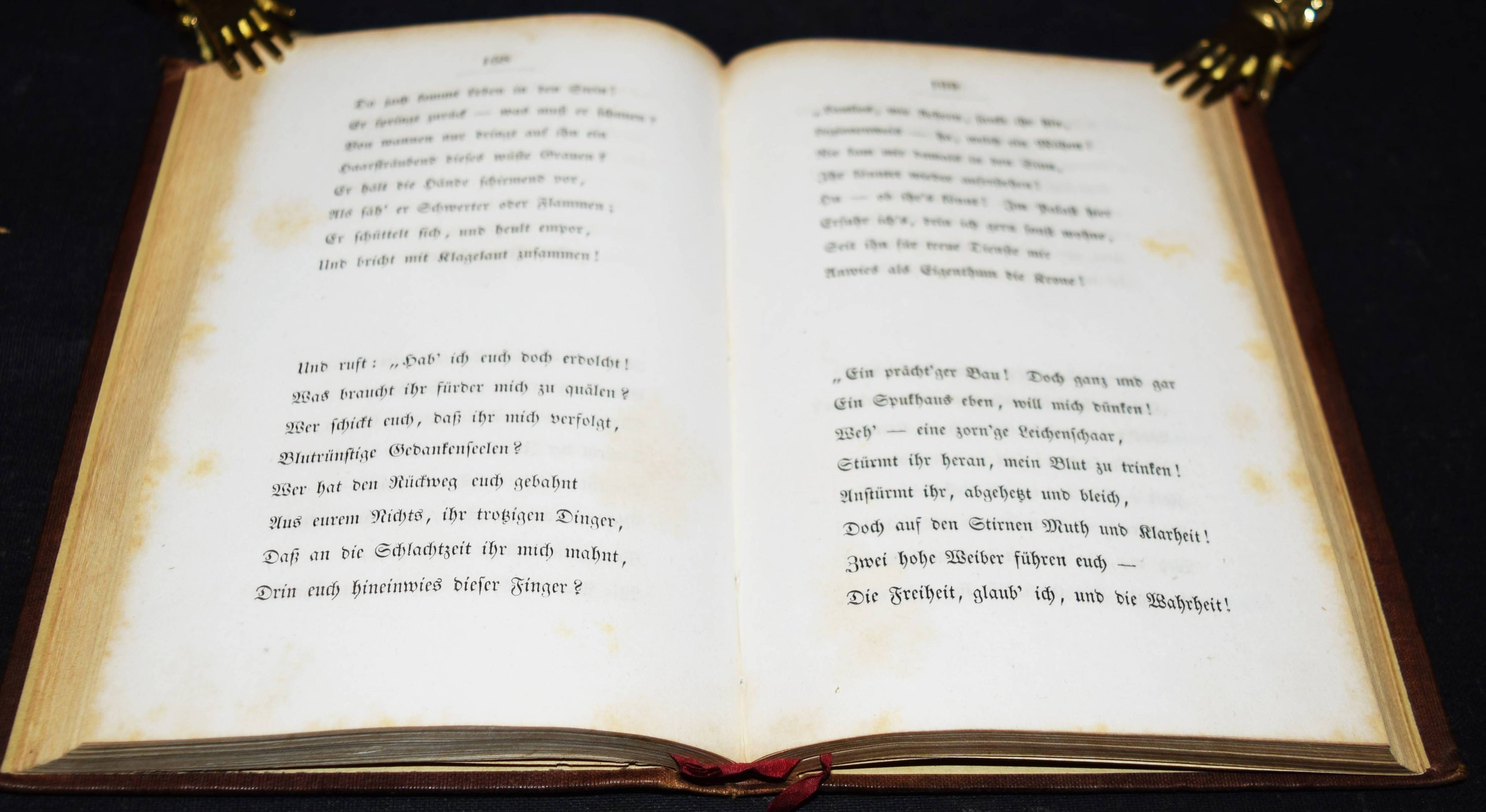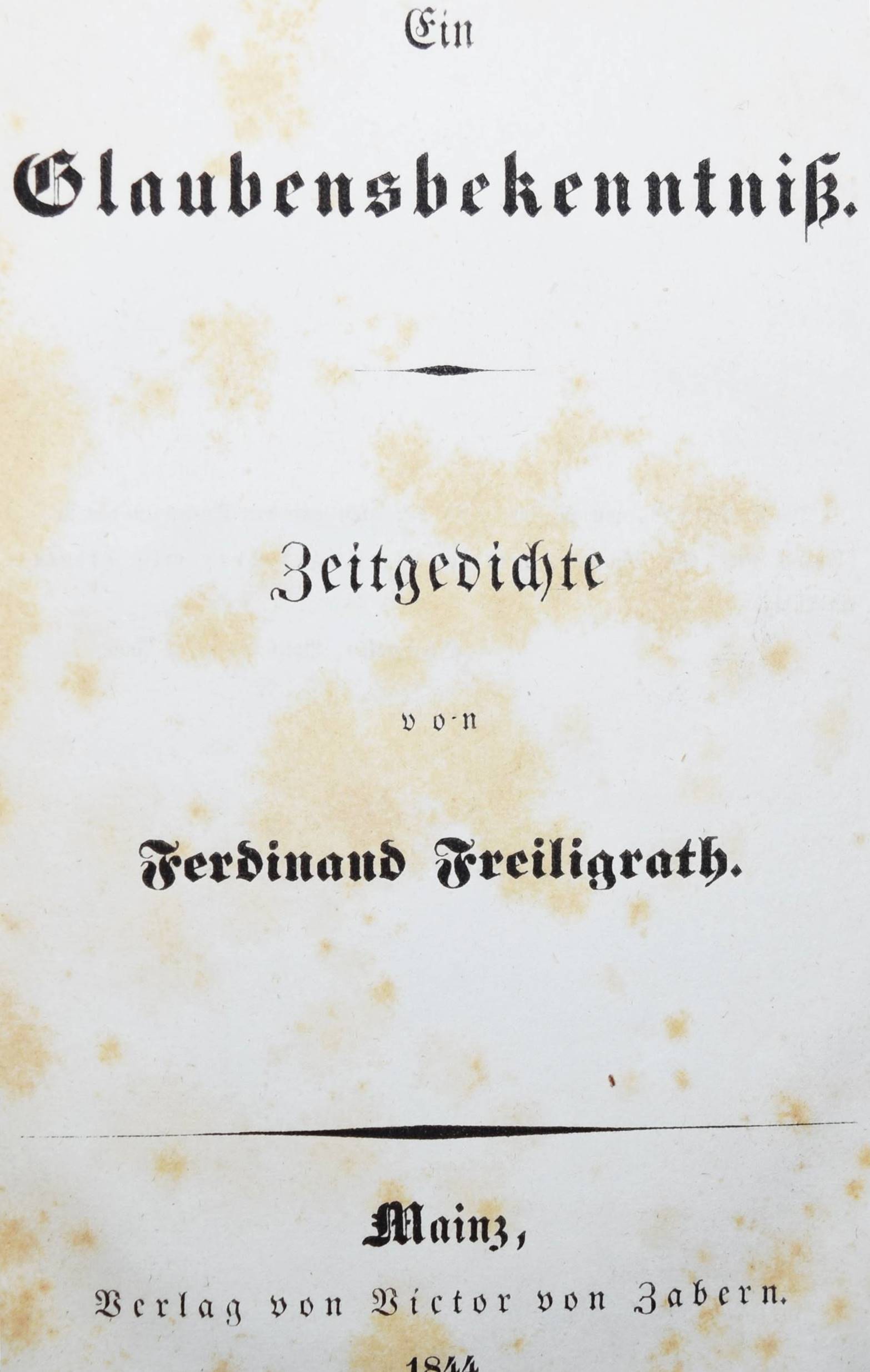 Freiligrath, Ferdinand. Ein Glaubensbekenntniß. Zeitgedichte. Mainz, Victor v. Zabern 1844. Kl.-8°. XVI, 319 S., [2] Bl. OLn. mit goldgepr. Rücken- u. Deckeltitel u. ornamentaler Rücken- u. Deckelverg. Slg. Borst 2110. Hirschberg (dtv) S. 136. Houben I, 186 ff. KNLL V, 798. Stammhammer I, 83, 2. – Erste Ausgabe dieser bedeutenden politischen Gedichtsammlung, mit der sich Freiligrath „offen und entschieden zur Opposition“ bekennt. – „Für Cotta, den Verleger seiner „Gedichte“, war das natürlich nichts, zu Milderungen und Auslassungen wollte sich der Dichter trotz allen Zuredens nicht verstehen. Es brauchte dazu einen jungen, unternehmungslustigen Verleger, dem es auf einen Tanz mit den Polizeiministerien der dreiunddreißig Bundesstaaten nicht ankam, und der die Schiche kannte, solch verfemte Literatur hinter dem Rücken der Behörden an den Mann zu bringen… Das Manuskript irgendeinem Zensor vorzulegen war aussichtslos, das Buch mußte also mehr als zwanzig Bogen Umfang haben, um sein Erscheinen ohne vorherige Zensur zu rechtfertigen… Der nicht ausreichende Text mußte aufs äußerste gestreckt werden; dadurch erhielt das Buch eine Ausstattung, die an Luxusdrucke moderner Dichter erinnert: große Schrift, meist nur zwei Strophen auf einer Seite, und ein besonderer „Schmutztitel“ vor jedem Gedicht. So kam man mit dem Schlußvers glücklich auf 20 1/4 Bogen… Kaum begann das Buch zu „rumoren“, da setzten die Verbote ein…“ (H. H. Houben). – Der Dichter nach dem Erscheinen dieses Buches zunächst nach Belgien, wo er K. Marx kennenlernte, später über die Schweiz nach England. – Rücken etwas aufgehellt, durchgehend teils stärker stockfleckig, gutes Exemplar.