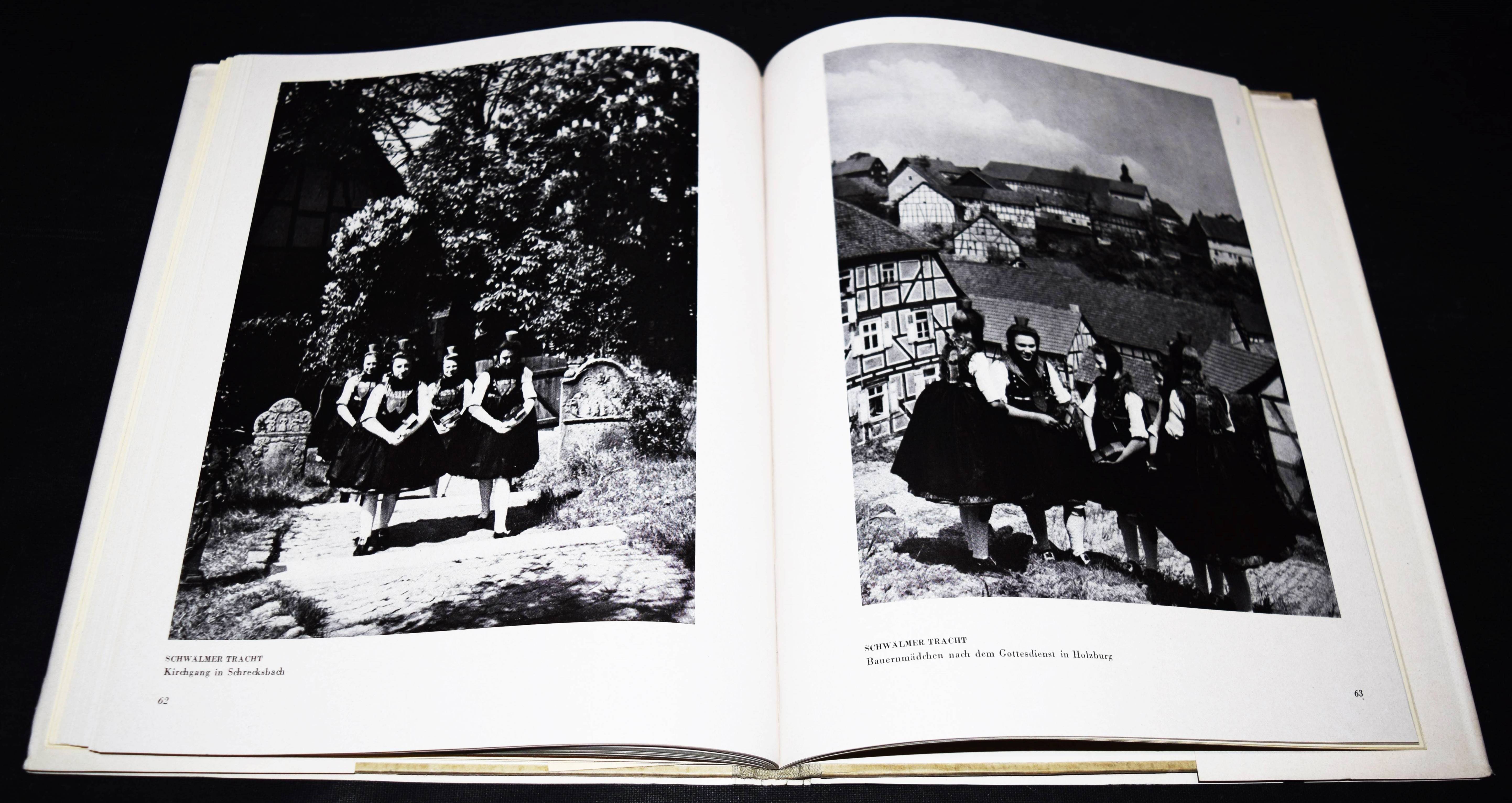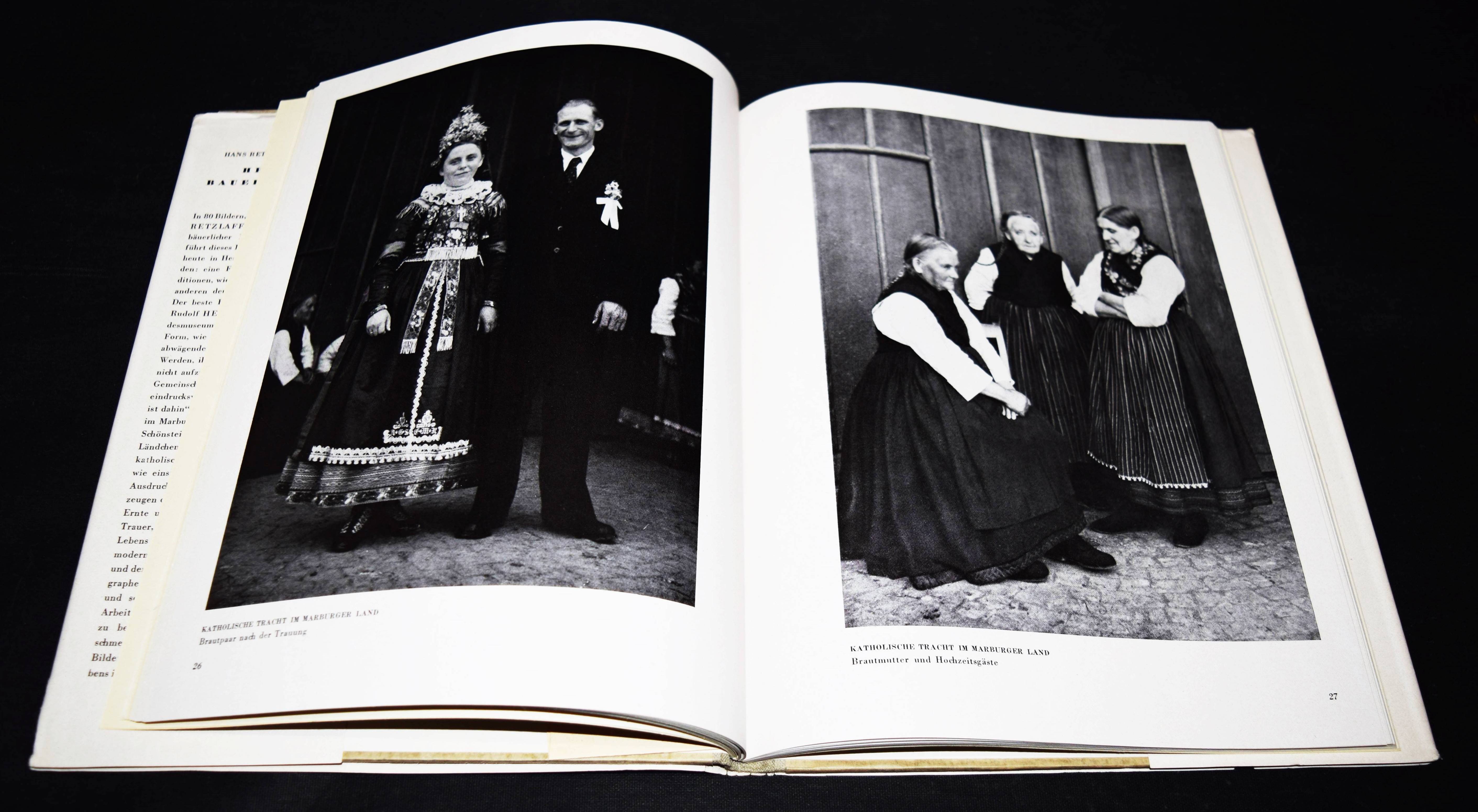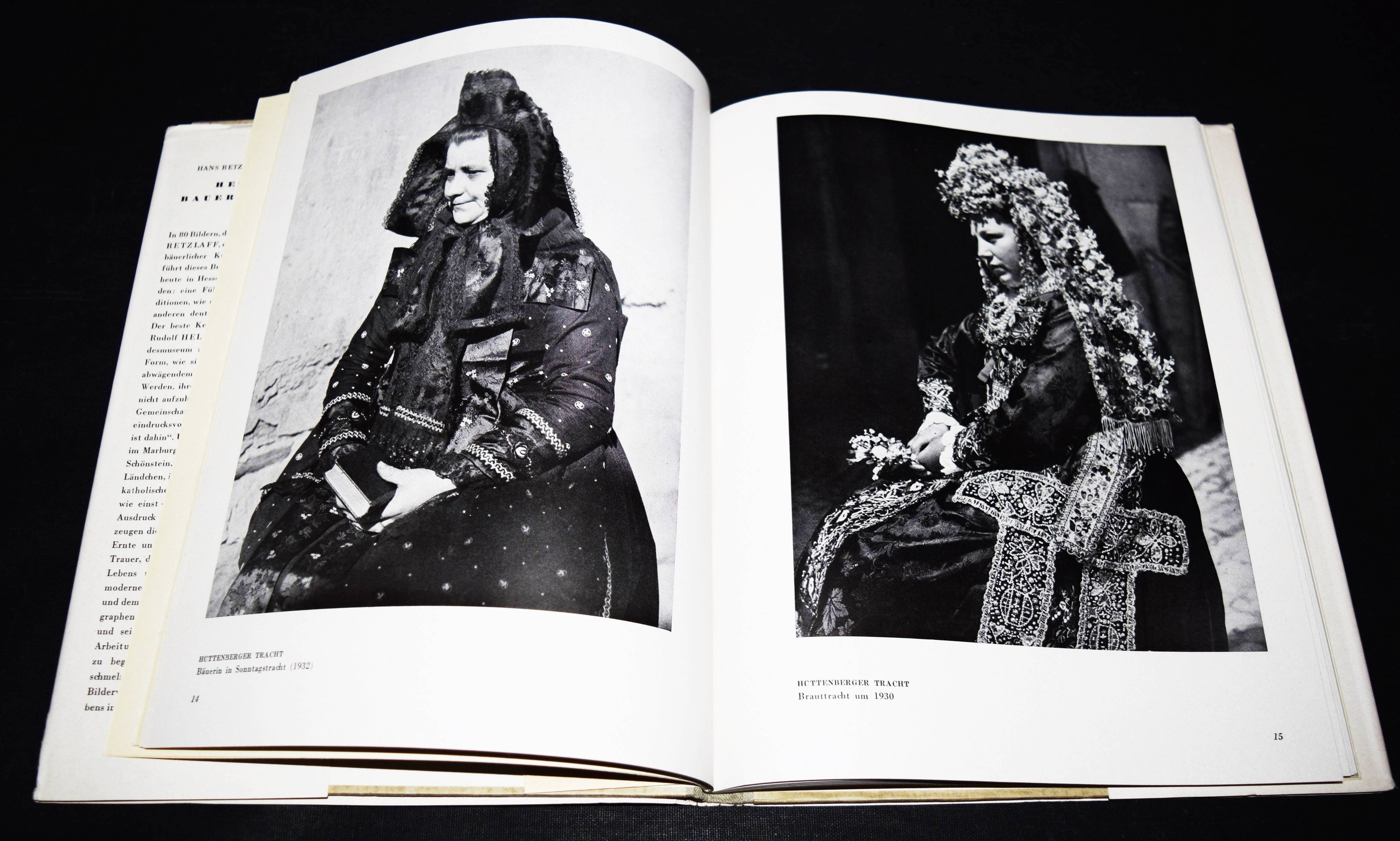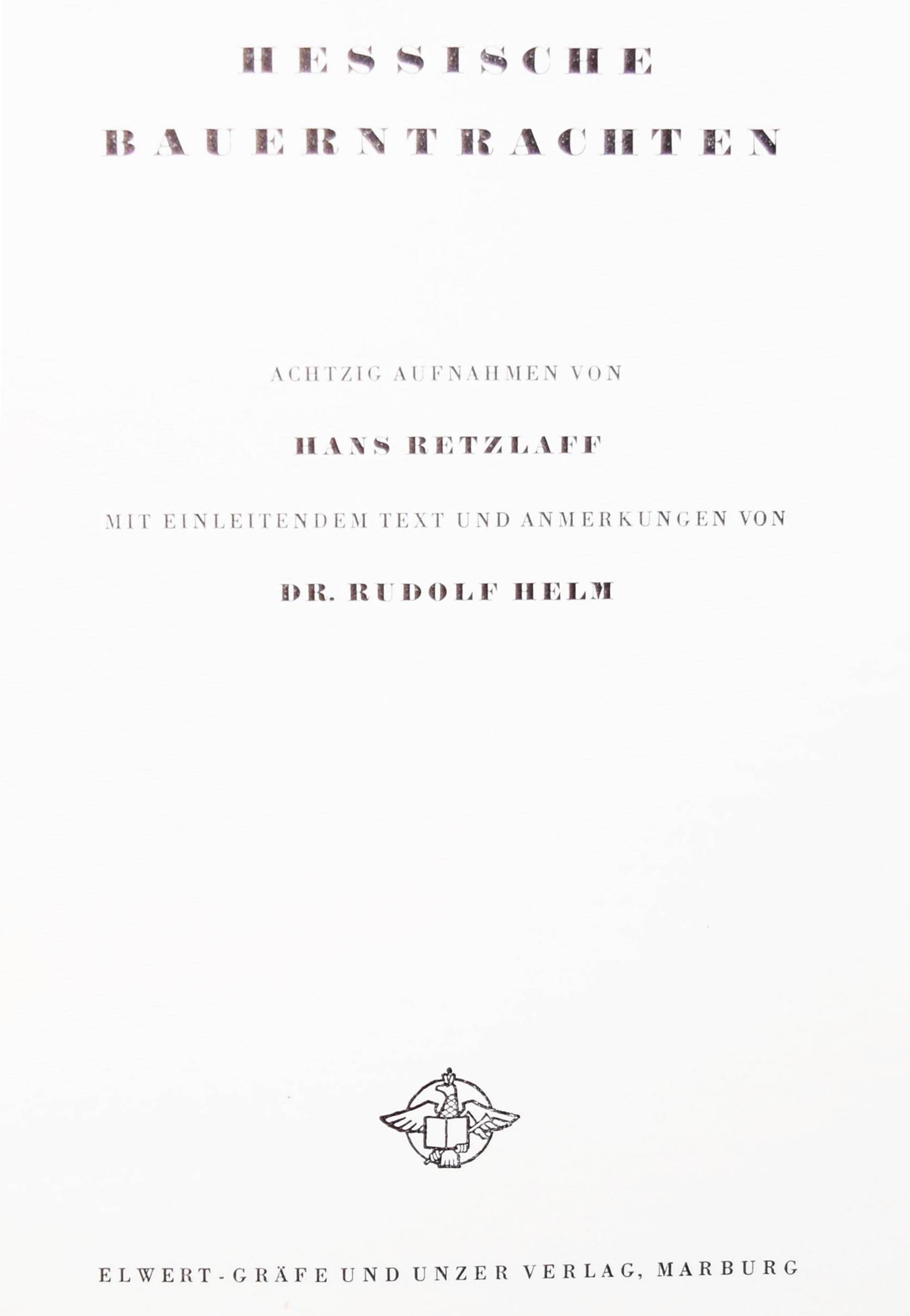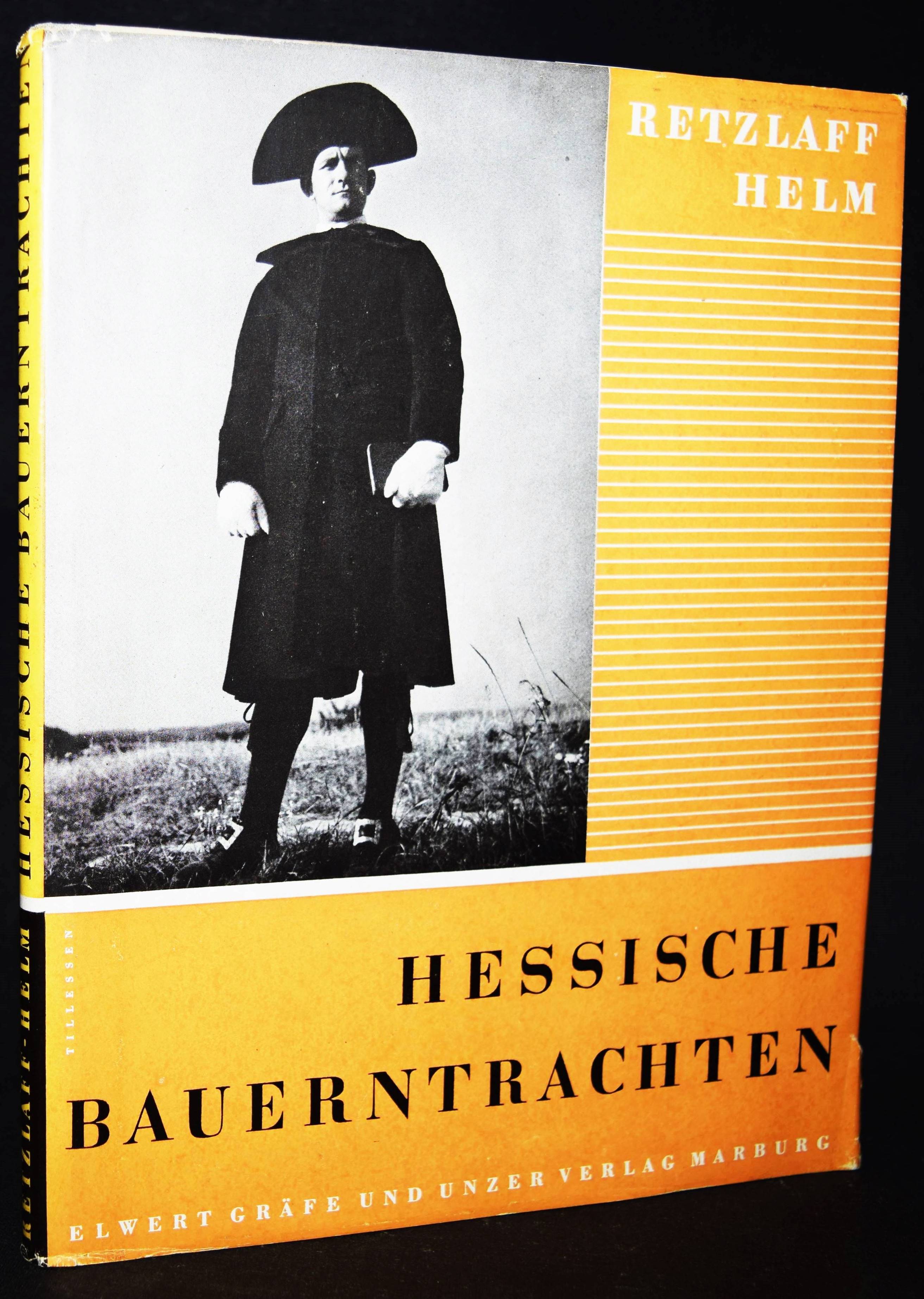 Retzlaff – Helm, Rudolf. Hessische Bauerntrachten. Achtzig Aufnahmen von Hans Retzlaff. Mit einleitendem Text und Anmerkungen. Marburg, Elwert-Gräfe und Unzer (1949). Gr.-8°. 15, 80, 11 S. mit 80 Tafeln. Illustr. OHln. mit illustr. OU. u. Orig.-Bauchbinde (″Ein neues Bildbuch von Hans Retzlaff“). Heidtmann 14161. – Erste Ausgabe. – Schutzumschlag am Rückendeckel u. der Vorderkante mit kl. Randeinrissen, Bauchbinde hinten durchgerissen, sehr gutes Exemplar.